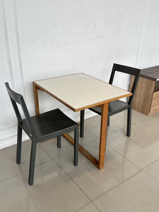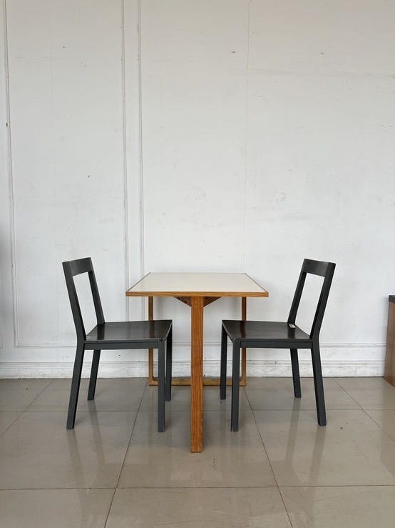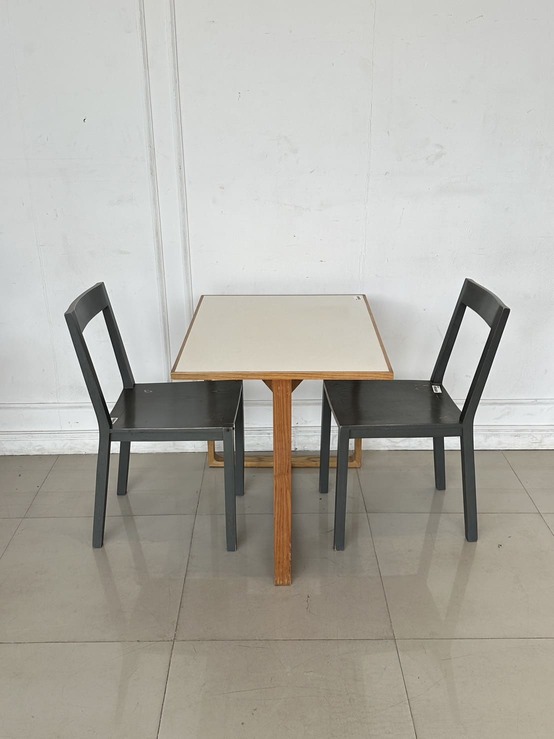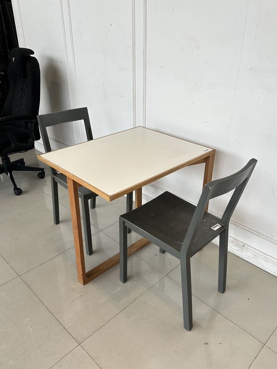 ชุดโต๊ะทานอาหาร 2 ที่นั่ง โต๊ะ ท็อปขอบไม้จริง กลางไม้ MDF สีขาว โครงขาไม้จริงสีน้ำตาล พร้อมเก้าอี้ เบาะผ้าสีเทา