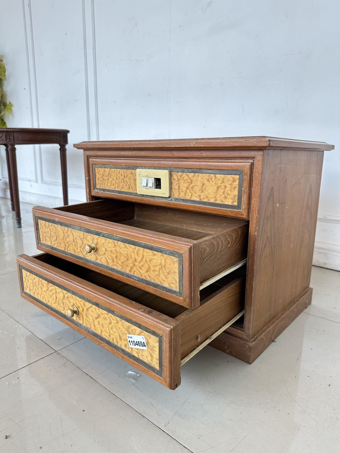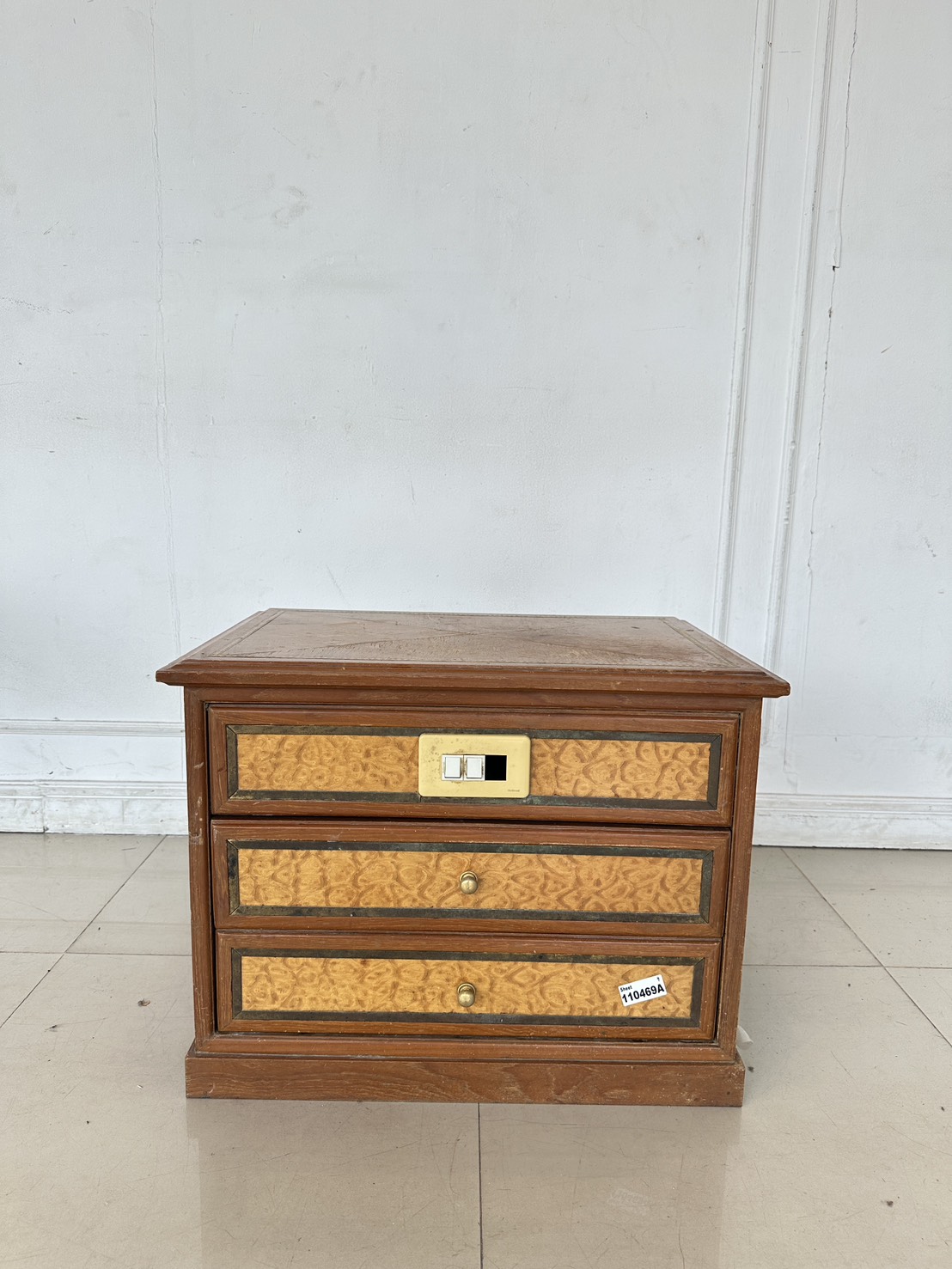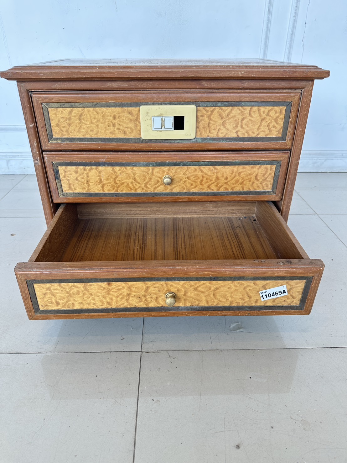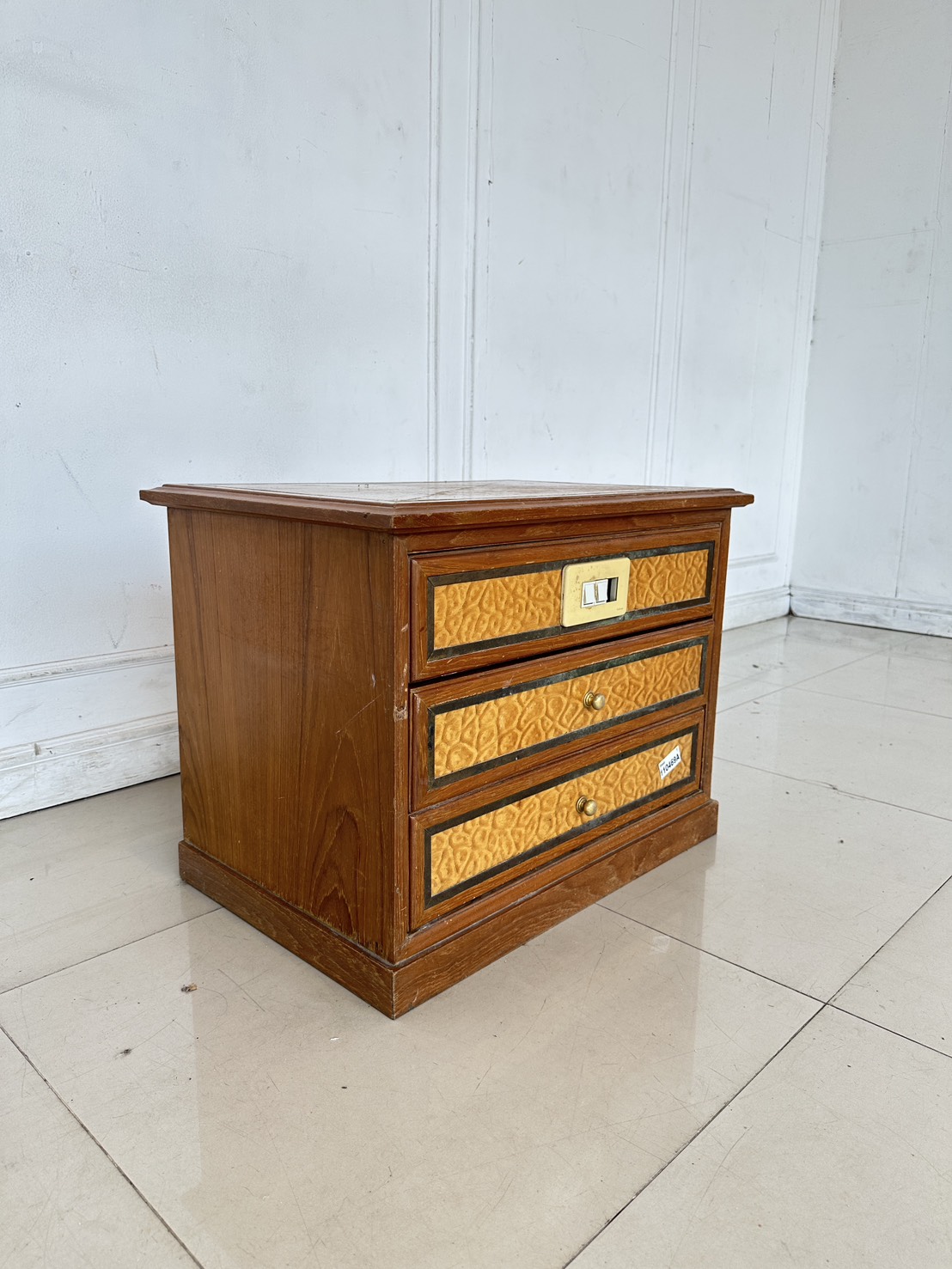 ตู้ข้างเตียง สไตล์วินเทจ 2 ลิ้นชัก ด้านหน้าติดสวิสไฟ โครงฐานไม้จริงปิดแผ่นไม้อัดสีน้ำตาล
