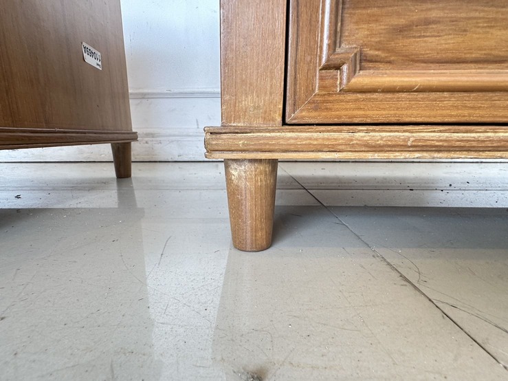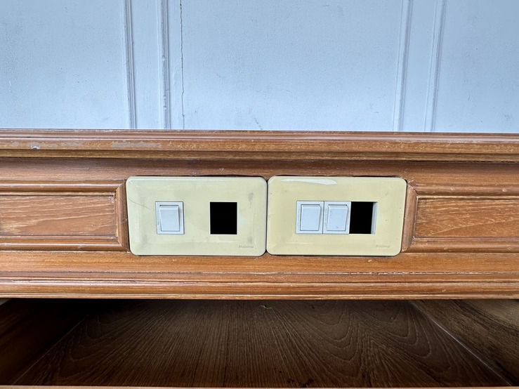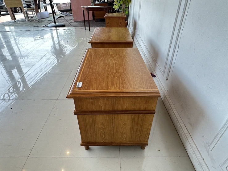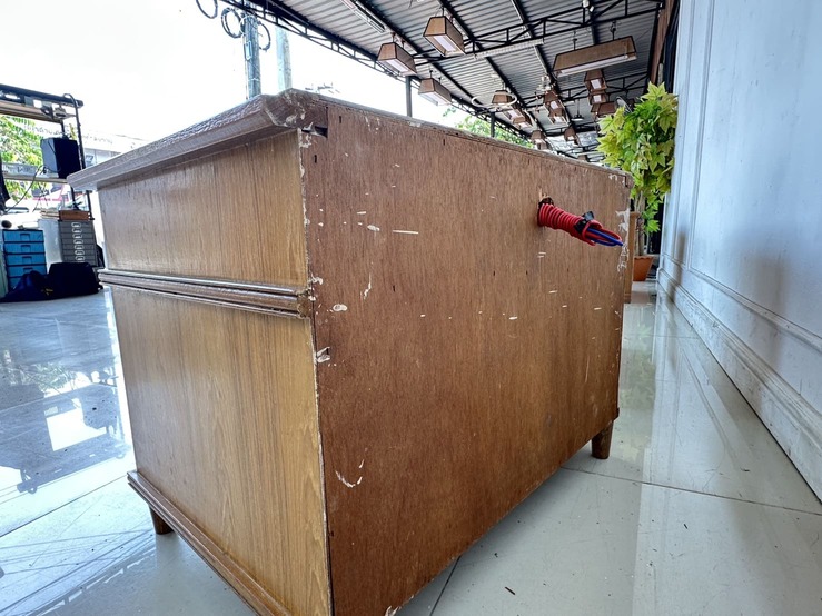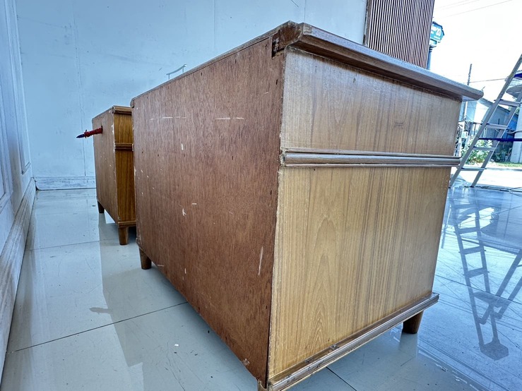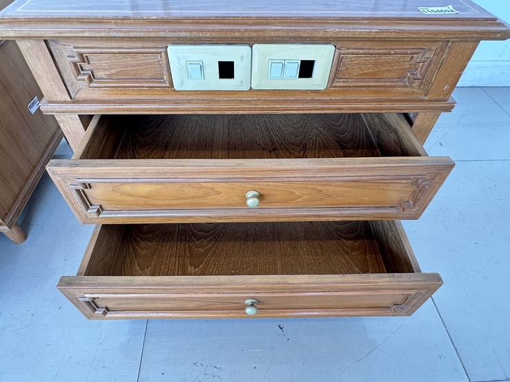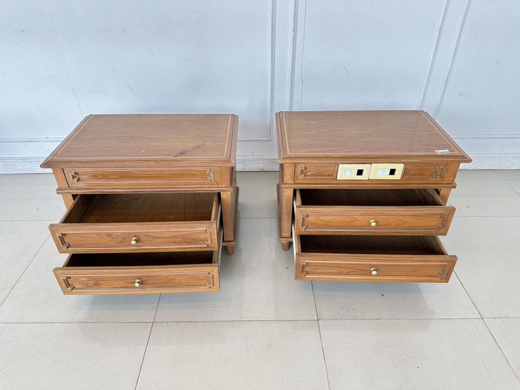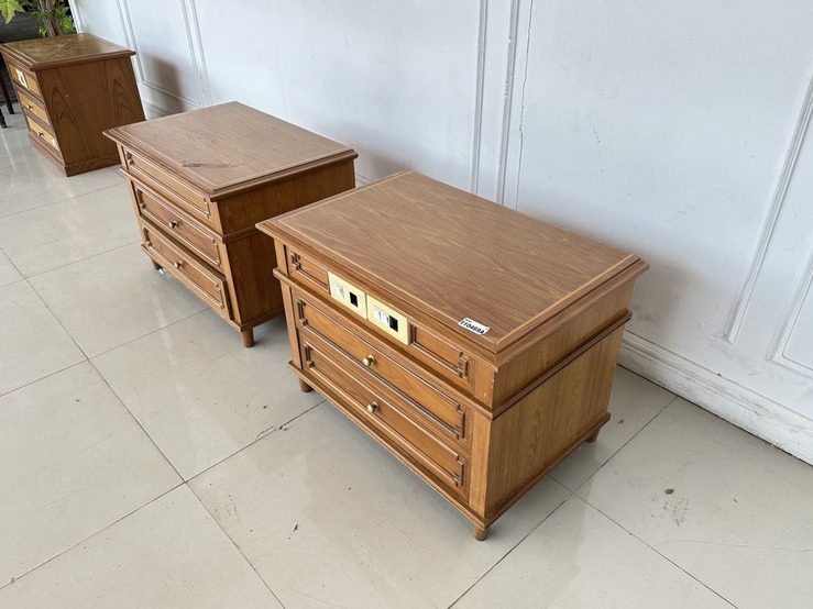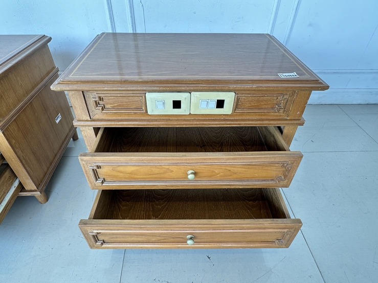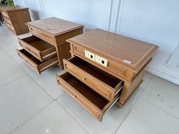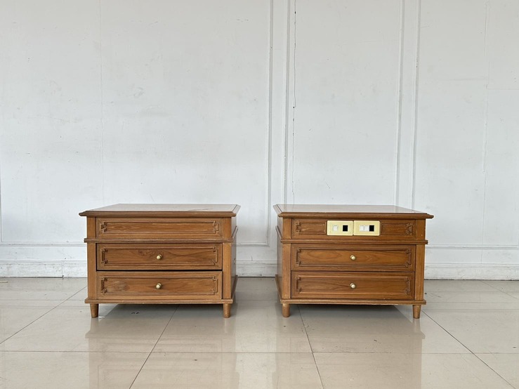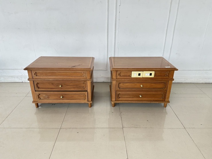ตู้ข้างเตียง สไตล์วิเทจ 2 ลิ้นชัก ตัวขวามีช่องสวิชไฟ ด้านหน้า 1 ตัว โครงขาไม้จริงปิดแผ่นไม้อัดสีน้ำตาล