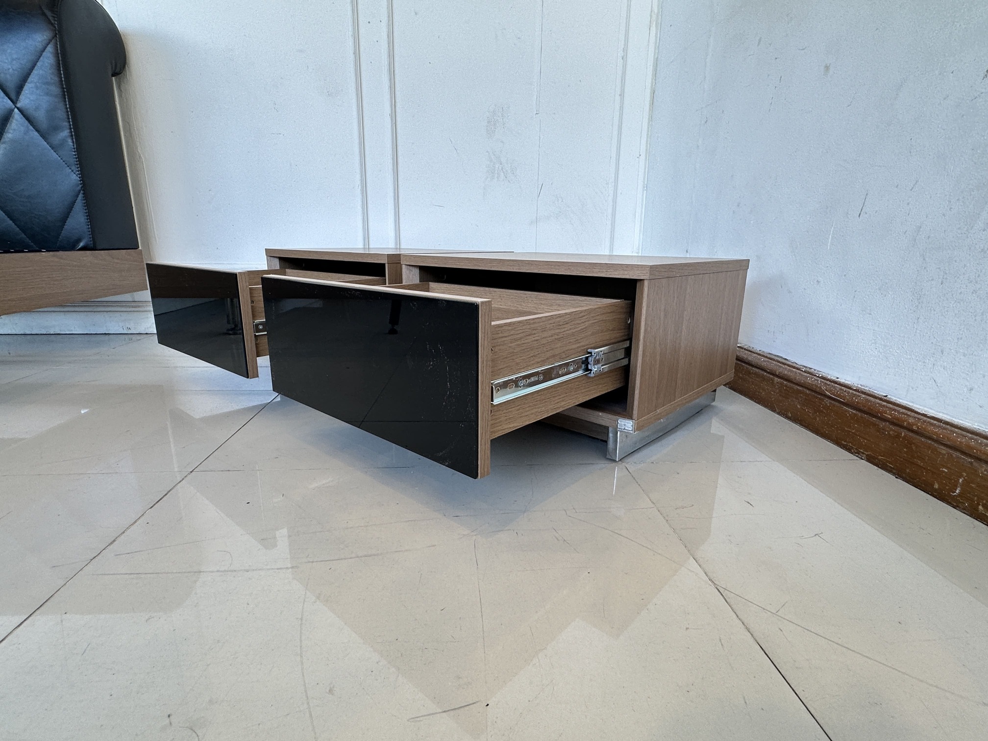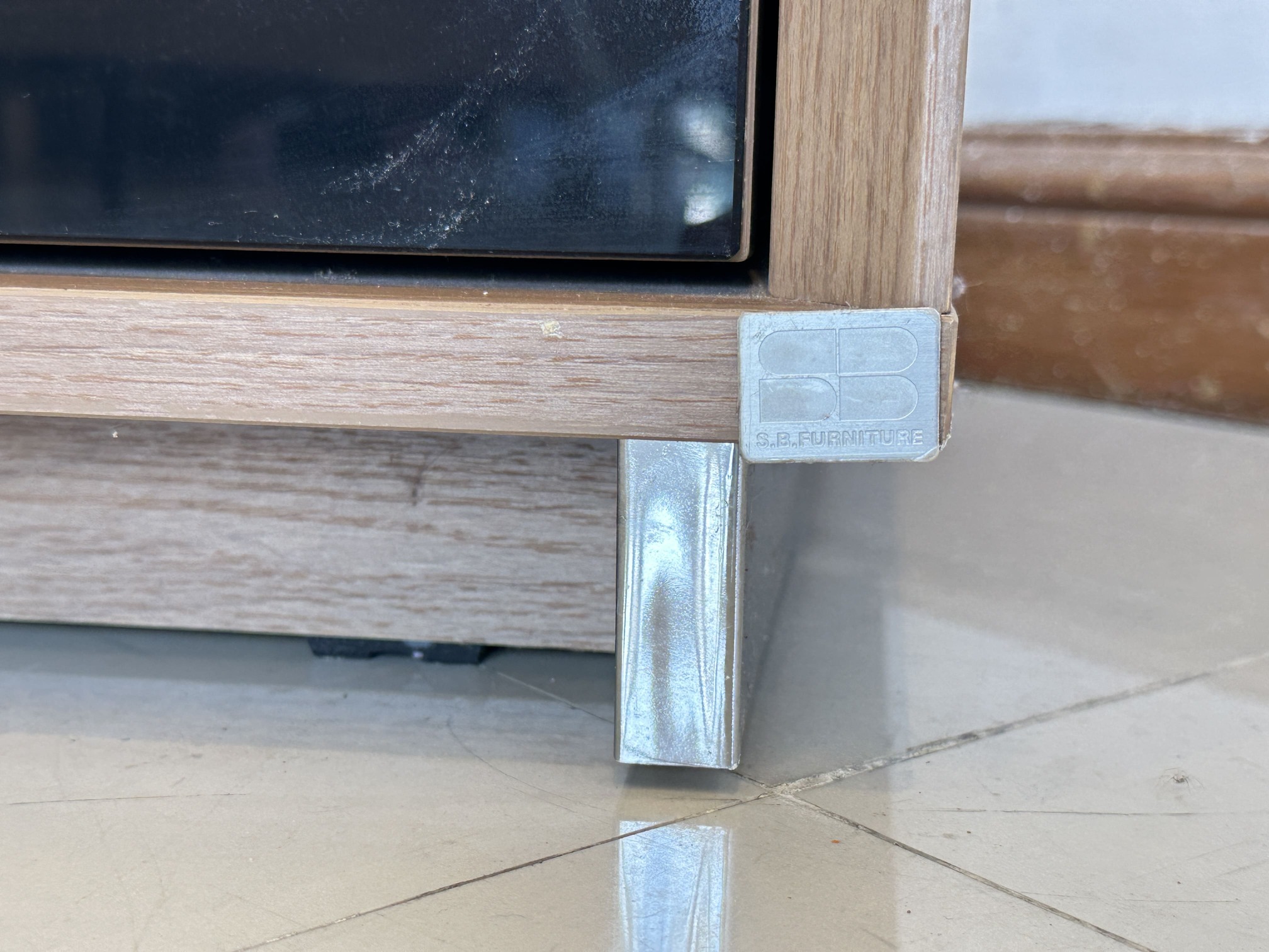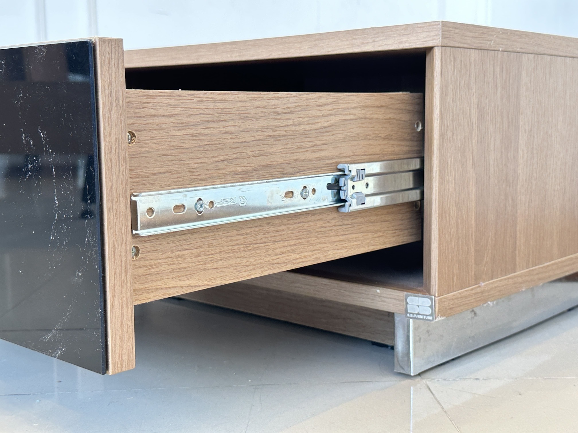 ตู้ข้างเตียง 1 ลิ้นชัก หน้าบานกระจกสีดำ โครงไม้ MDF สีน้ำตาล ขาเหล็ก