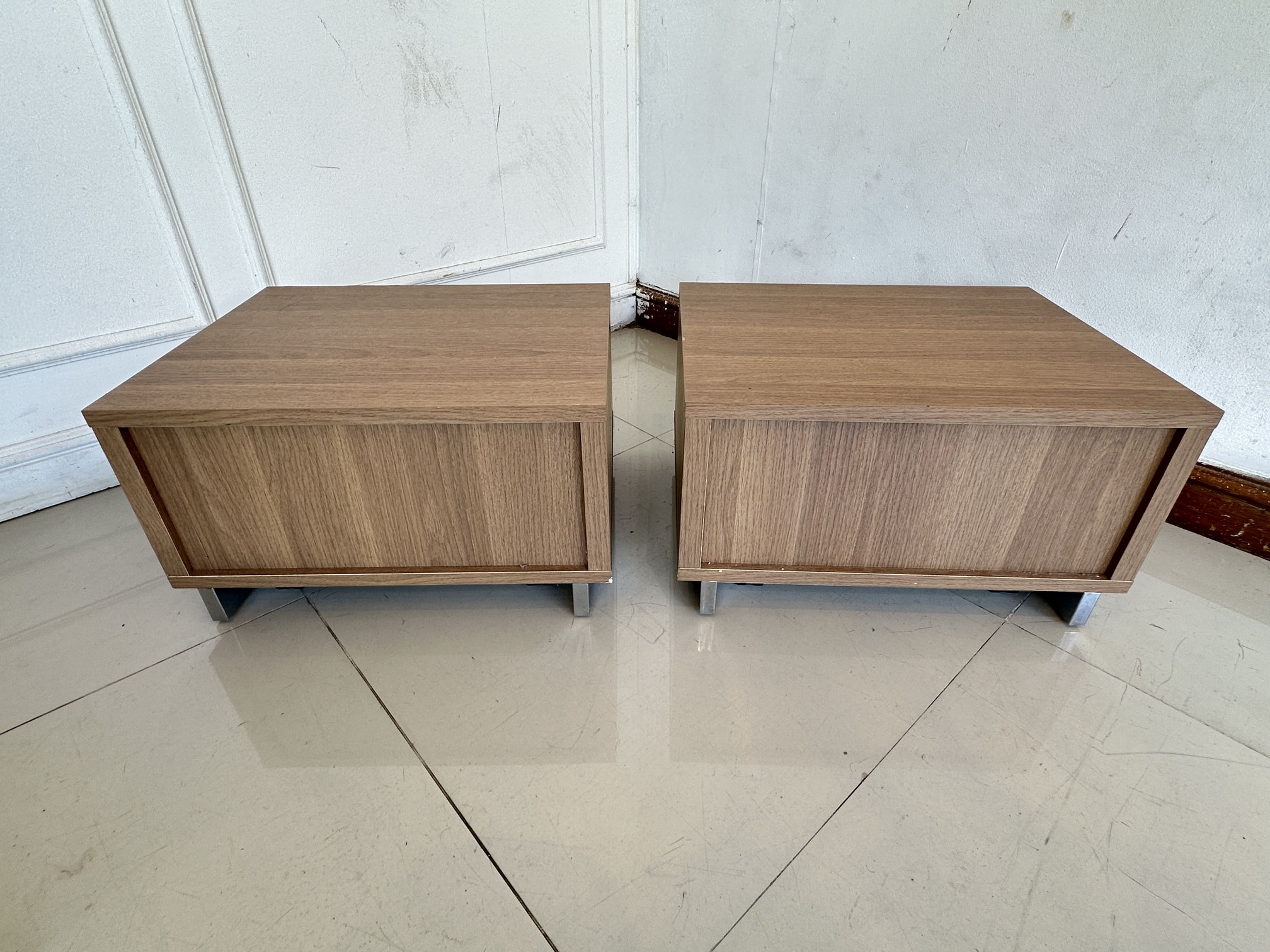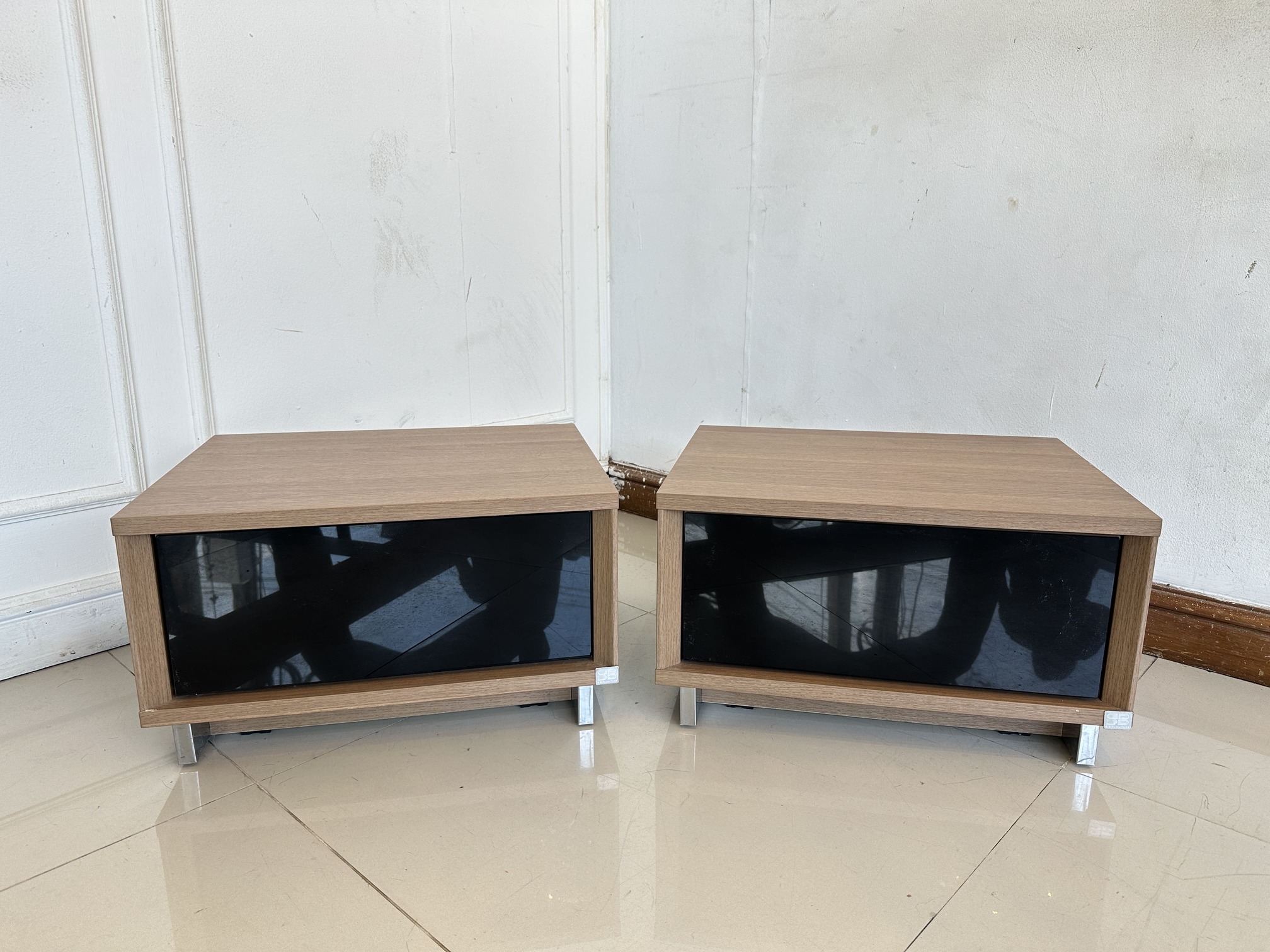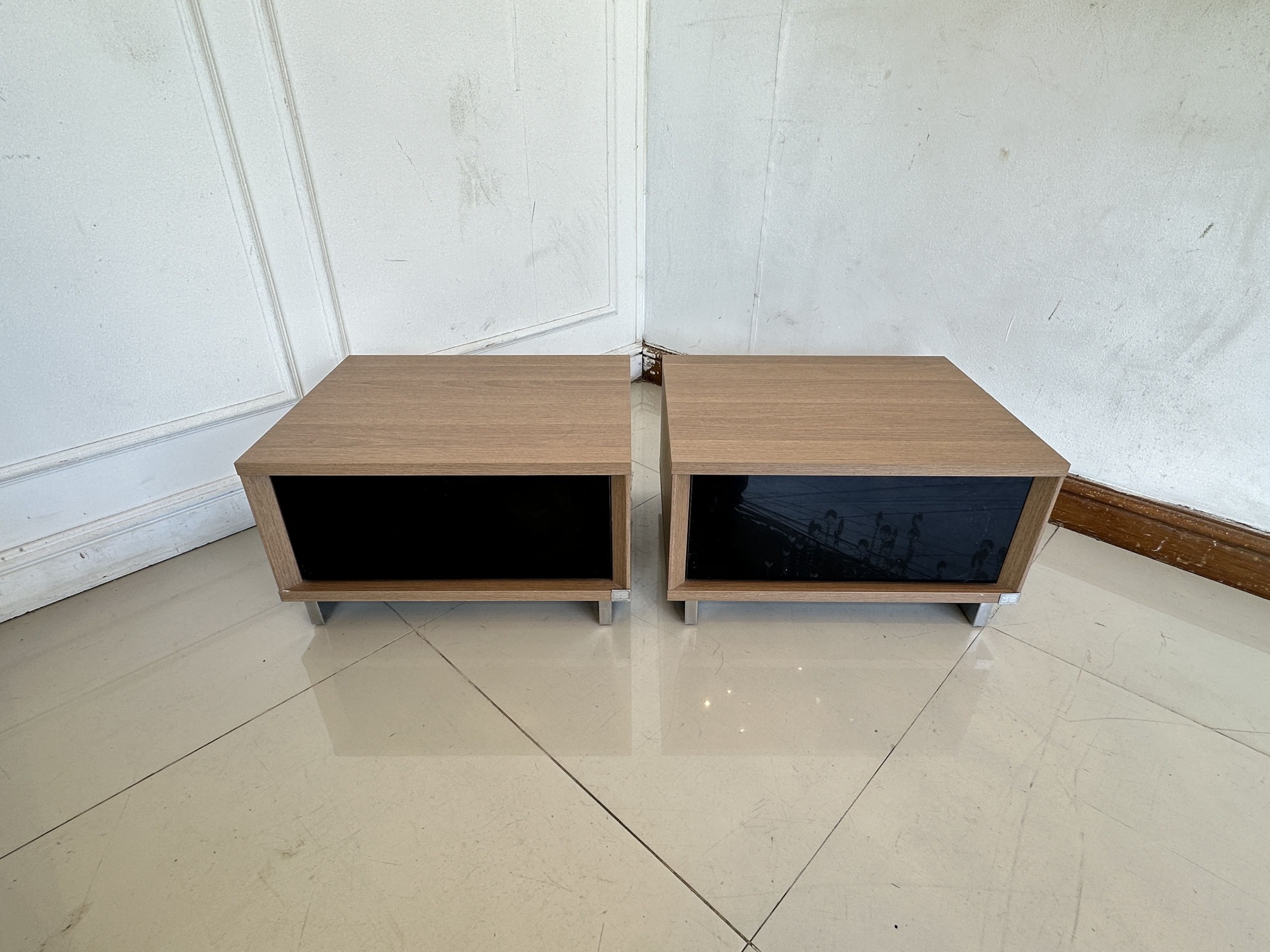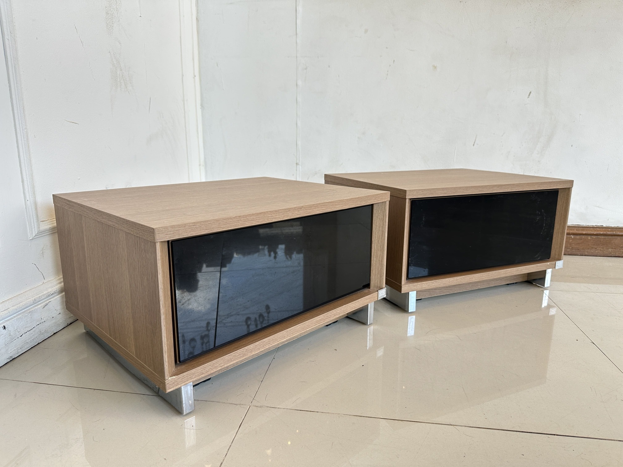 ตู้ข้างเตียง 1 ลิ้นชัก หน้าบานกระจกสีดำ โครงไม้ MDF สีน้ำตาล ขาเหล็ก