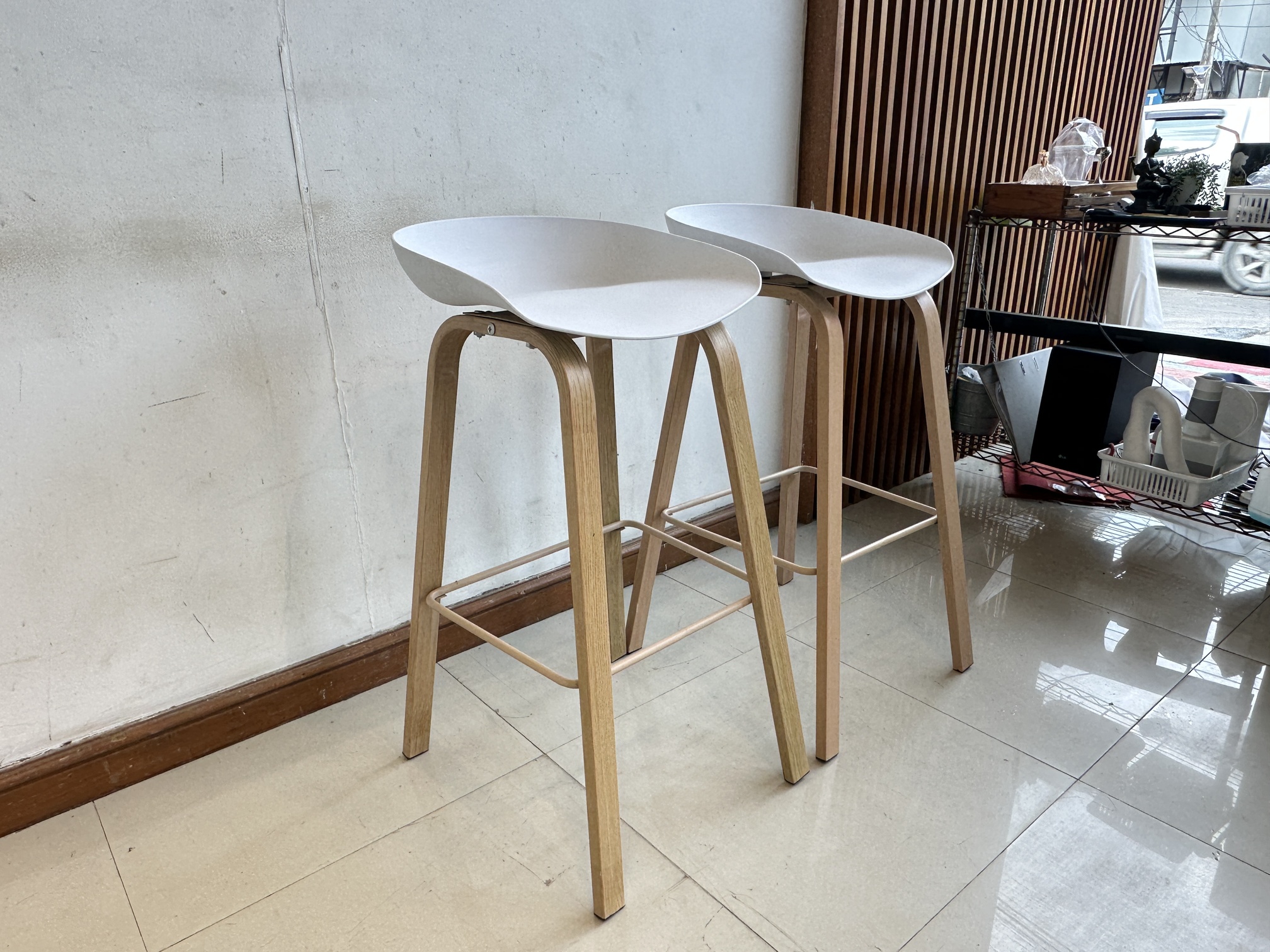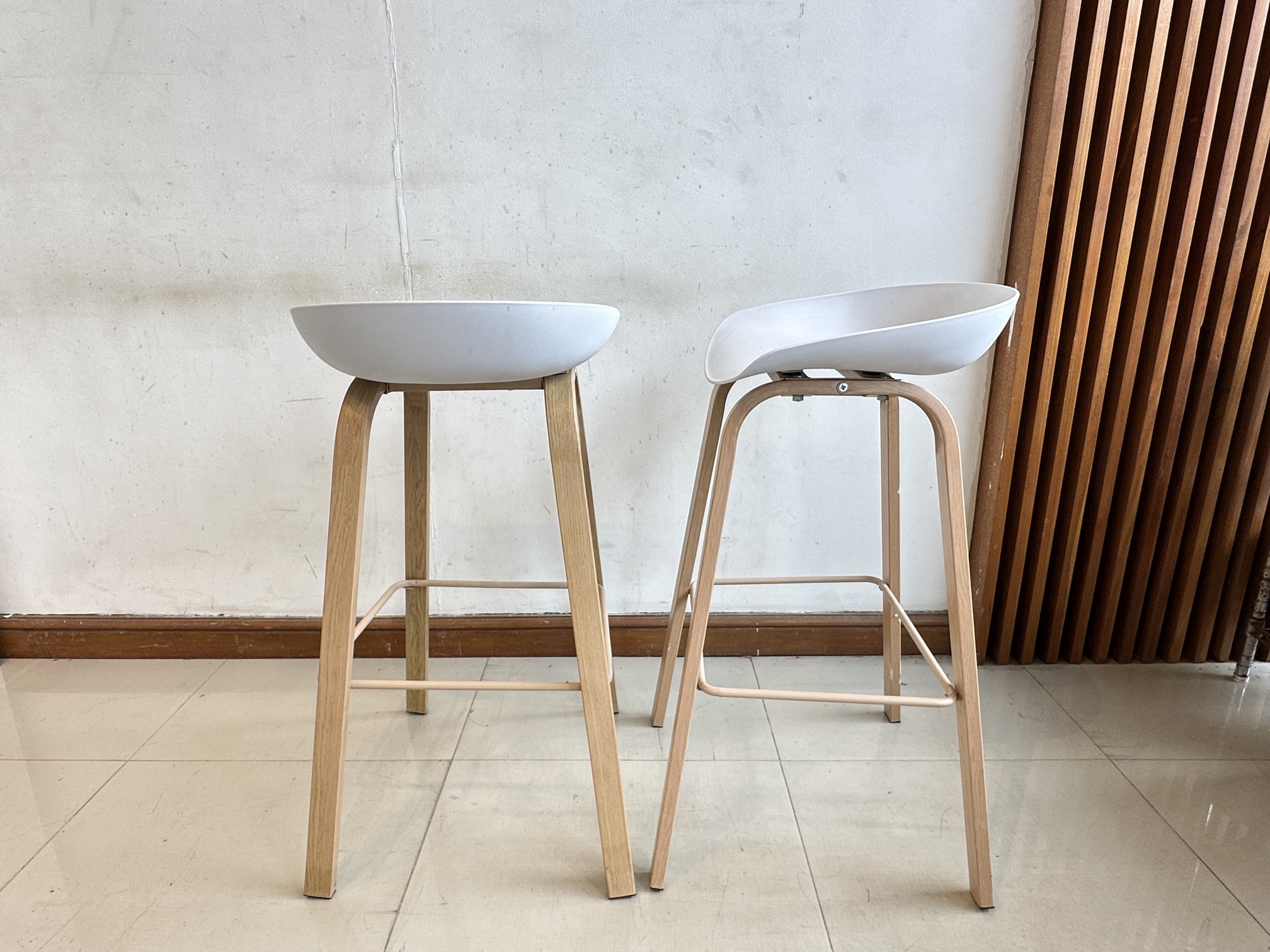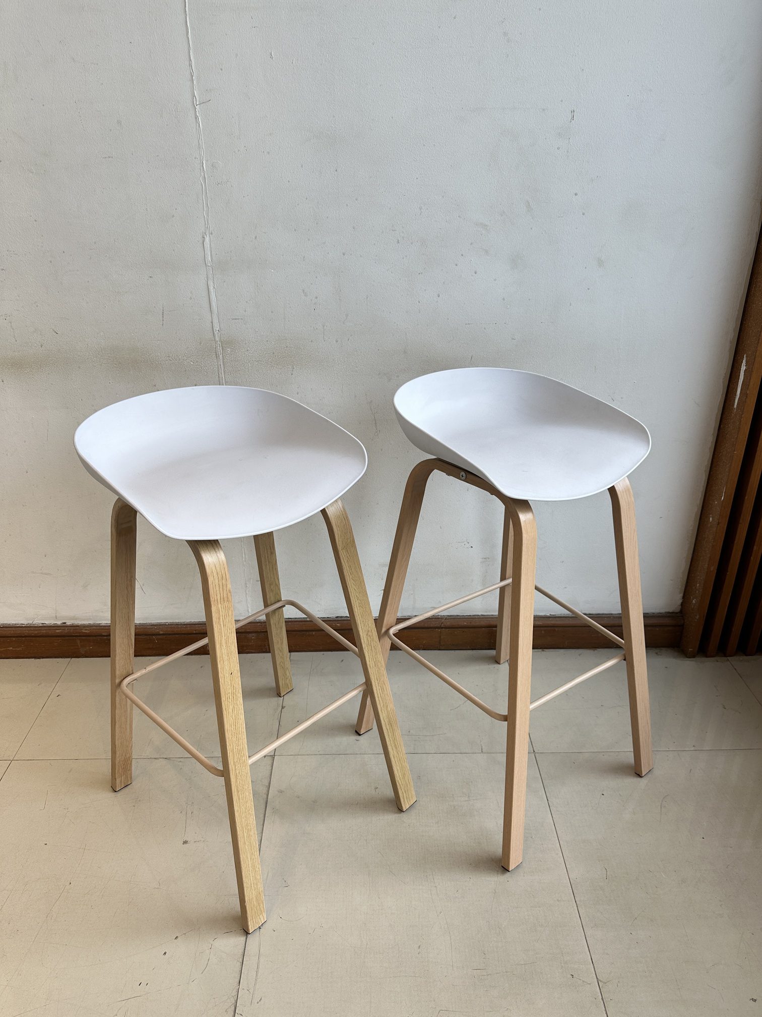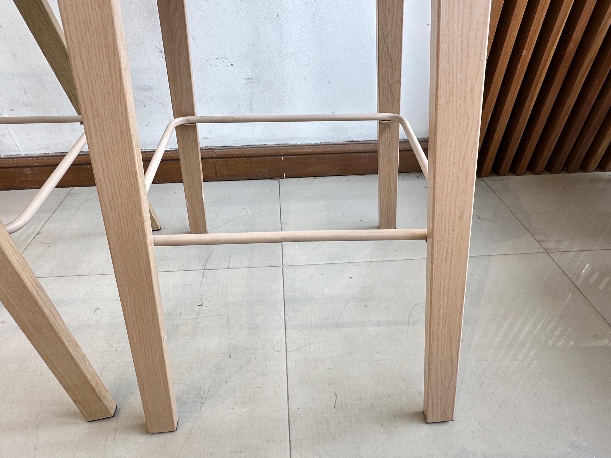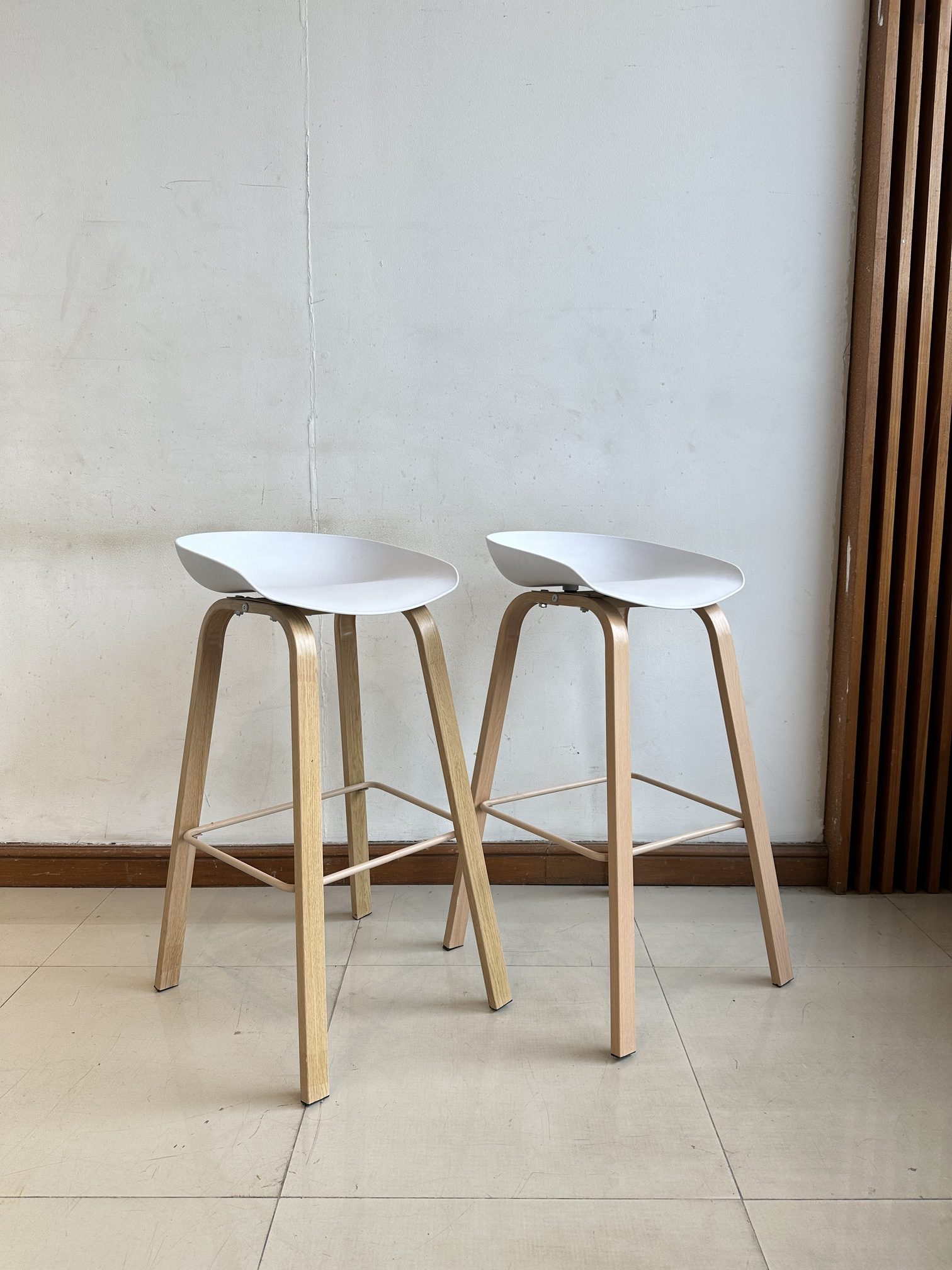 เก้าอี้บาร์ เบาะพลาสติกสีขาว โครงขาเหล็ก ติดลายไม้สีบีช