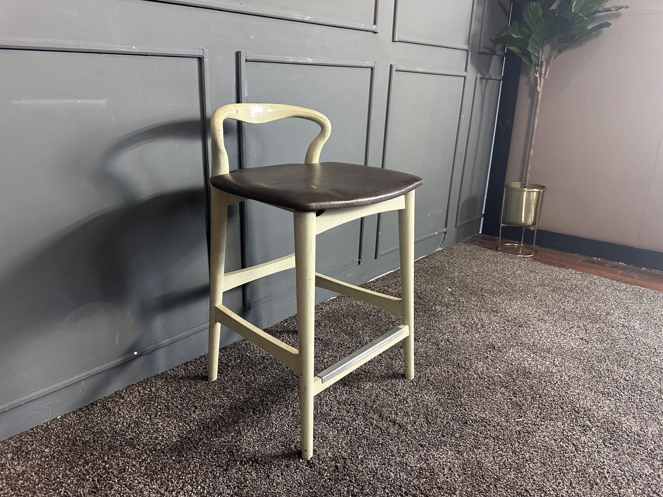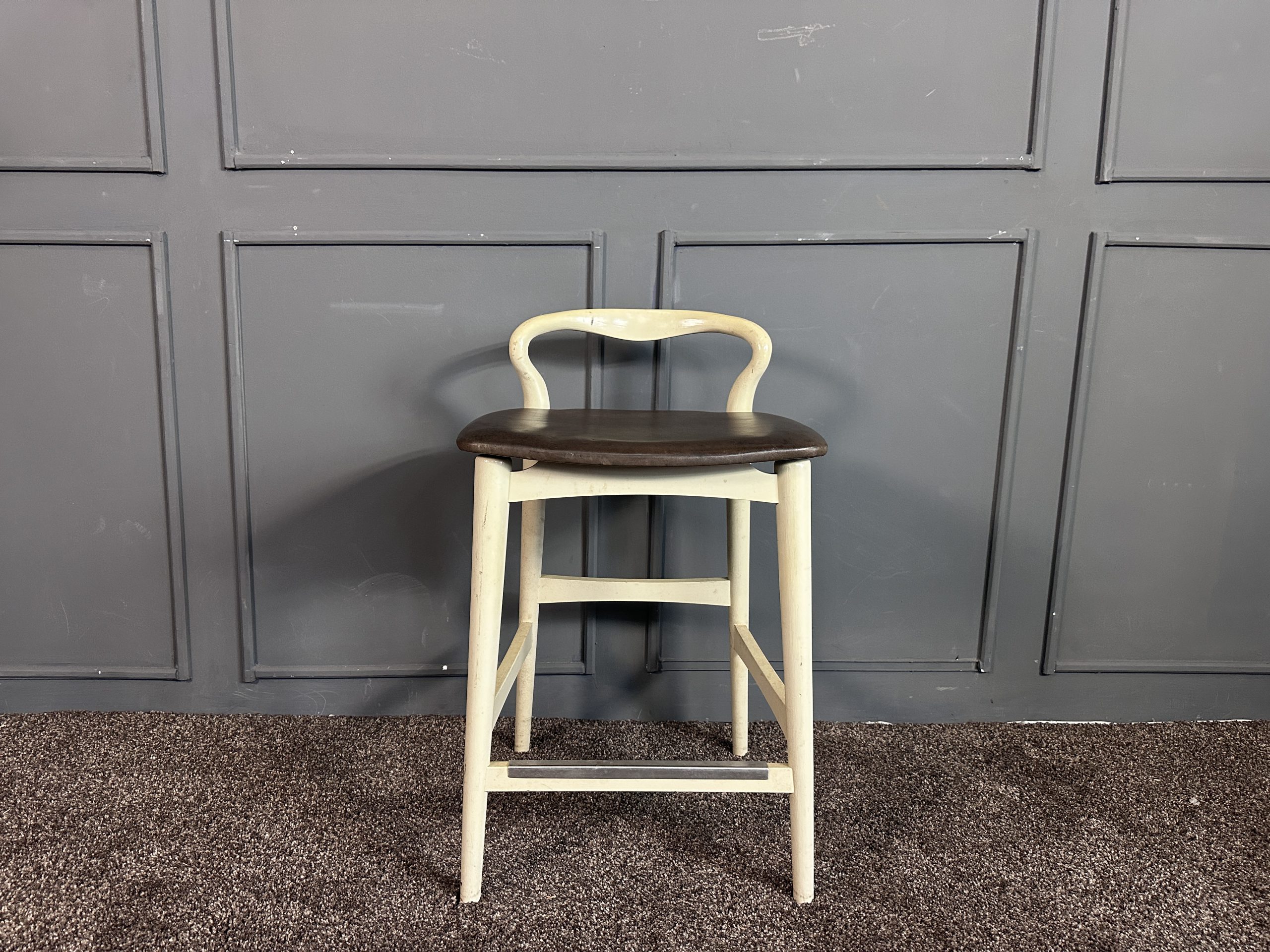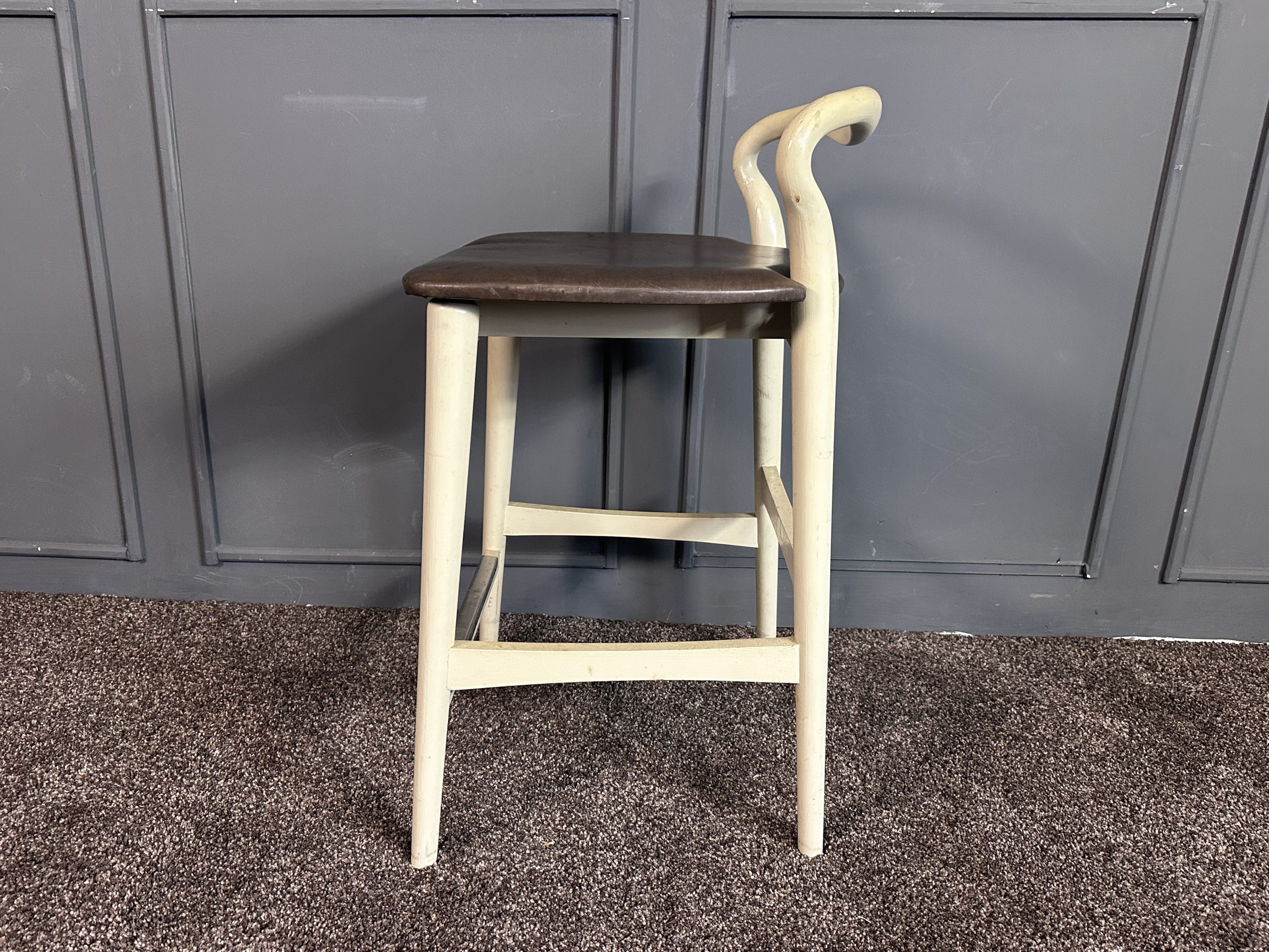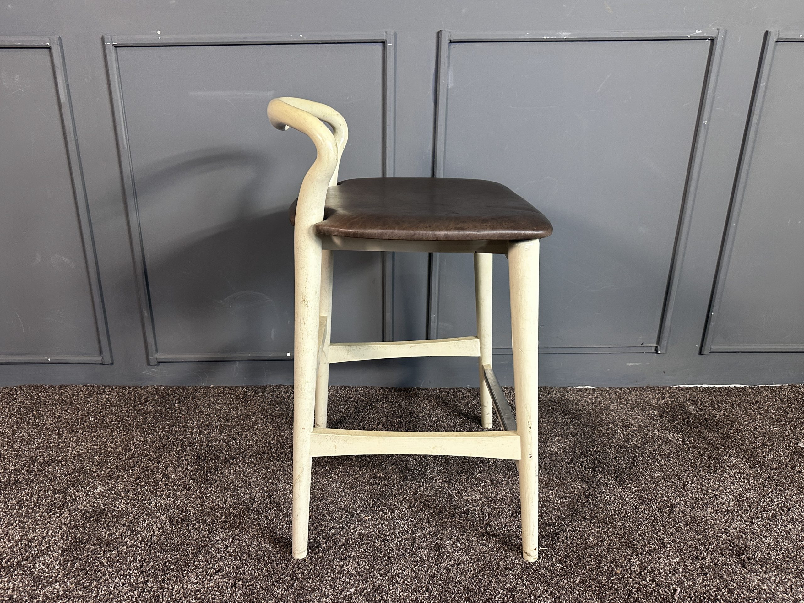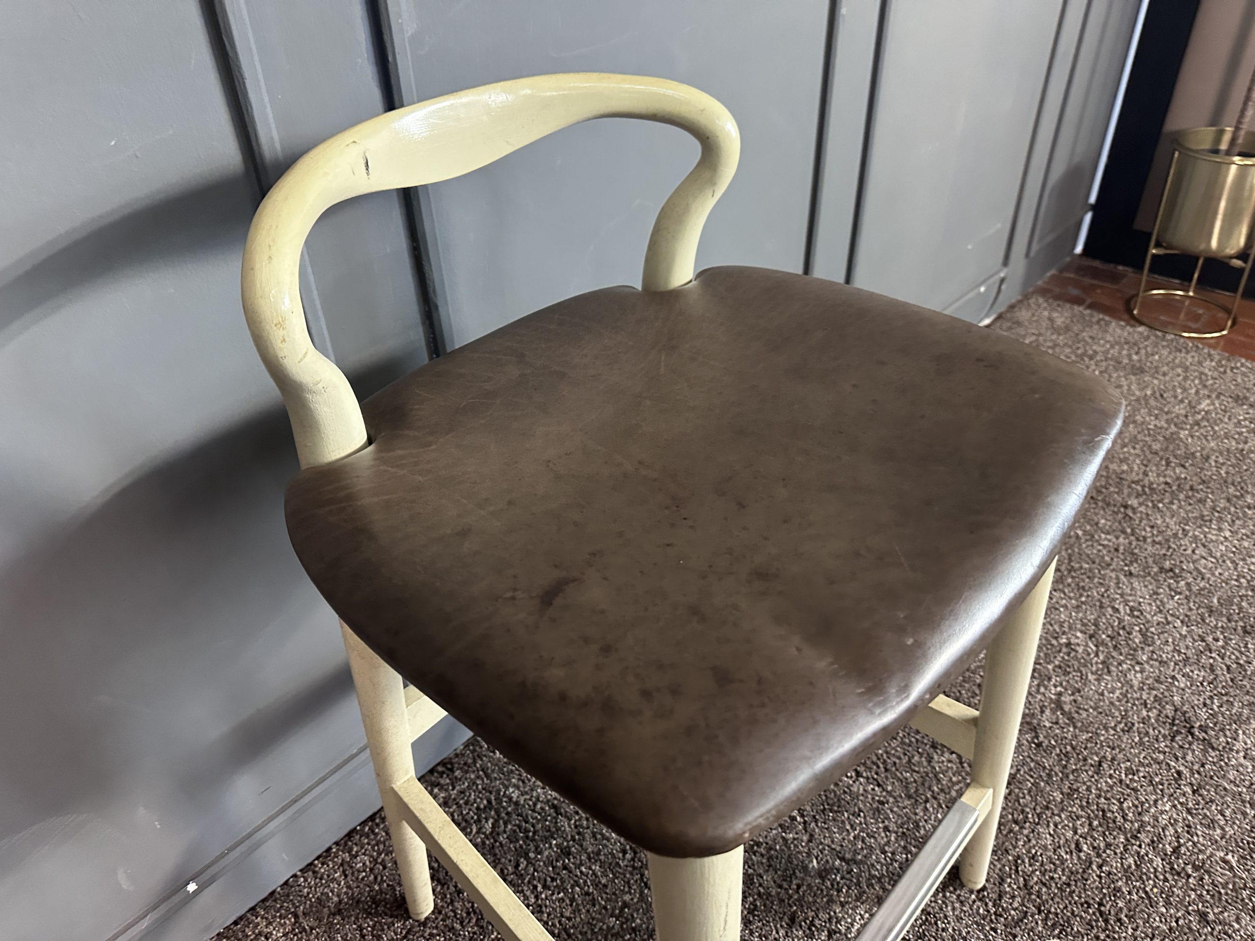 เก้าอี้มินิบาร์ เบาะหนังแท้สีน้ำตาลเข้ม โครงขาไม้สีขาว แบรนด์ Stanley Furniture