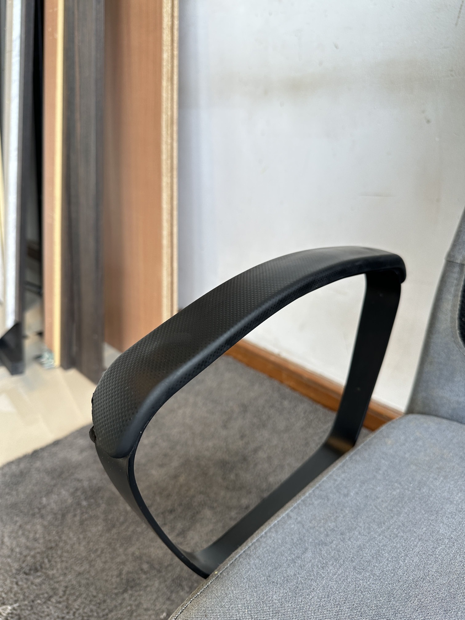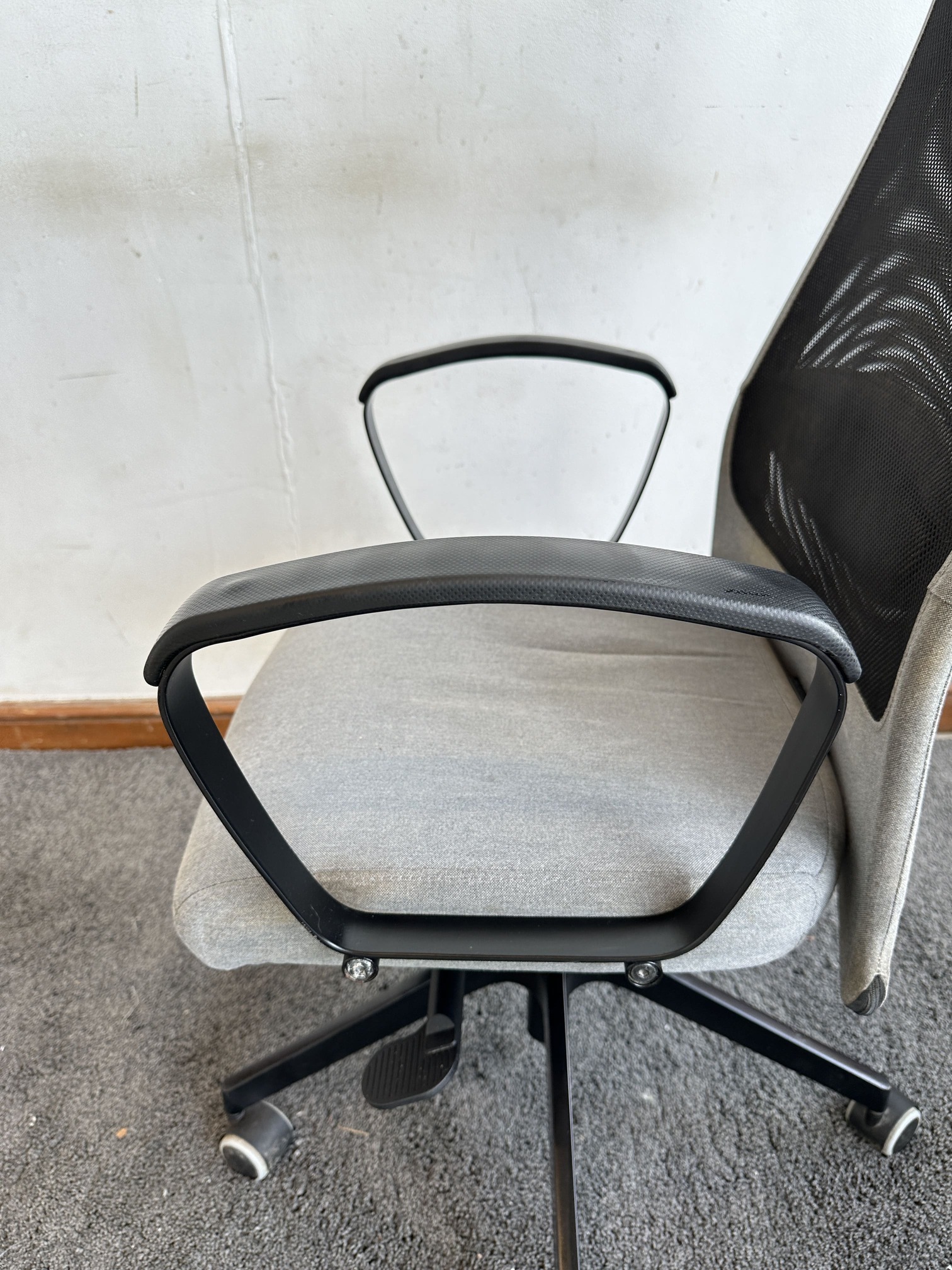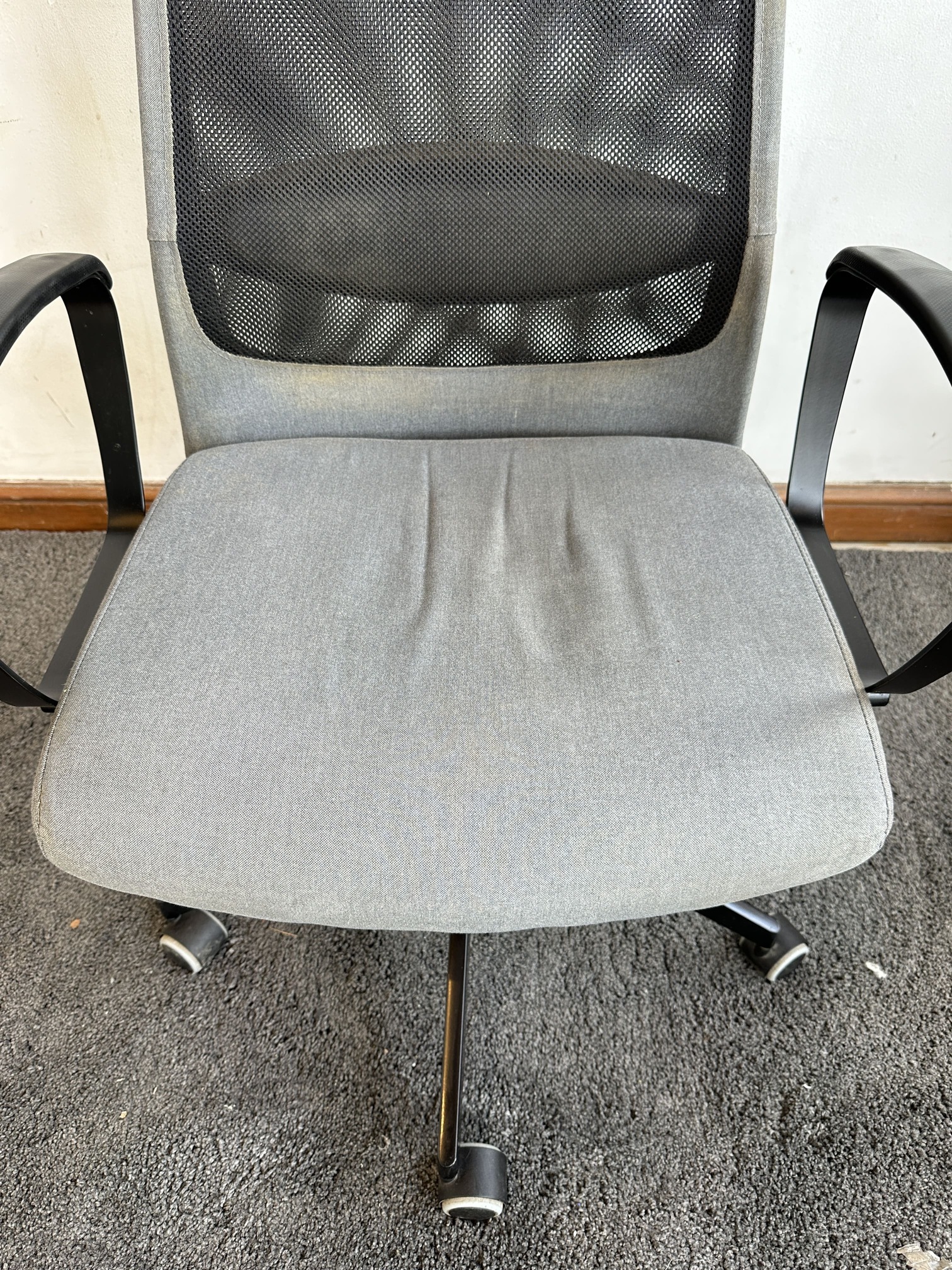 เก้าอี้สำนักงานหลังสูง แบรนด์ IKEA รุ่น MARKUS เบาะผ้าสีเทา พักแขนเหล็กติดโฟมดำ มีโช็คปรับหนืดล็อคพิงหลังได้ โครงเหล็ก ขาอลูมิเนีบม ล้อเลื่อน