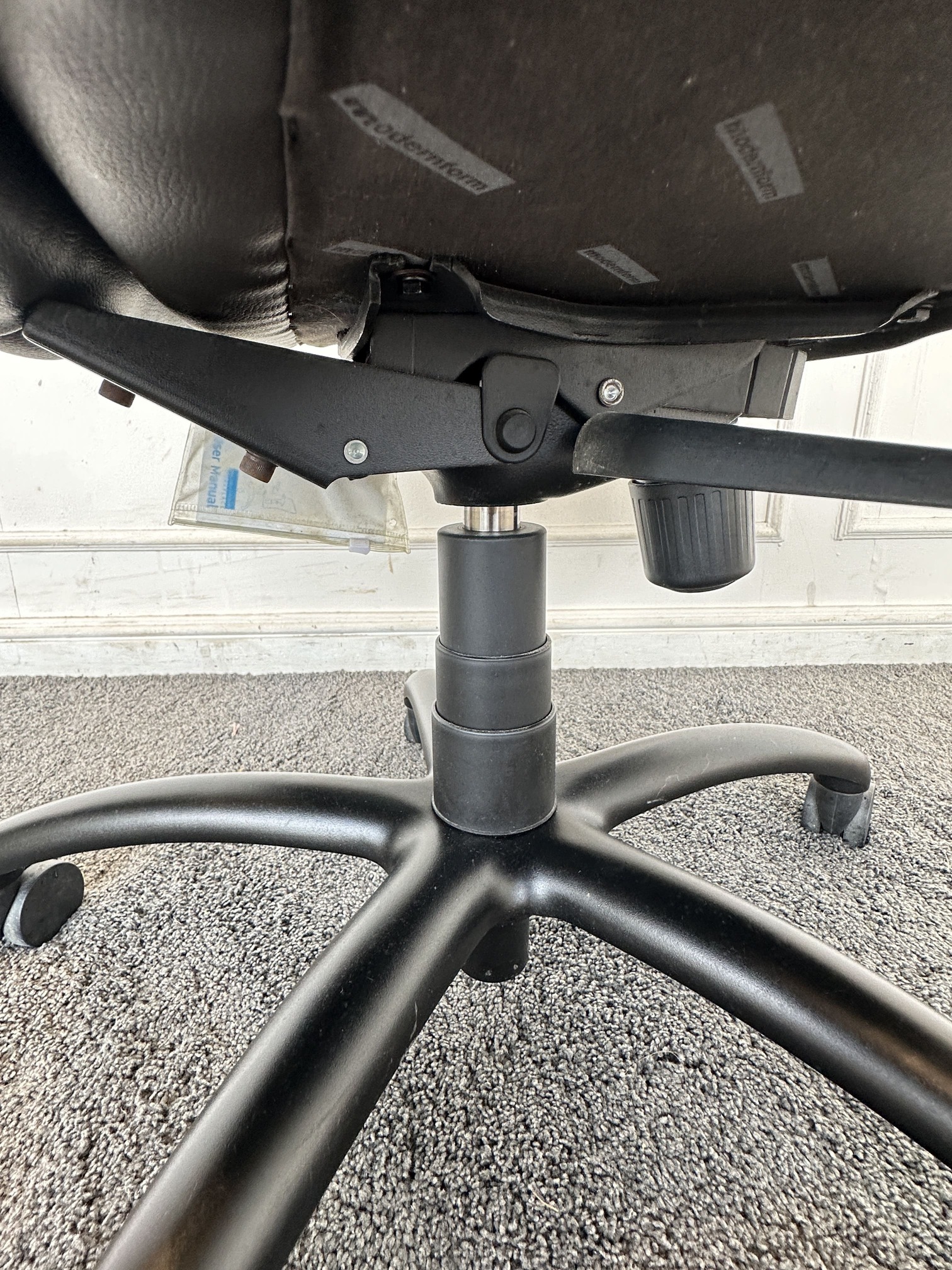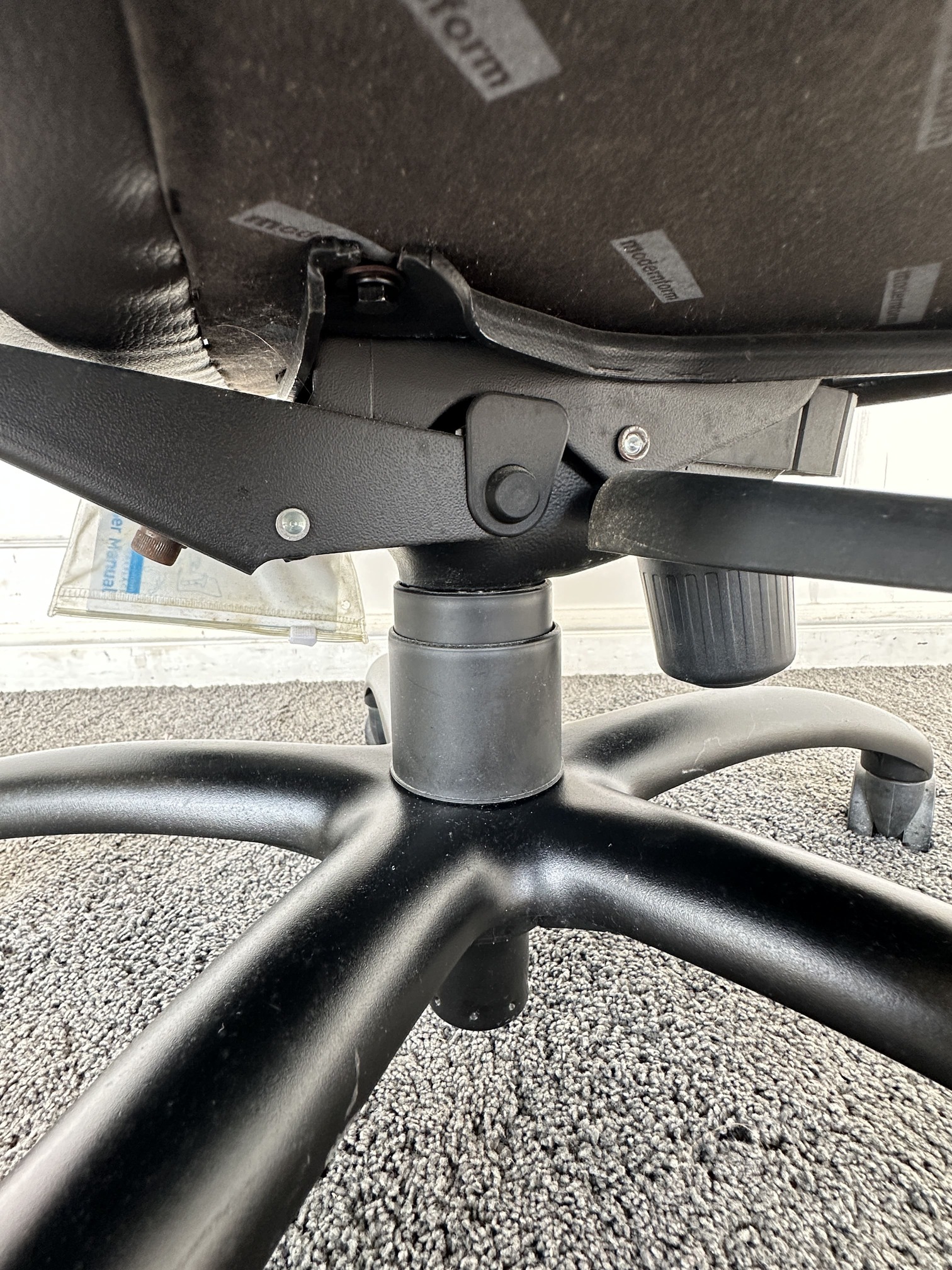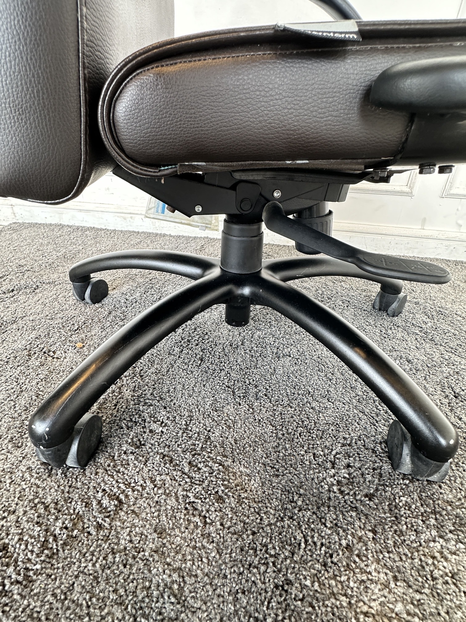 เก้าอี้สำนักงานหลังสูง แบรนด์ MODERNFORM เบาะหุ้มหนัง PU สีน้ำตาลเข้ม มีโช็คปรับหนืดพิงหลังได้ ขาอลูมิเนียมสีดำ ล้อเลื่อน