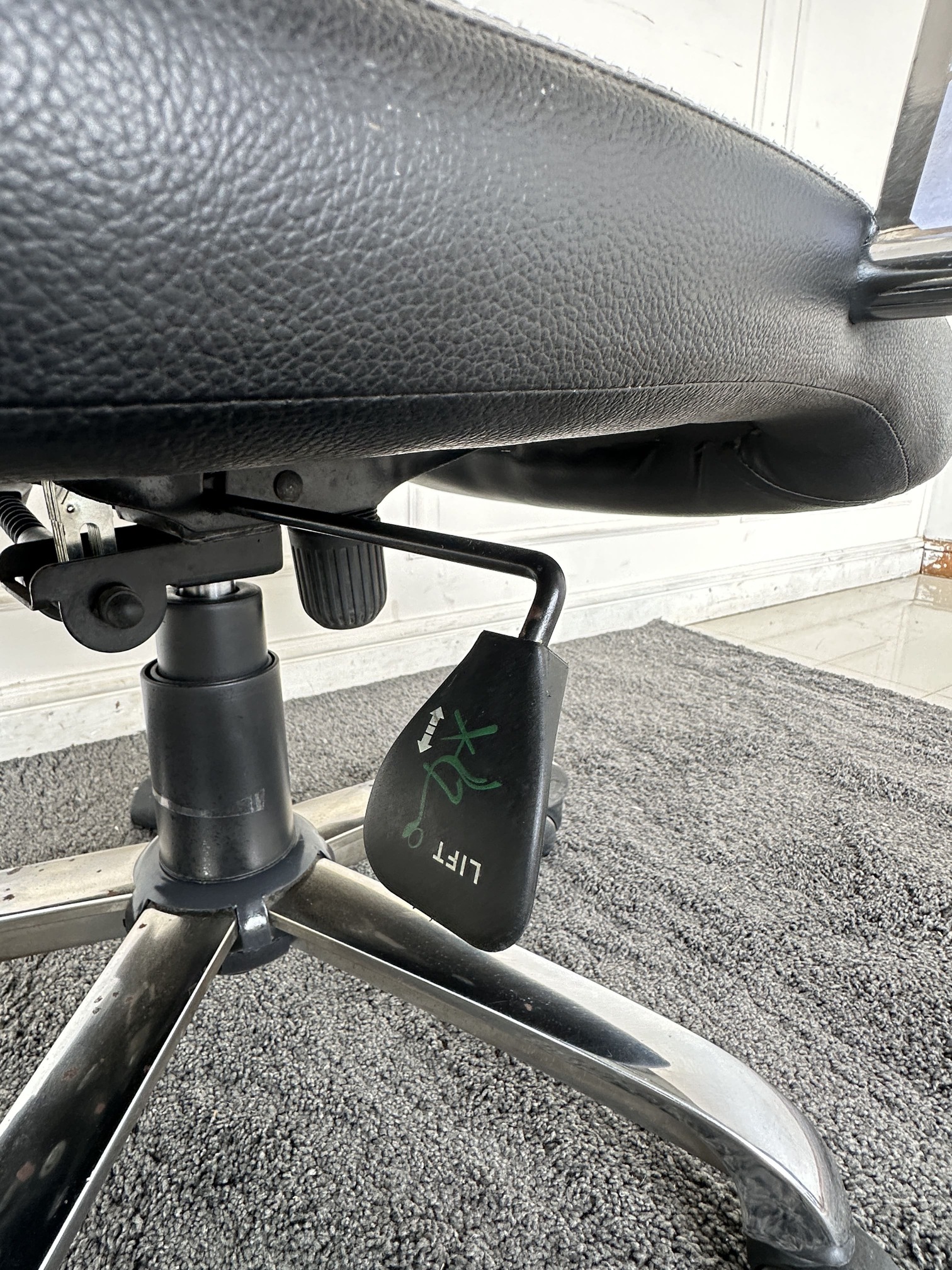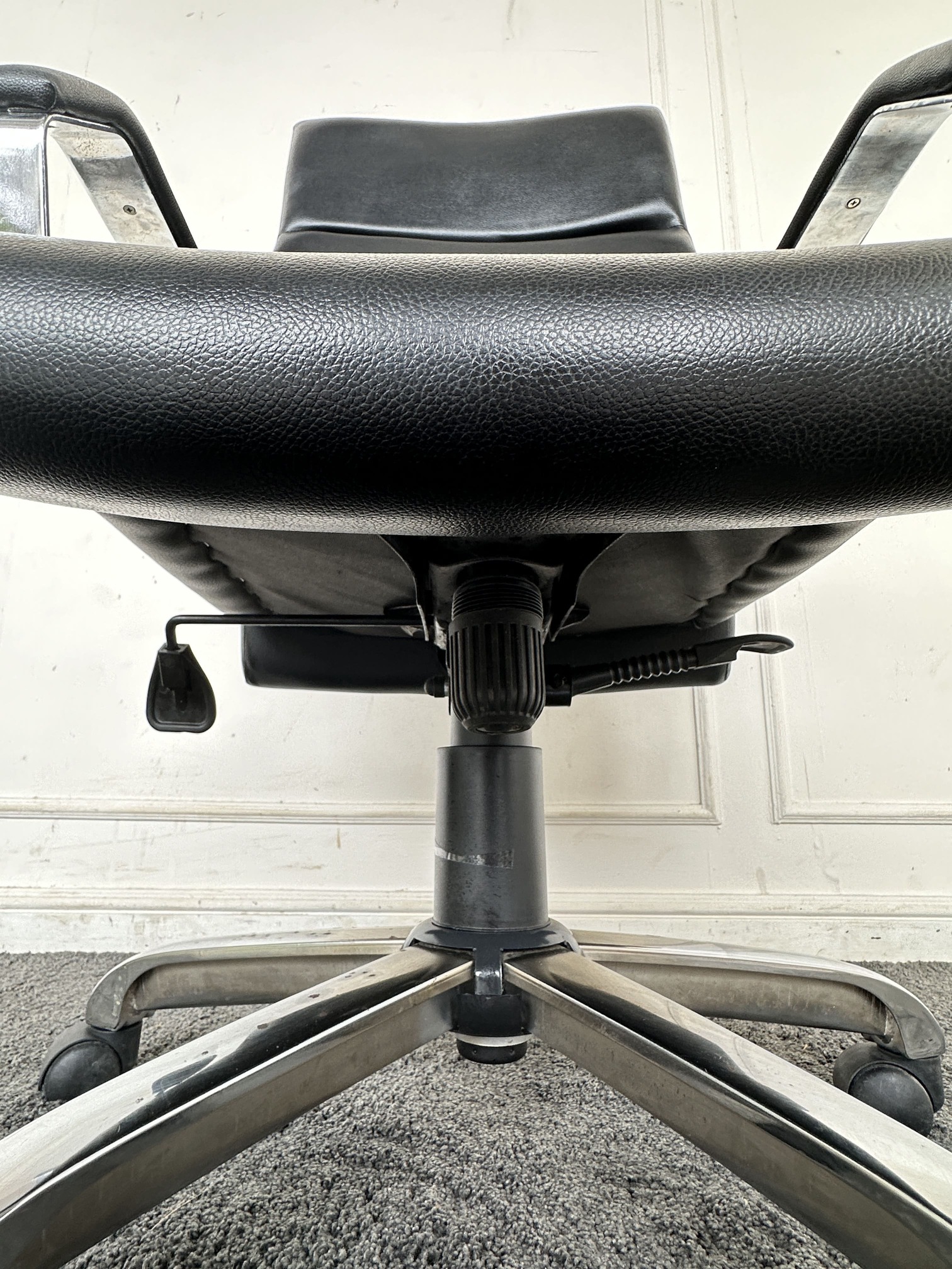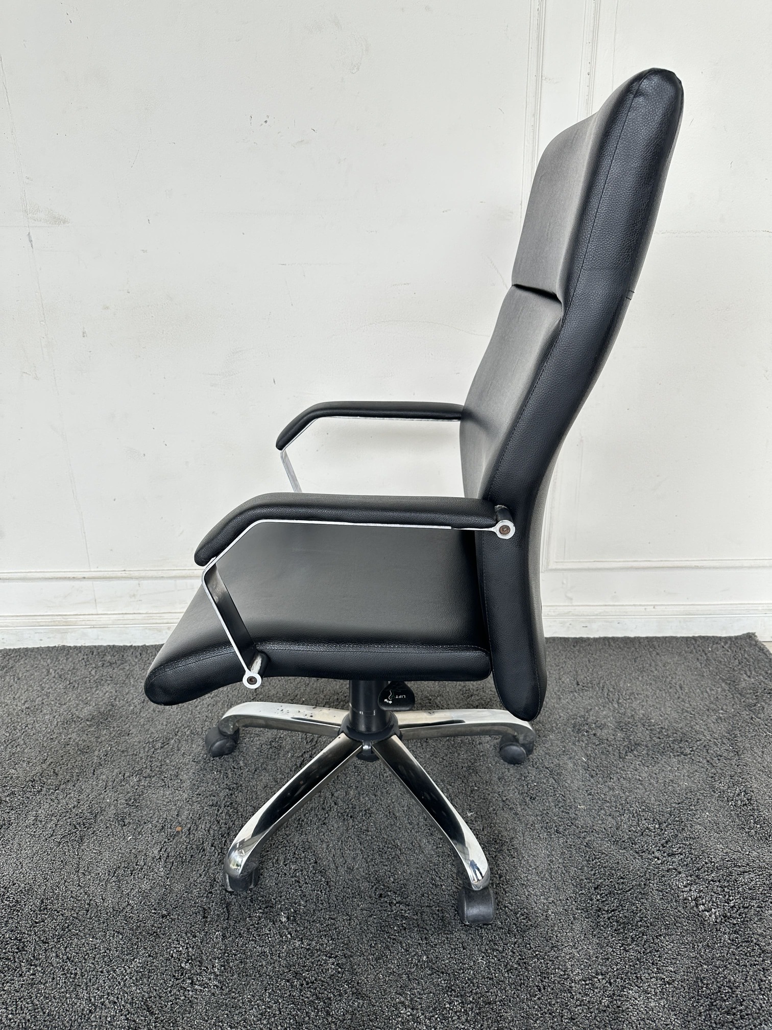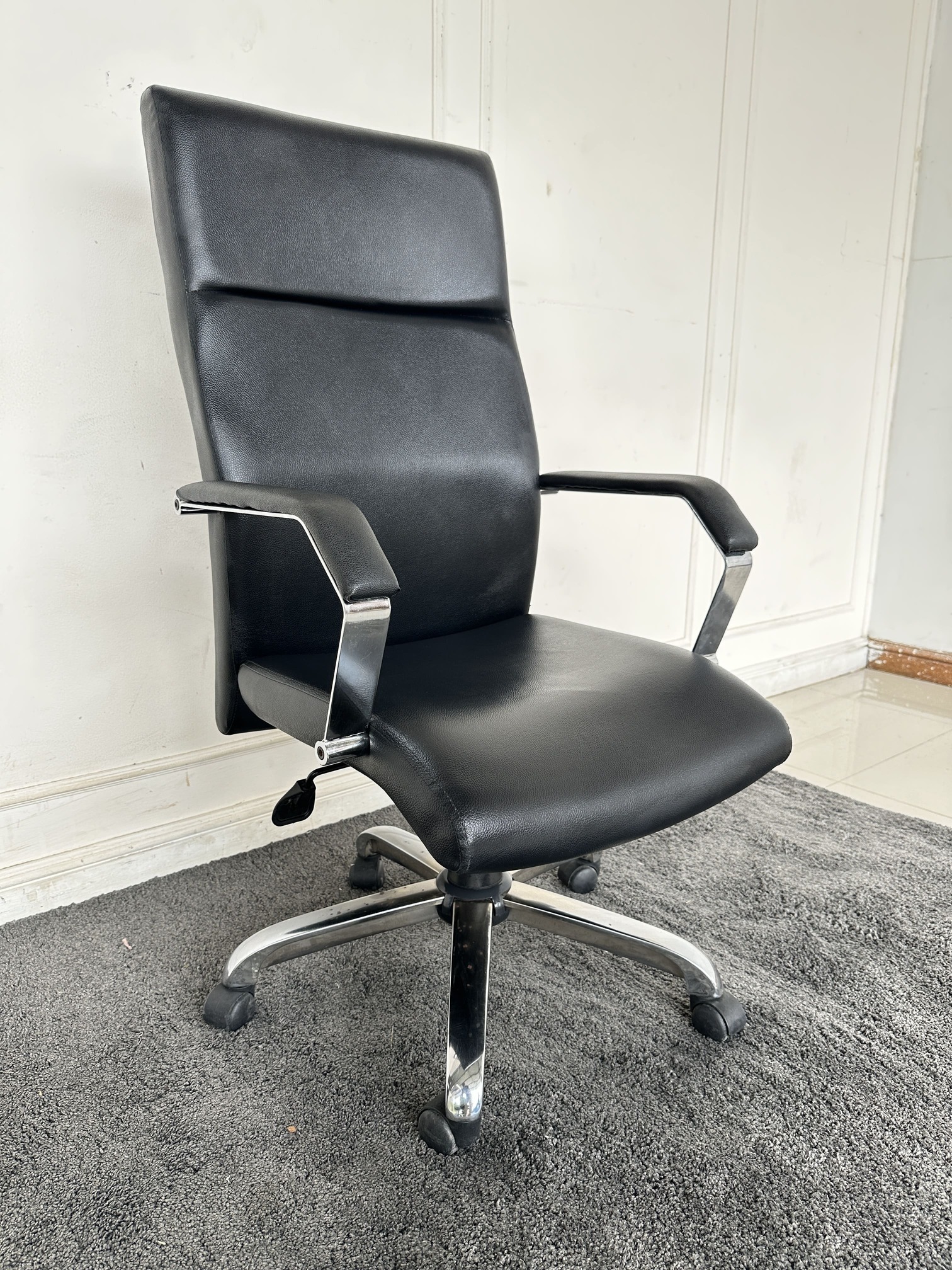 เก้าอี้สำนักงานหลังสูง เบาะหุ้มหนัง PU สีดำ มีโช็คปรับหนืด ล็อคพิงหลังได้ ขาเหล็ก ล้อเลื่อน