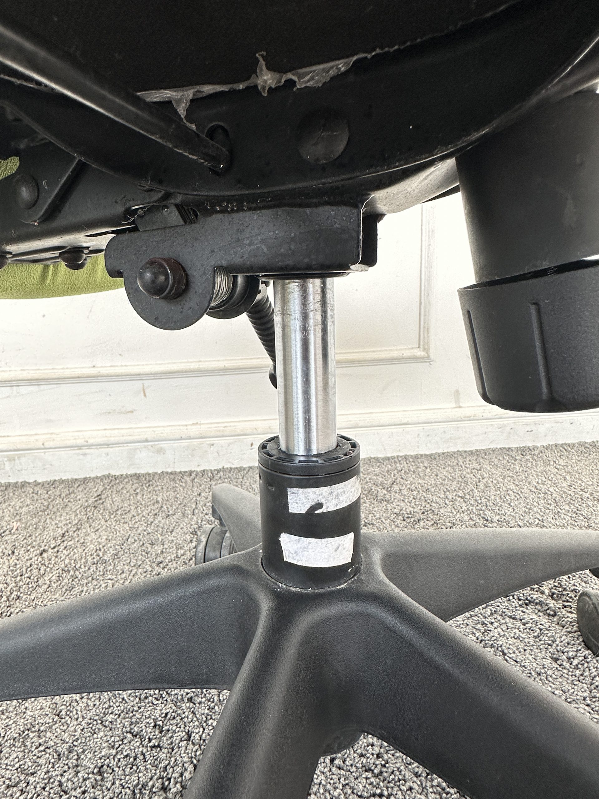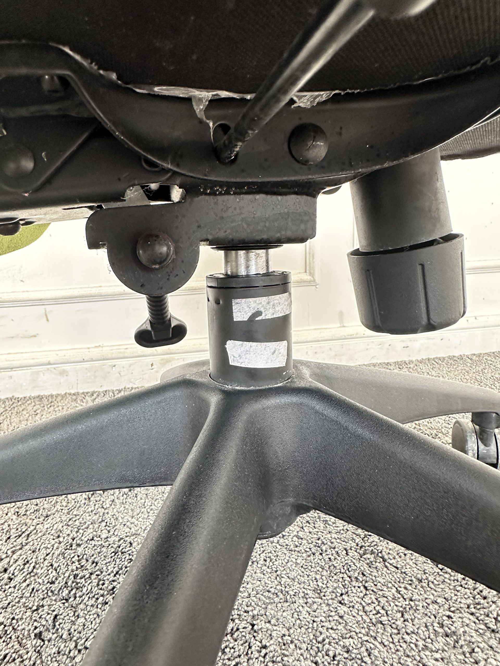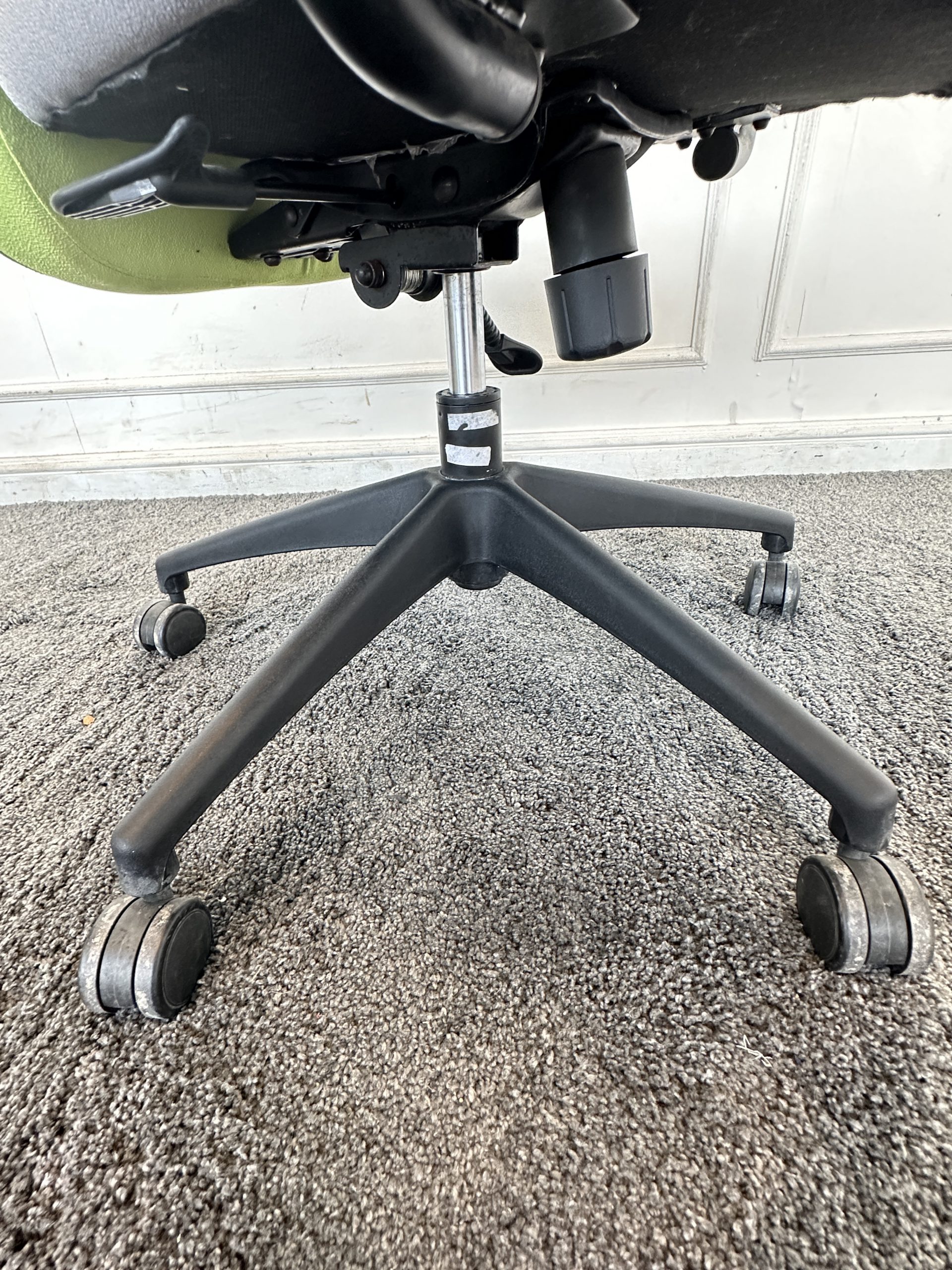 เก้าอี้สำนักงานหลังสูง เบาะผ้าสีเทา พิงหลังผ้าสีเขียว มีโช็คปรับหนืดล็อกพิงหลังได้ ขาพลาสติก ล้อเลื่อน