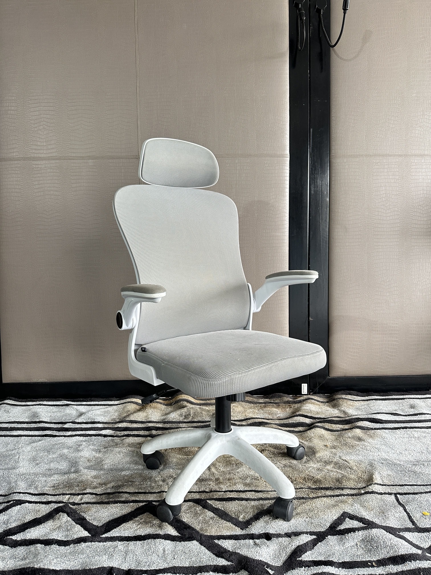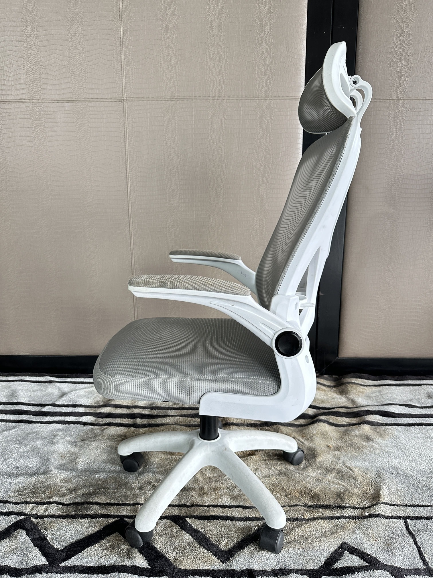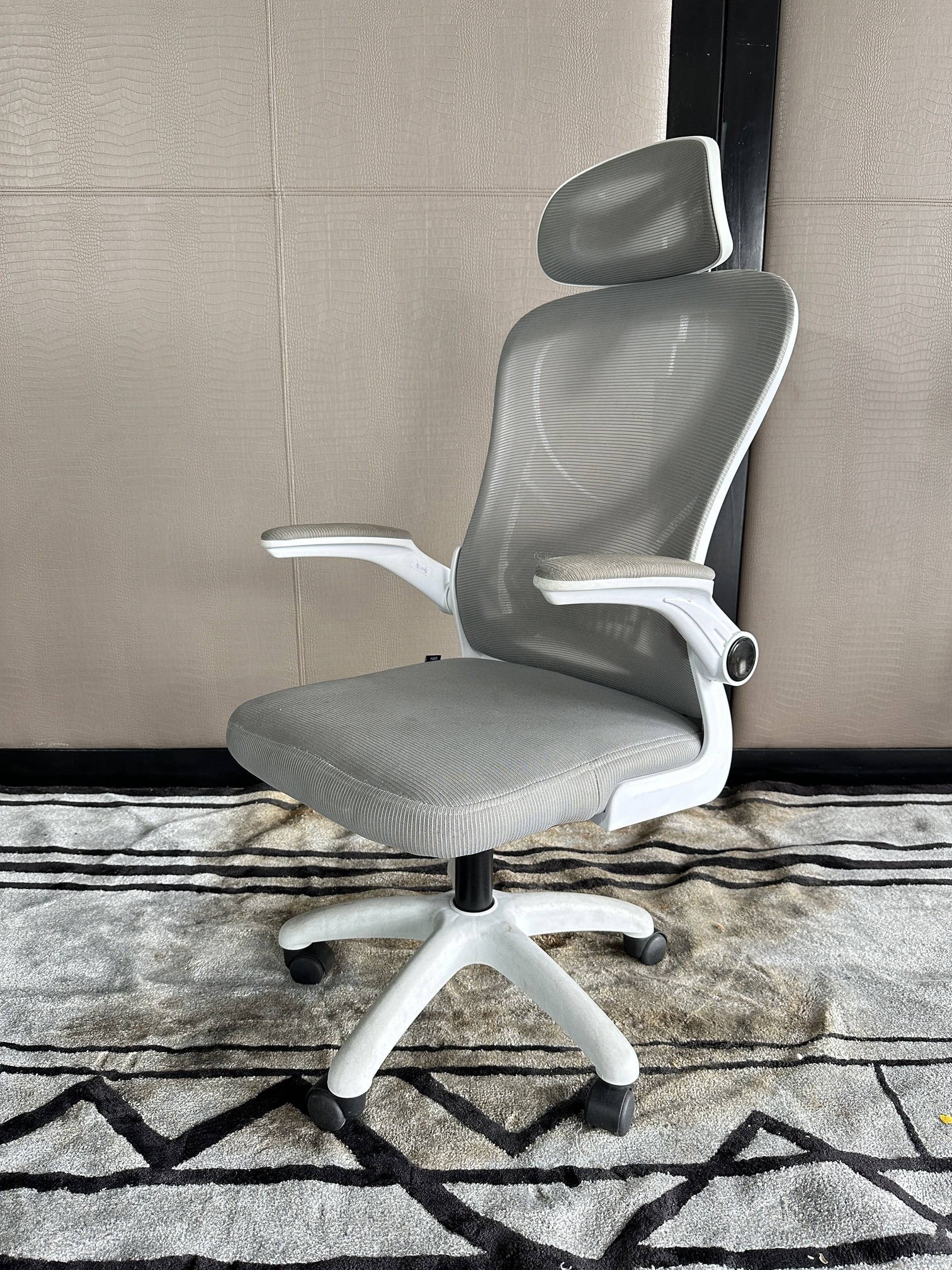เก้าอี้สำนักงานหลังสูง แบรนด์ DELI เบาะผ้าตาข่ายสีเทา มีพักคอ พักแขนพลาสติกพับขึ้นเก็บได้ มีโช็ค ขาพลาสติก ล้อเลื่อน