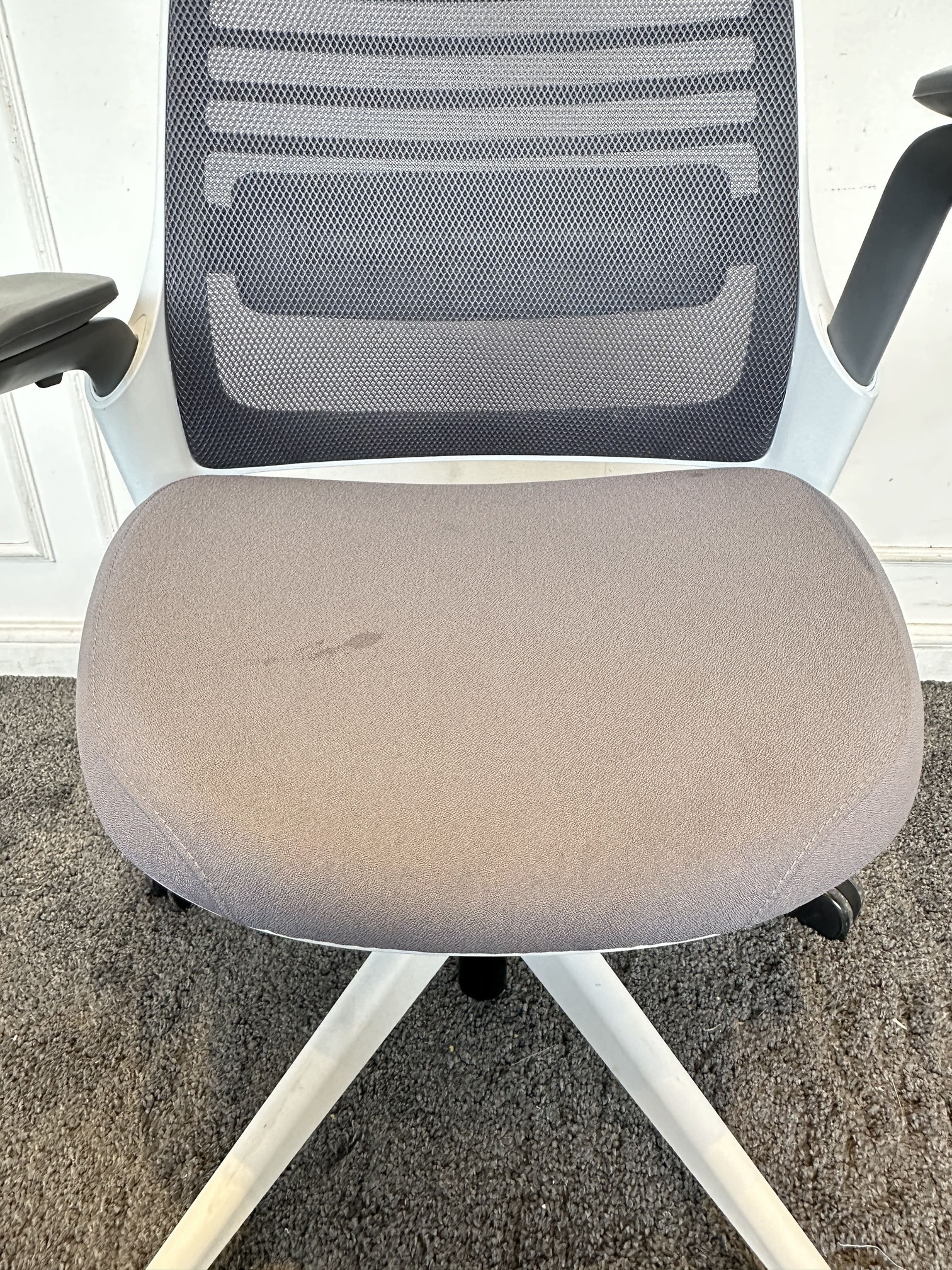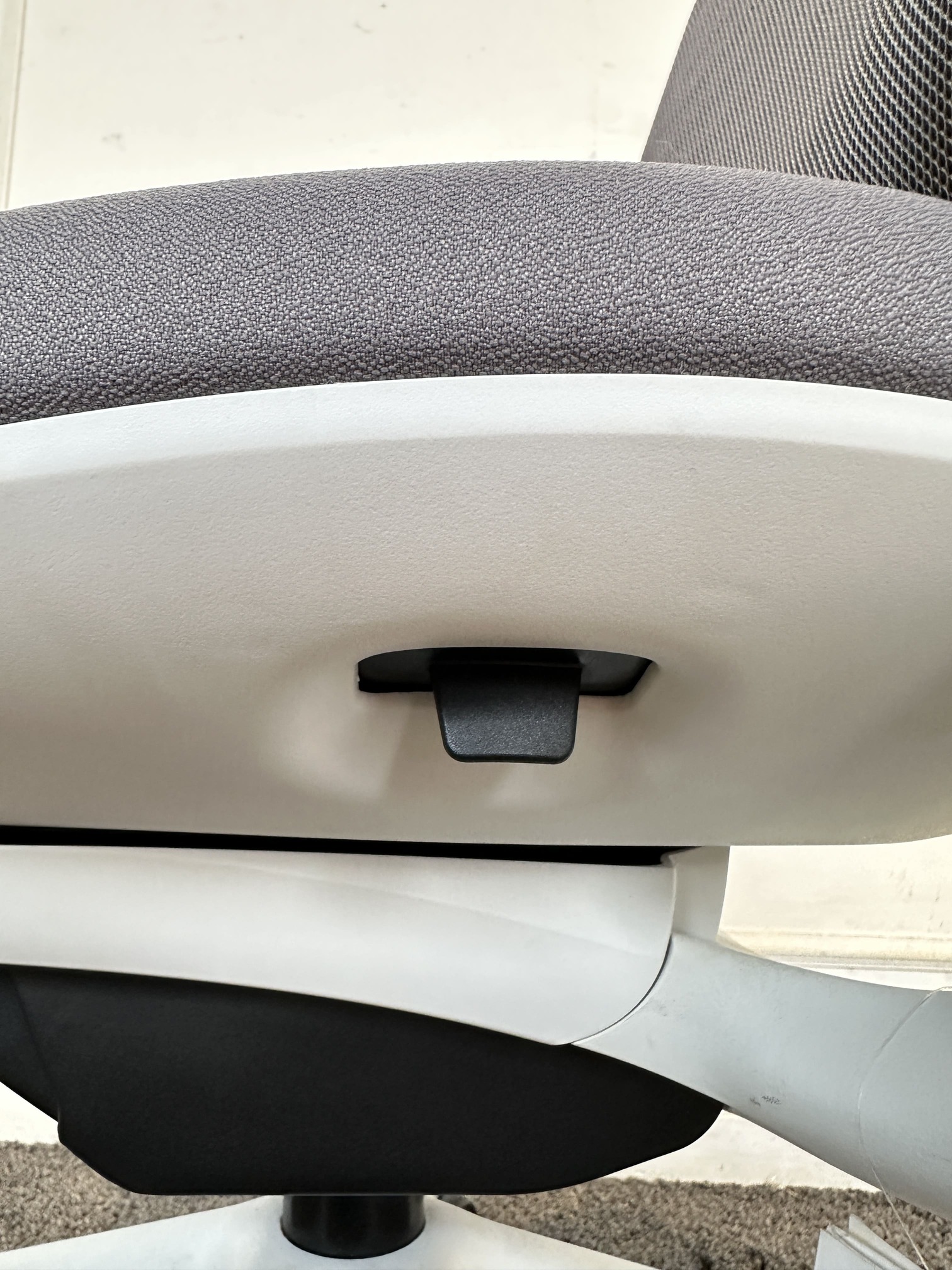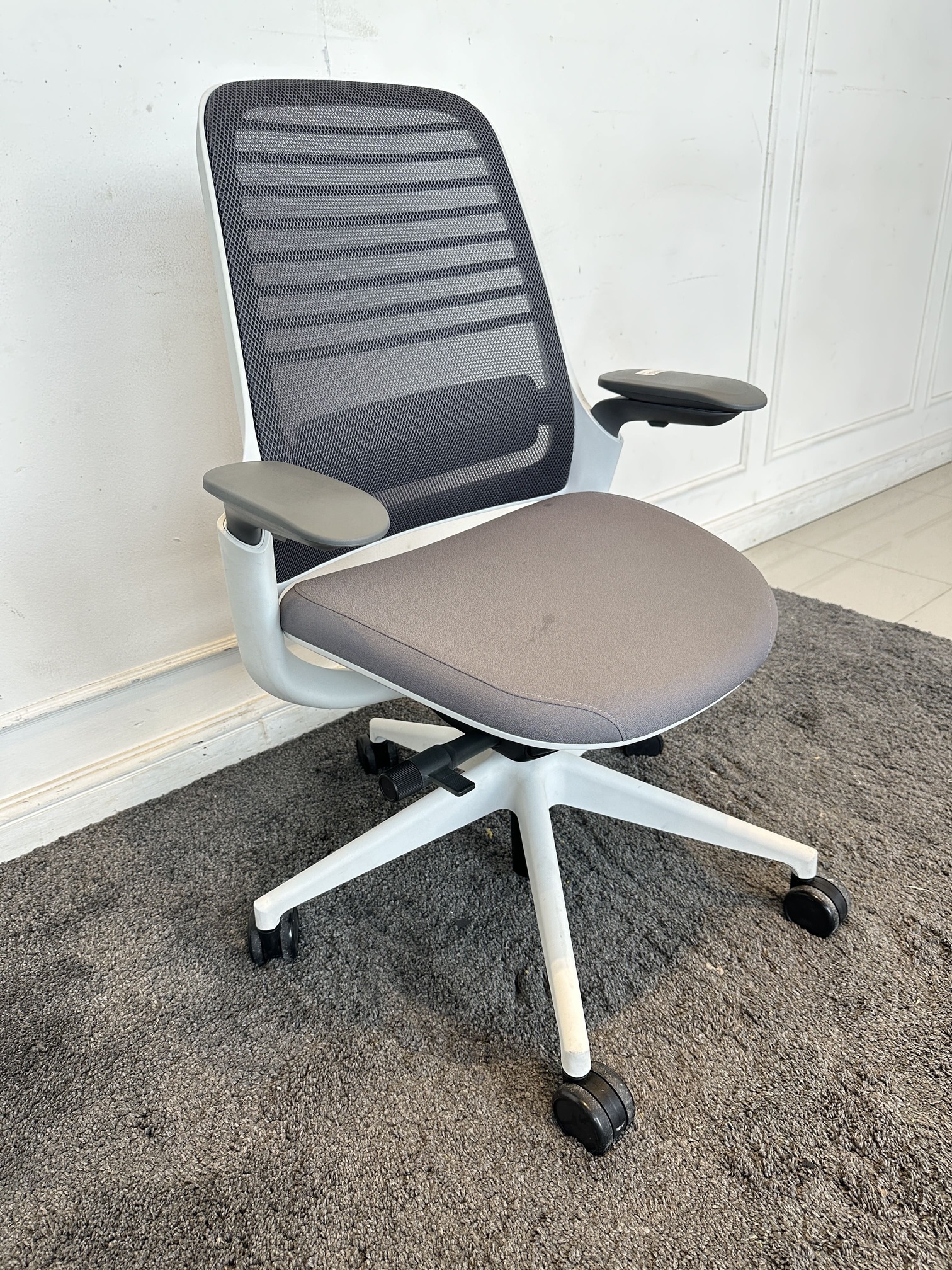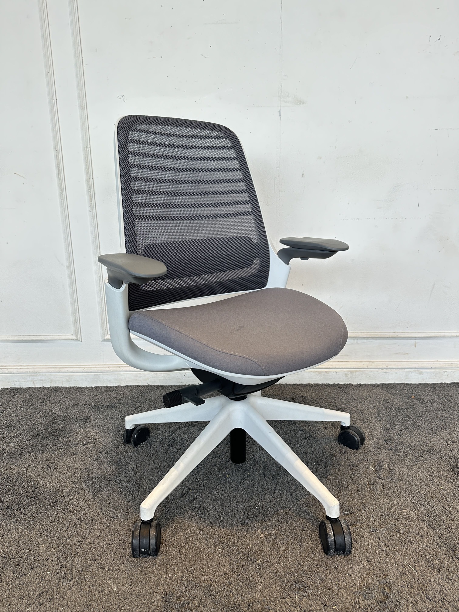 เก้าอี้สำนักงาน เพื่อสุขภาพ แบรนด์ Steelcase Ergonomic รุ่น Series 1 เบาะผ้าพิงหลังตาข่ายสีเทา เลื่อนเข้าออกได้ ดันหลังและพักแขนพลาสติกปรับขึ้นลงได้ มีโช็คปรับหนืด ขาพลาสติก ล้อเลื่อน