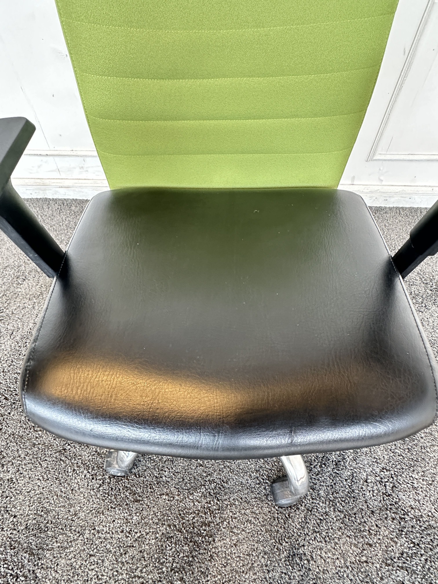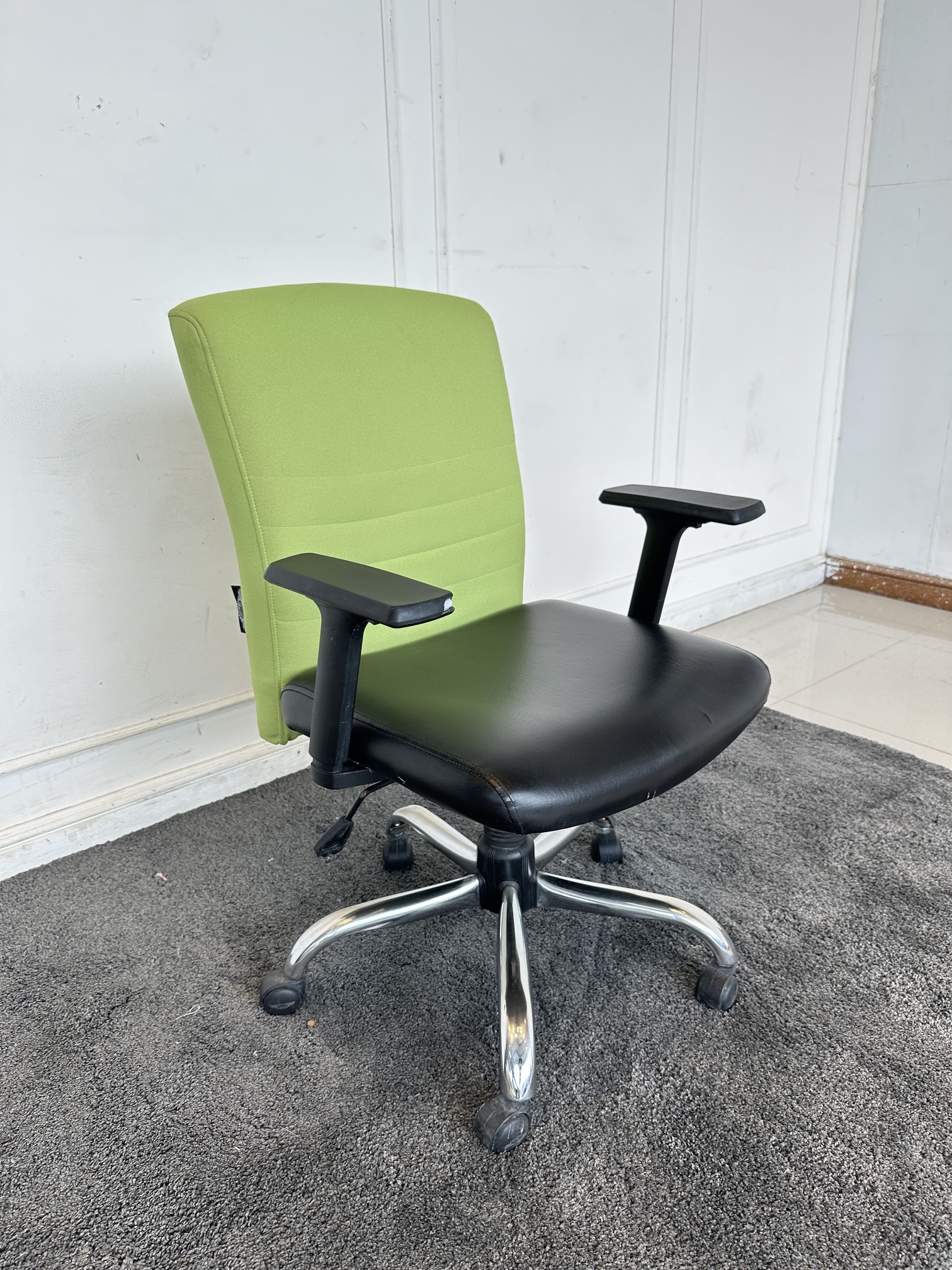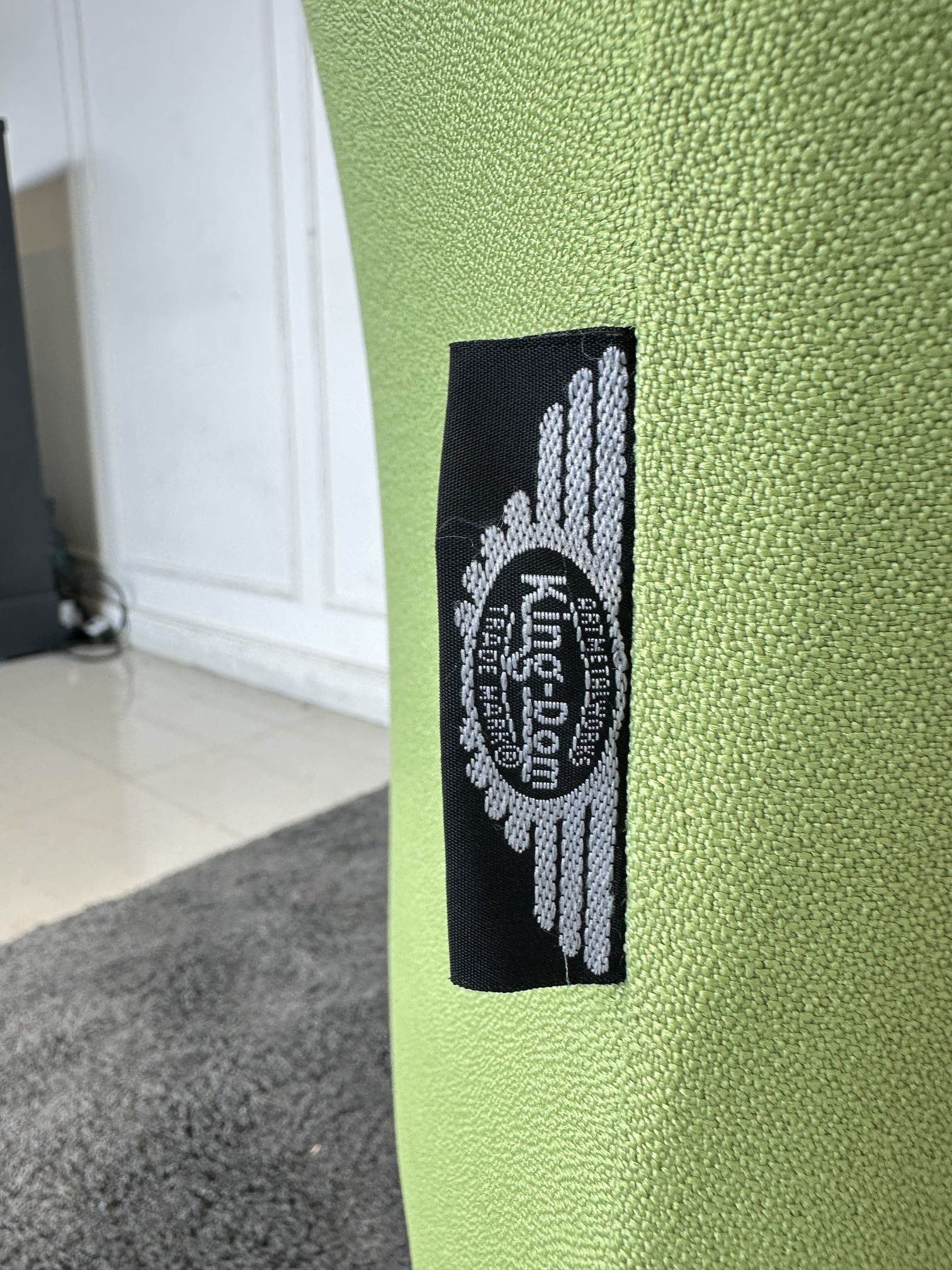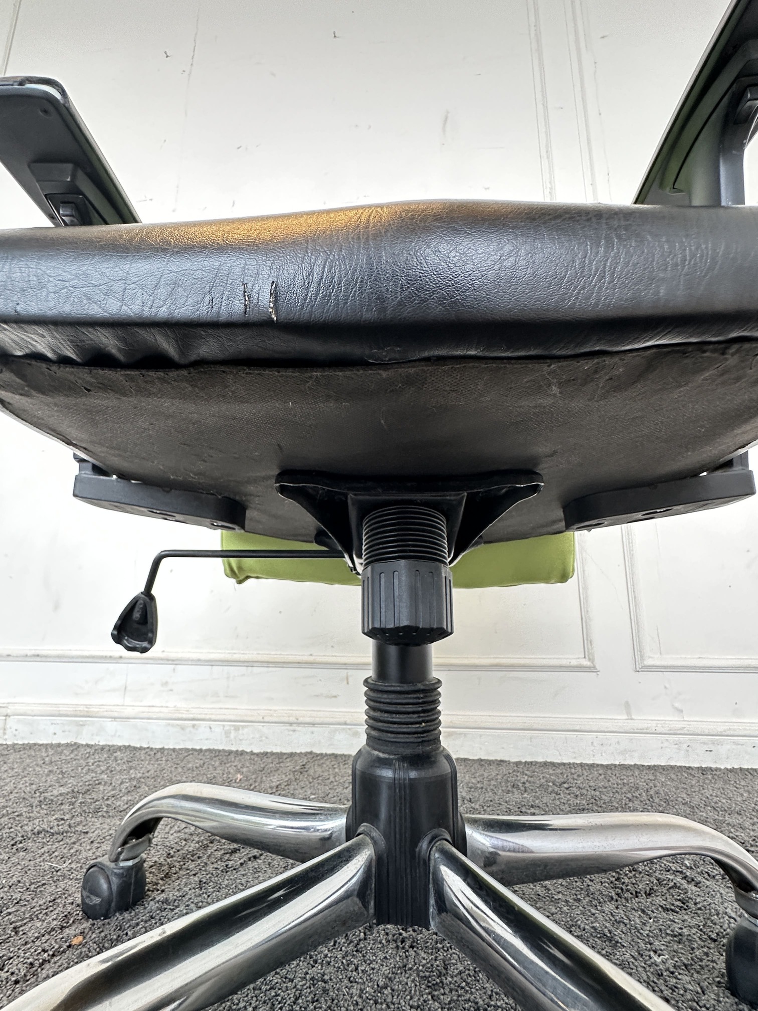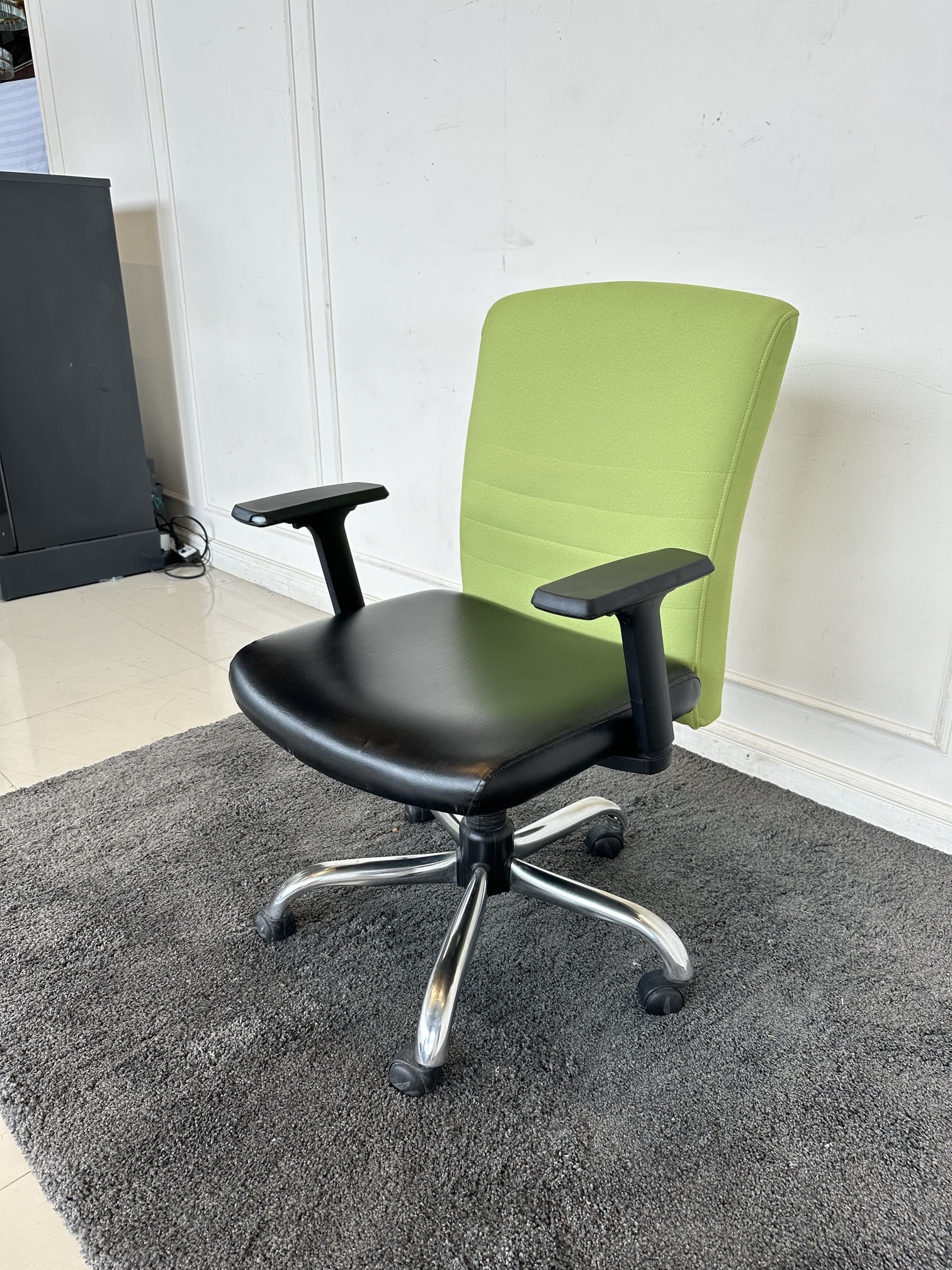 เก้าอี้สำนักงาน แบรนด์ KING-DOM เบาะหนัง PU สีดำ พิงหลังผ้าสีเขียว มีโช็คปรับหนืดล็อคพิงหลังได้ ขาเหล็ก ล้อเลื่อน