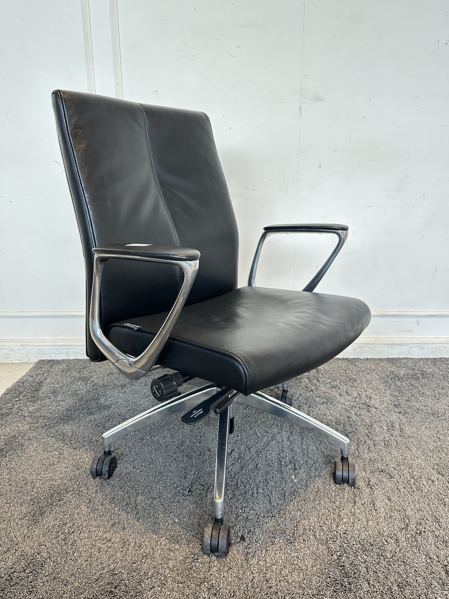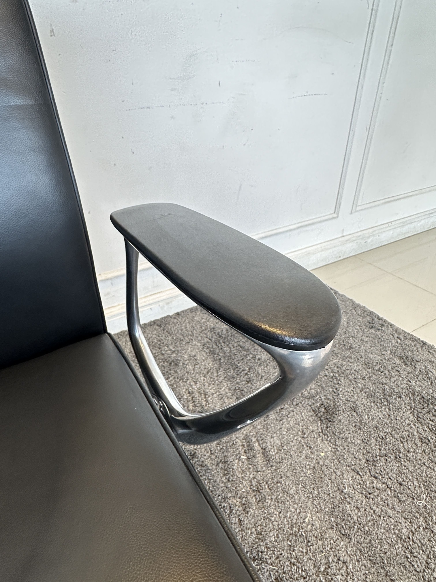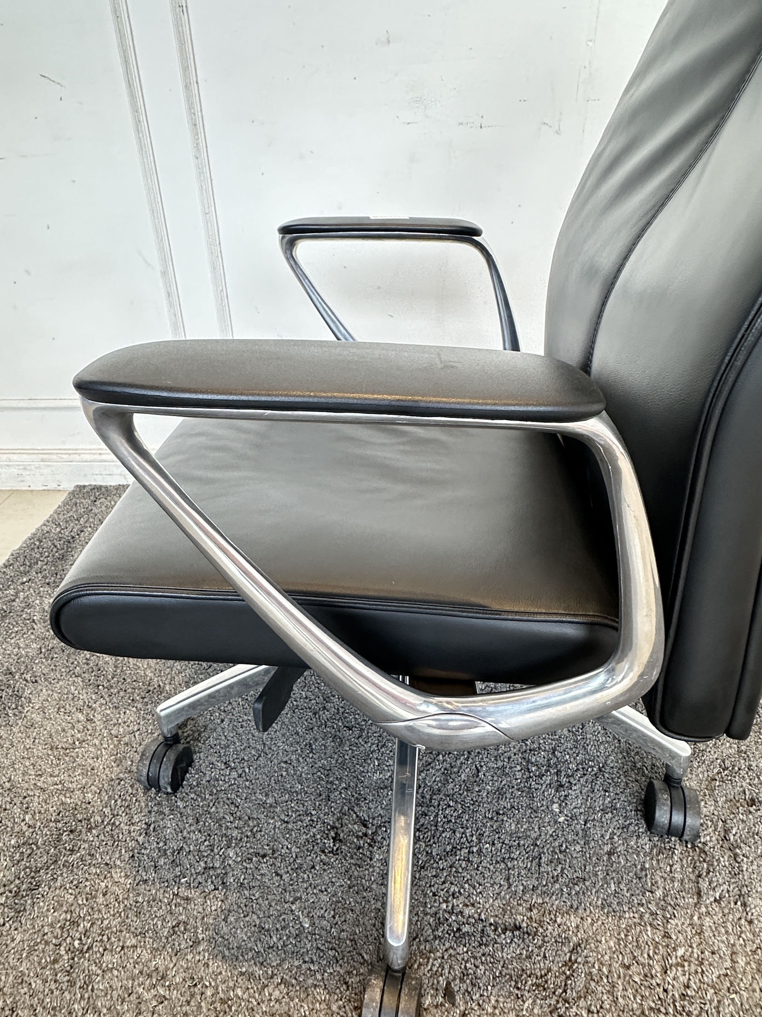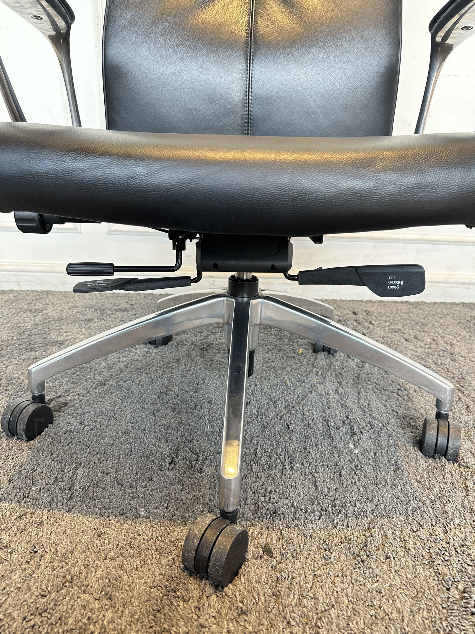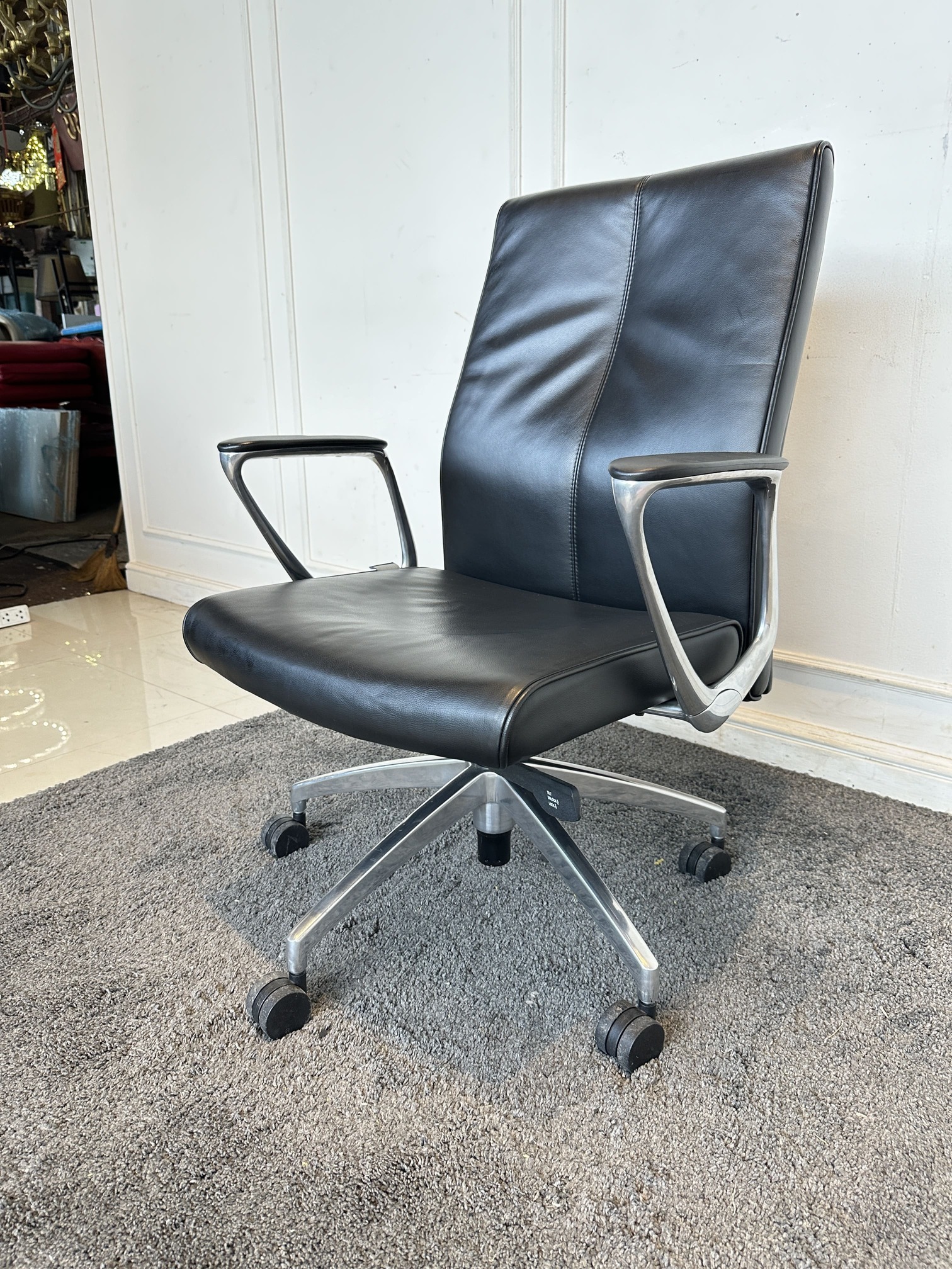 เก้าอี้สำนักงาน แบรนด์ MODERNFORM เบาะและพิงหลังหุ้มหนังแท้สีดำ พักแขนอลูมิเนียม ล้อเลื่อน