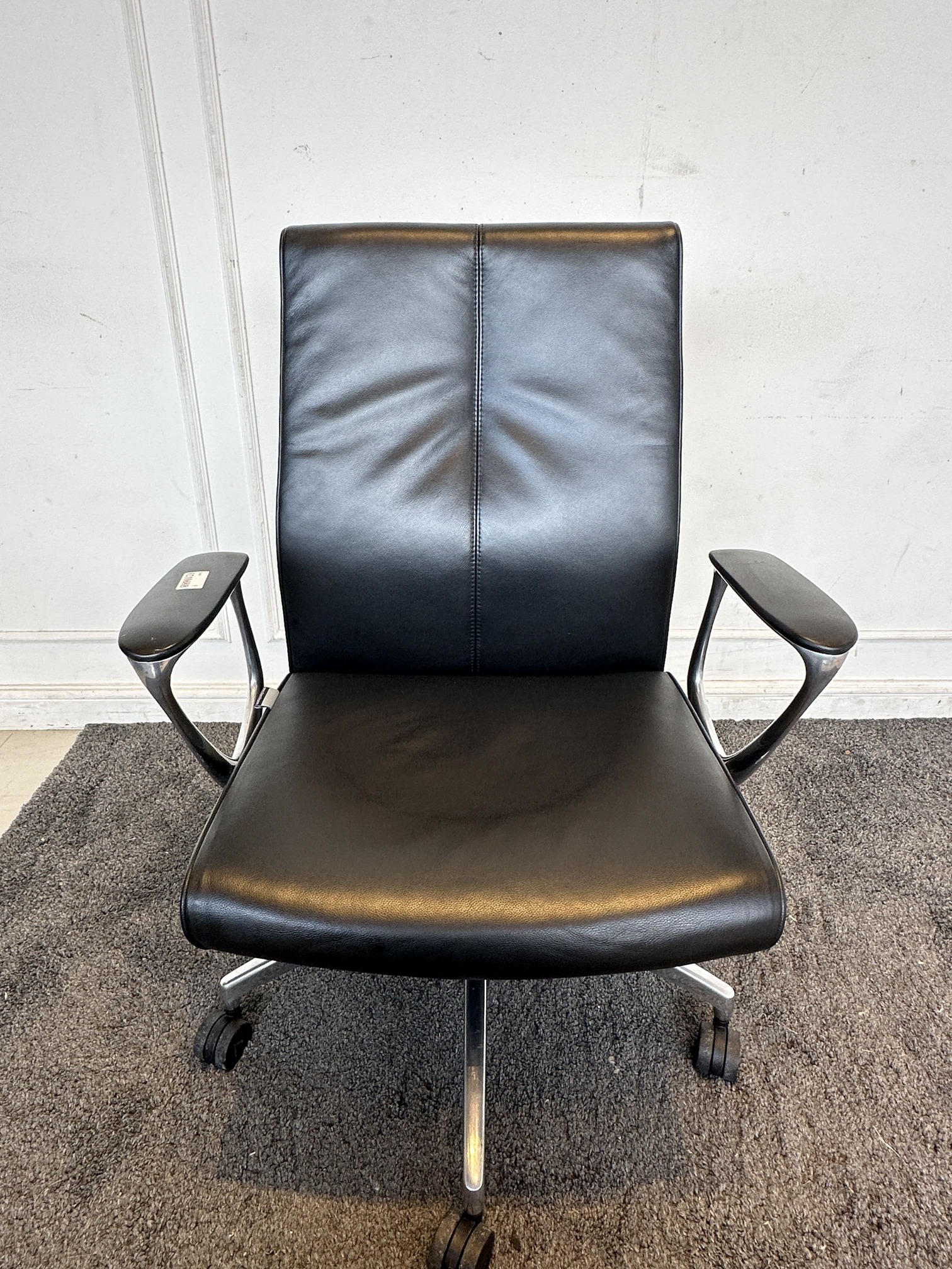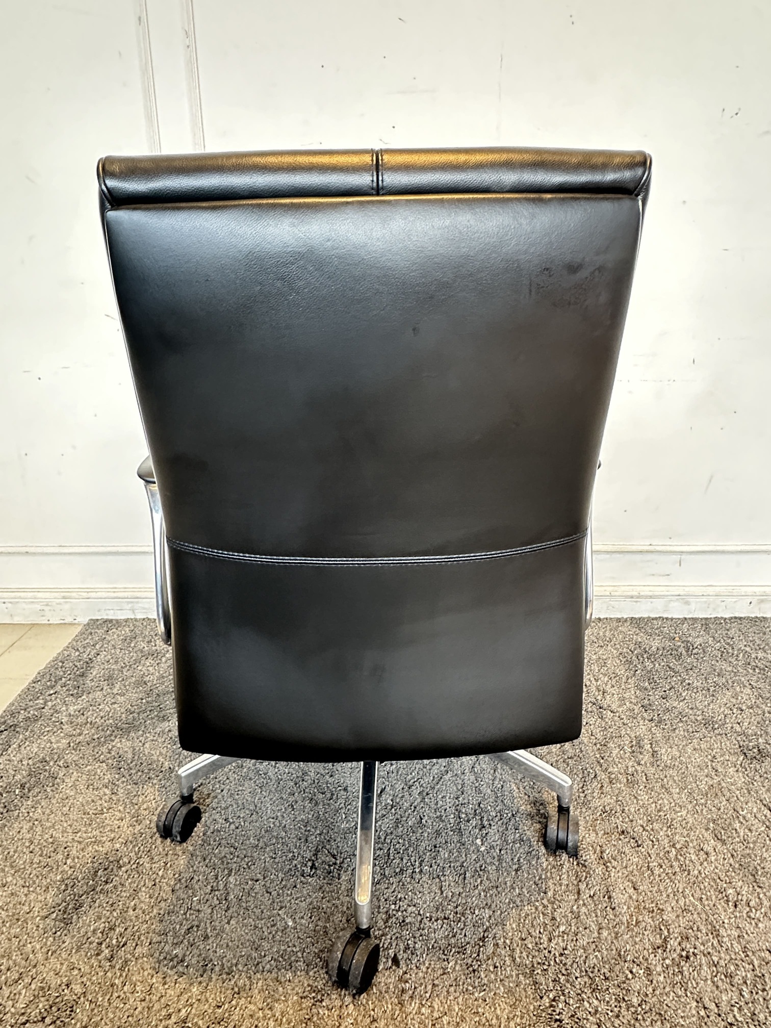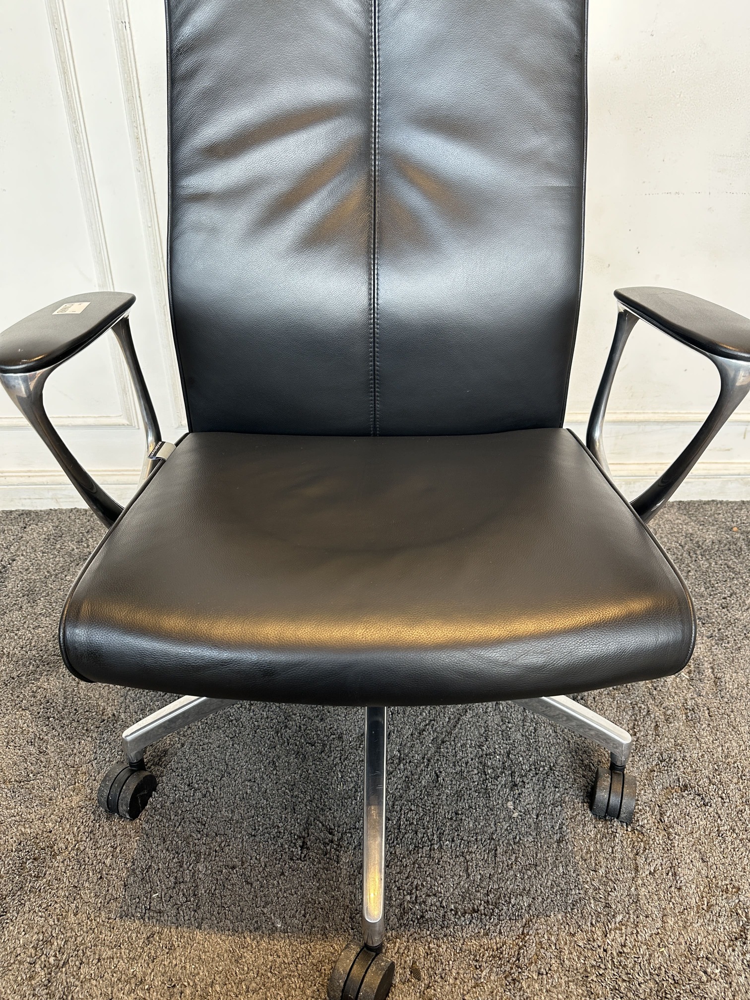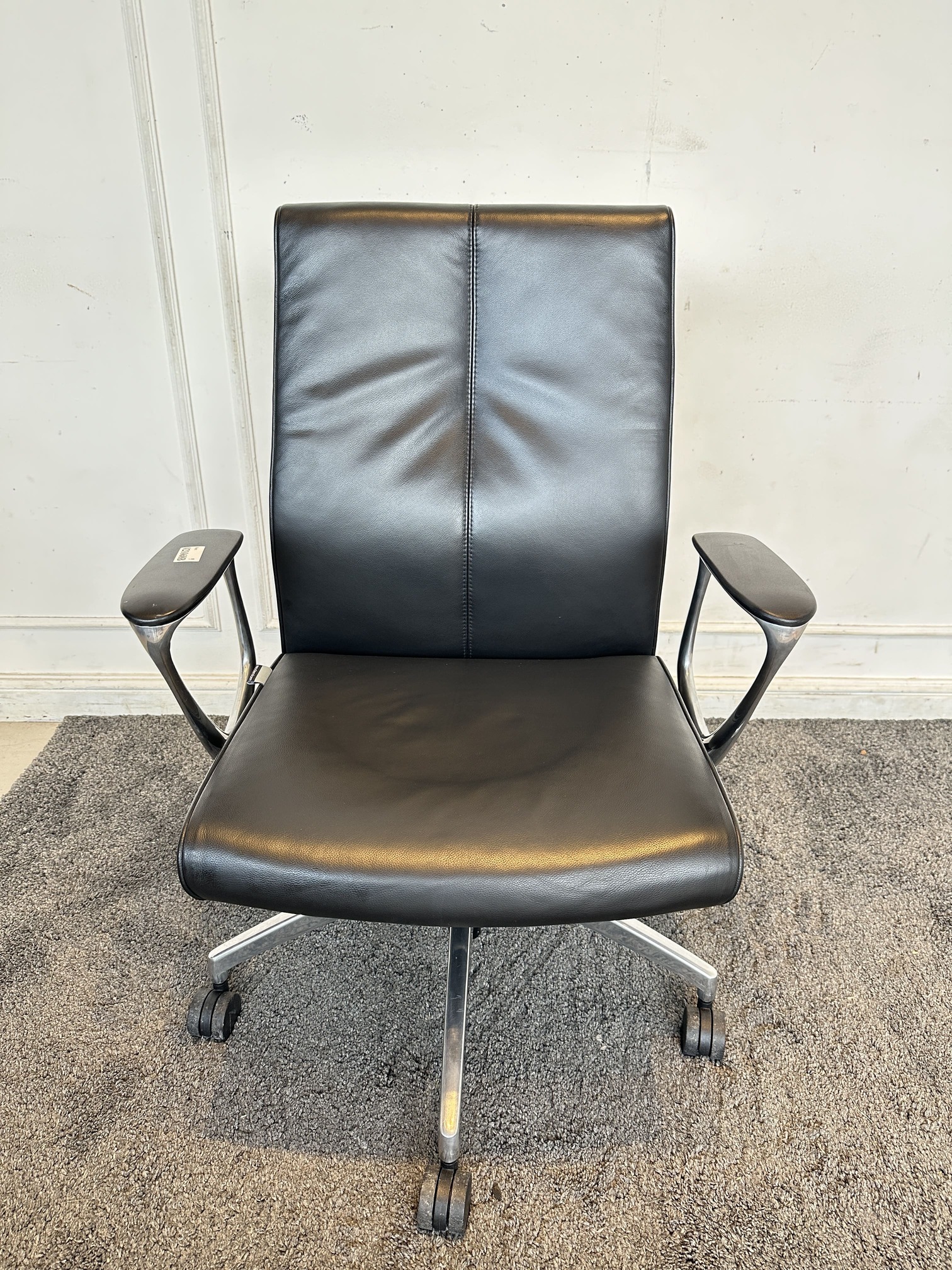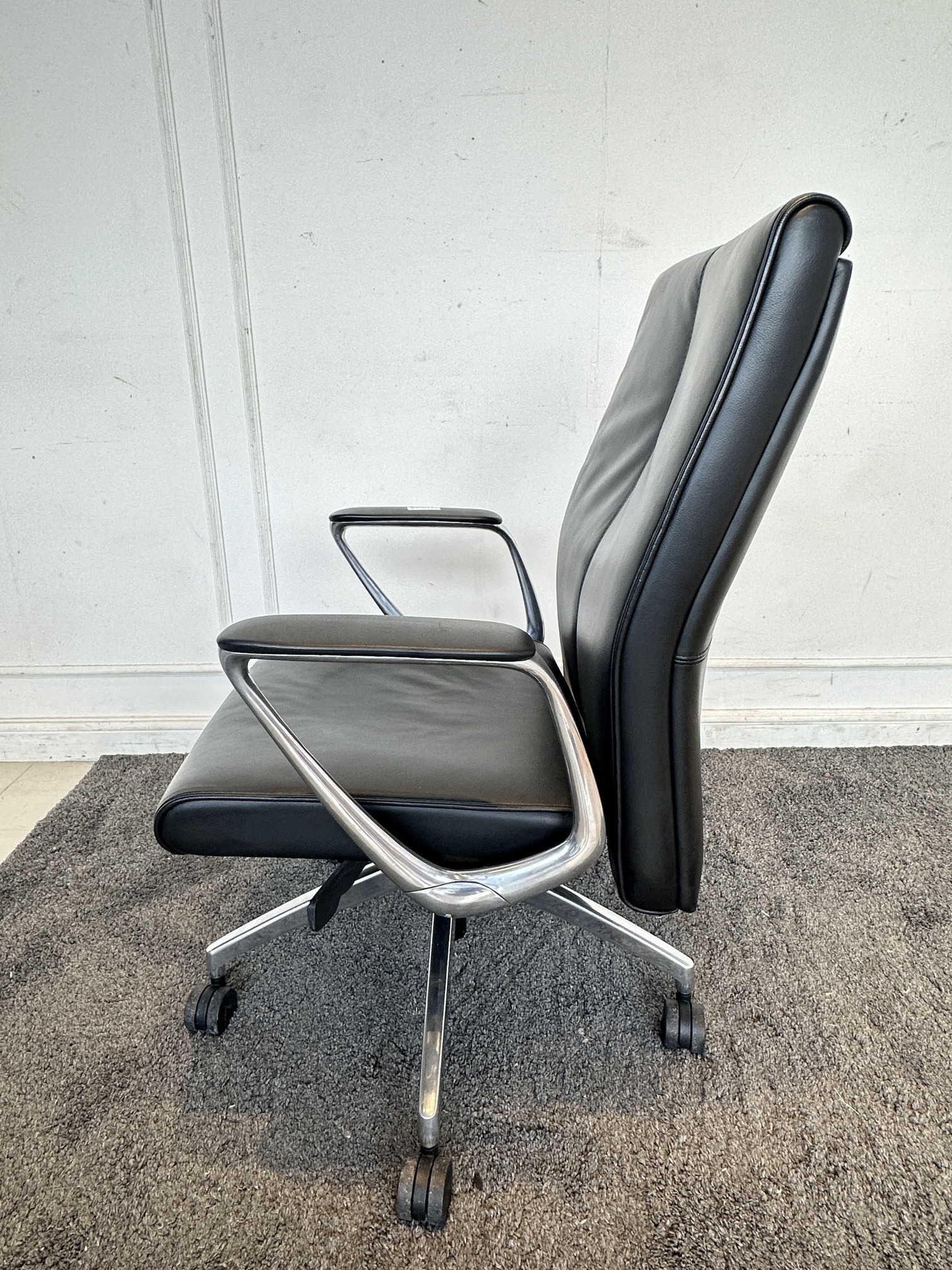 เก้าอี้สำนักงาน แบรนด์ MODERNFORM เบาะและพิงหลังหุ้มหนังแท้สีดำ พักแขนอลูมิเนียม ล้อเลื่อน