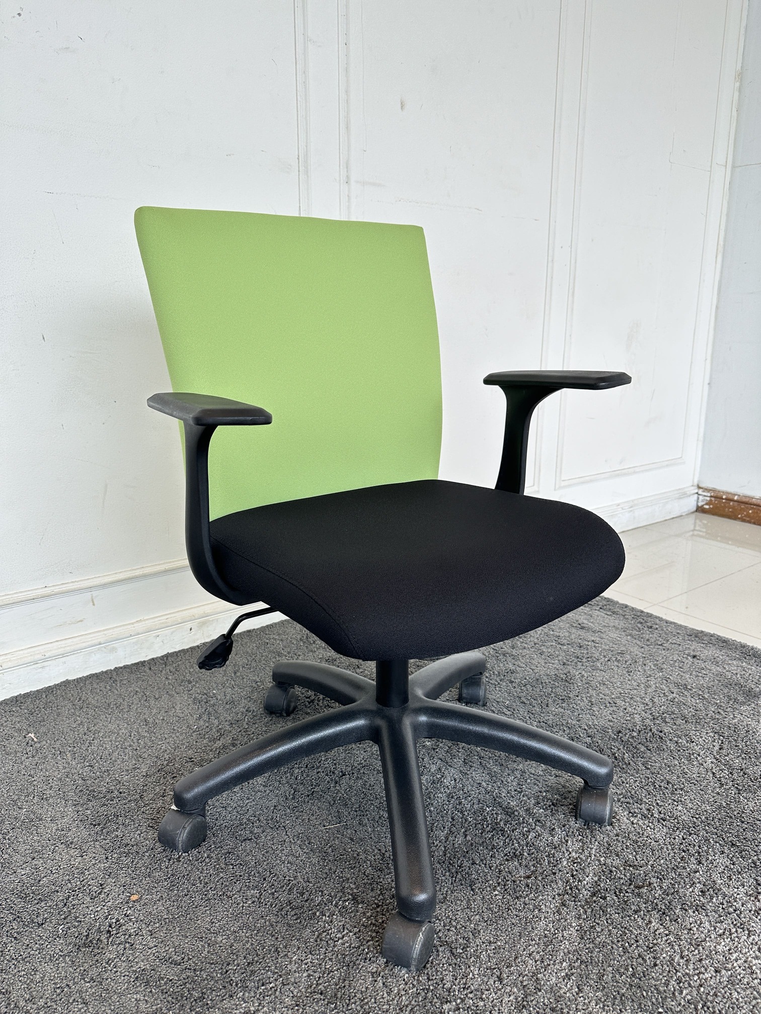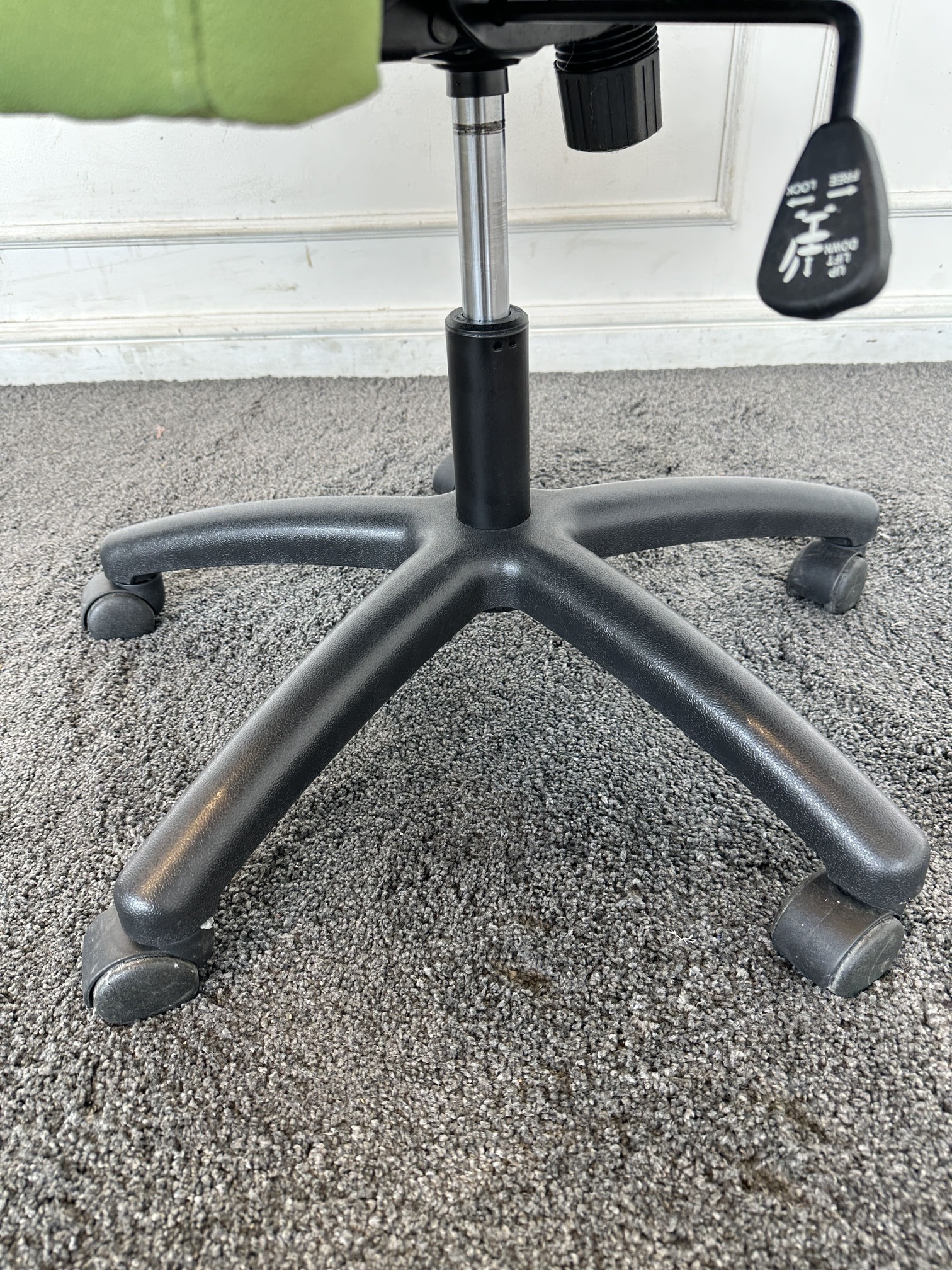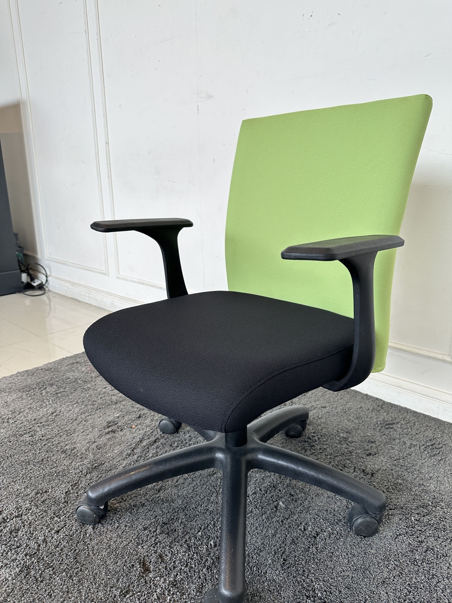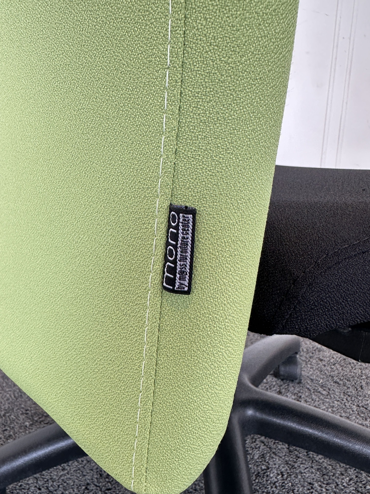 เก้าอี้สำนักงาน แบรนด์ MONO เบาะผ้าสีดำ พิงหลังสีเขียว มีโช็ค ปรับหนืดล็อคพิงหลังได้ ขาพลาสติกสีดำ ล้อเลื่อน
