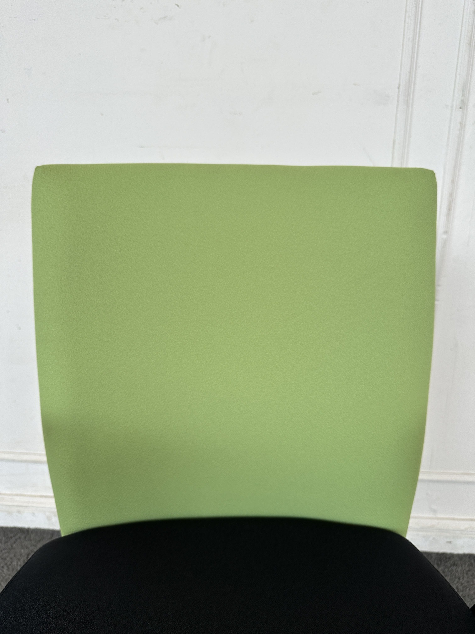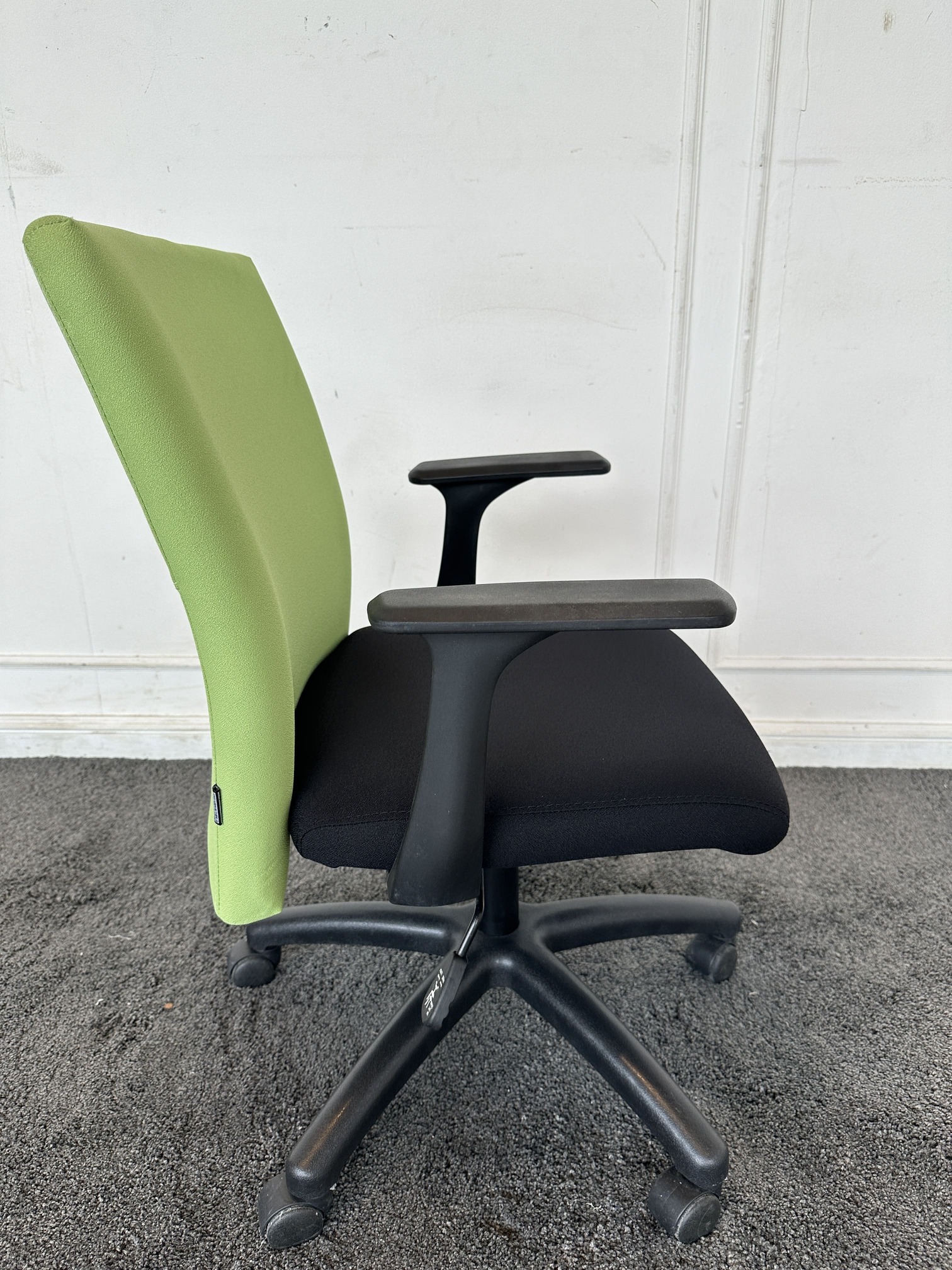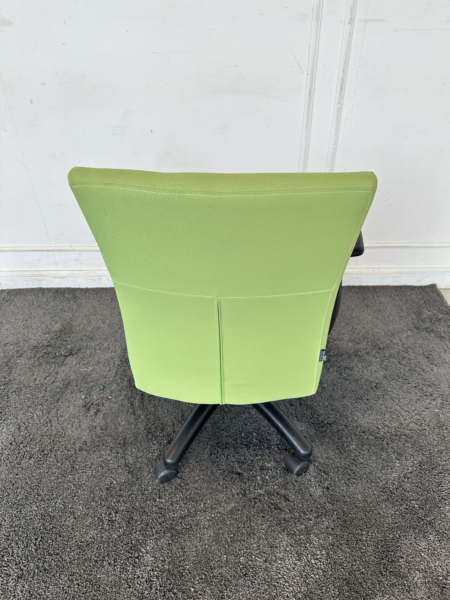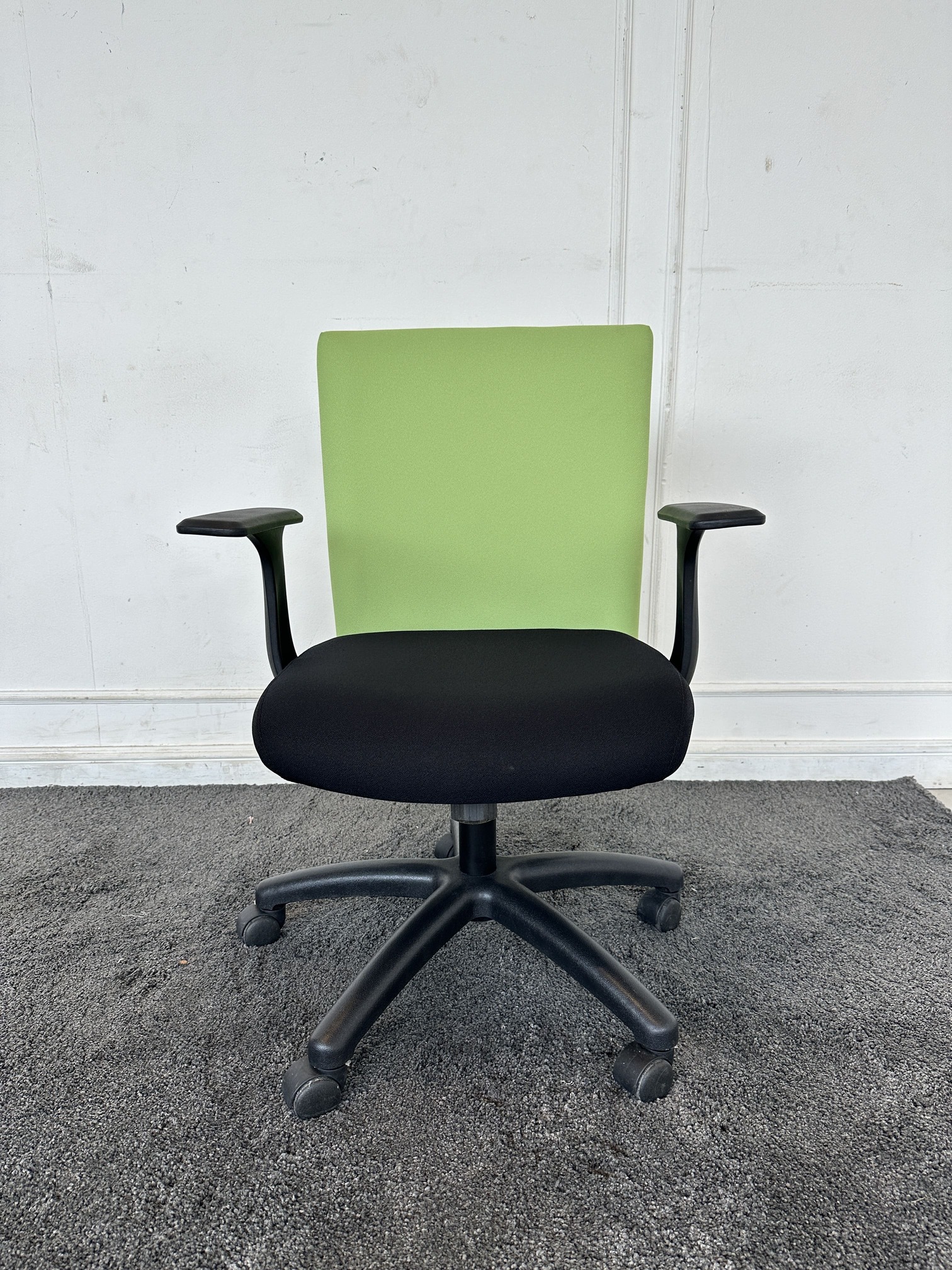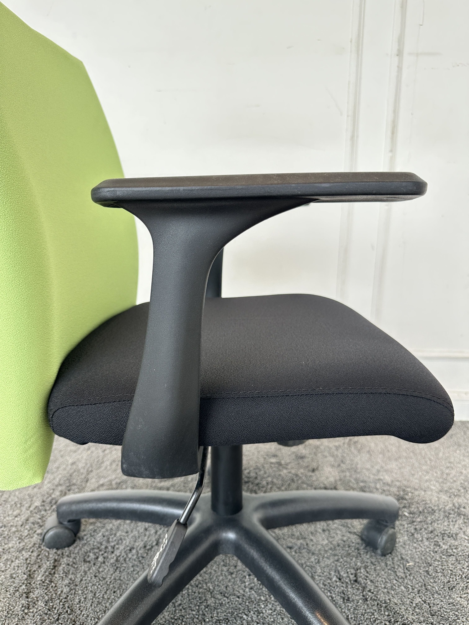 เก้าอี้สำนักงาน แบรนด์ MONO เบาะผ้าสีดำ พิงหลังสีเขียว มีโช็ค ปรับหนืดล็อคพิงหลังได้ ขาพลาสติกสีดำ ล้อเลื่อน