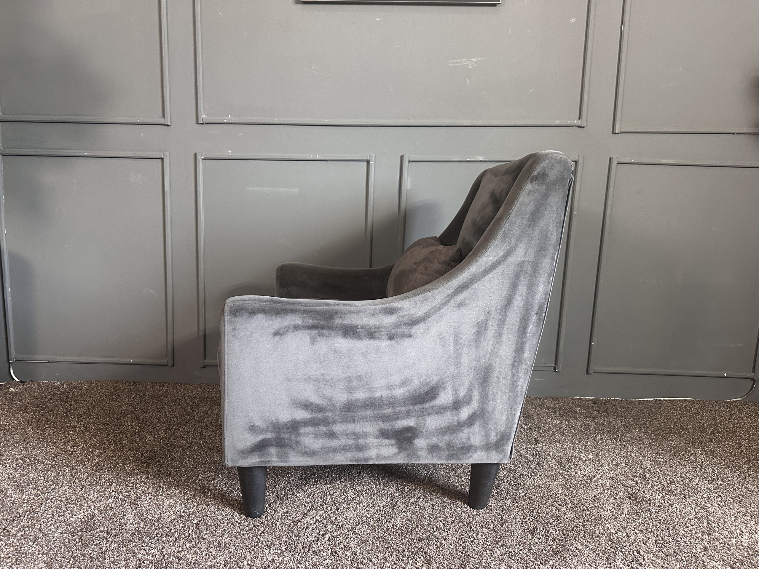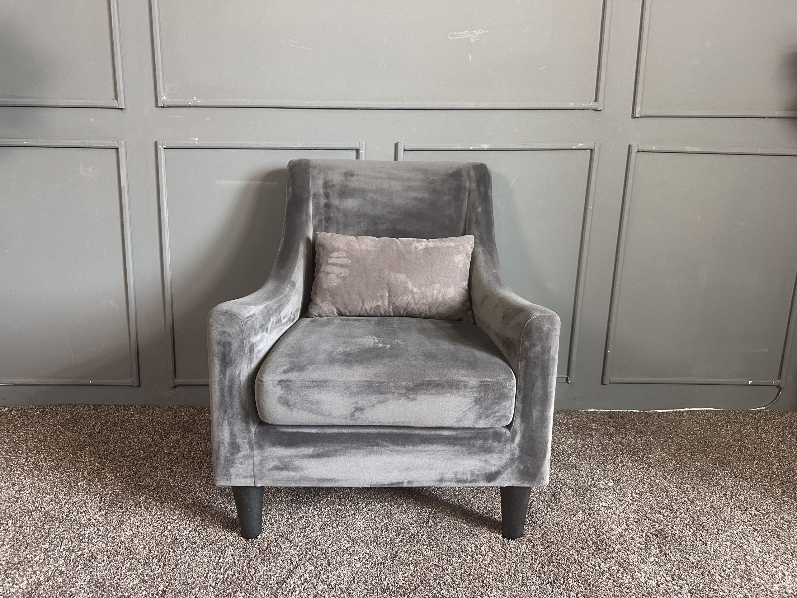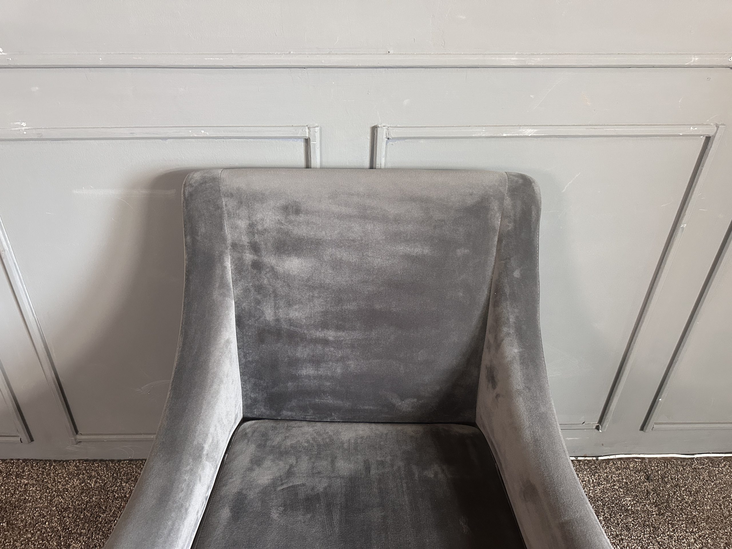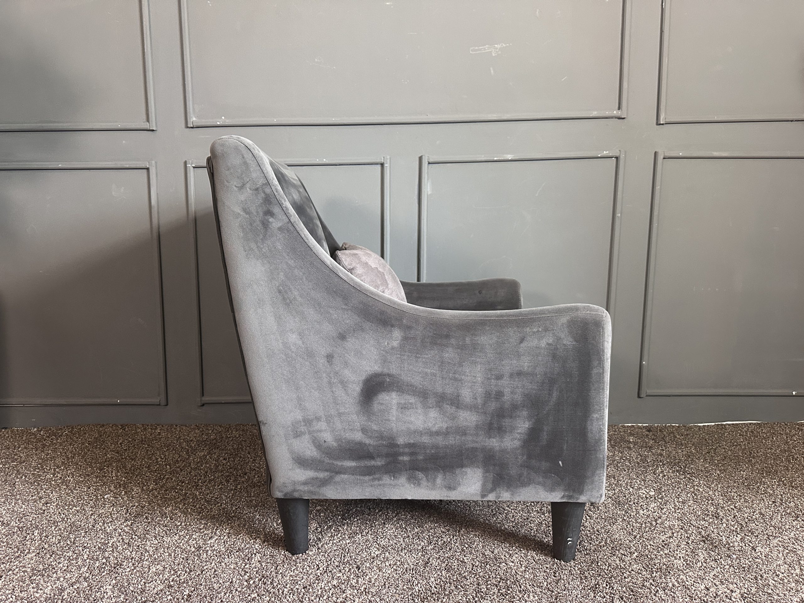 เก้าอี้อาร์มแชร์ เบาะผ้ากำมะหยี่สีเทา ขาไม้กลึงสีดำ พร้อมหมอนอิง