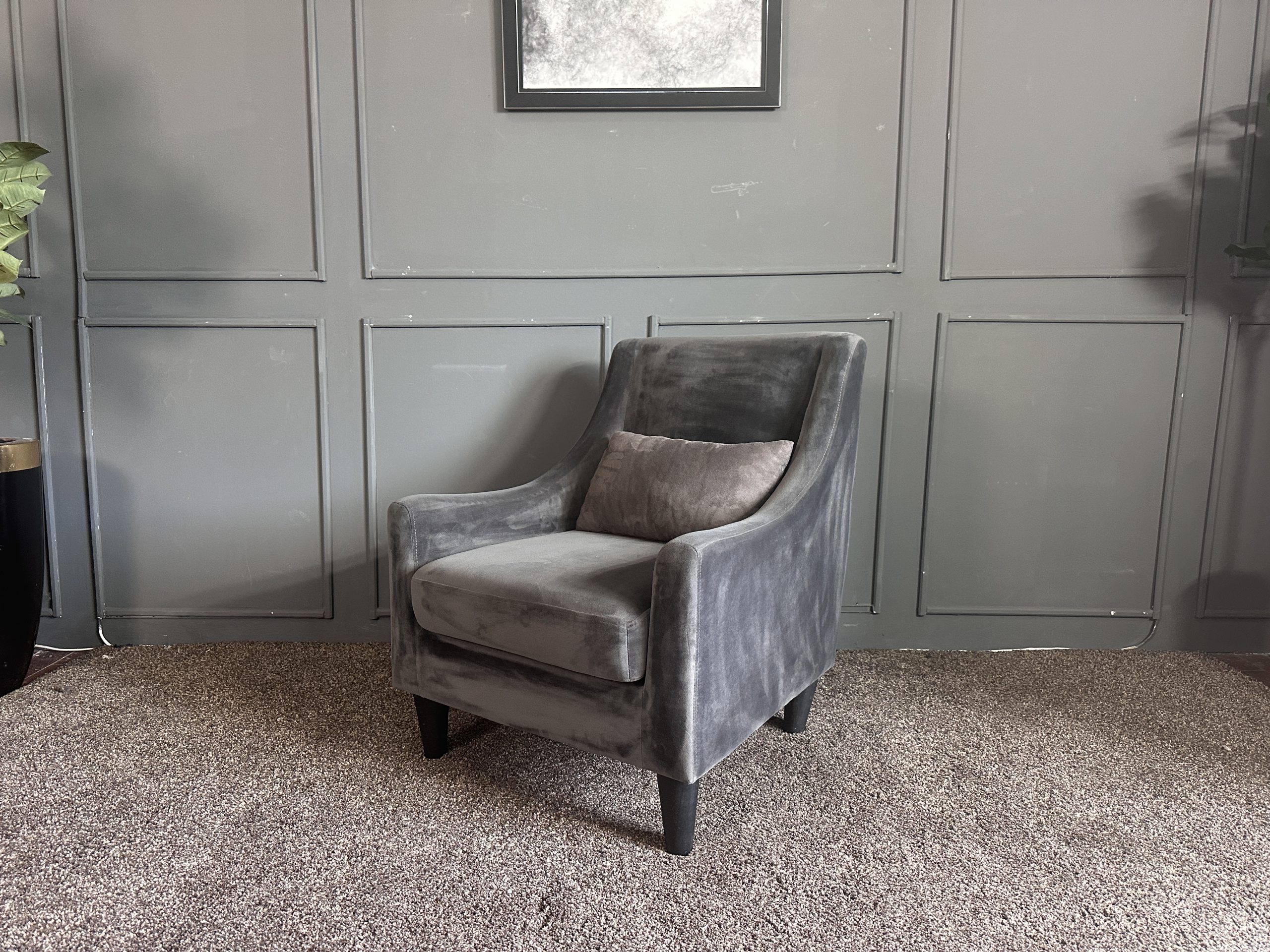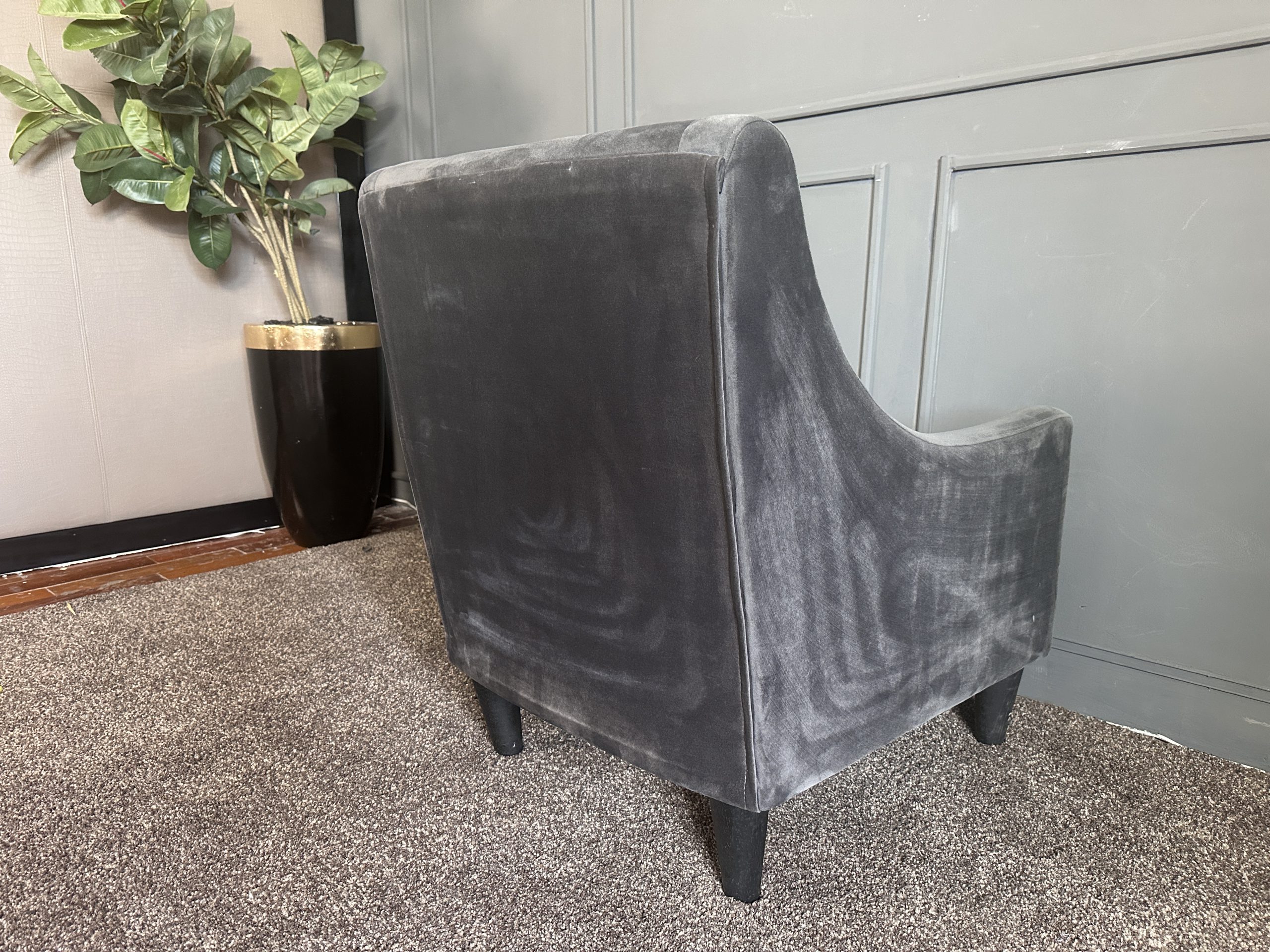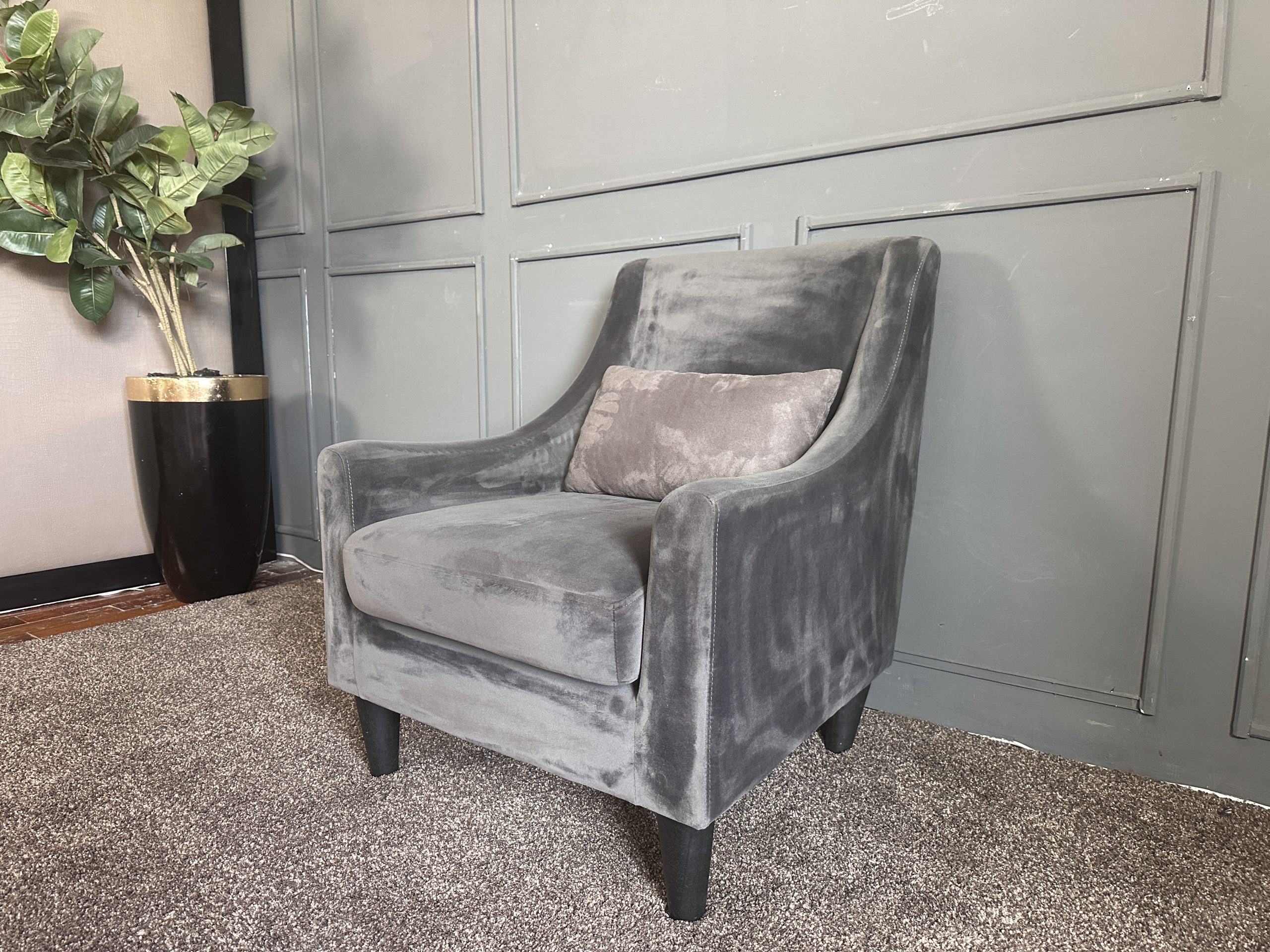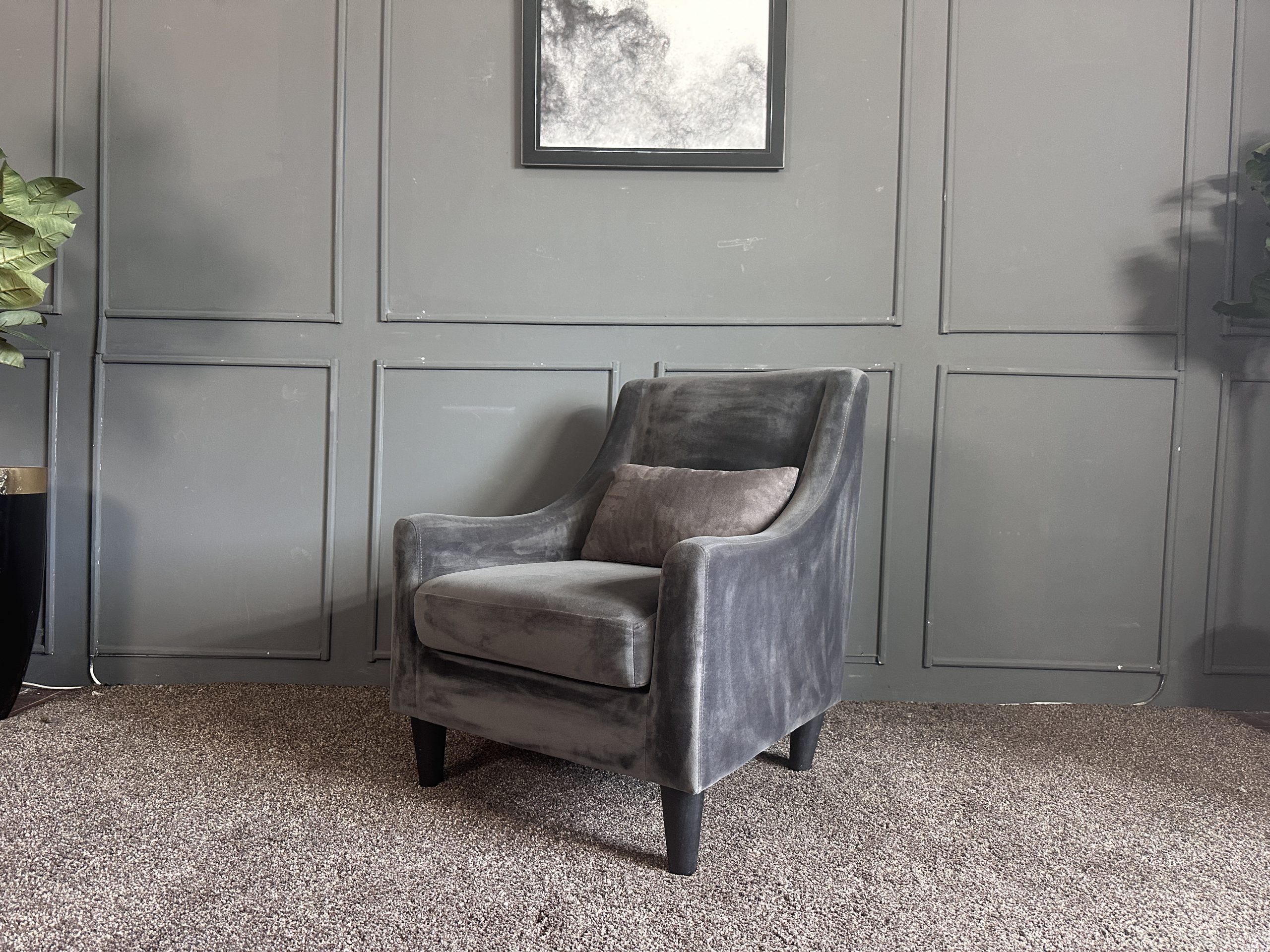 เก้าอี้อาร์มแชร์ เบาะผ้ากำมะหยี่สีเทา ขาไม้กลึงสีดำ พร้อมหมอนอิง