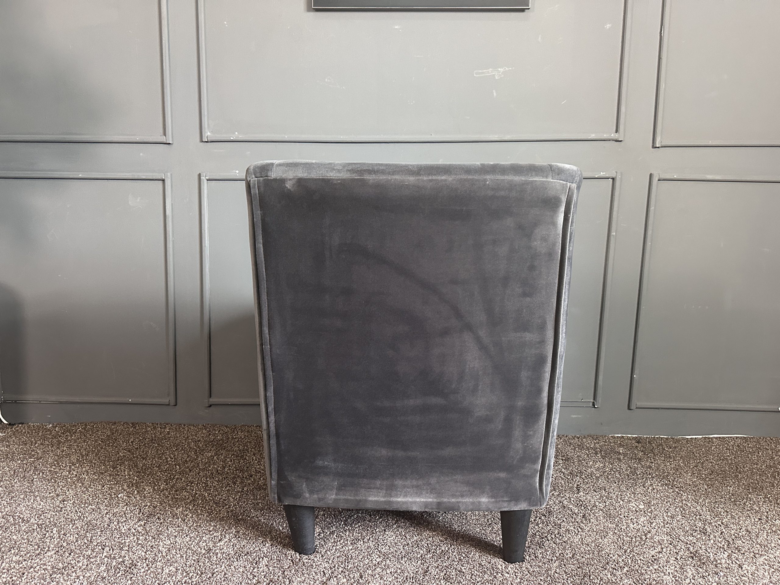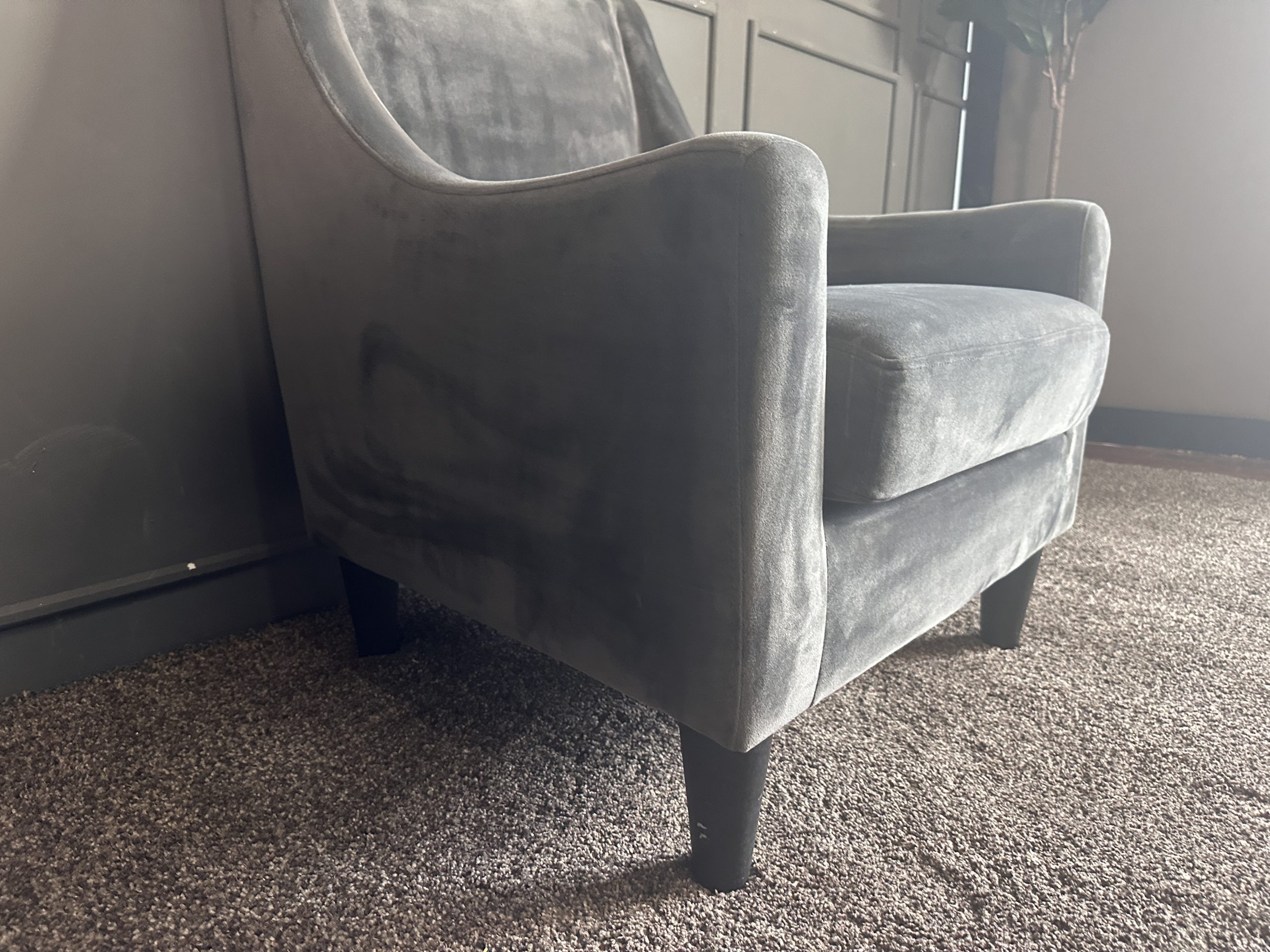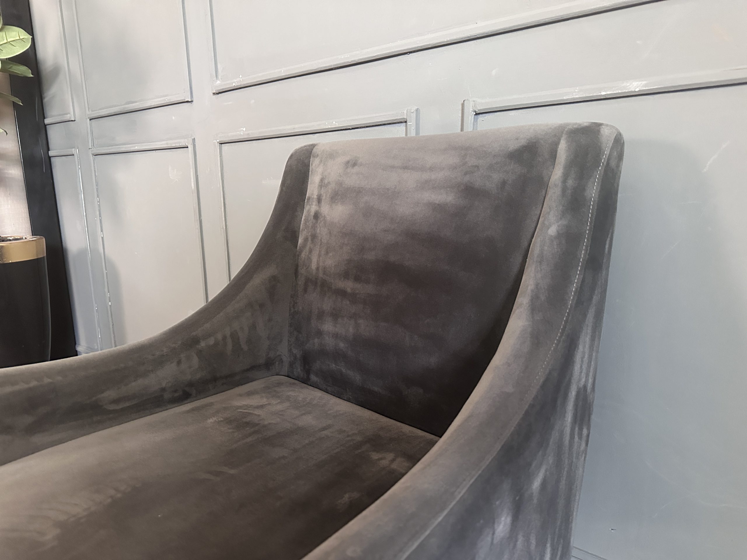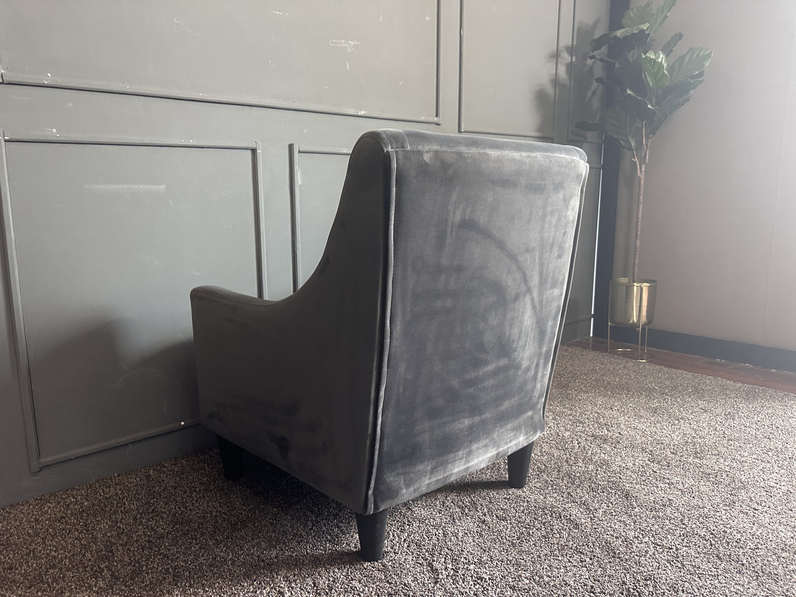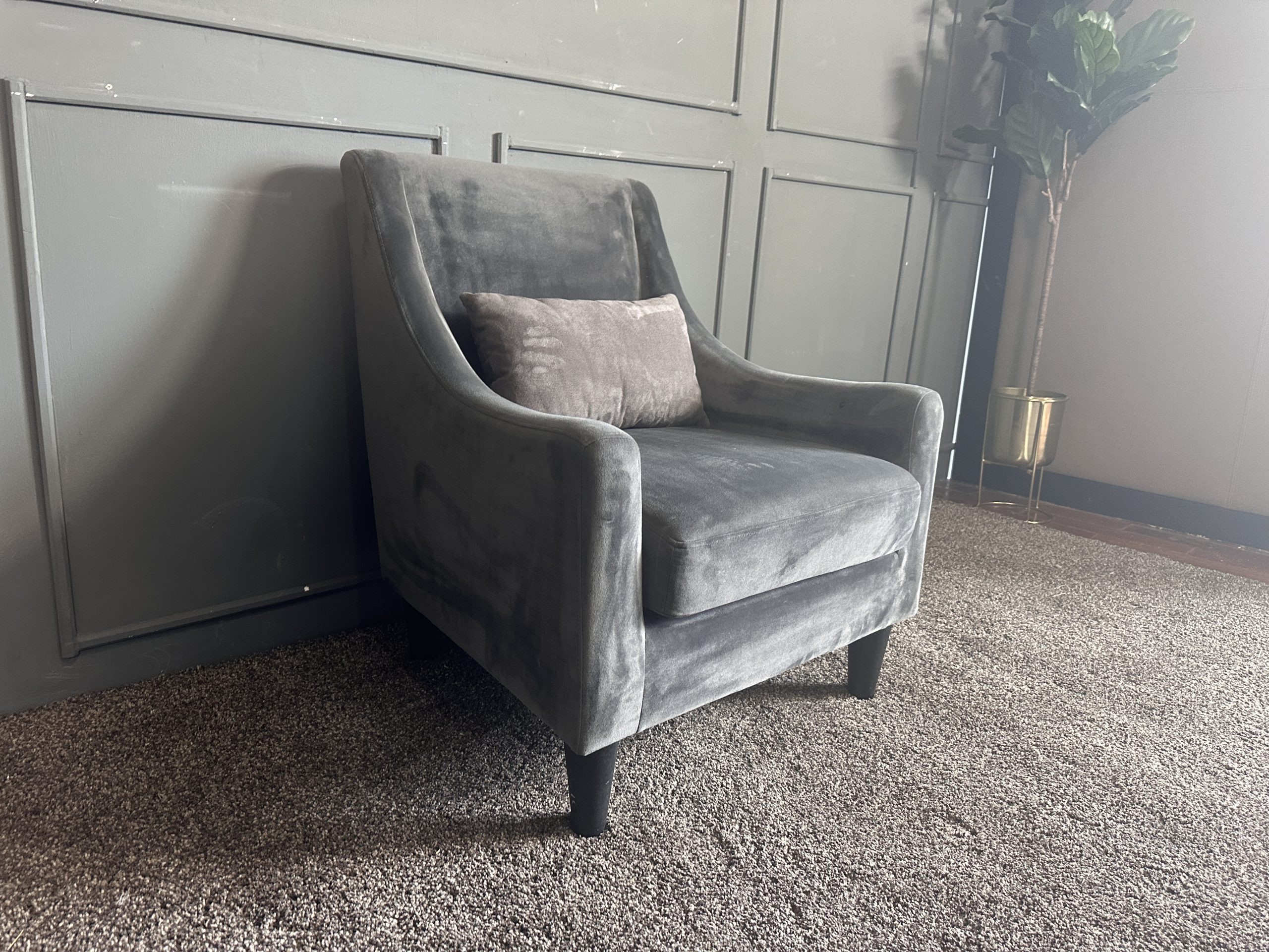 เก้าอี้อาร์มแชร์ เบาะผ้ากำมะหยี่สีเทา ขาไม้กลึงสีดำ พร้อมหมอนอิง