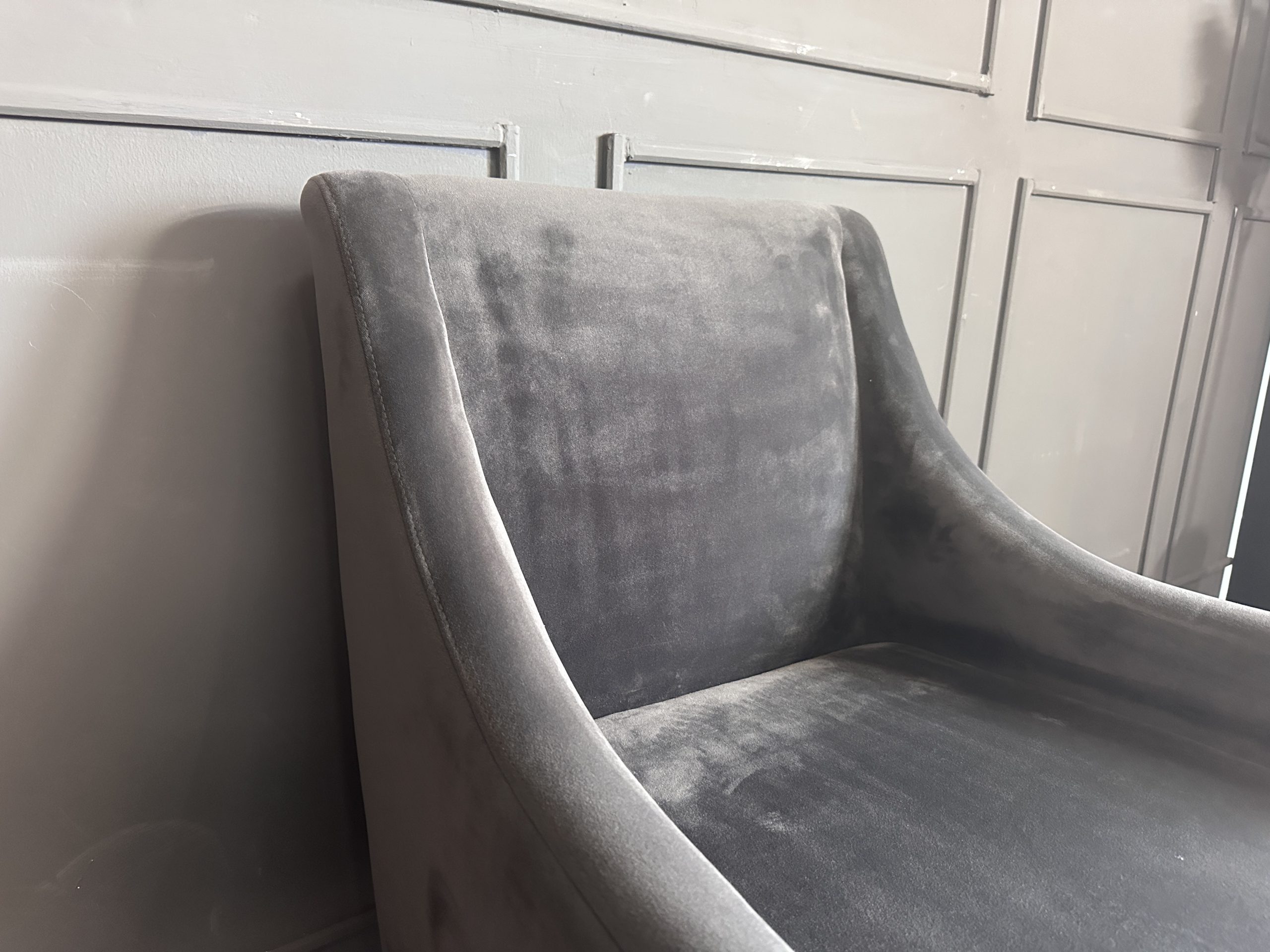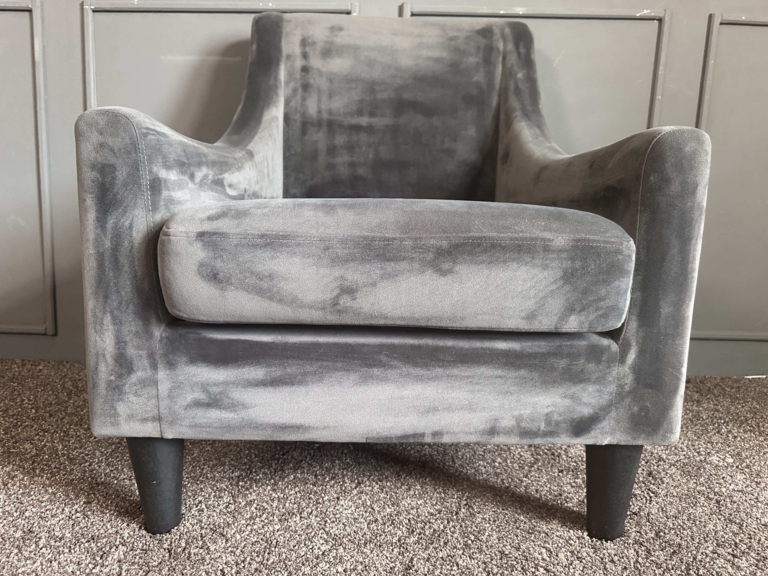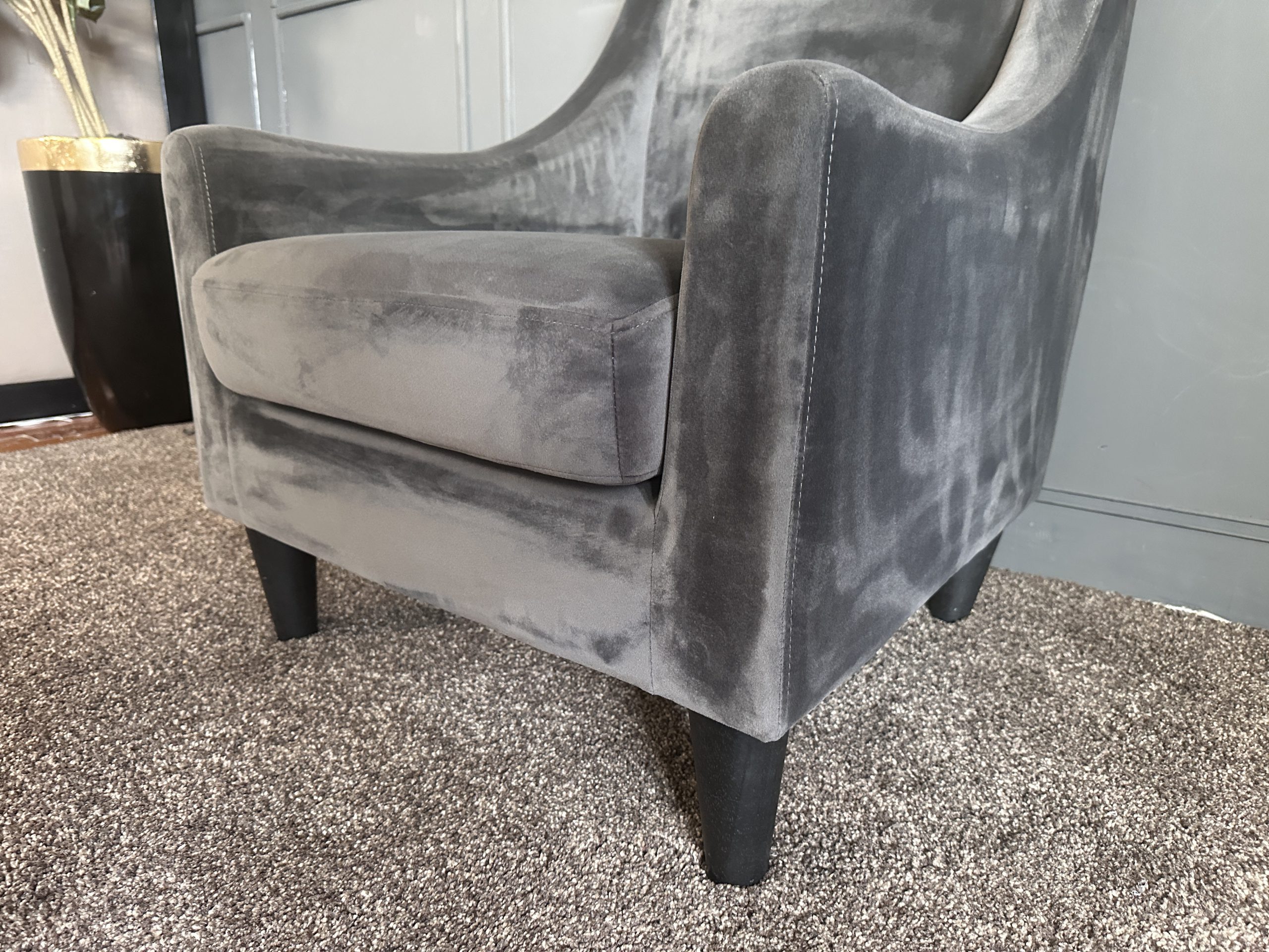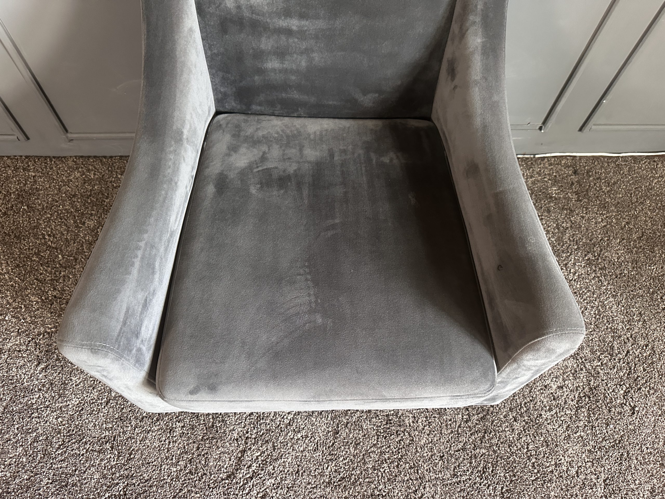 เก้าอี้อาร์มแชร์ เบาะผ้ากำมะหยี่สีเทา ขาไม้กลึงสีดำ พร้อมหมอนอิง
