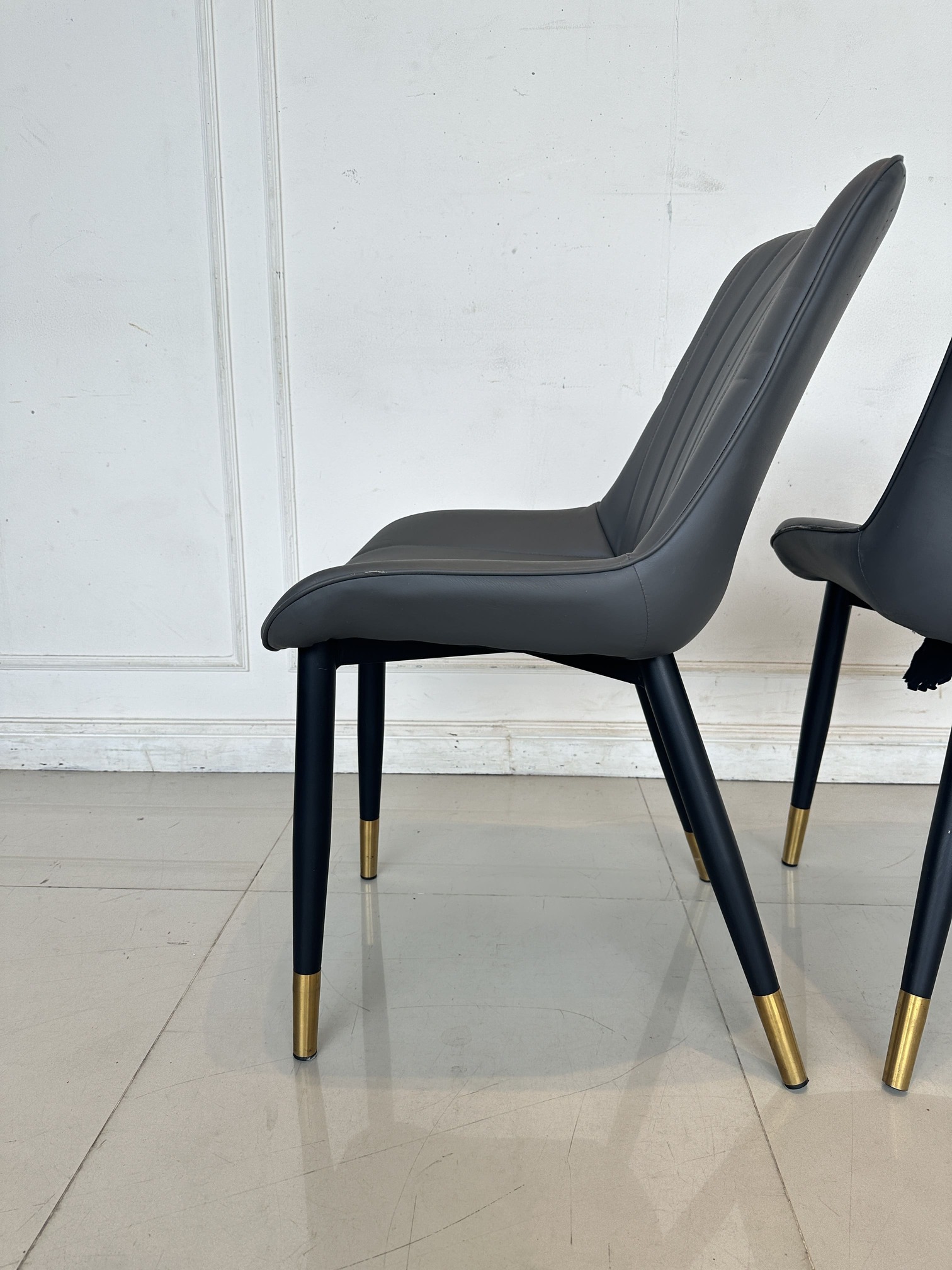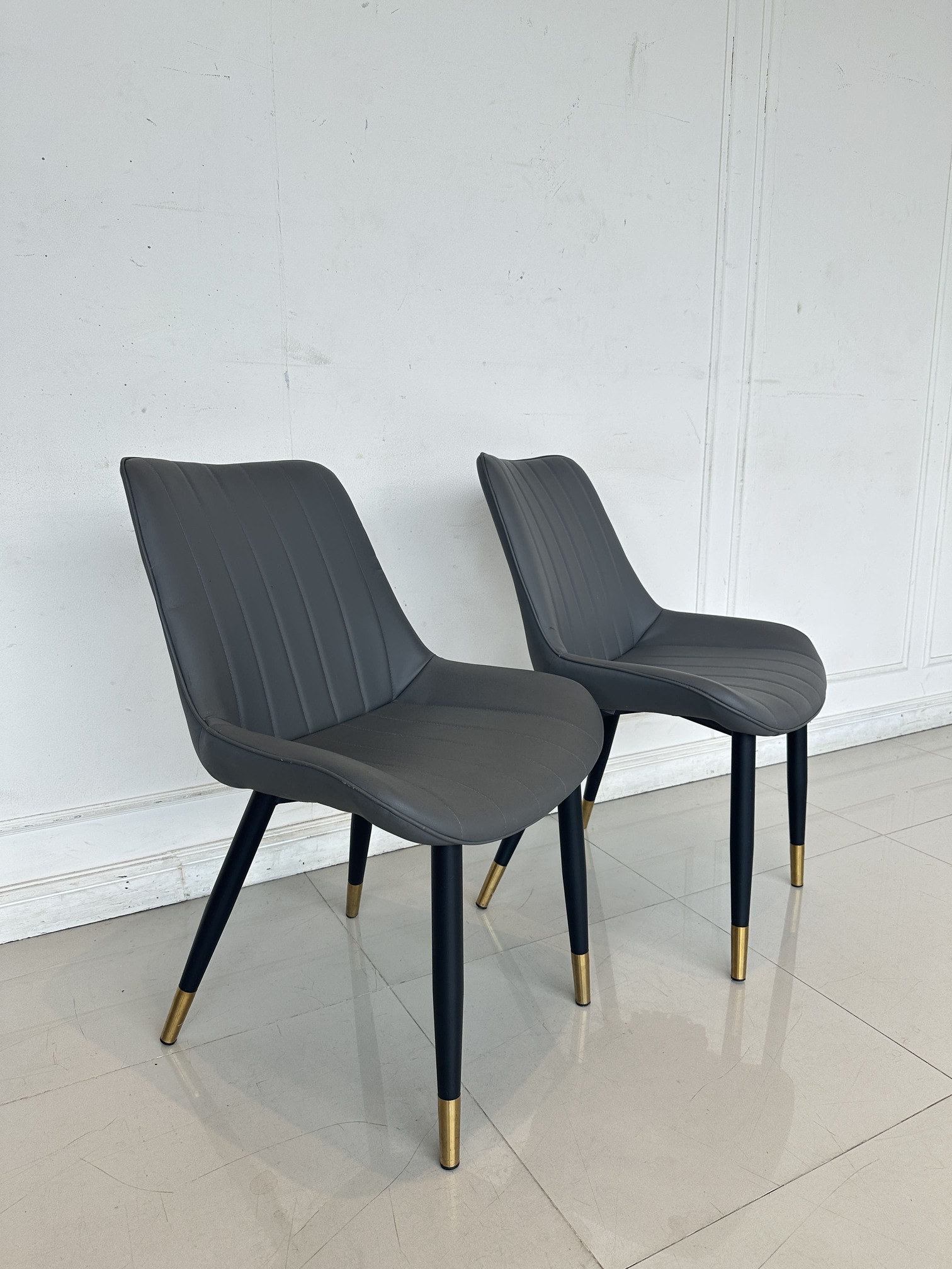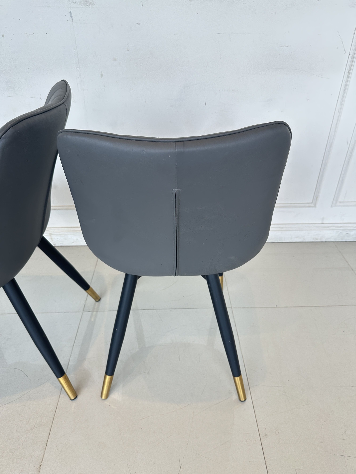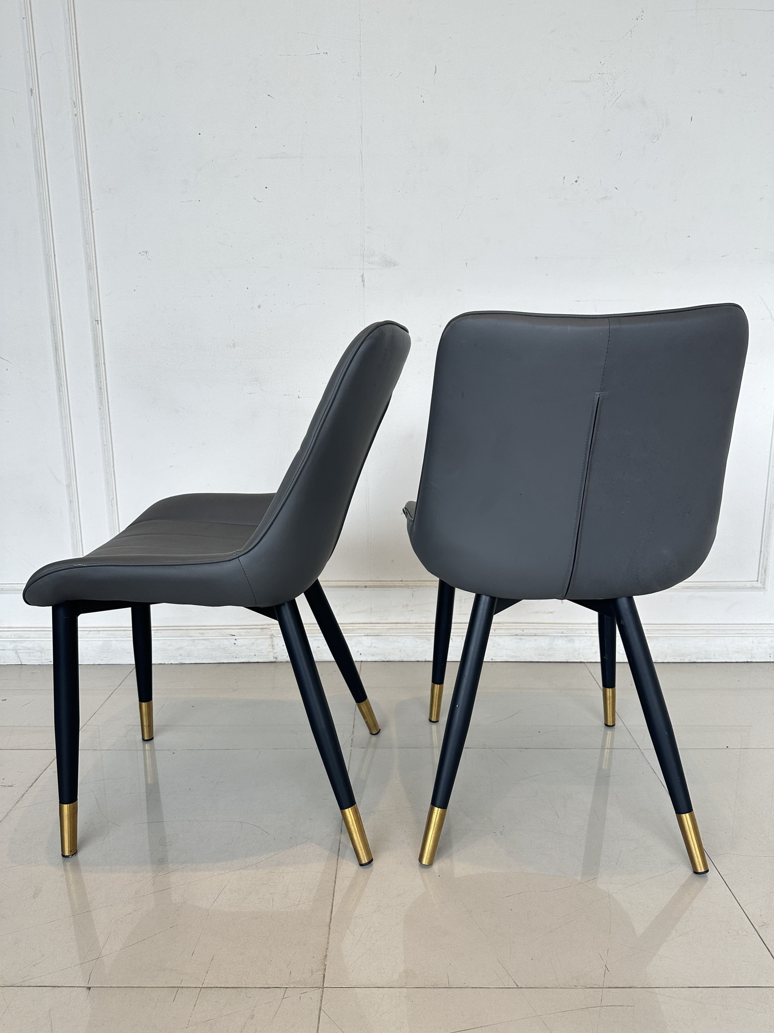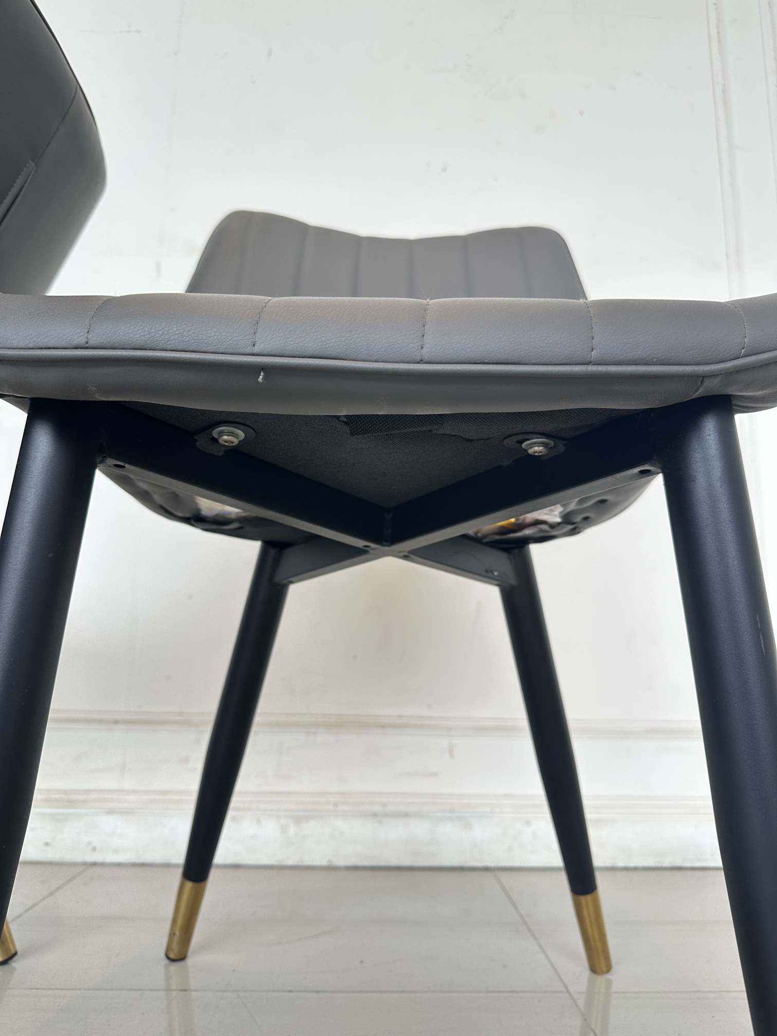 เก้าอี้ เบาะหุ้มหนัง PU สีเทาเข้ม ขาเหล็กสีดำ ตกแต่งปลายขาสแตนเลสสีทอง