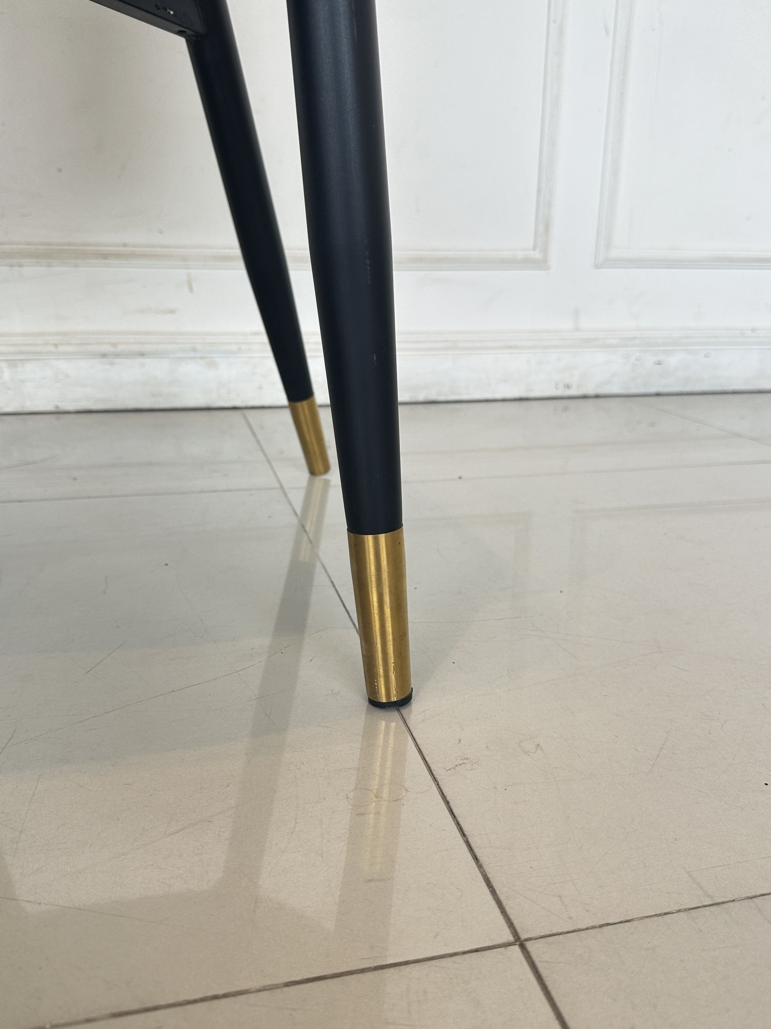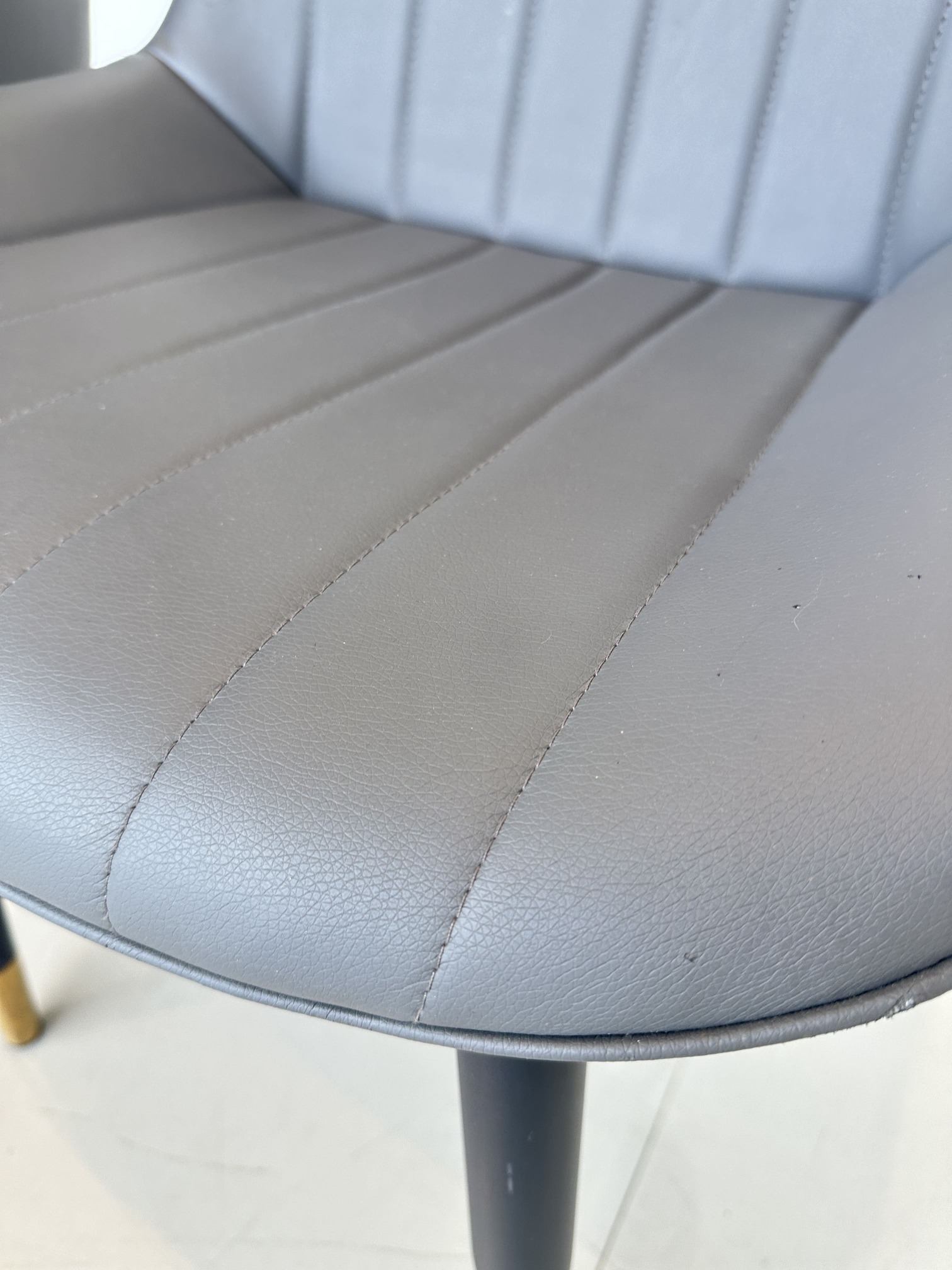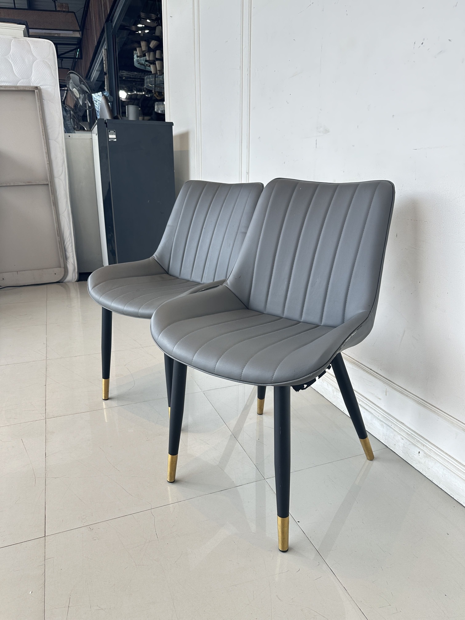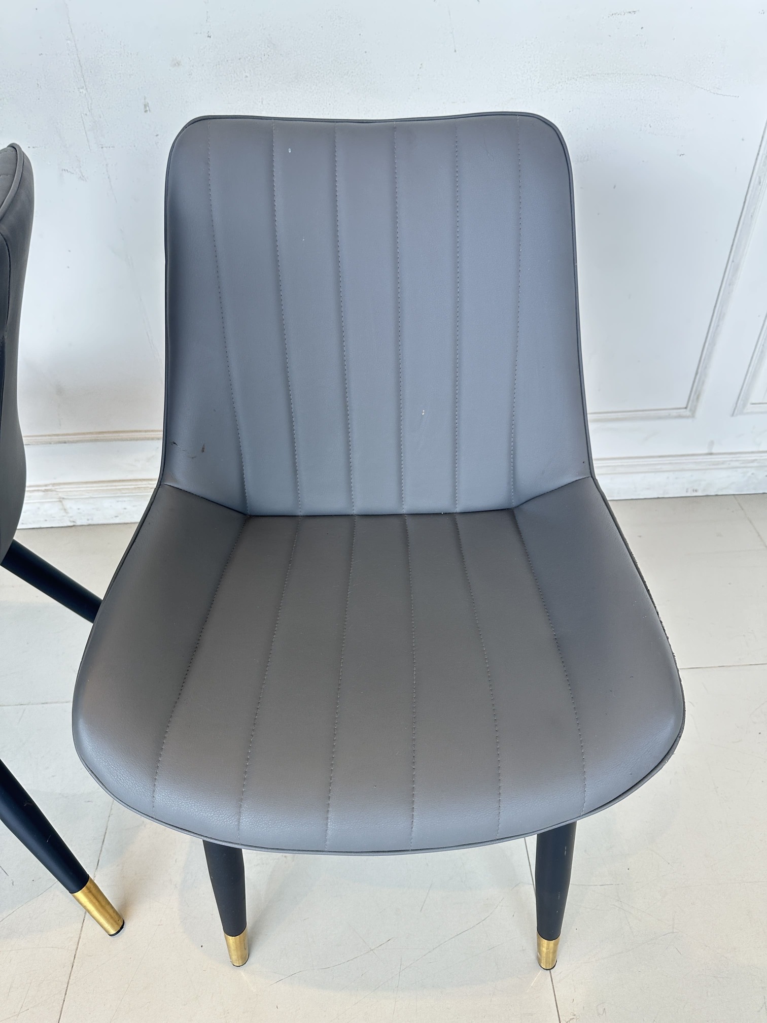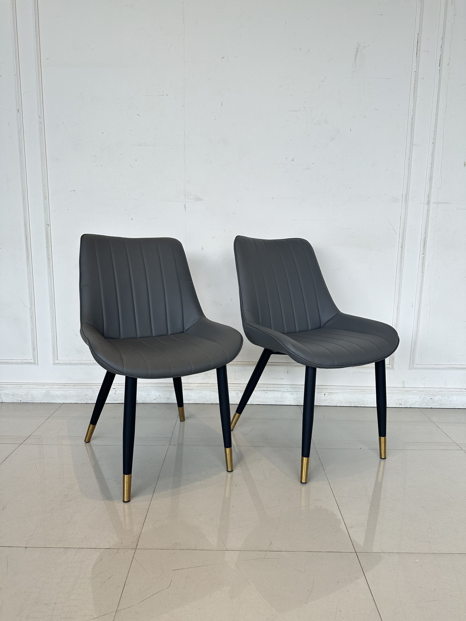 เก้าอี้ เบาะหุ้มหนัง PU สีเทาเข้ม ขาเหล็กสีดำ ตกแต่งปลายขาสแตนเลสสีทอง