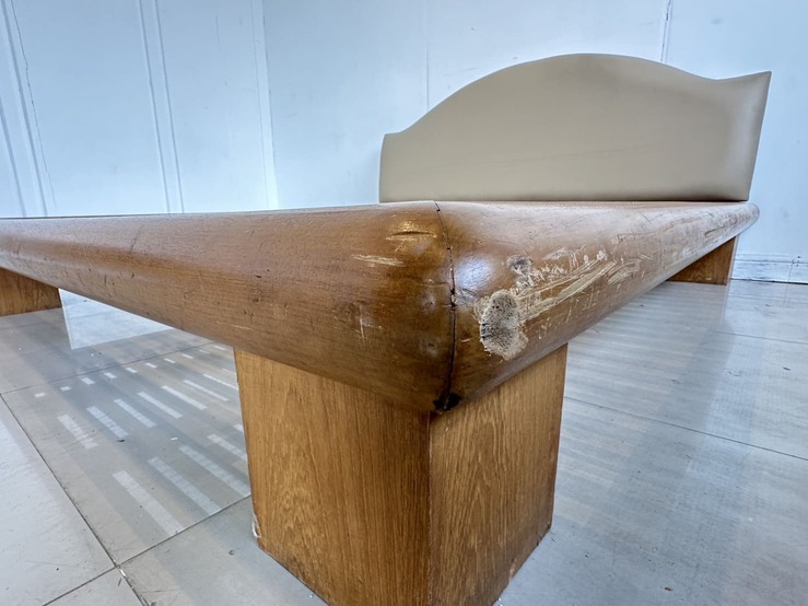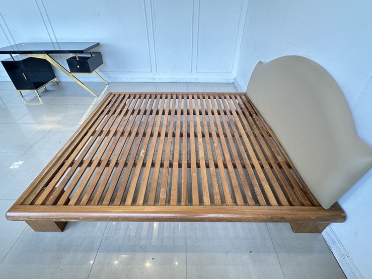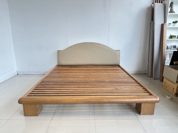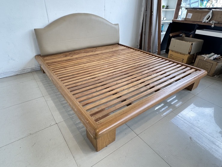 เตียงนอน ฐานสำเร็จรูปไม้จริงตีระแนง 6 ฟุต หัวเตียงติดผนัง หนัง PU สีน้ำตาล โครงไม้ MDF