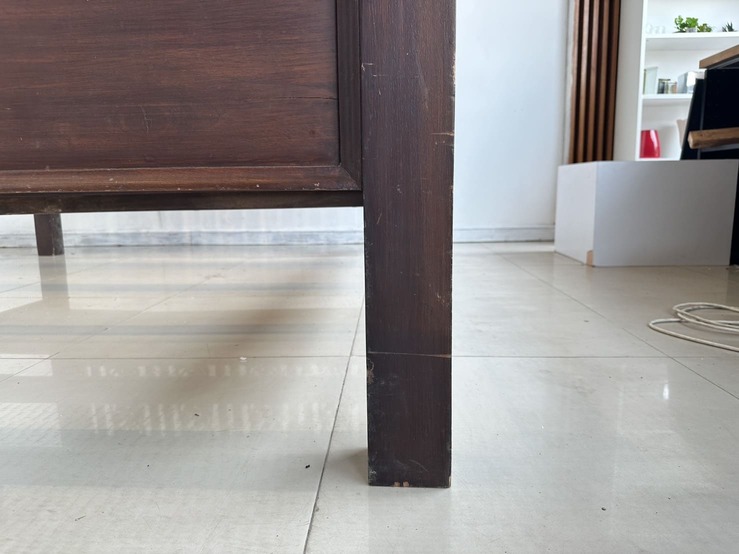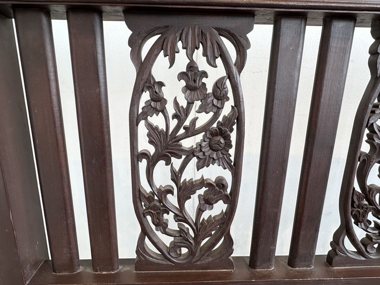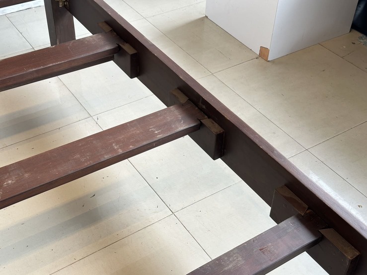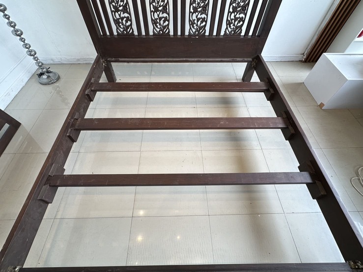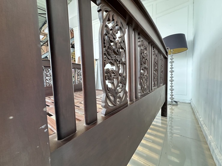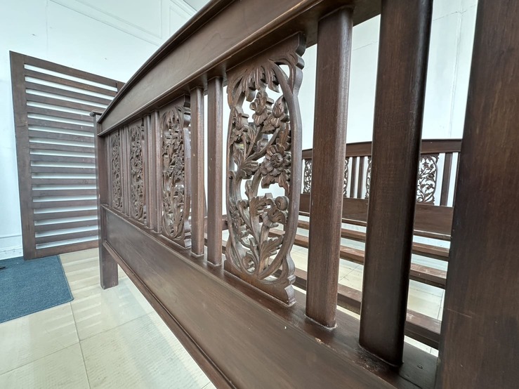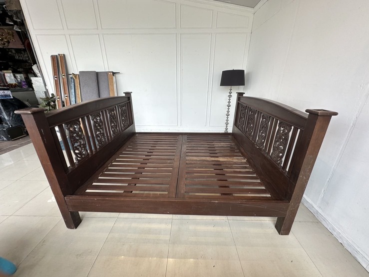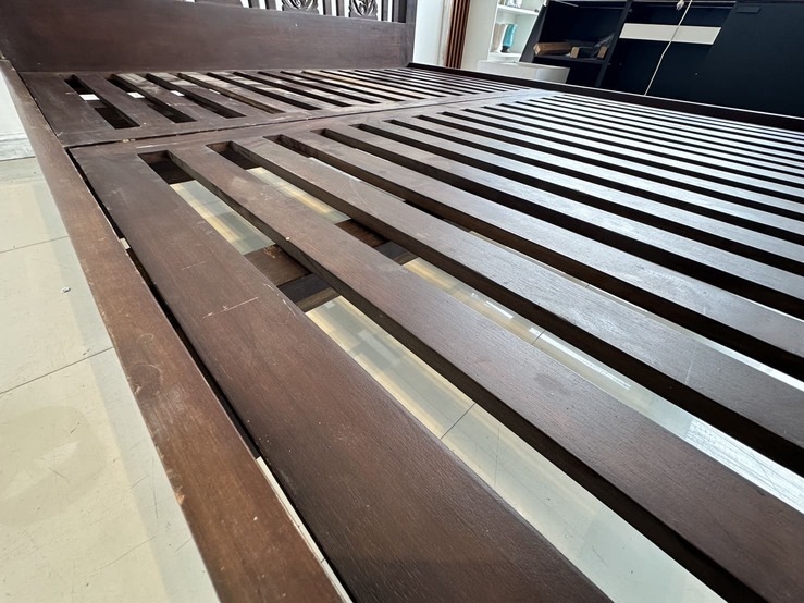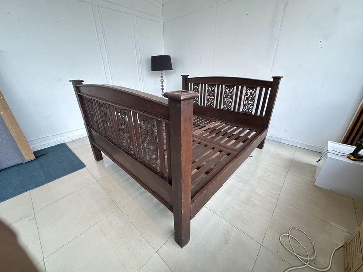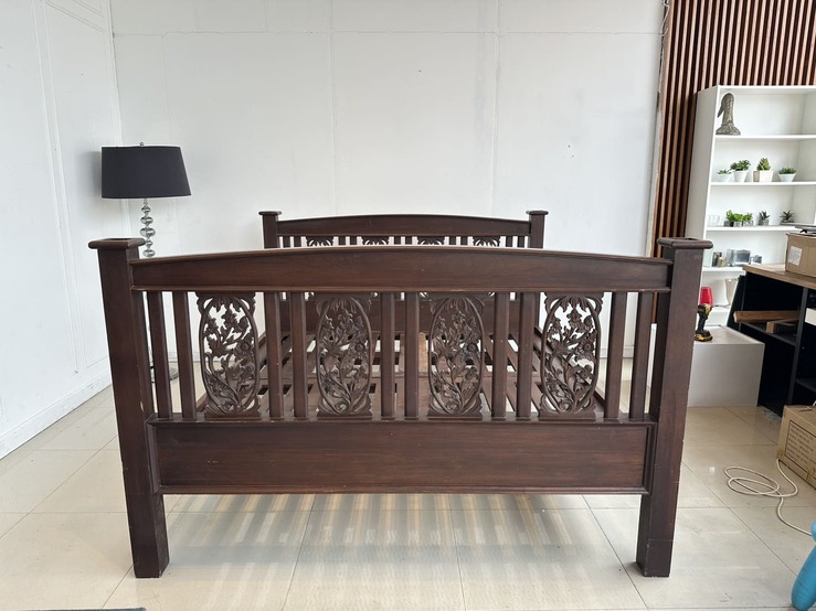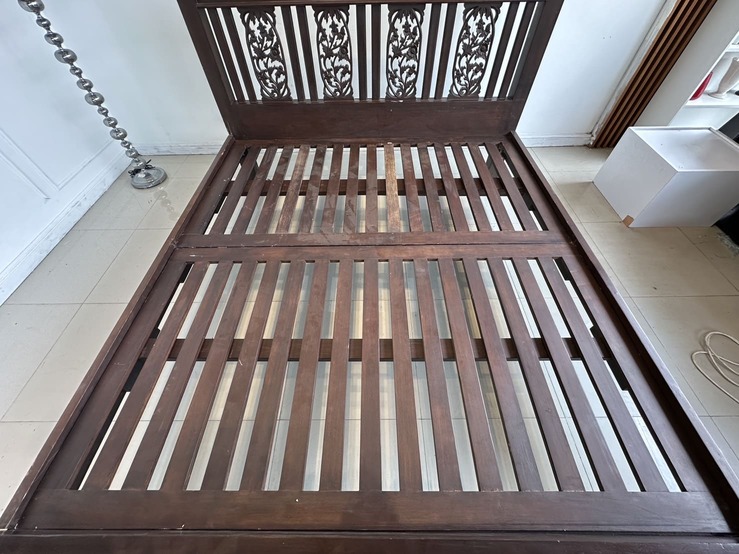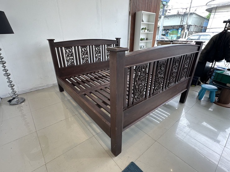 เตียงนอน สไตล์วินเทจไม้สัก 6 ฟุต ปลายเตียงและหัวเตียง ประดับแผ่นไม้ฉลุลายดอกไม้ คาน 3 ท่อน แผ่นรองไม้จริงตีระแนง 2 แผ่น