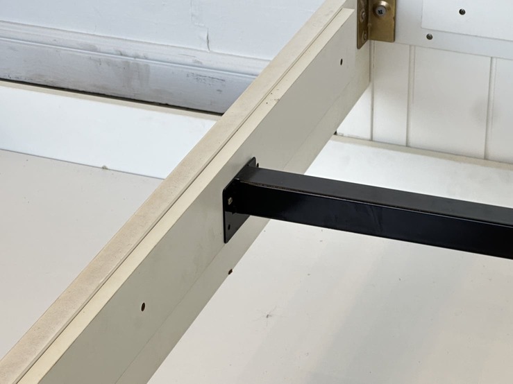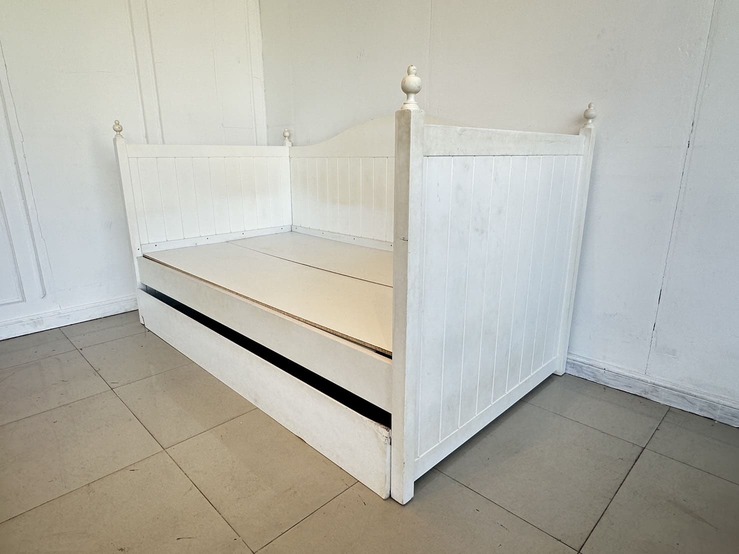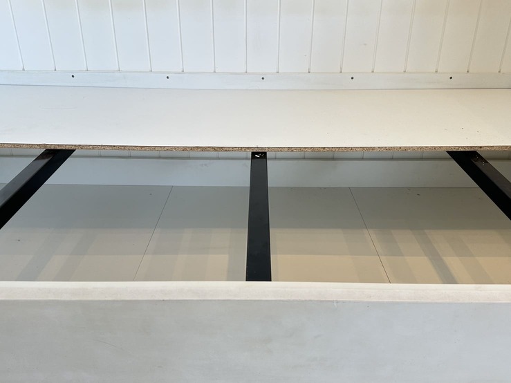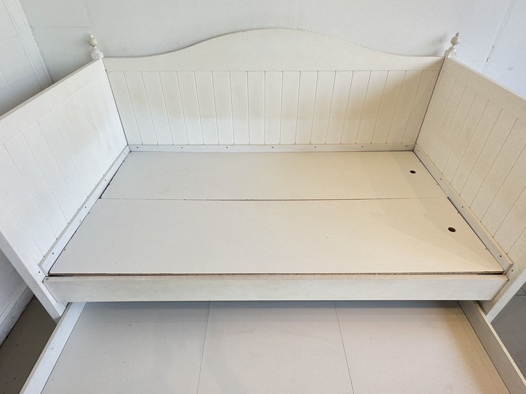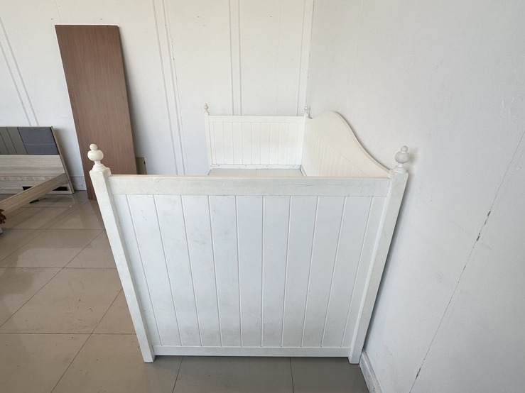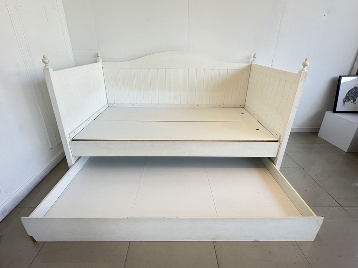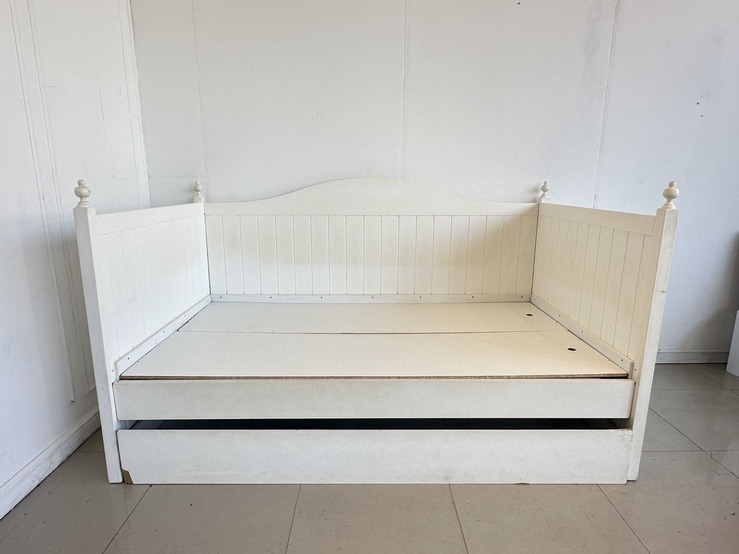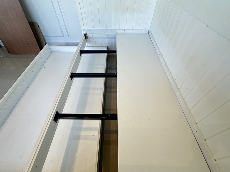 เตียงนอน 3.5 ฟุต 1 ลิ้นชัก ล้อเลื่อน คานเหล็ก 3 ท่อนแผ่นรองไม้อัด 2 แผ่น สีขาว