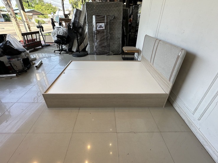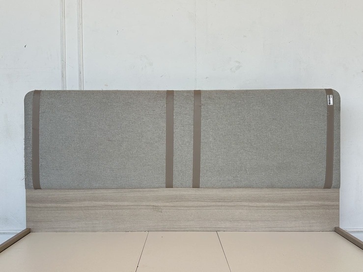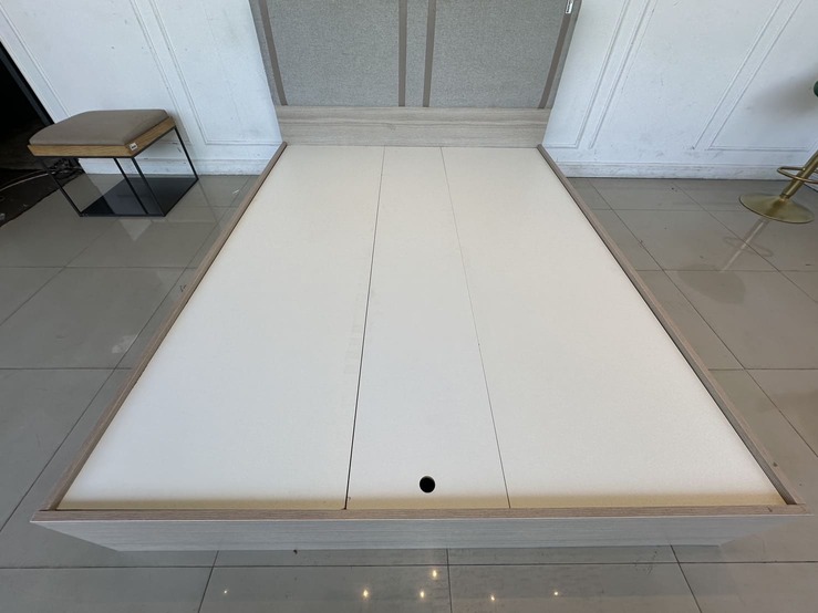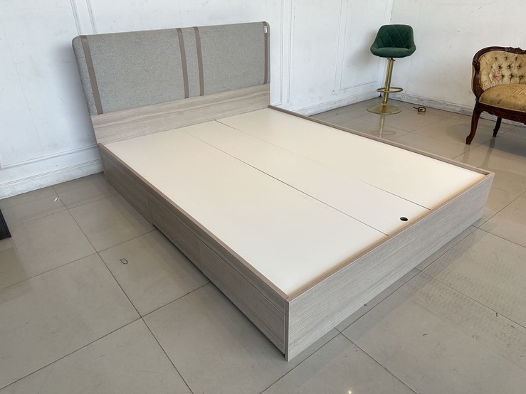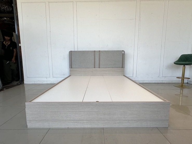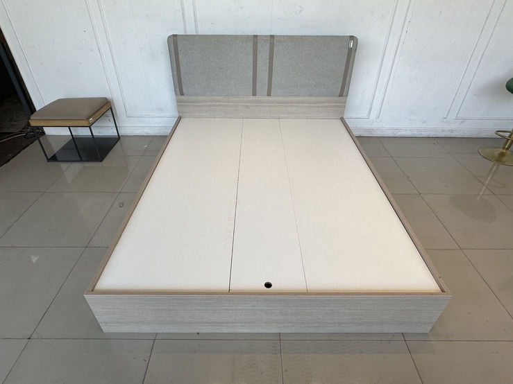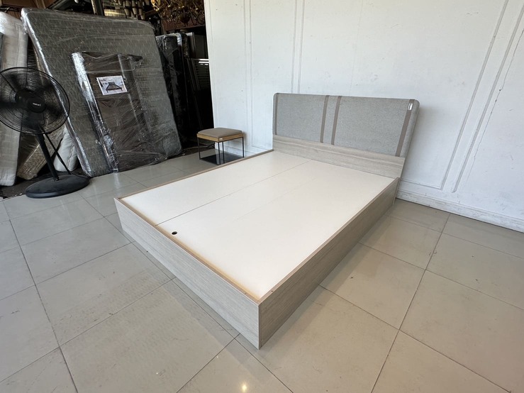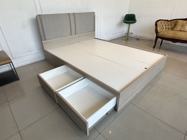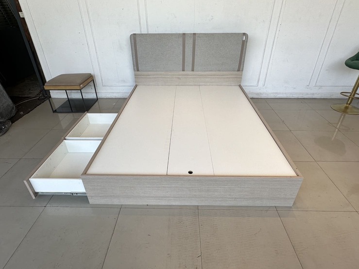 เตียงนอน 5 ฟุต หัวเตียงหุ้มผ้าสีเทาข้าดหนัง PU สีน้ำตาล ข้างเตียงมี 2 ลิ้นชัก โครงฐานและคานไม้ MDF สีบีชลายไม้คานสีขาว แผ่นรองไม้อัด 3 แผ่นสีขาว