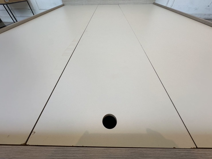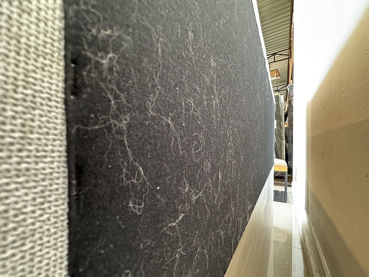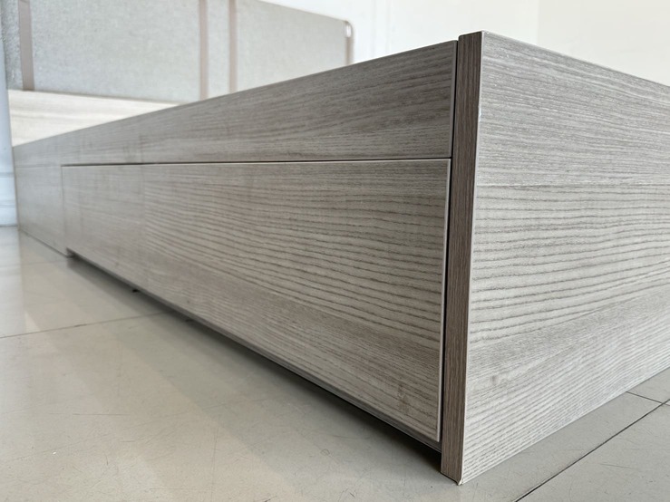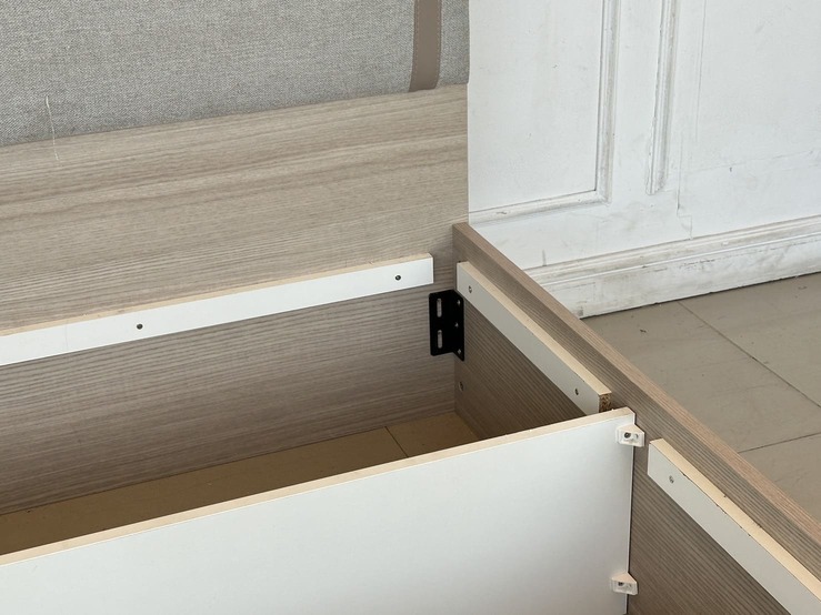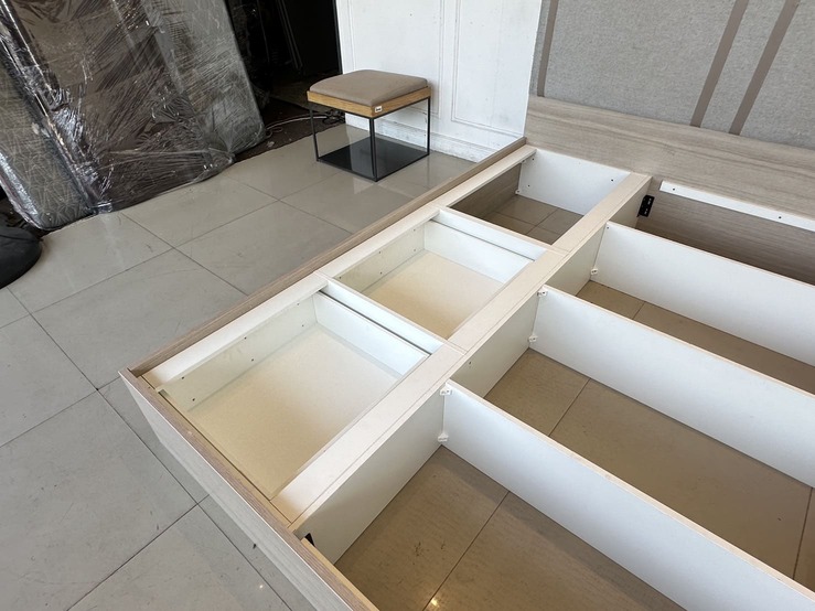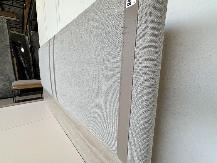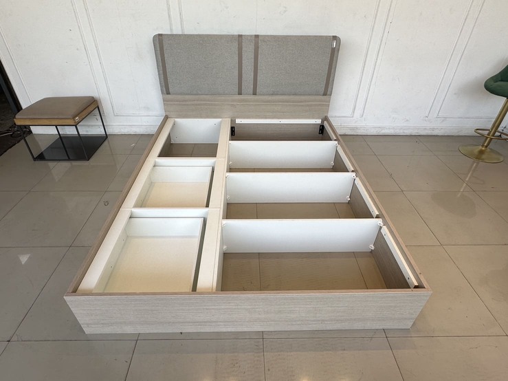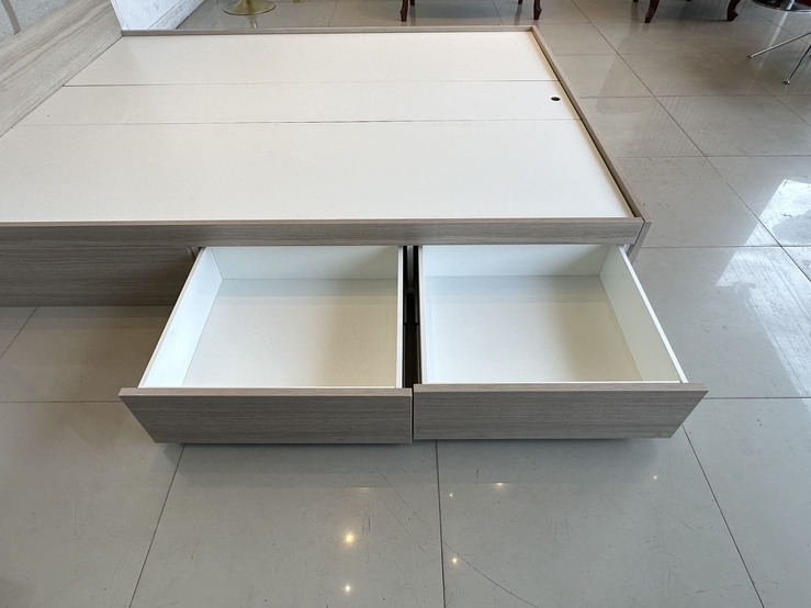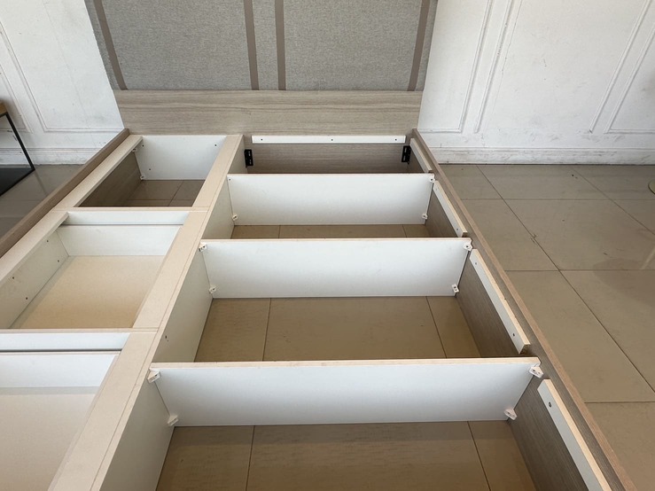 เตียงนอน 5 ฟุต หัวเตียงหุ้มผ้าสีเทาข้าดหนัง PU สีน้ำตาล ข้างเตียงมี 2 ลิ้นชัก โครงฐานและคานไม้ MDF สีบีชลายไม้คานสีขาว แผ่นรองไม้อัด 3 แผ่นสีขาว