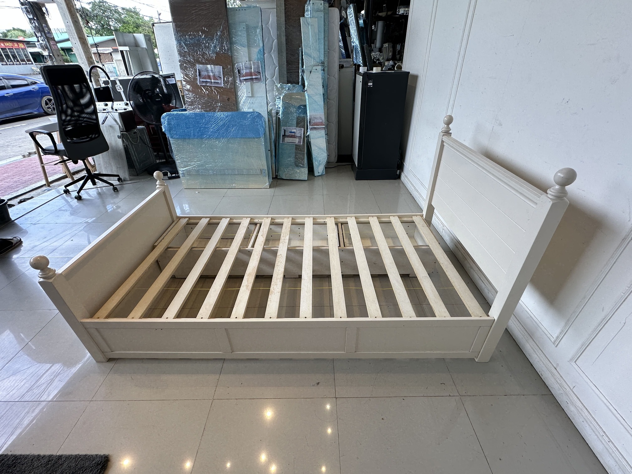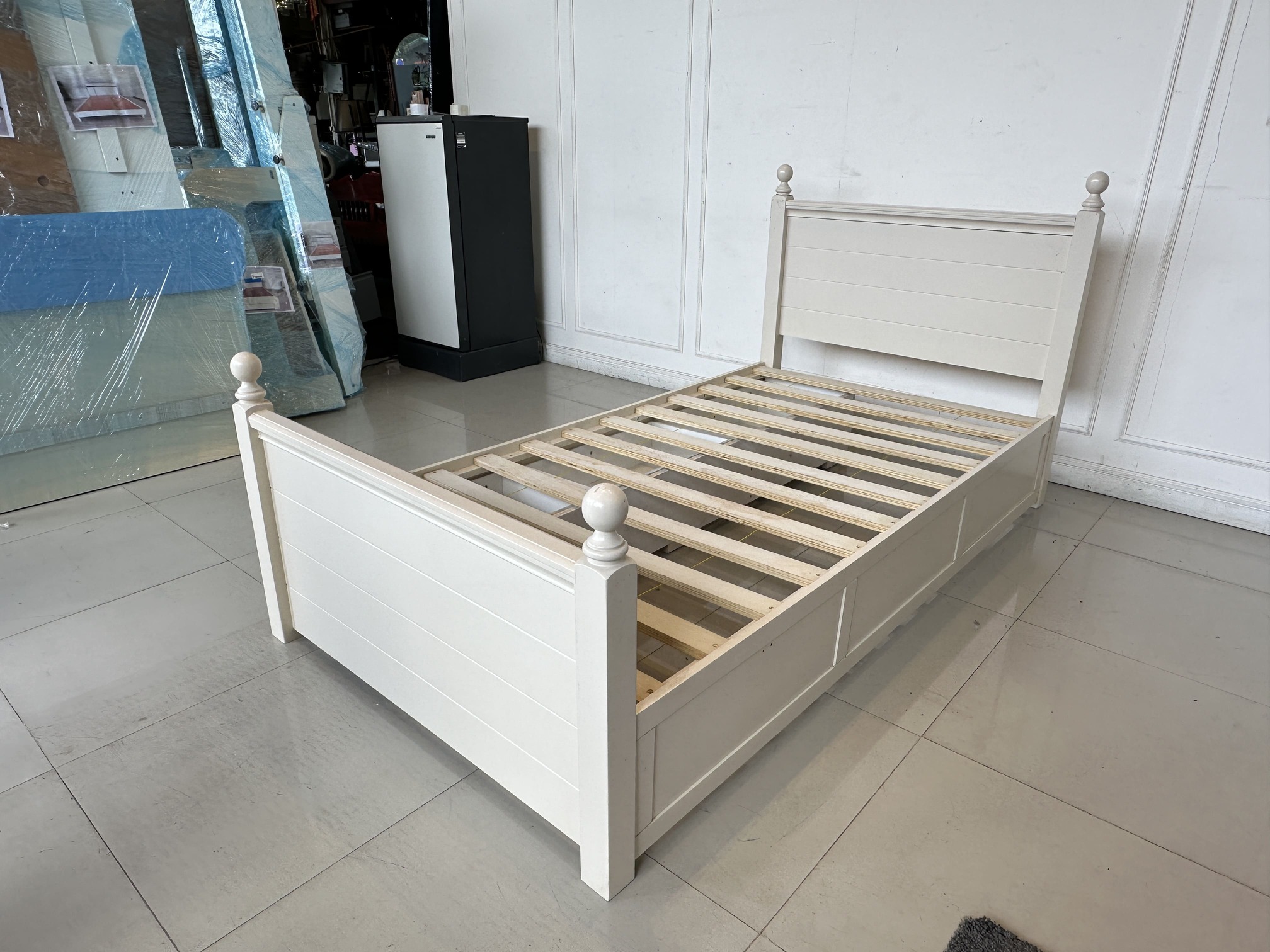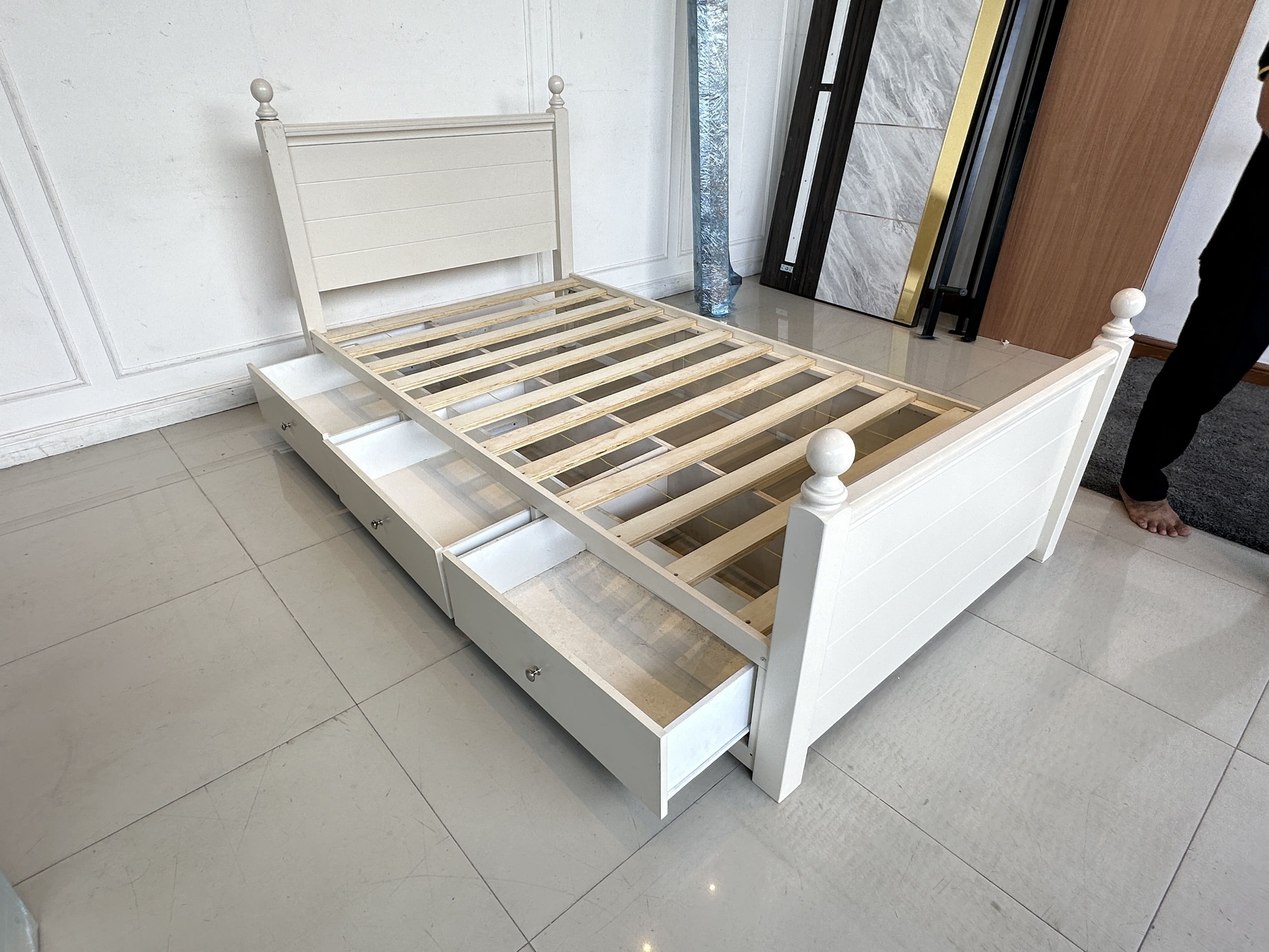 เตียงไม้จริง สไตล์วินเทจ 3.5 ฟุต ด้านข้างมี 3 ลิ้นชักสีครีม