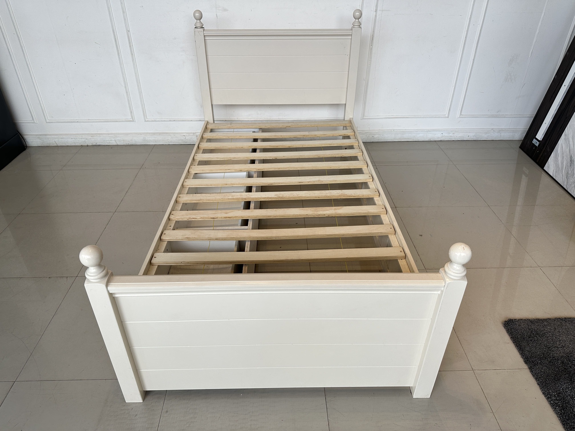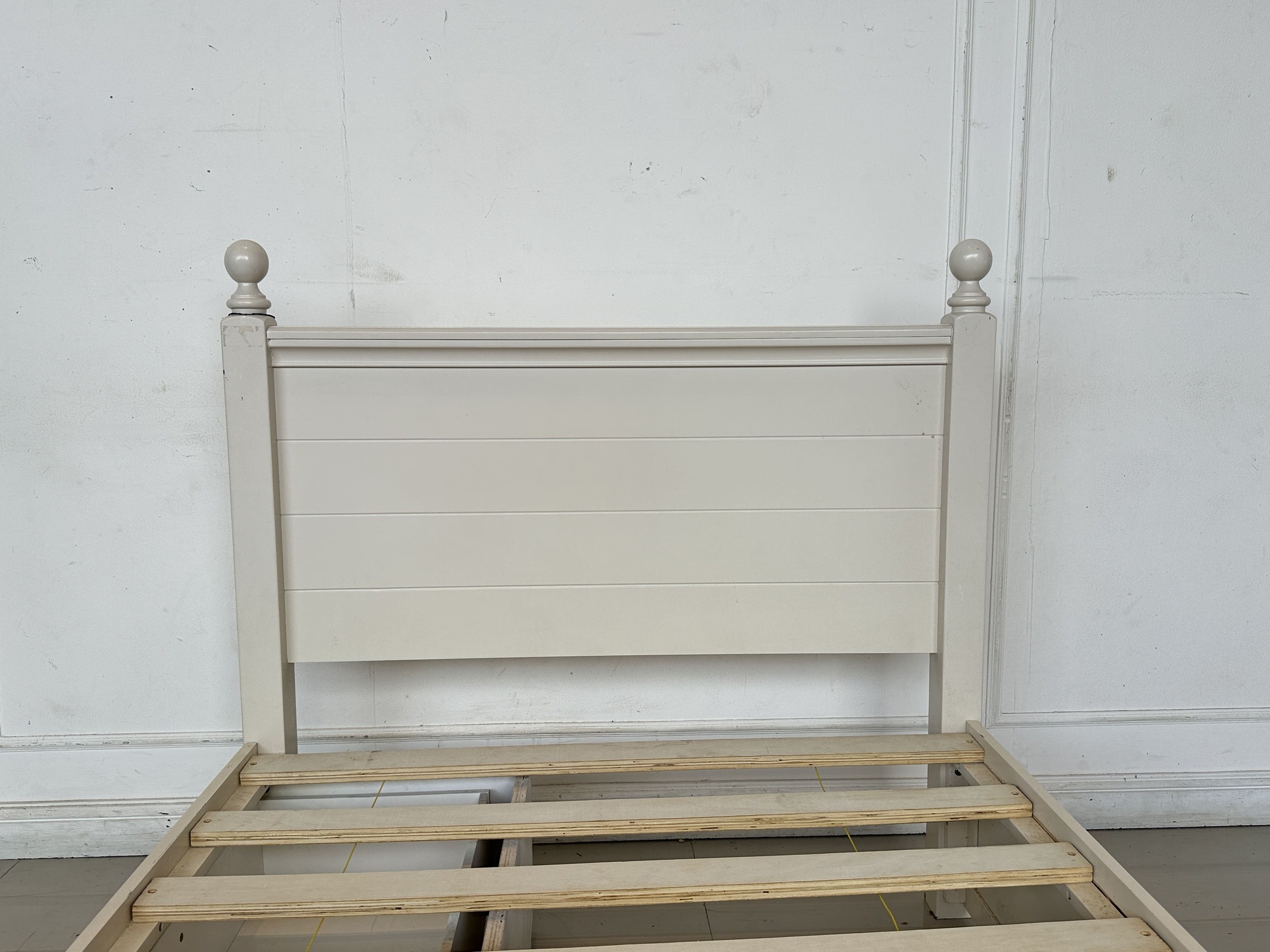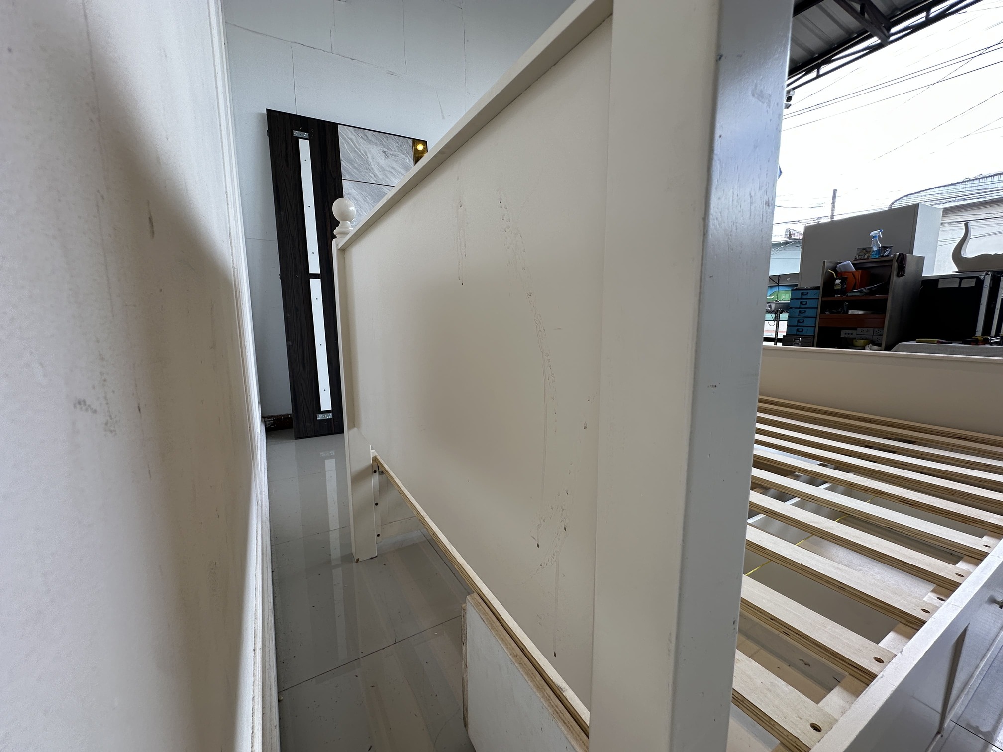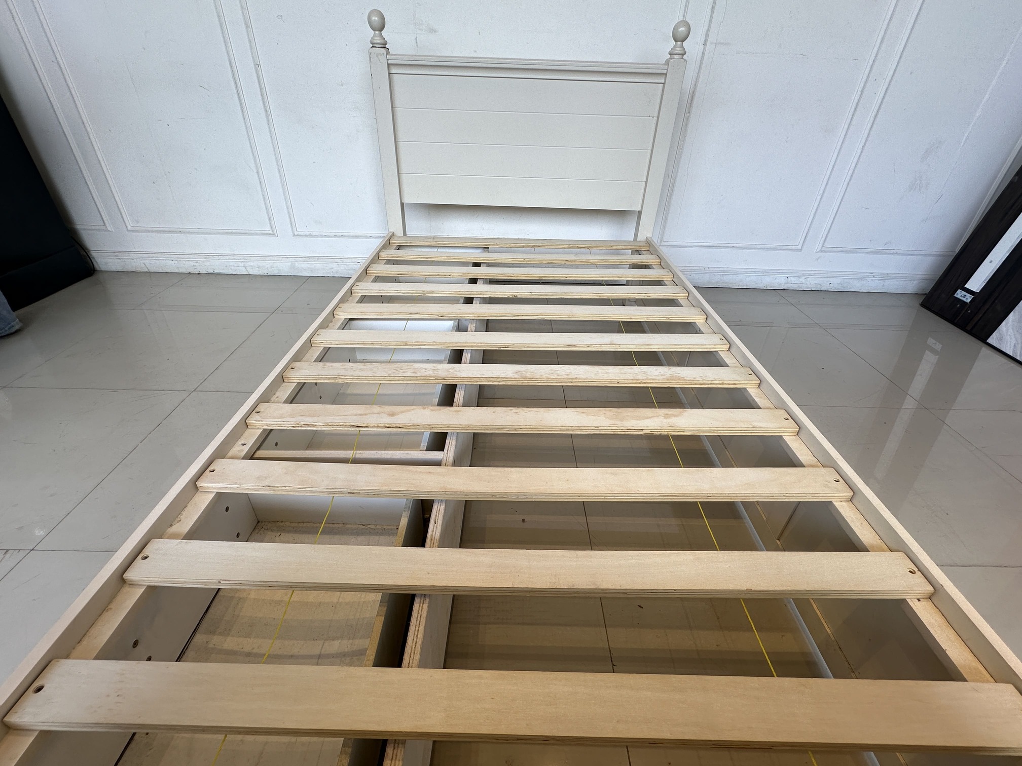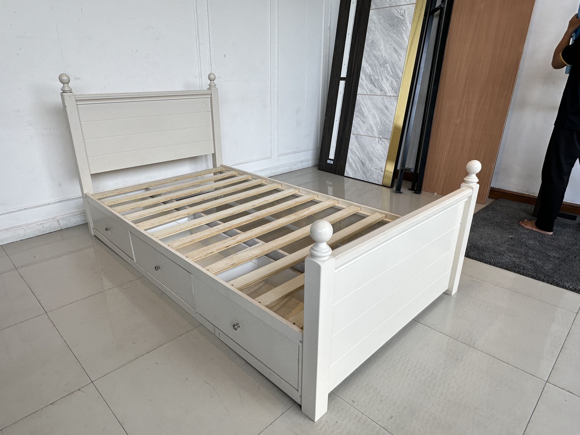 เตียงไม้จริง สไตล์วินเทจ 3.5 ฟุต ด้านข้างมี 3 ลิ้นชักสีครีม แผ่นรองไม้อัดอย่างหนาตีระแนงร้อยเชือก