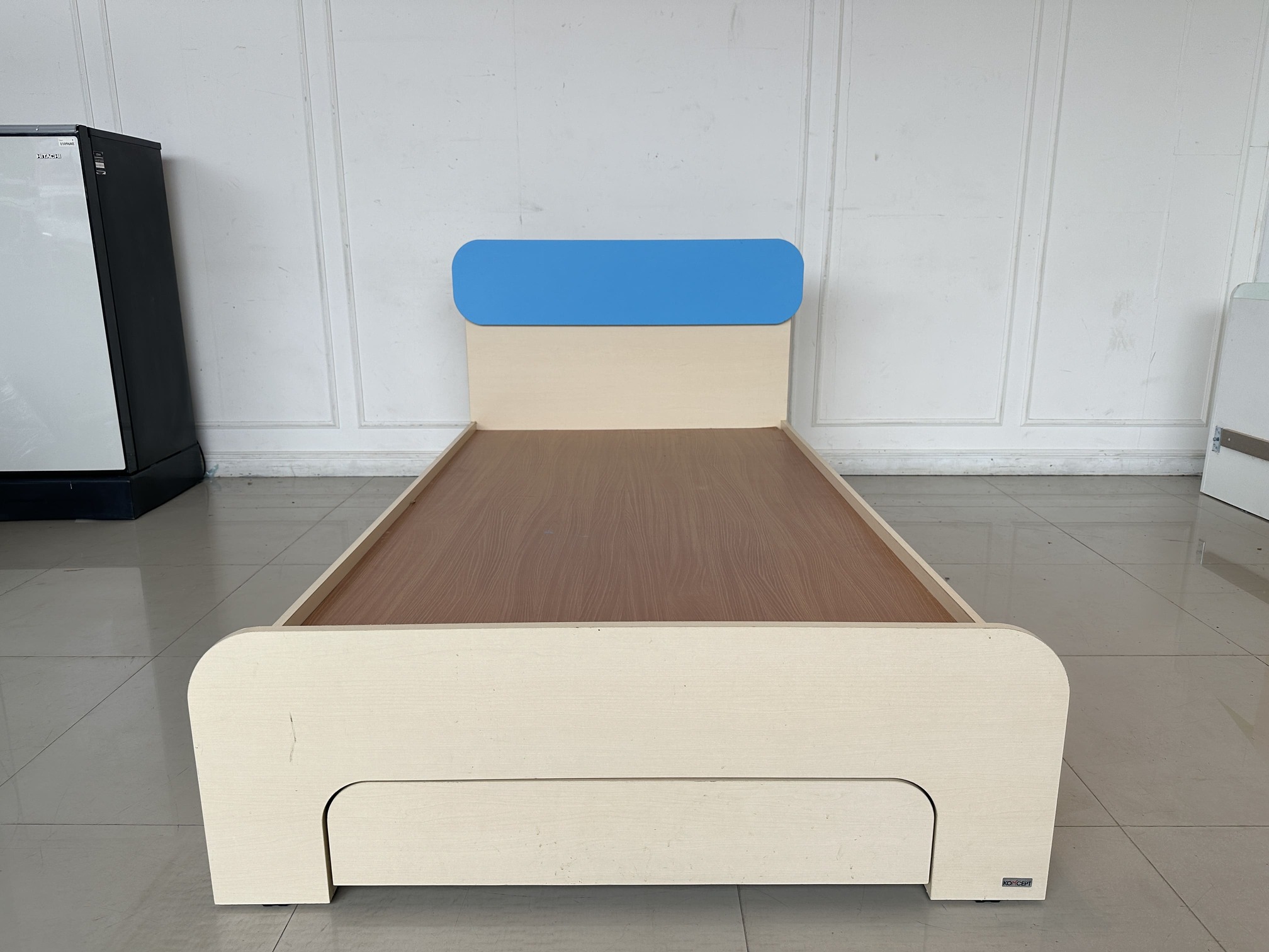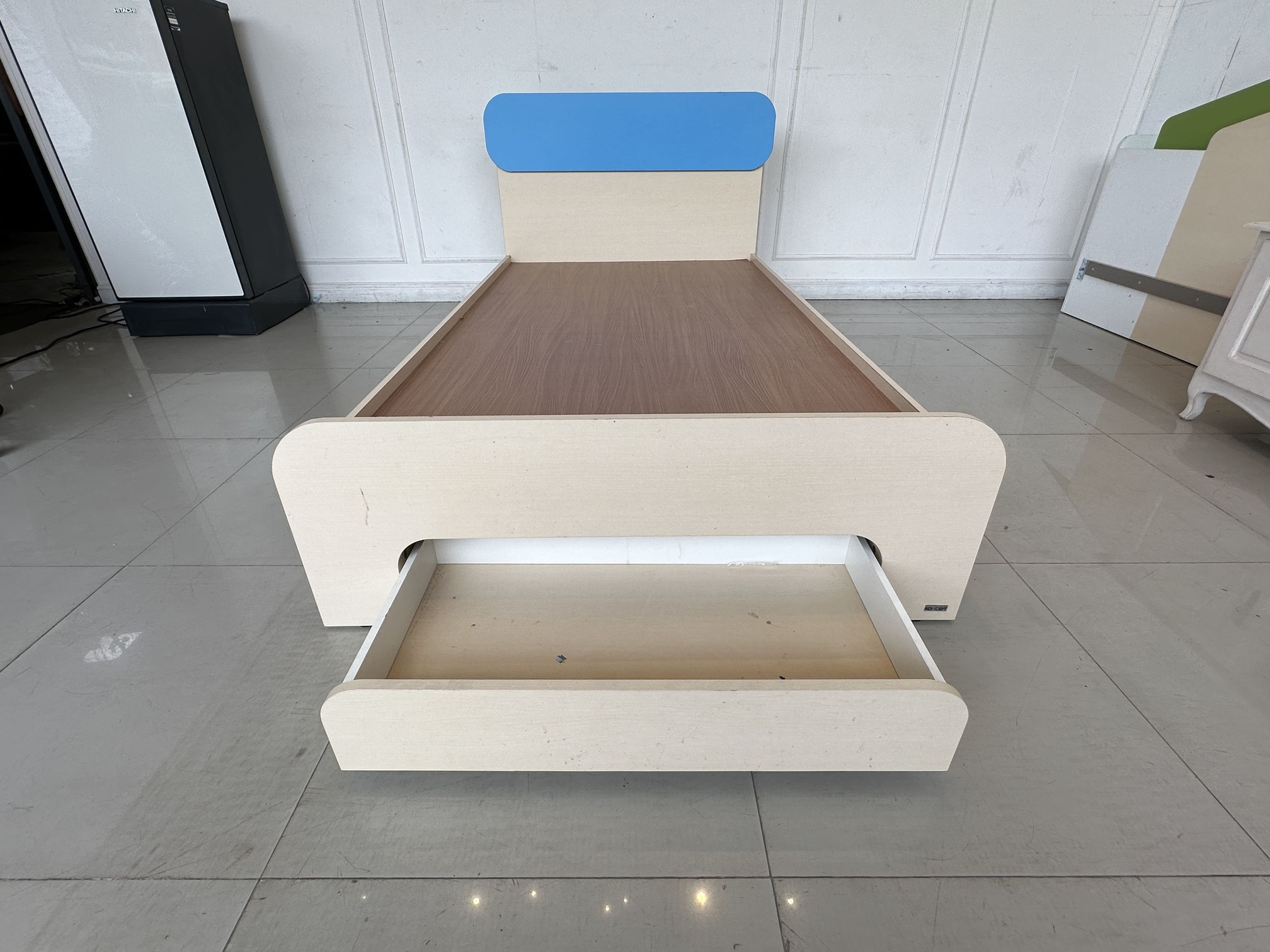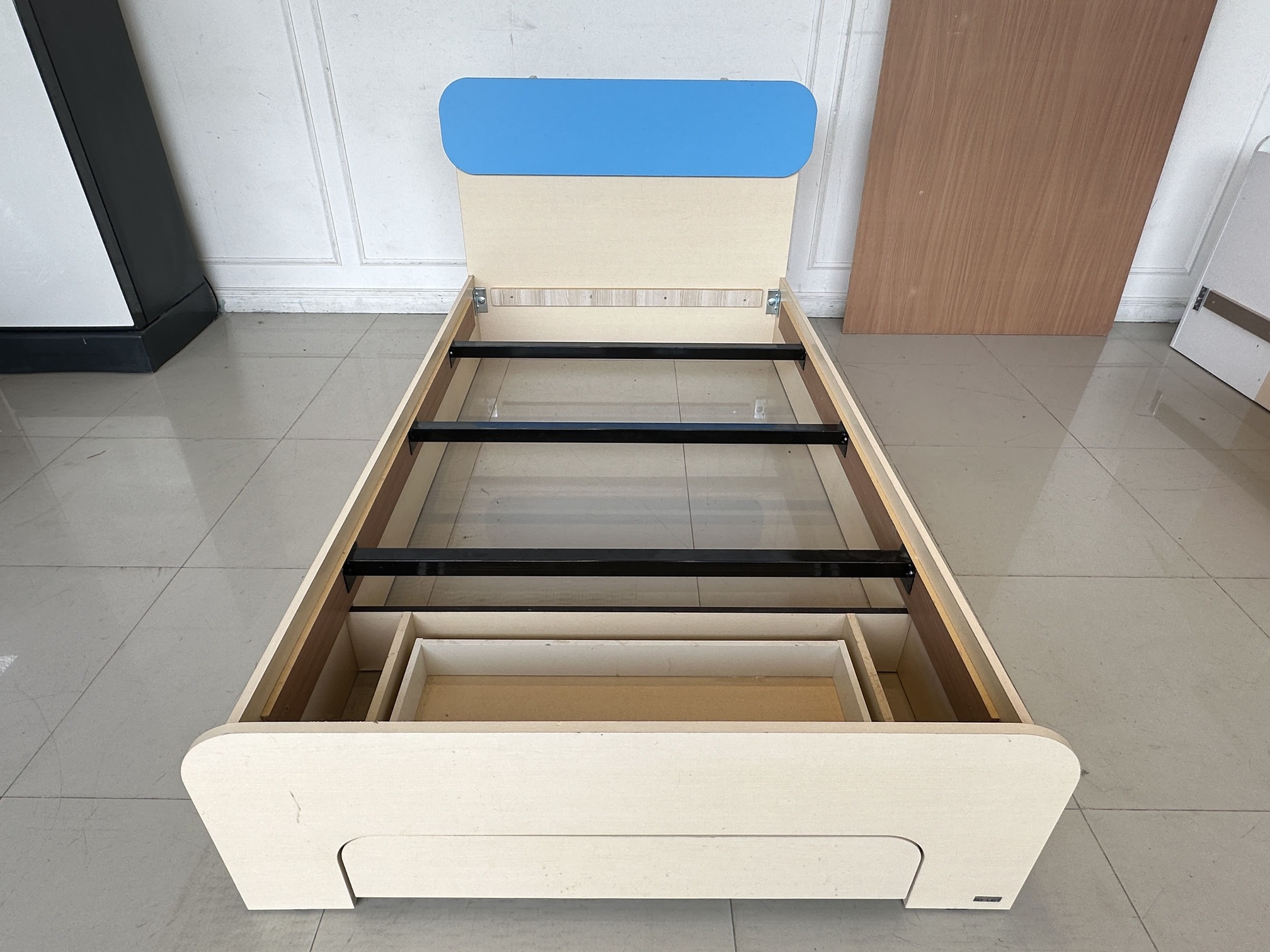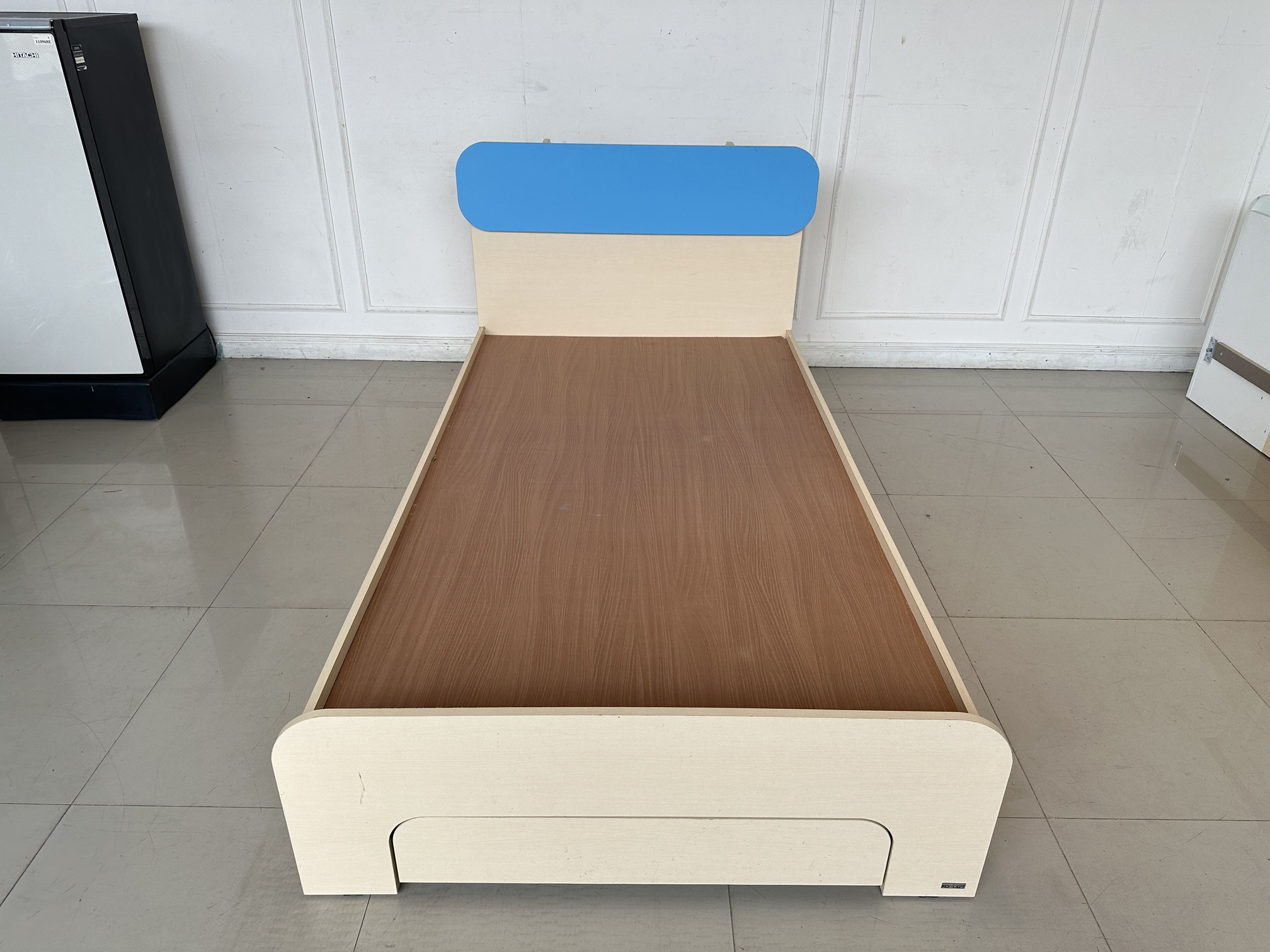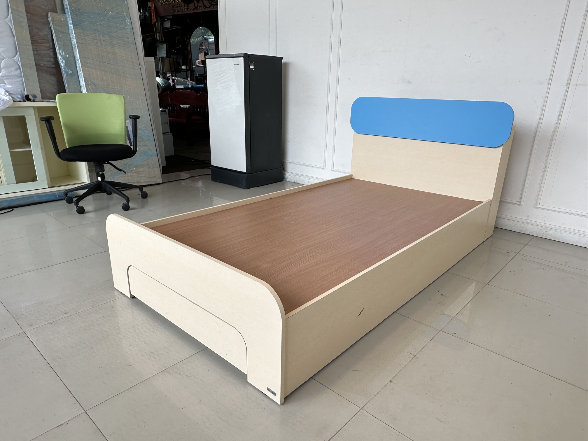เตียง 3.5 ฟุต แบรนด์ KONCEPT หัวเตียงสีฟ้า มีช่องวางของ ปลายเตียงมี 1 ลิ้นชัก โครงไม้ MDF สีบีช คานเหล็ก 3 ท่อน แผ่นรองเตียงไม่อัด 1 แผ่น