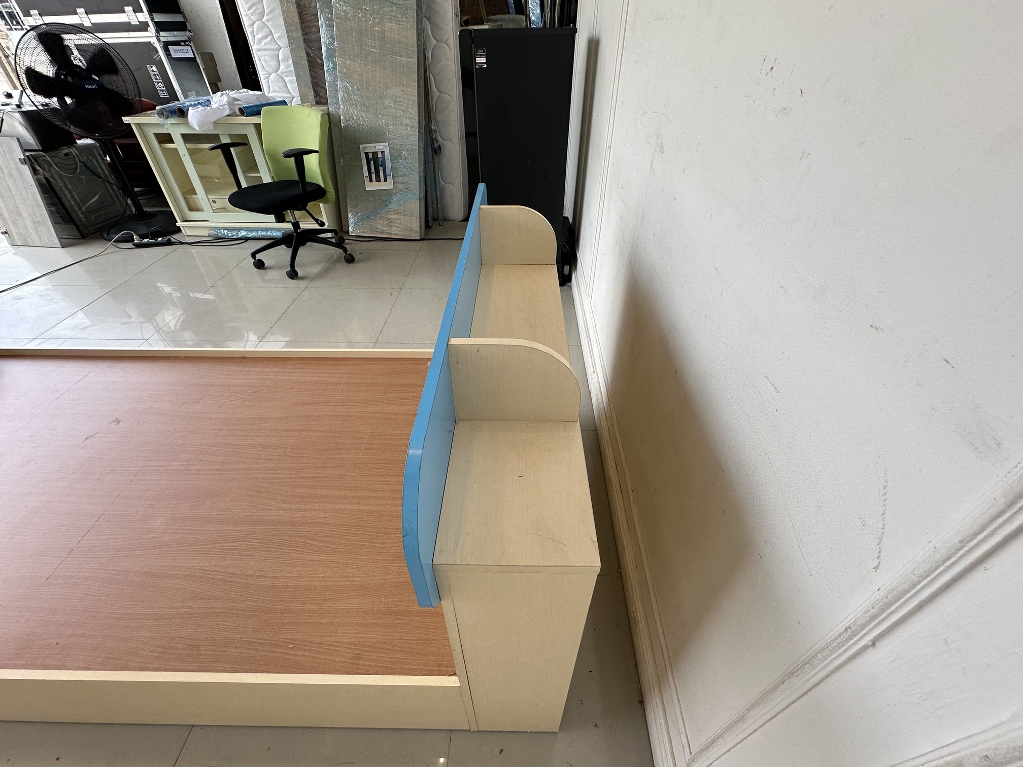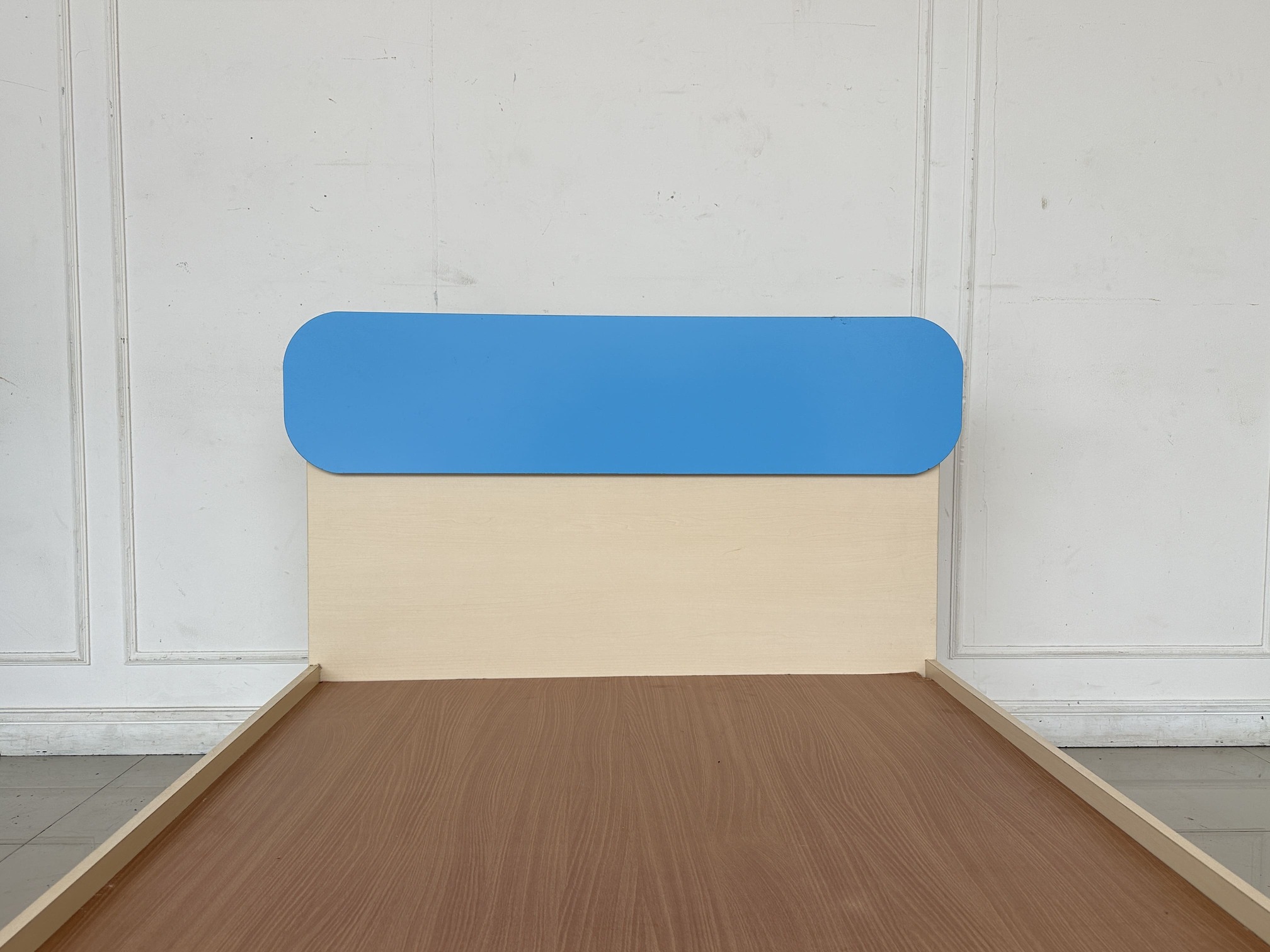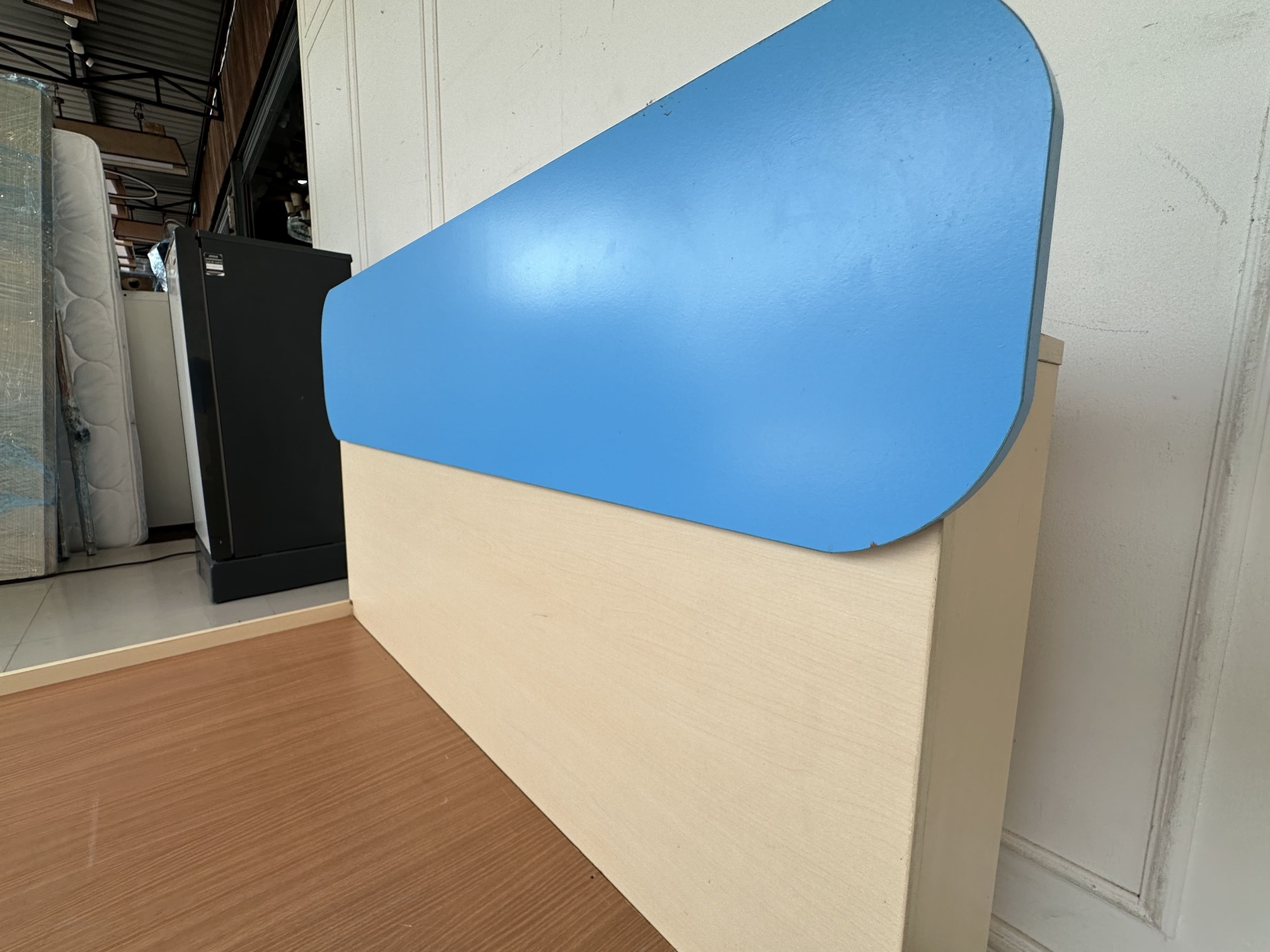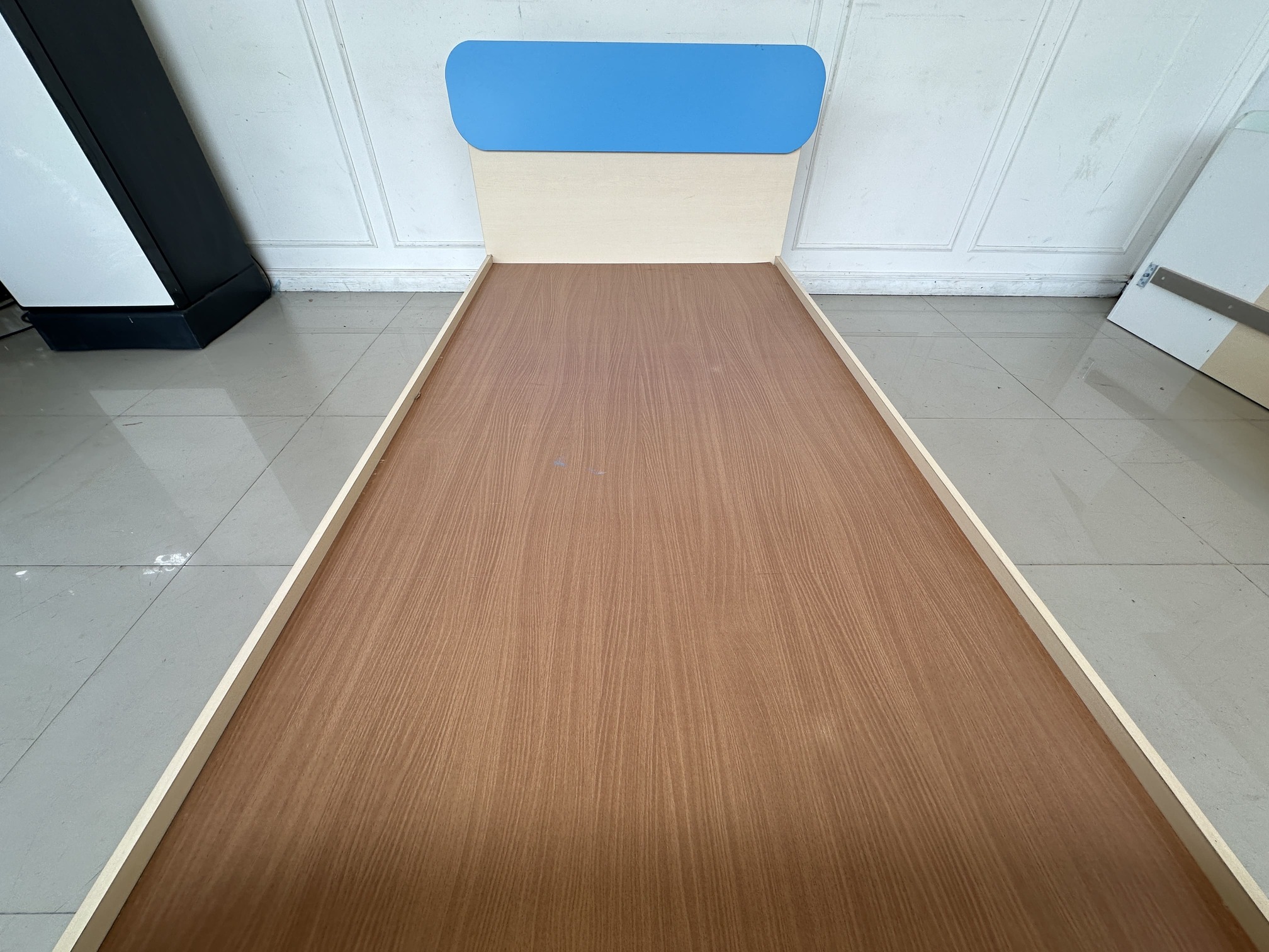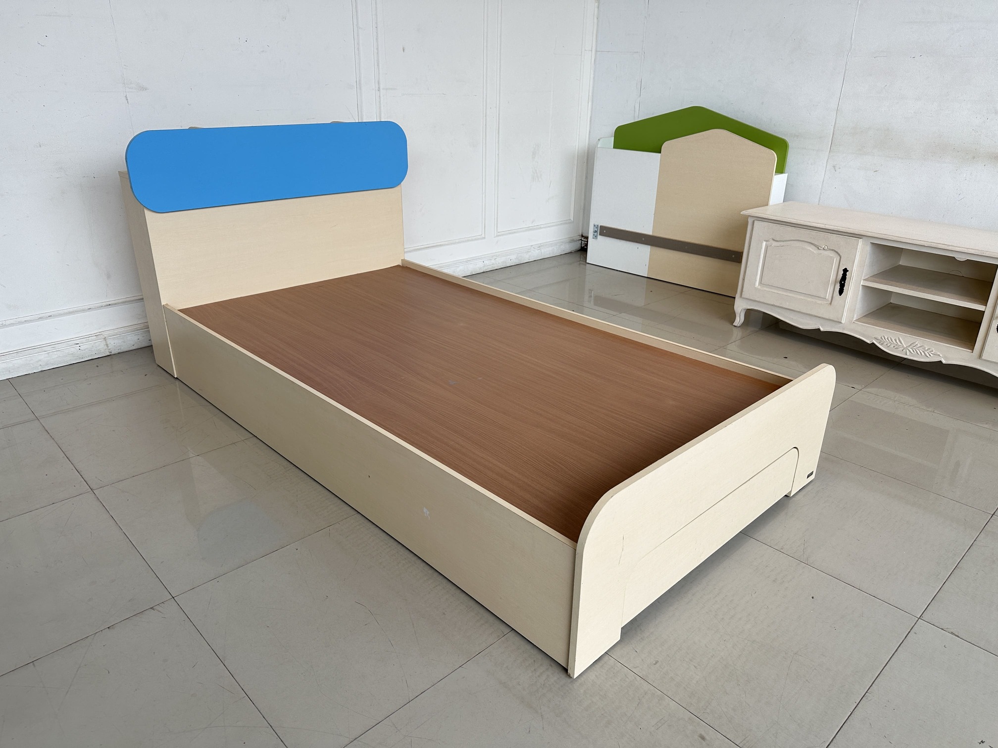 เตียง 3.5 ฟุต แบรนด์ KONCEPT หัวเตียงสีฟ้า มีช่องวางของ ปลายเตียงมี 1 ลิ้นชัก โครงไม้ MDF สีบีช คานเหล็ก 3 ท่อน แผ่นรองเตียงไม่อัด 1 แผ่น