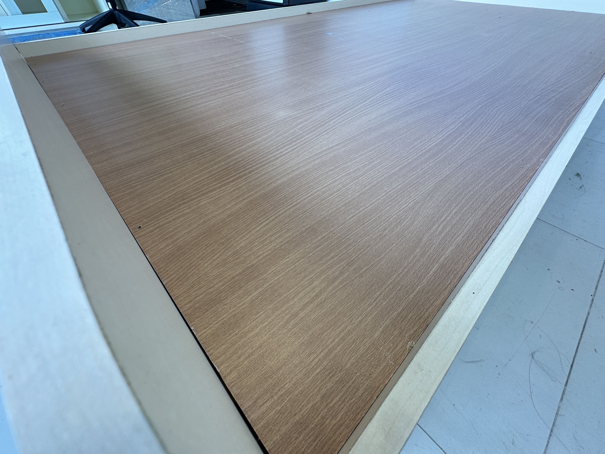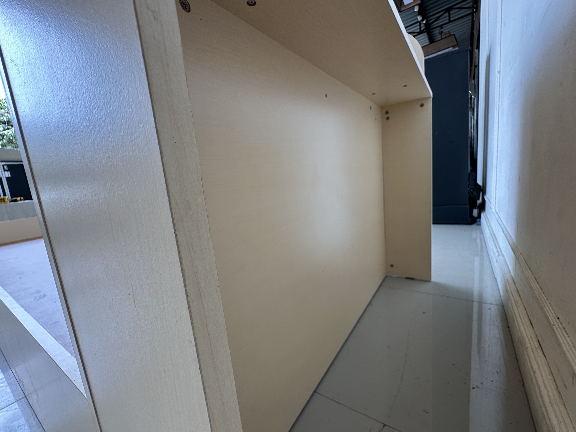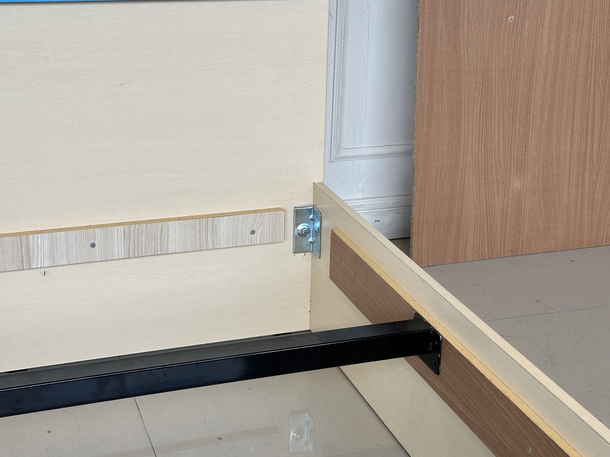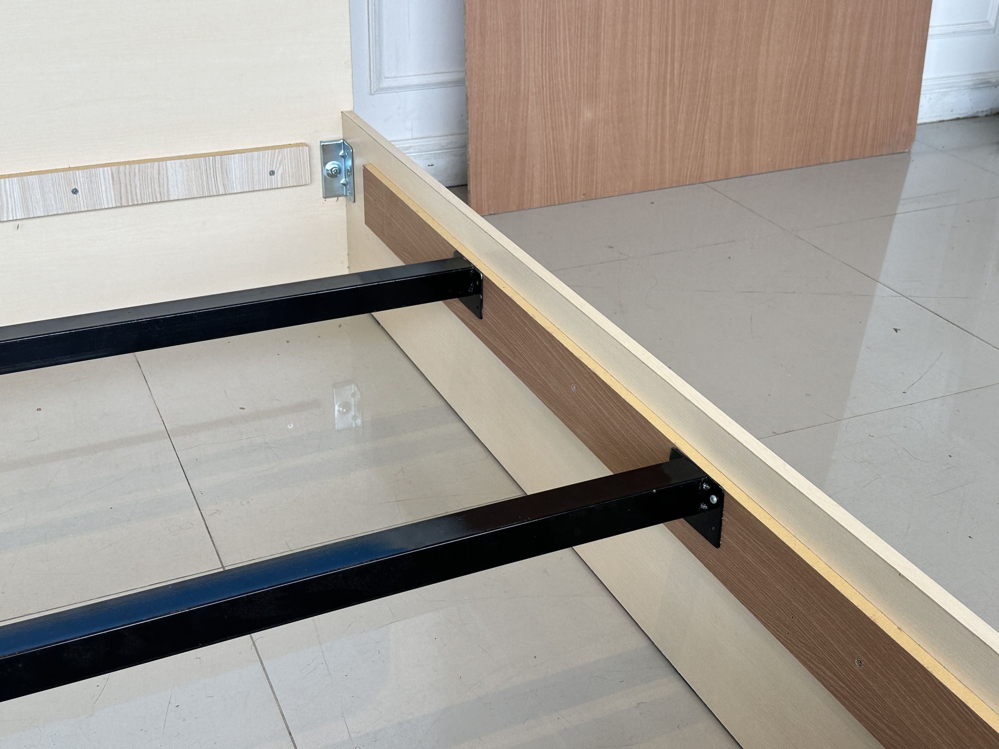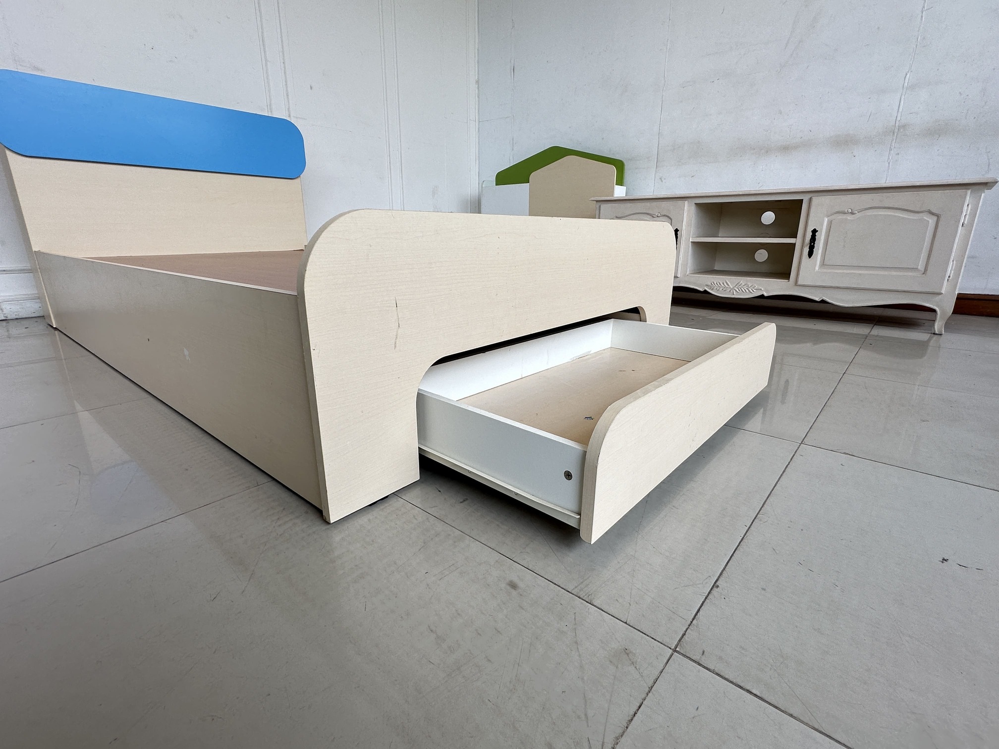 เตียง 3.5 ฟุต แบรนด์ KONCEPT หัวเตียงสีฟ้า มีช่องวางของ ปลายเตียงมี 1 ลิ้นชัก โครงไม้ MDF สีบีช คานเหล็ก 3 ท่อน แผ่นรองเตียงไม่อัด 1 แผ่น