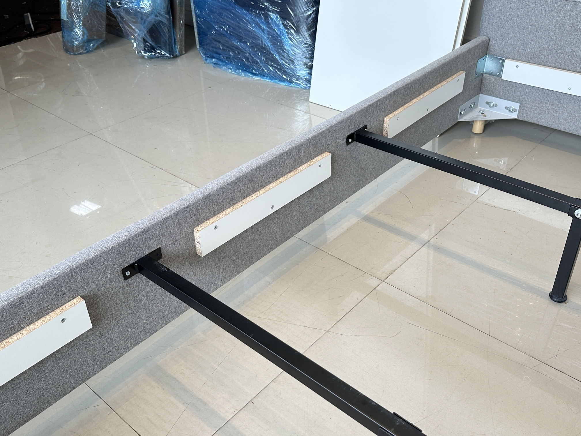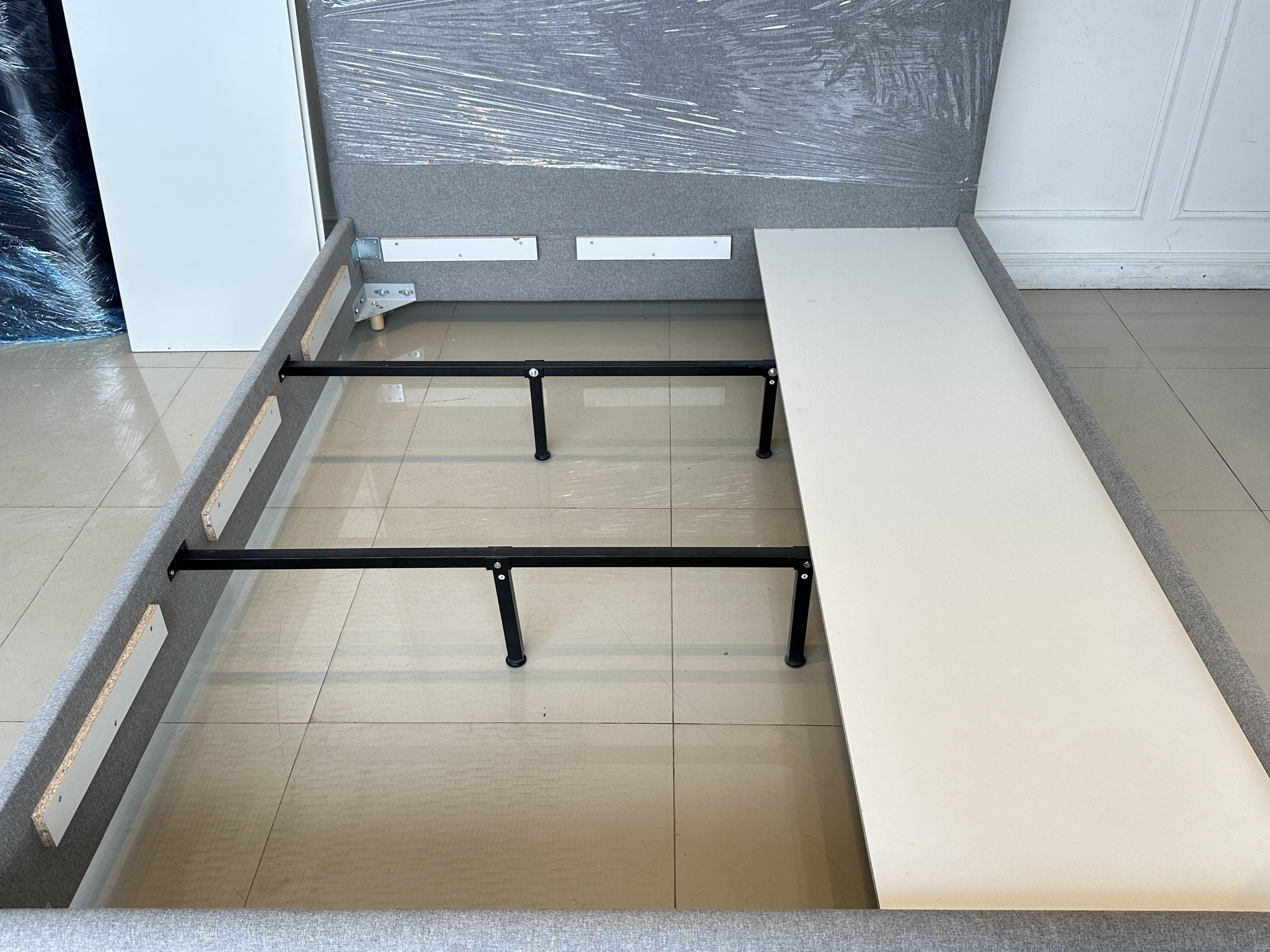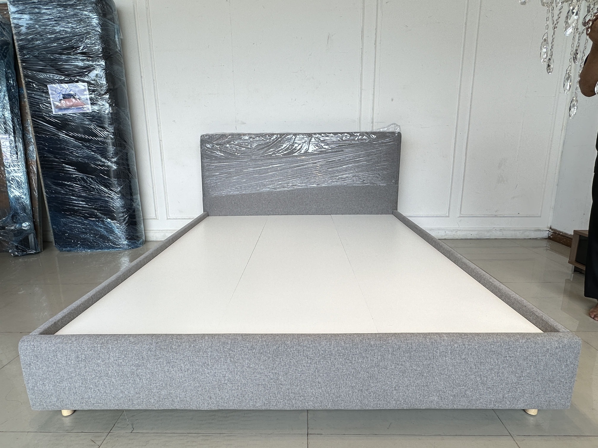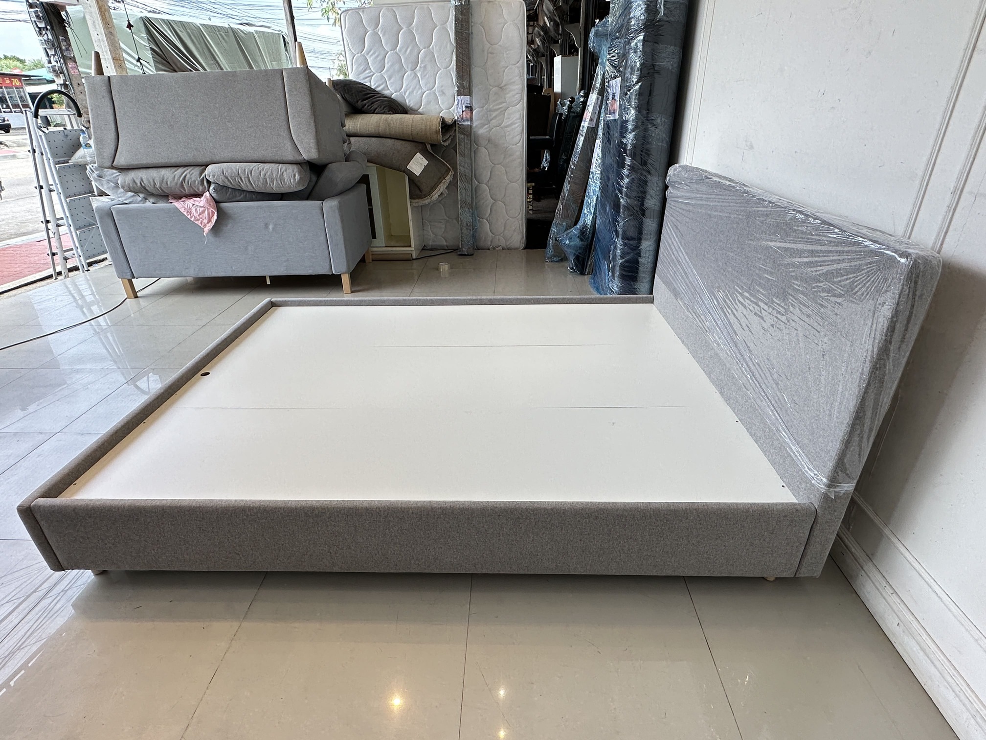 เตียง 5 ฟุต โครงเตียงไม้ MDF บุนวมหุ้มผ้าสีเทา คานเหล็ก 2 ท่อน แผ่นรองไม้อัด 3 แผ่น ขาไม้ยาง