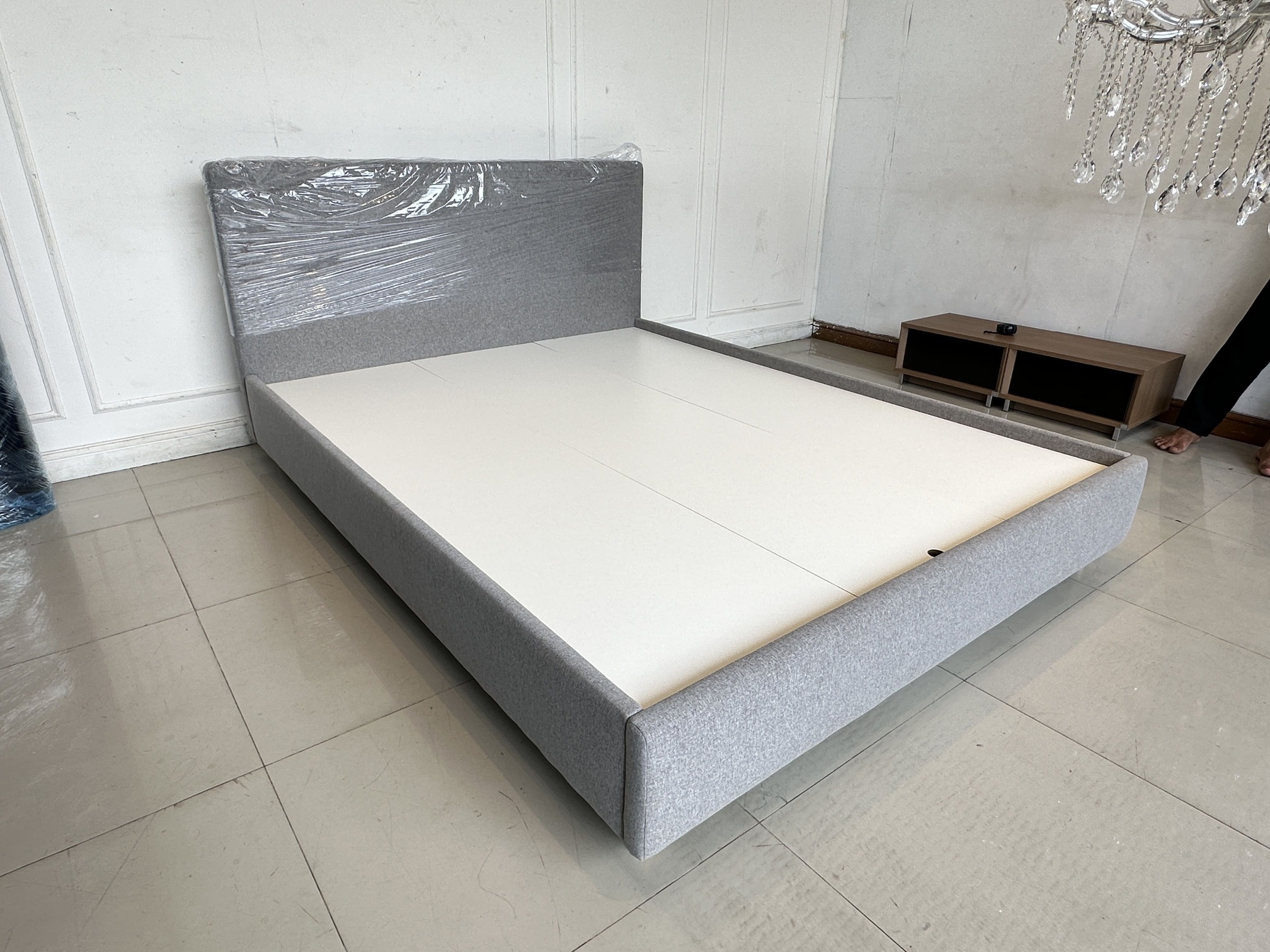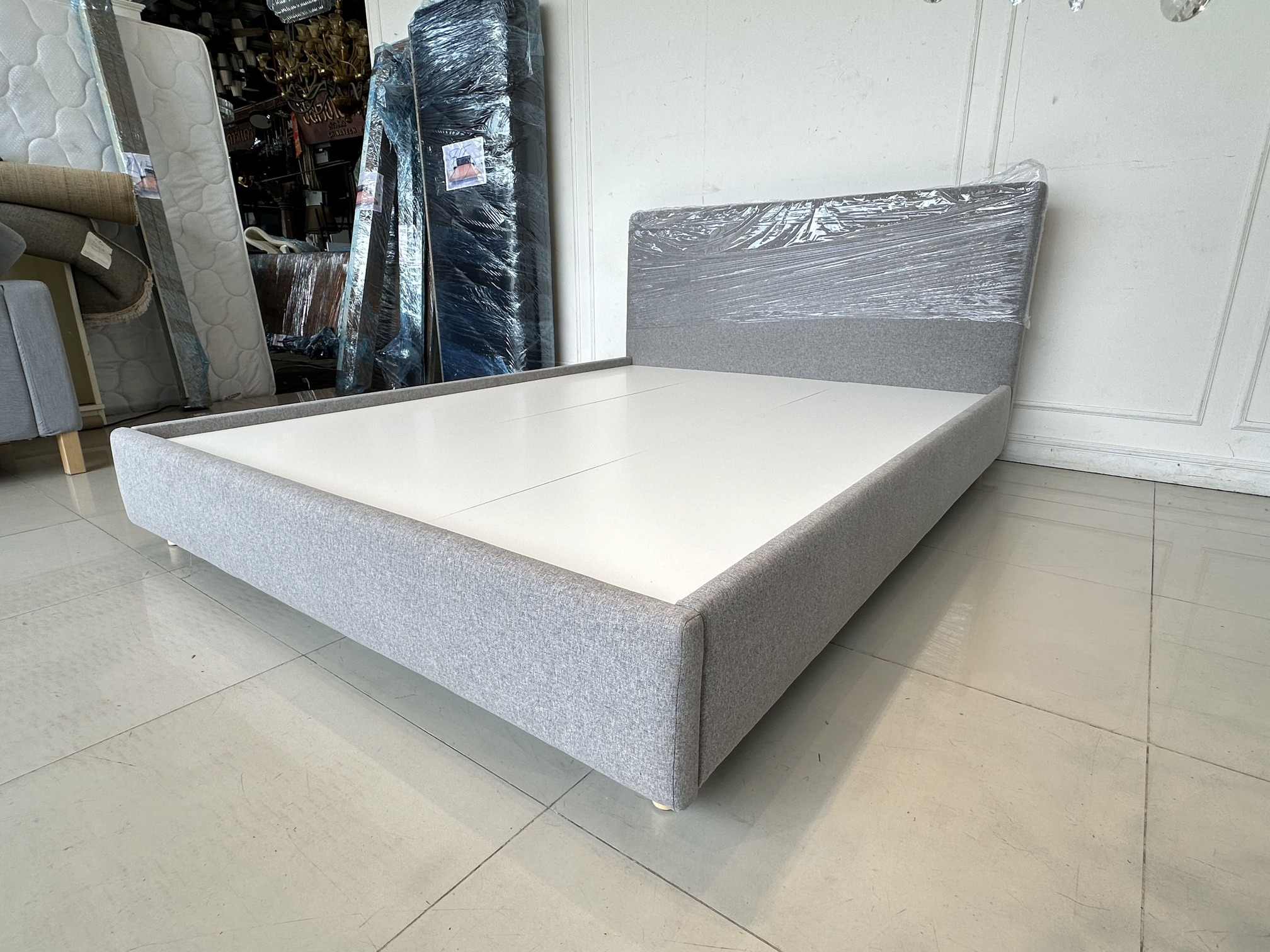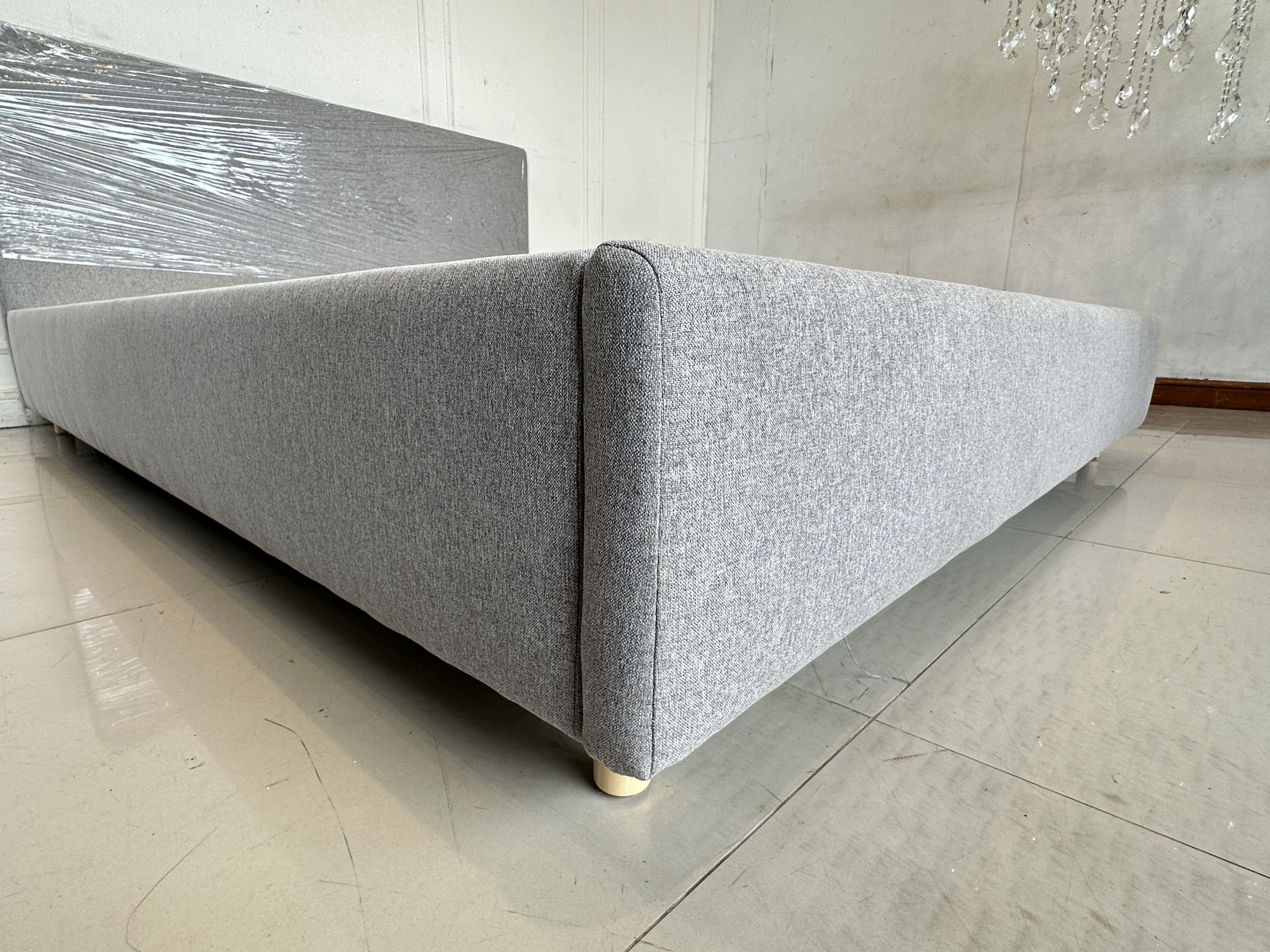 เตียง 5 ฟุต โครงเตียงไม้ MDF บุนวมหุ้มผ้าสีเทา คานเหล็ก 2 ท่อน แผ่นรองไม้อัด 3 แผ่น ขาไม้ยาง
