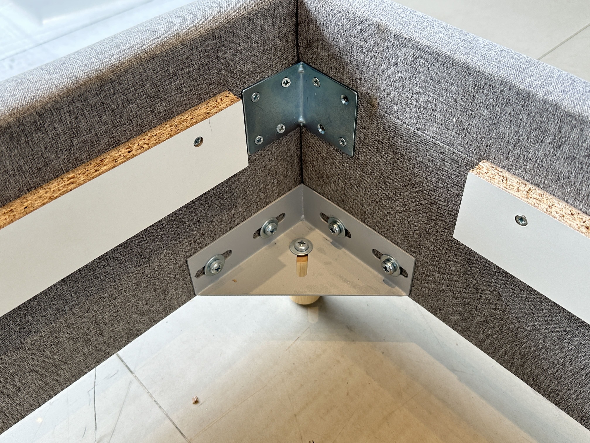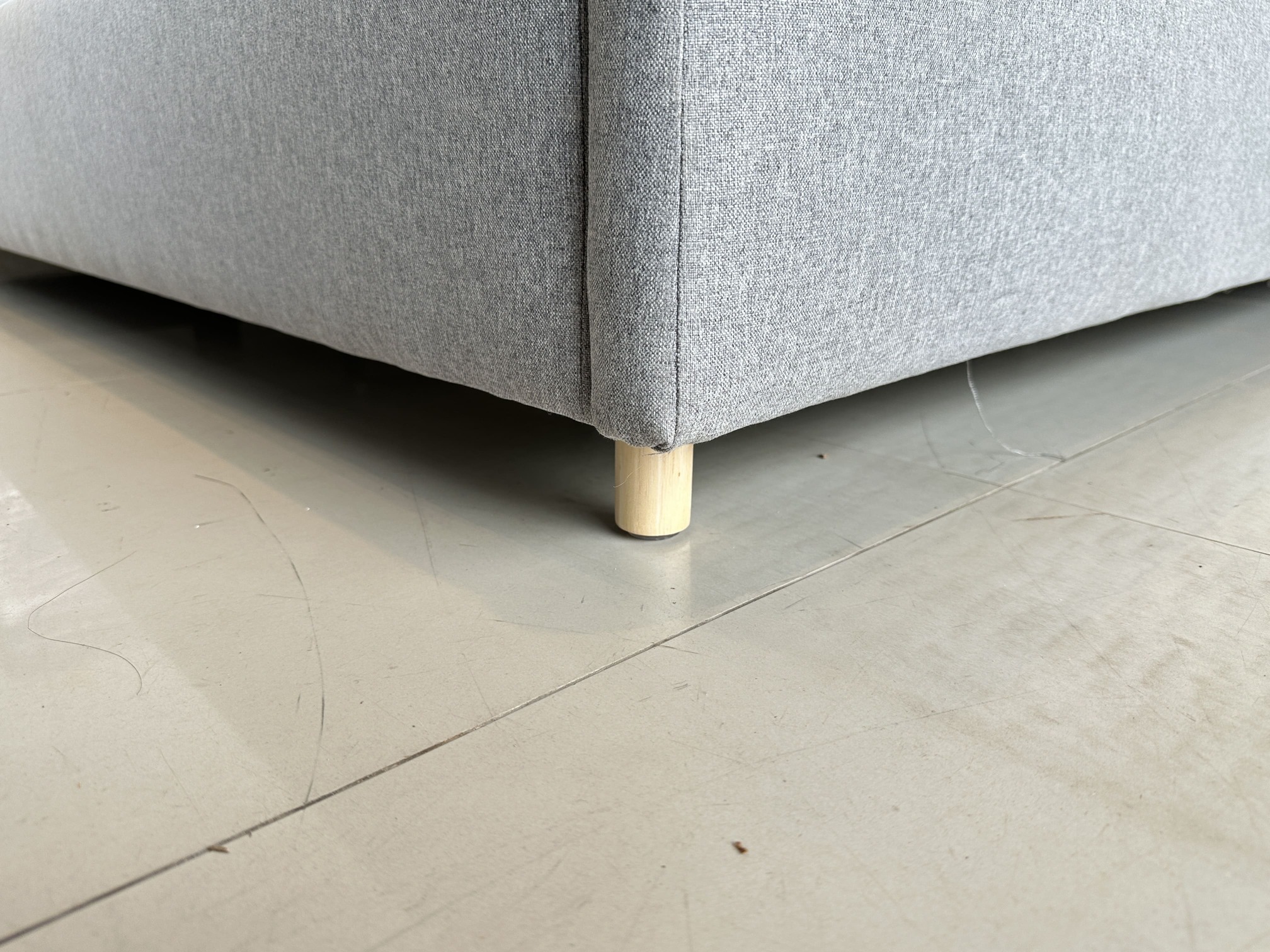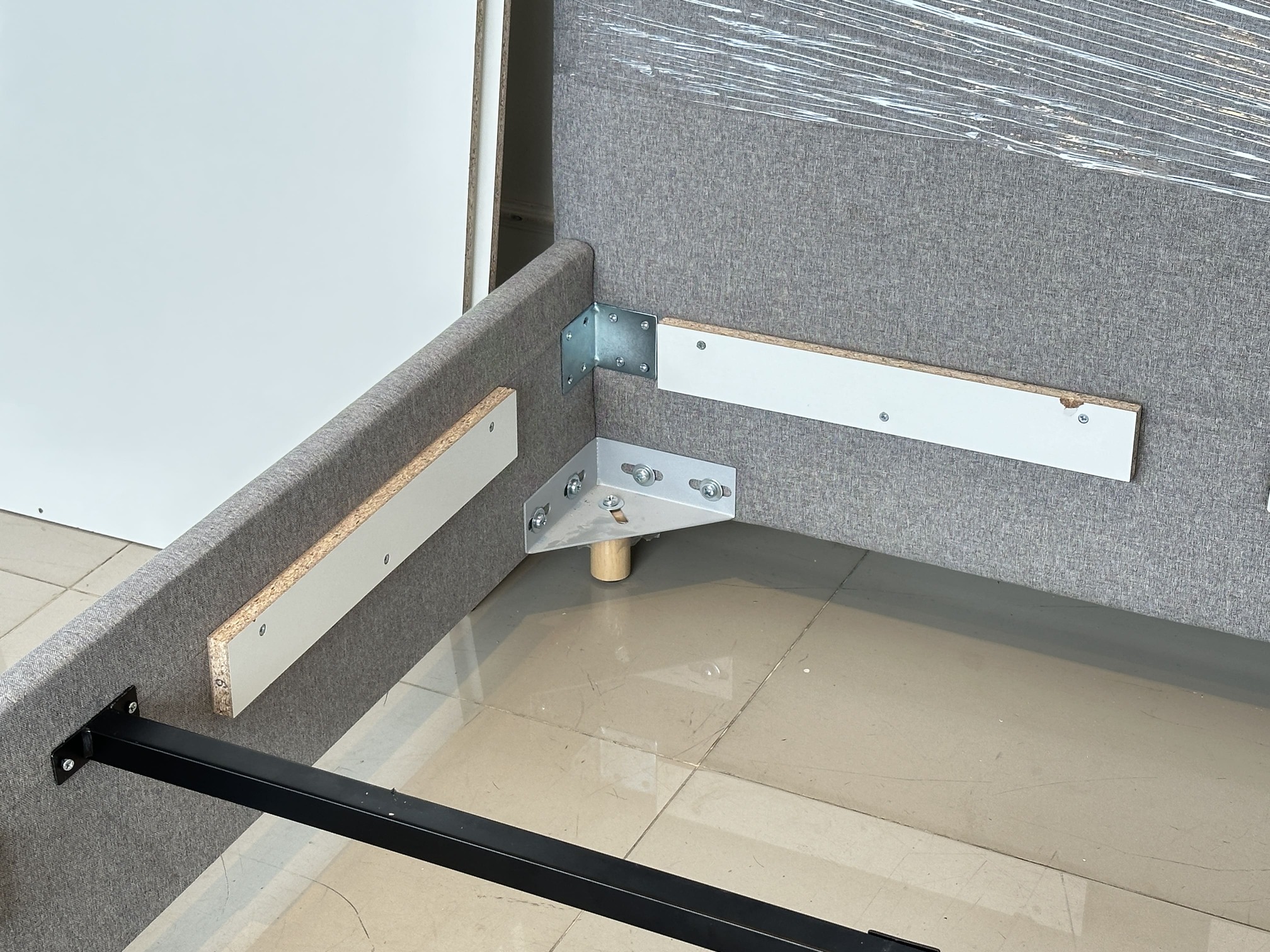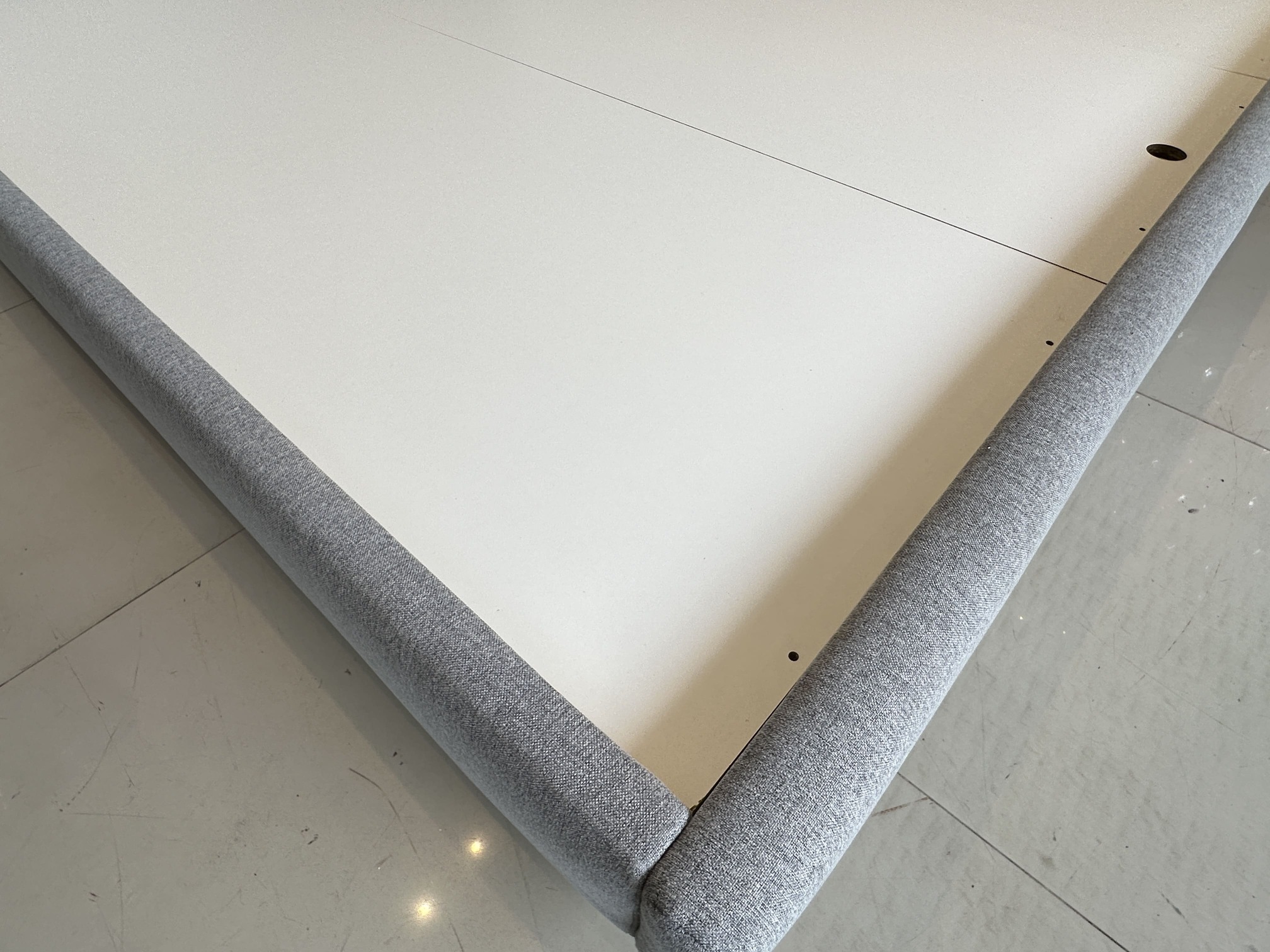 เตียง 5 ฟุต โครงเตียงไม้ MDF บุนวมหุ้มผ้าสีเทา คานเหล็ก 2 ท่อน แผ่นรองไม้อัด 3 แผ่น ขาไม้ยาง