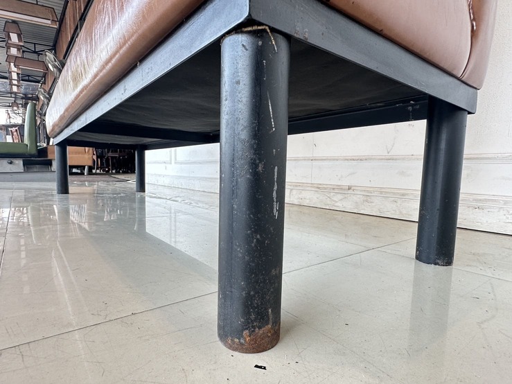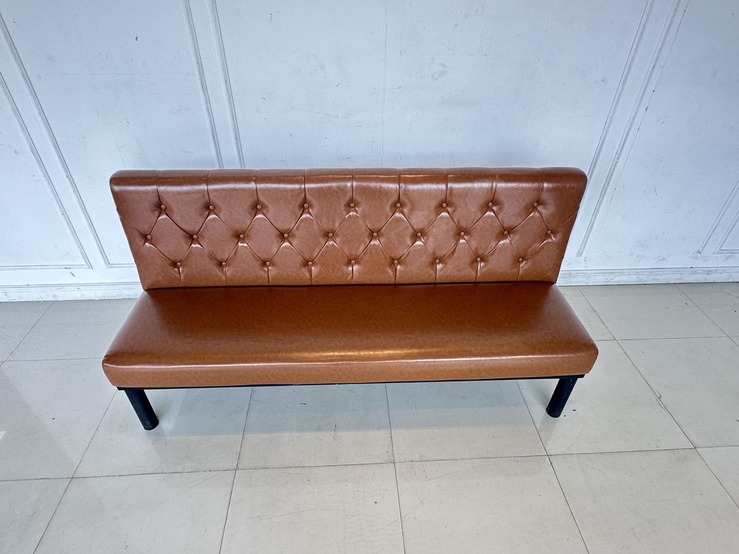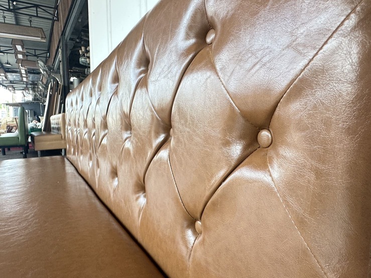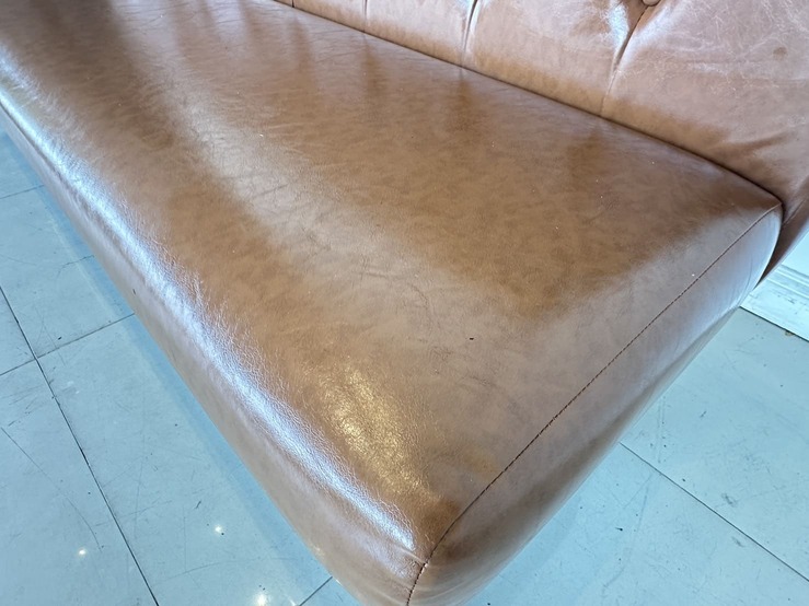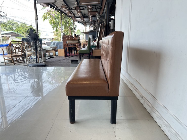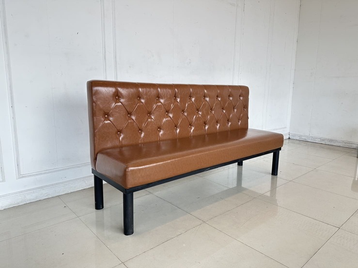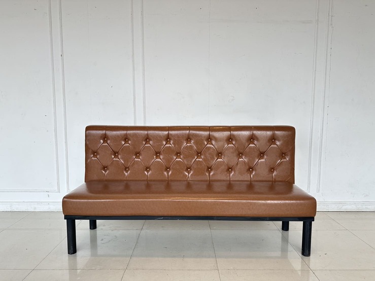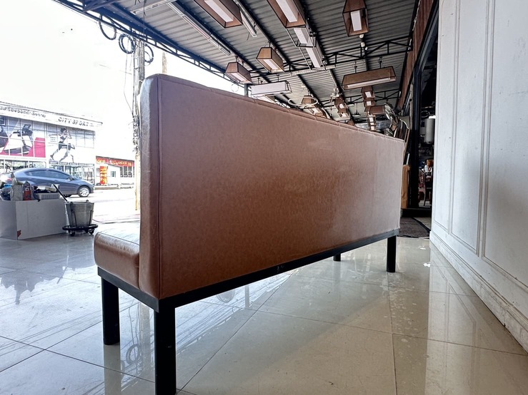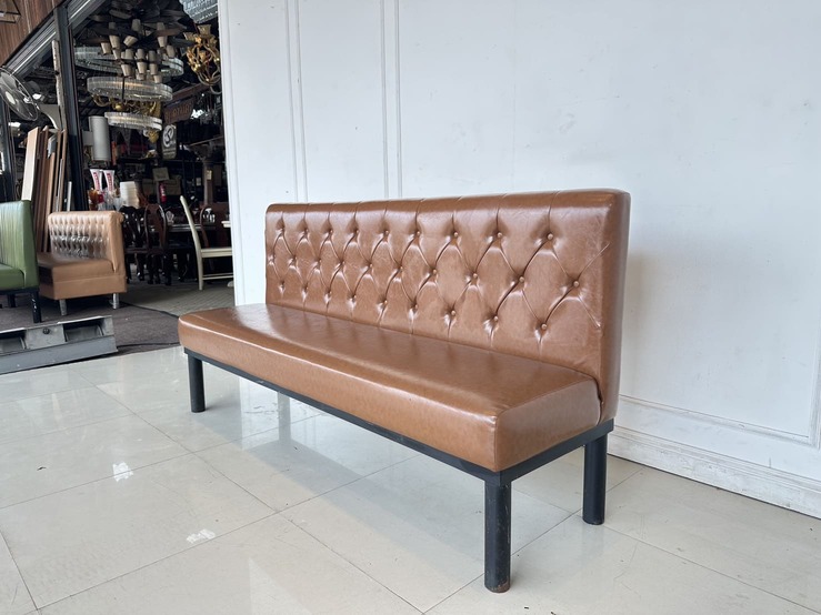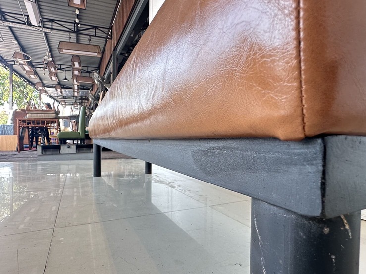 โซฟายาว เบาะหนัง PU สีน้ำตาล พิงหลังดึงดุม โครงโซฟาไม้ MDF ขาเหล็กสีดำ
