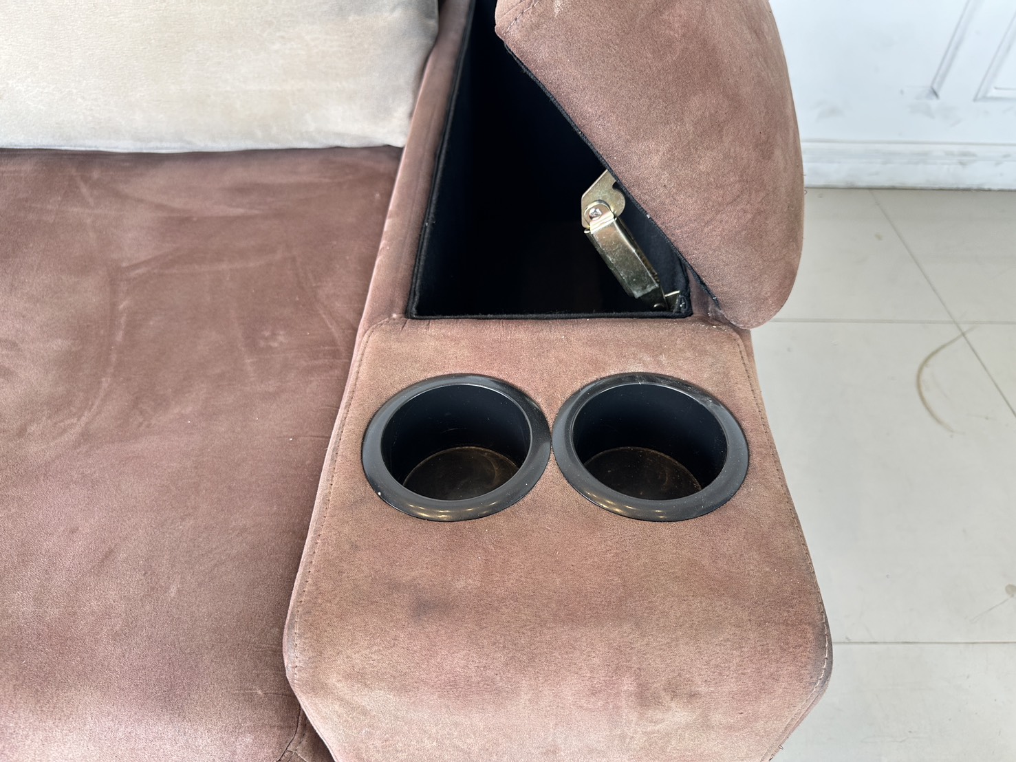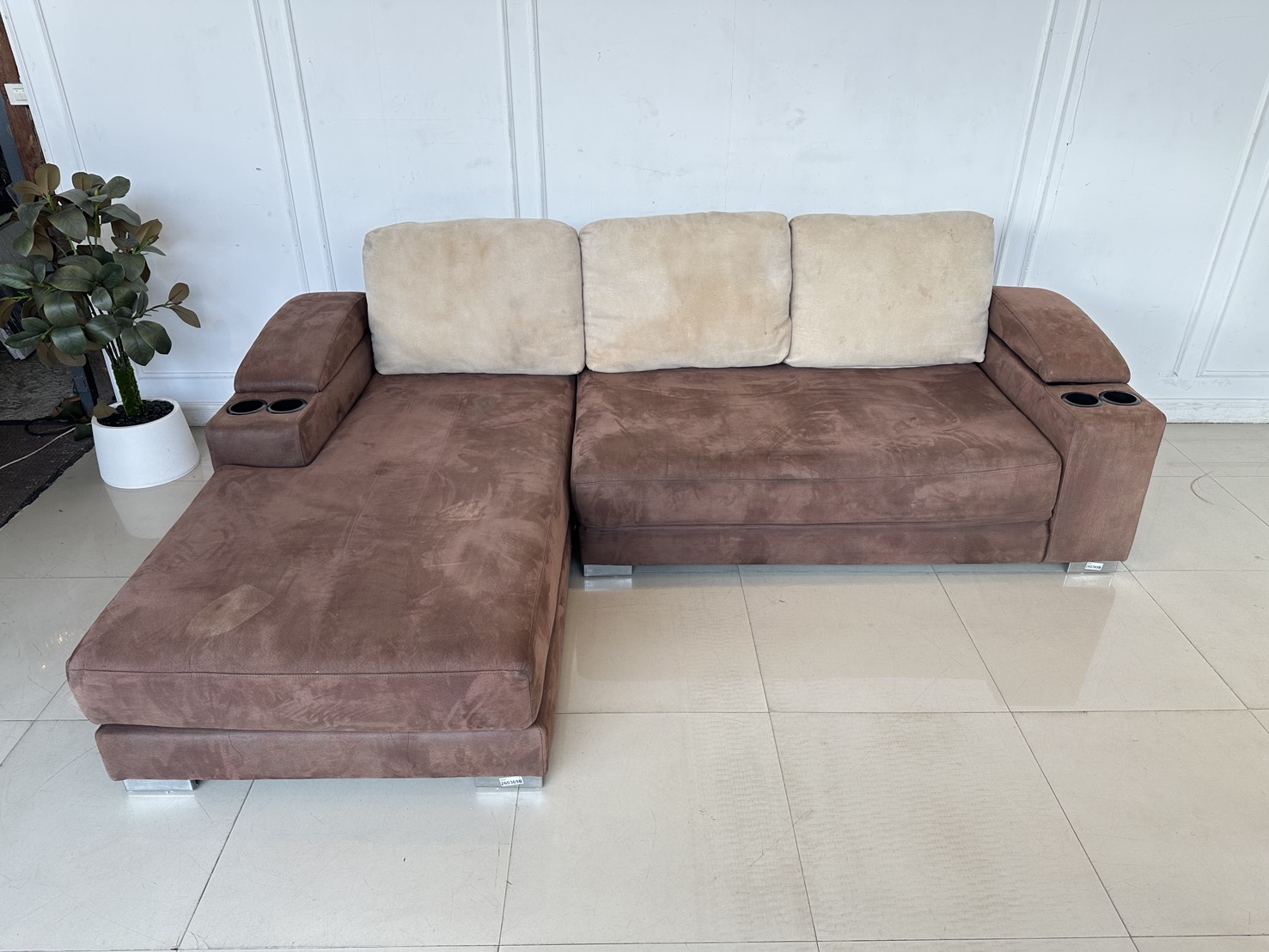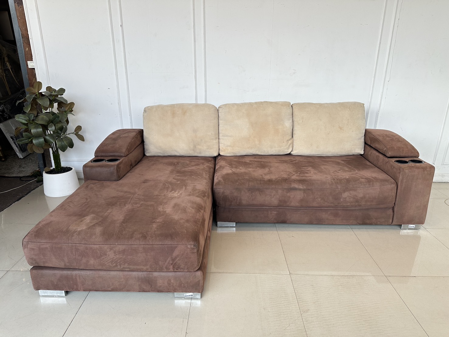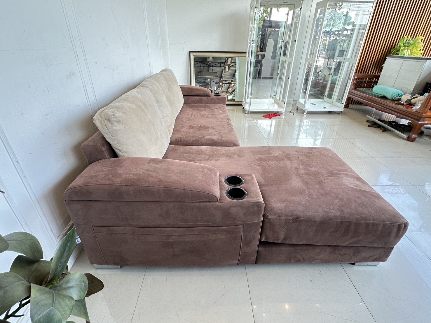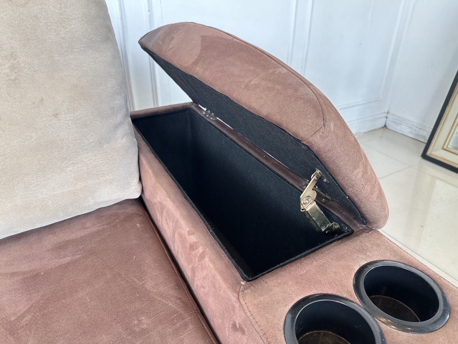 โซฟาแอล เบาะผ้ากำมะหยี่สีน้ำตาล มีหลุมใส่แก้ว 2 หลุม พักแขนเปิดได้มีช่องใส่ของ โครงไม้จริงขาเหล็ก