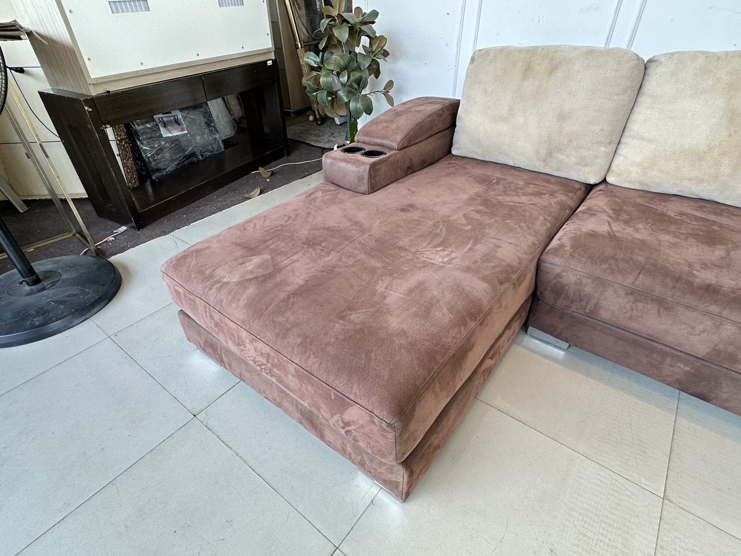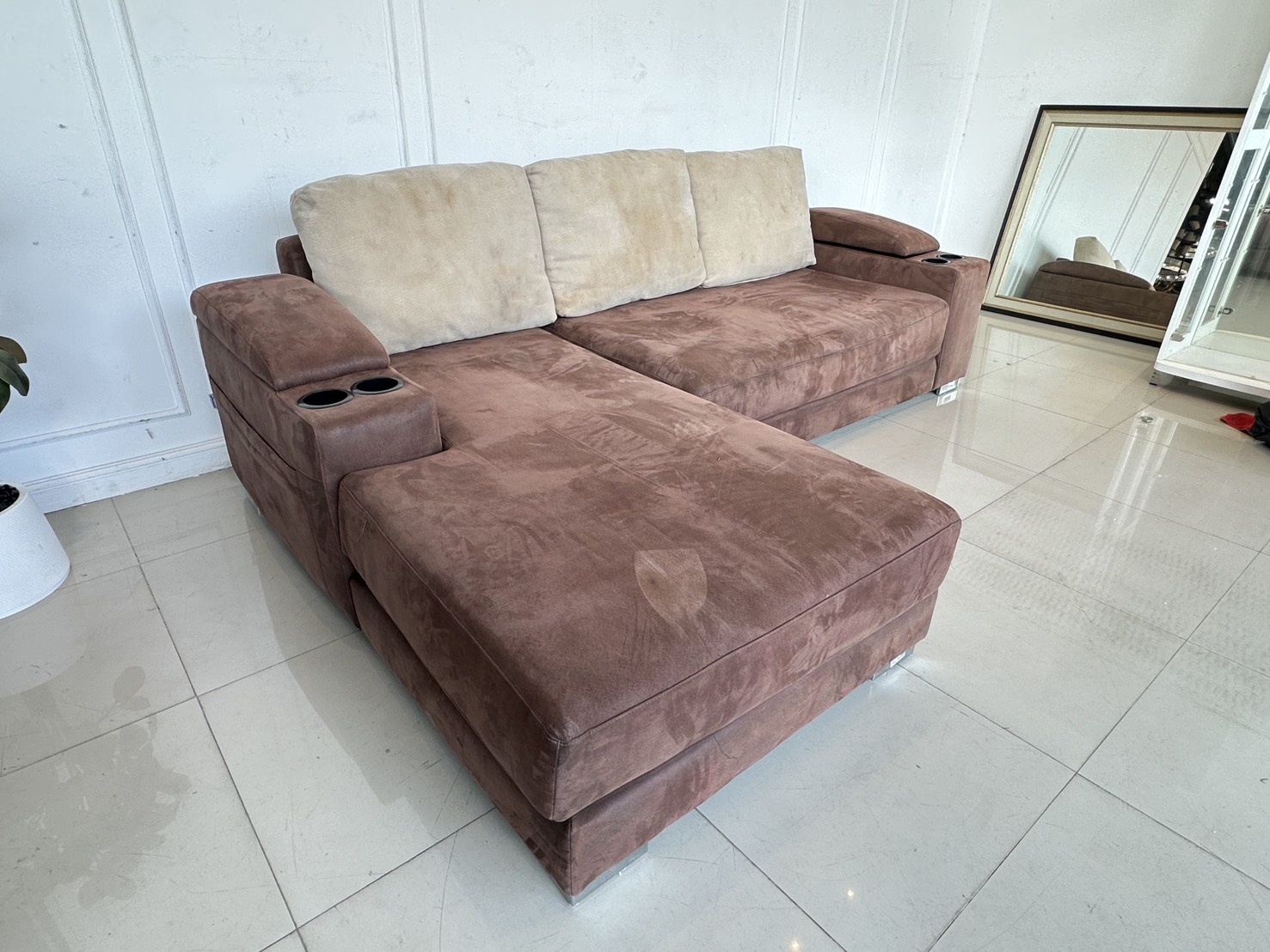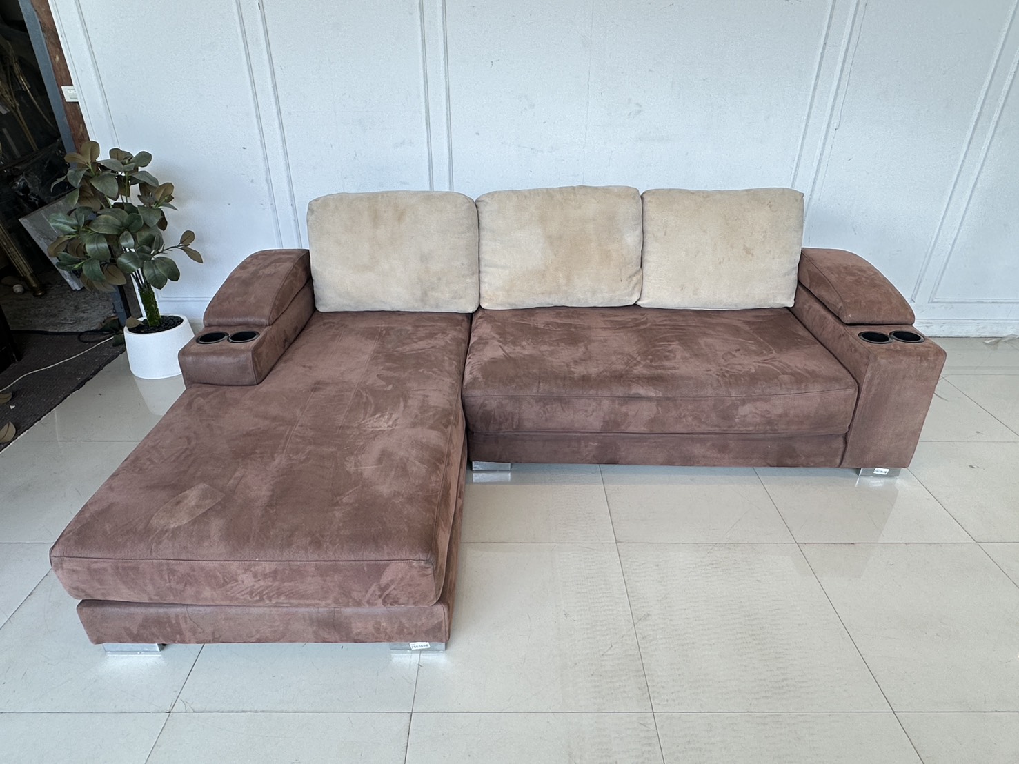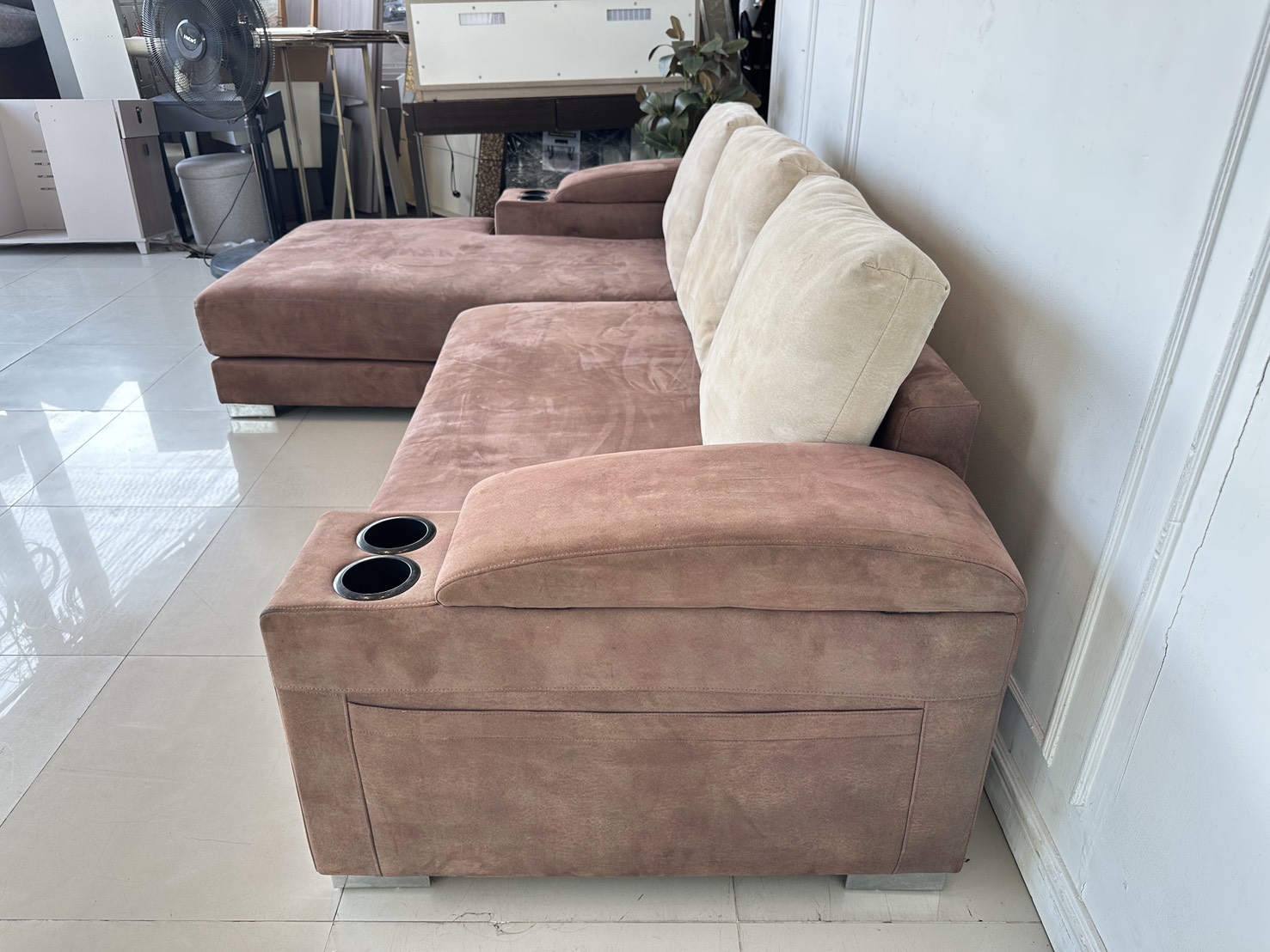 โซฟาแอล เบาะผ้ากำมะหยี่สีน้ำตาล มีหลุมใส่แก้ว 2 หลุม พักแขนเปิดได้มีช่องใส่ของ โครงไม้จริงขาเหล็ก