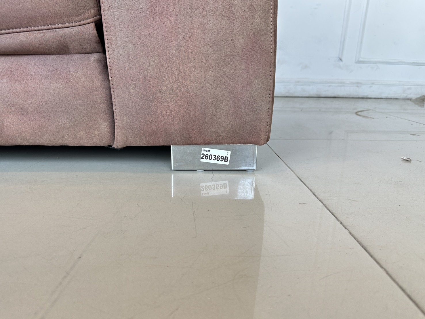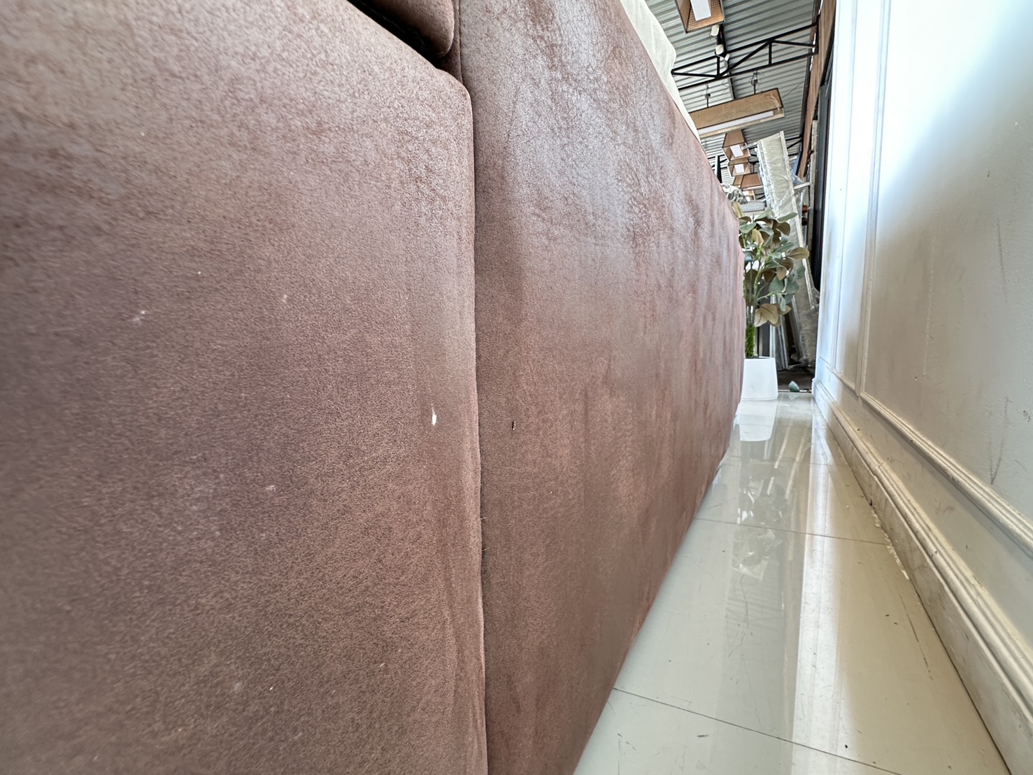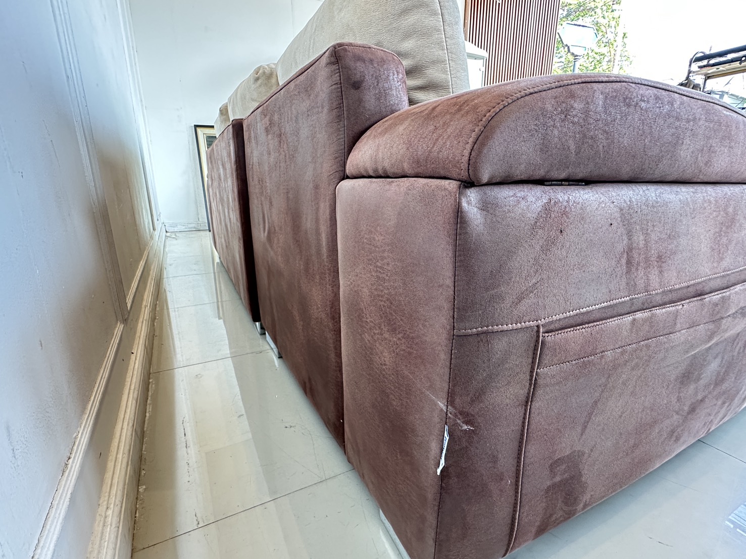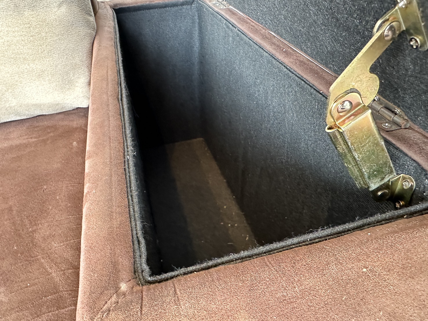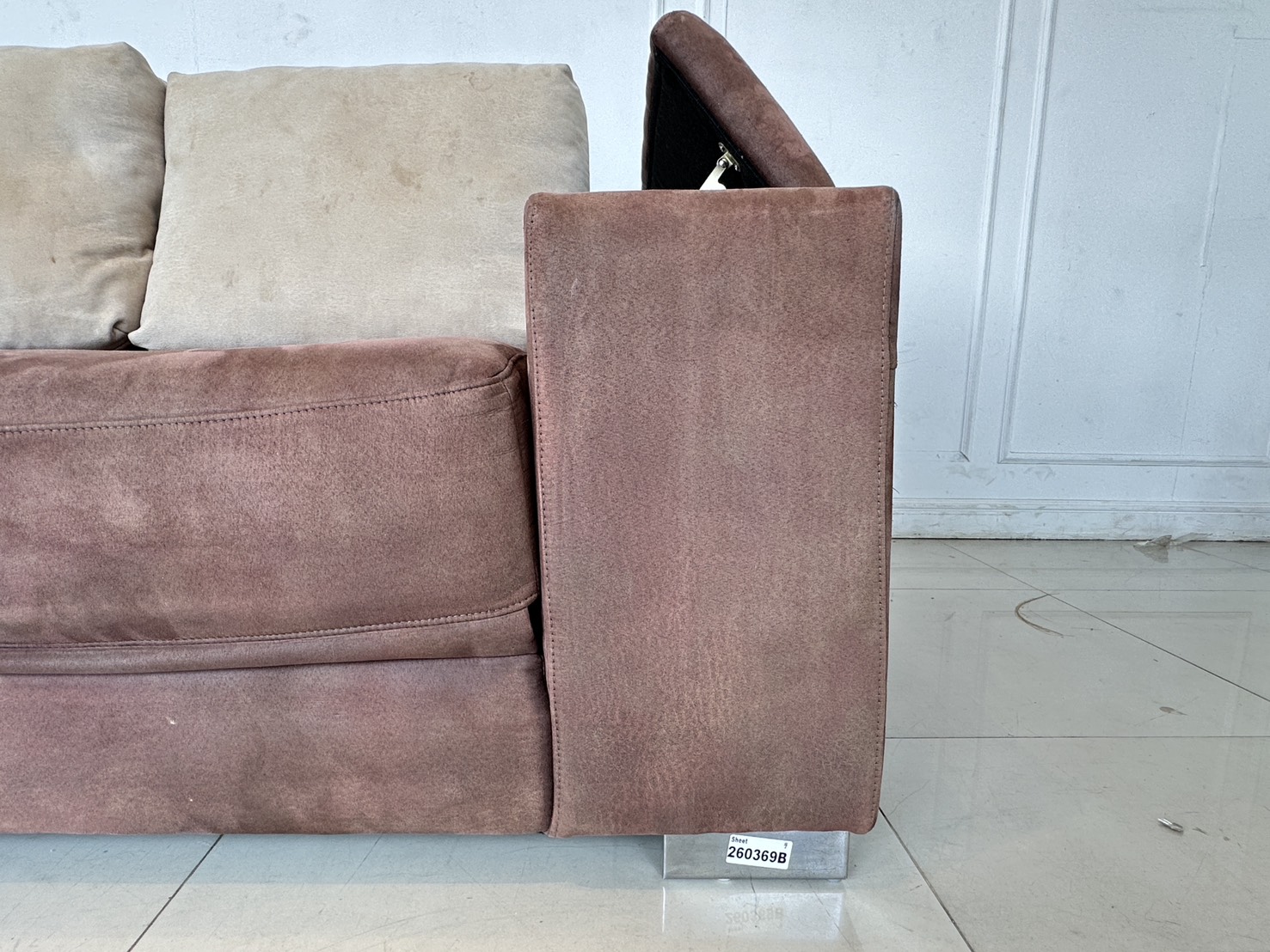โซฟาแอล เบาะผ้ากำมะหยี่สีน้ำตาล มีหลุมใส่แก้ว 2 หลุม พักแขนเปิดได้มีช่องใส่ของ โครงไม้จริงขาเหล็ก