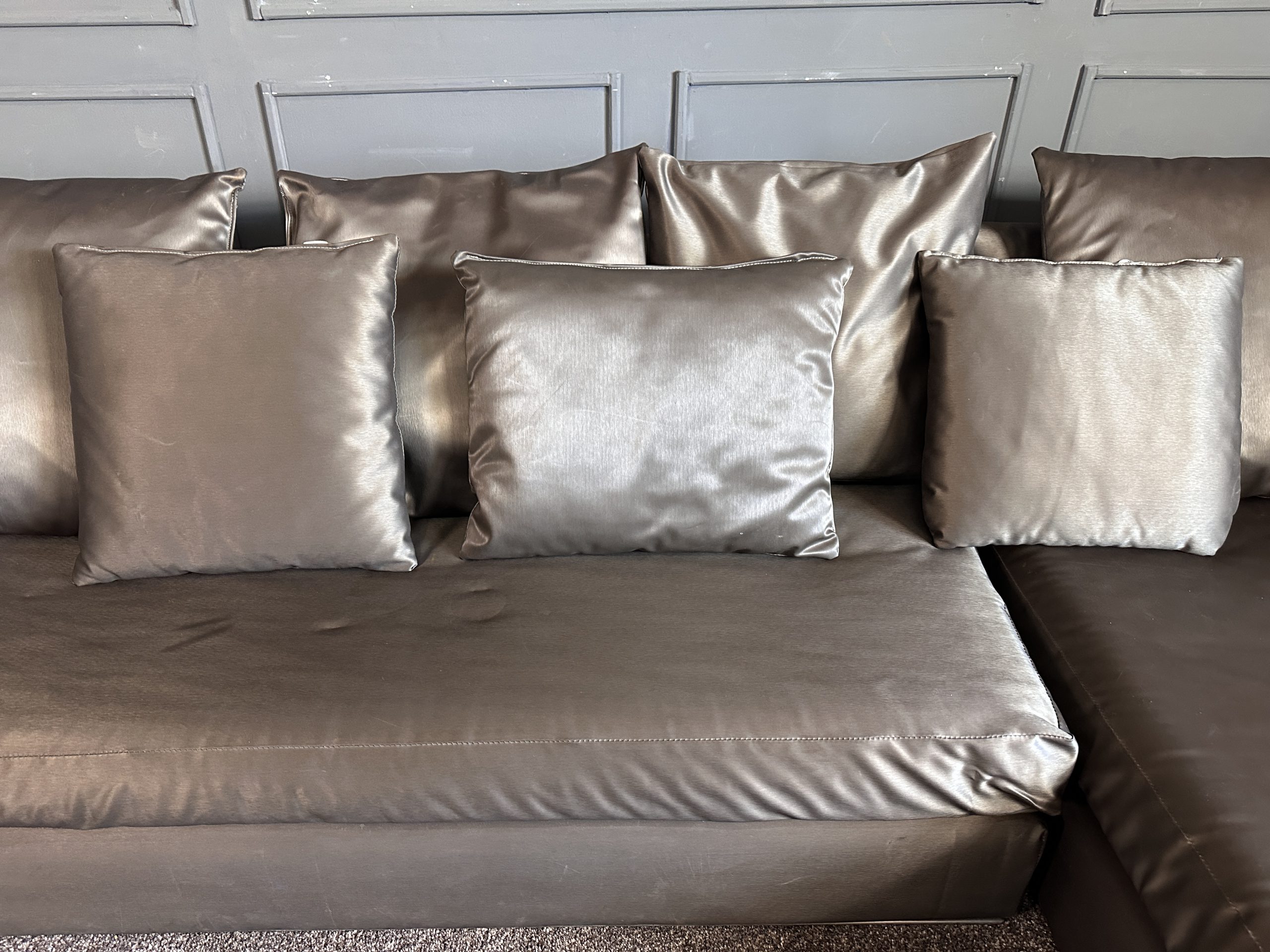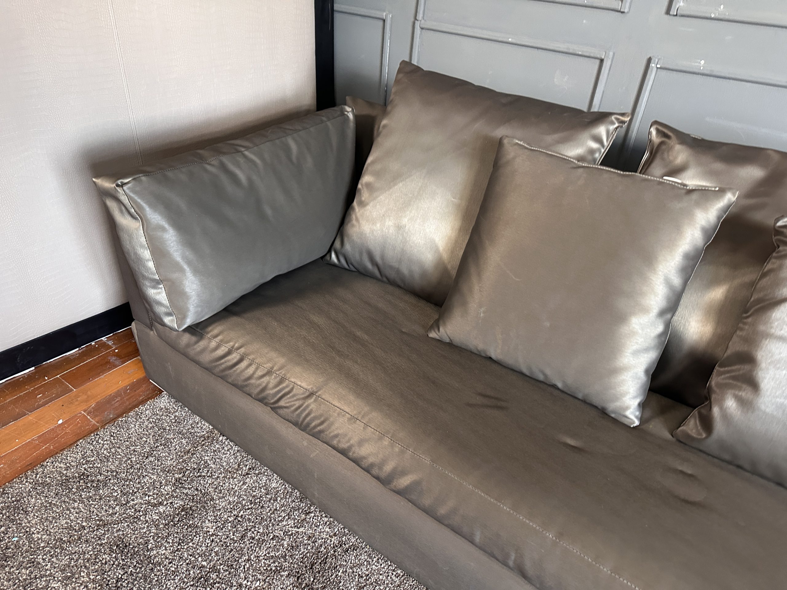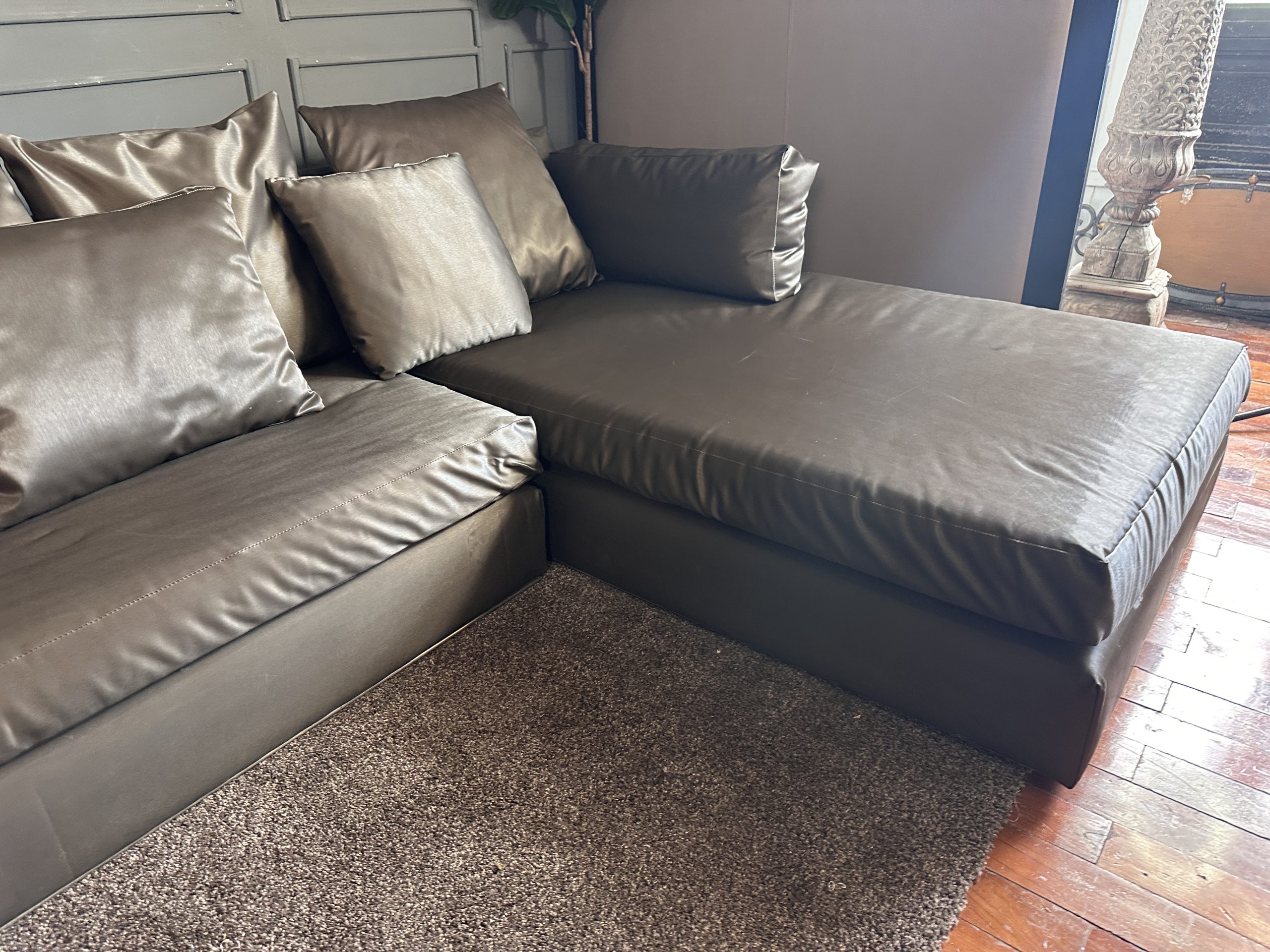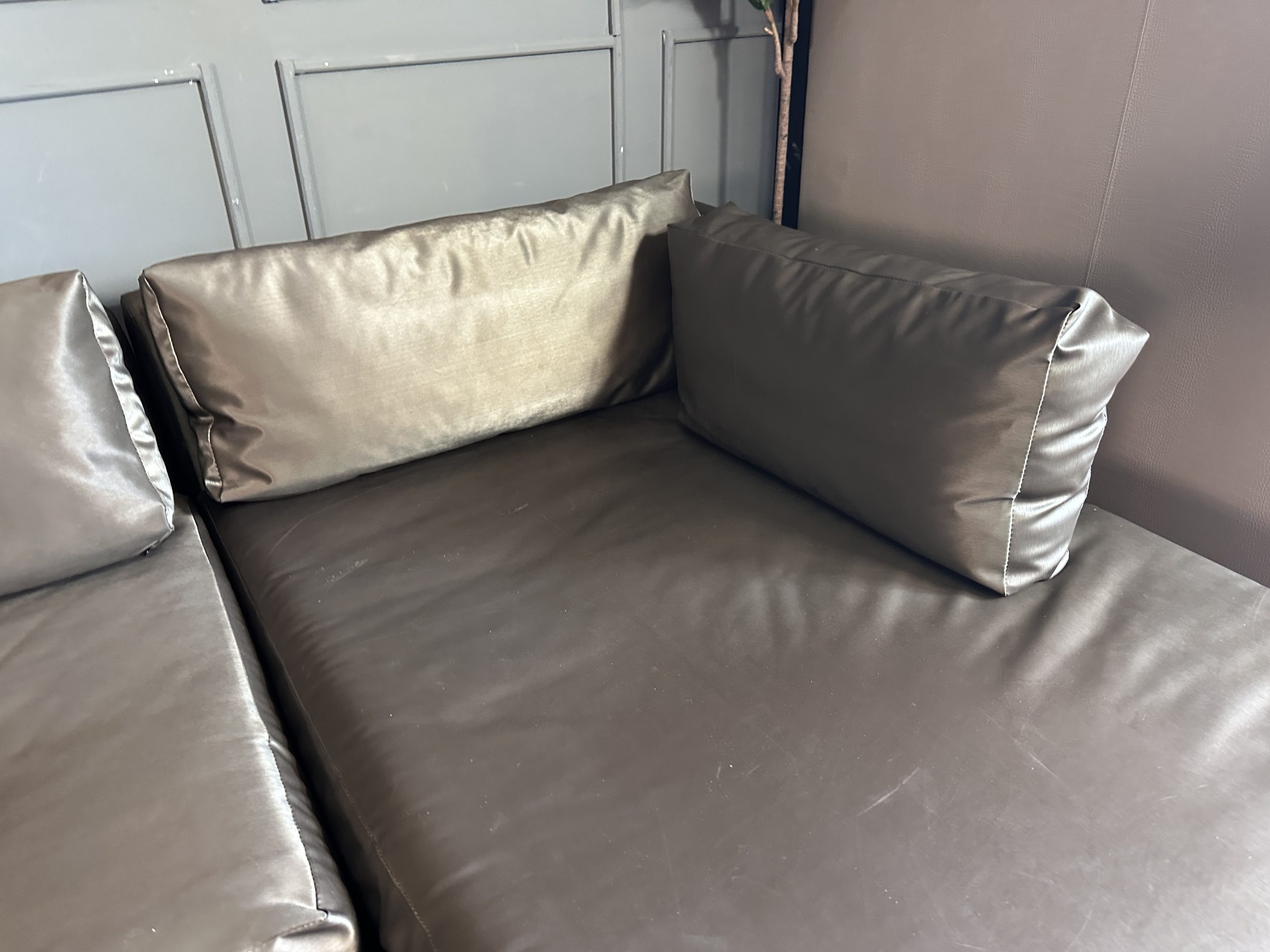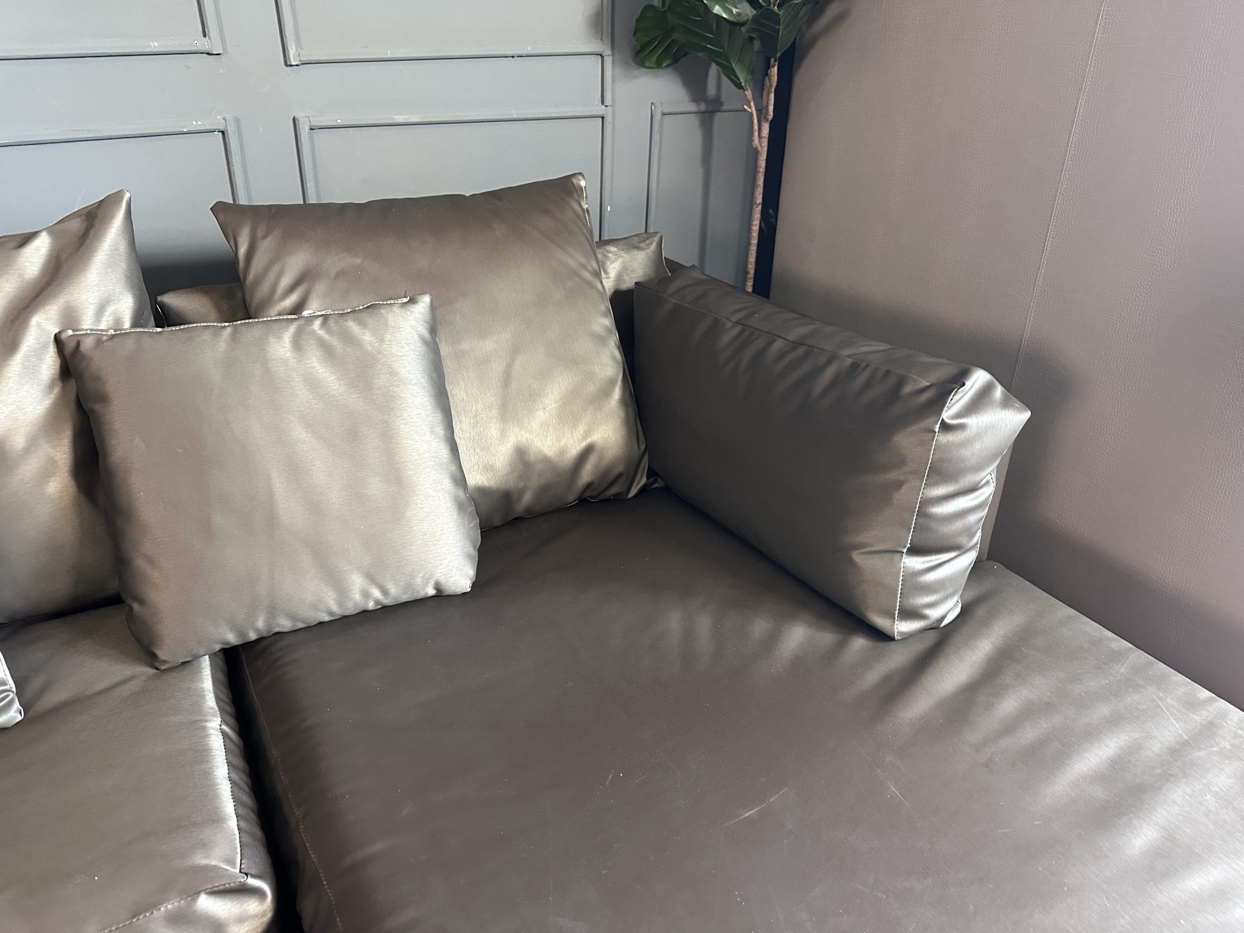 โซฟาแอล 3-4 ที่นั่ง เบาะหนังผ้าไหมสีน้ำตาล ขาสแตนเลส พร้อมหมอนอิงตามภาพ