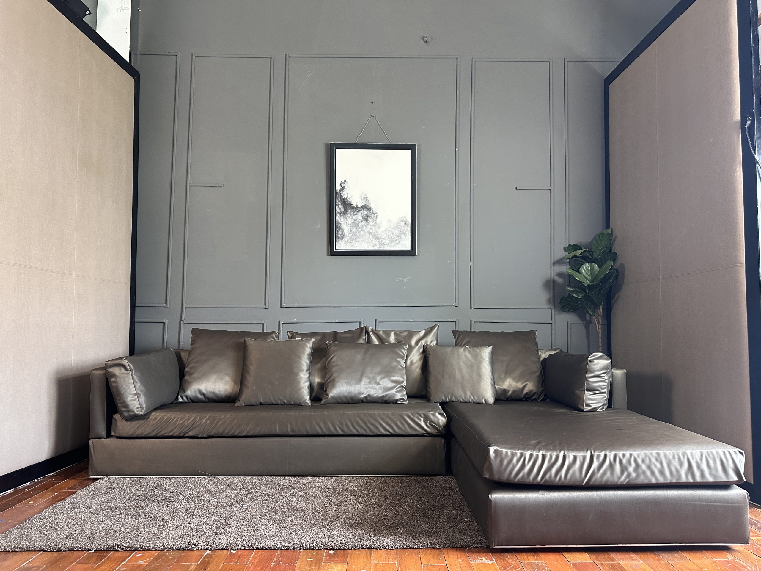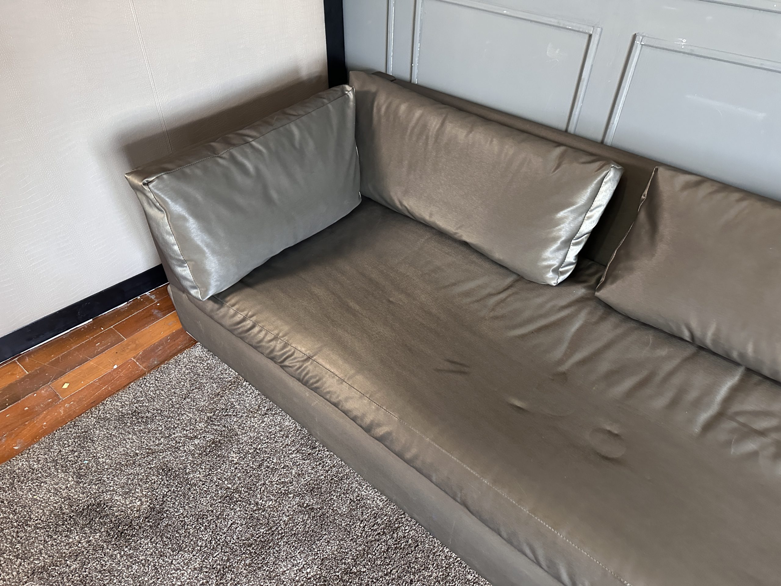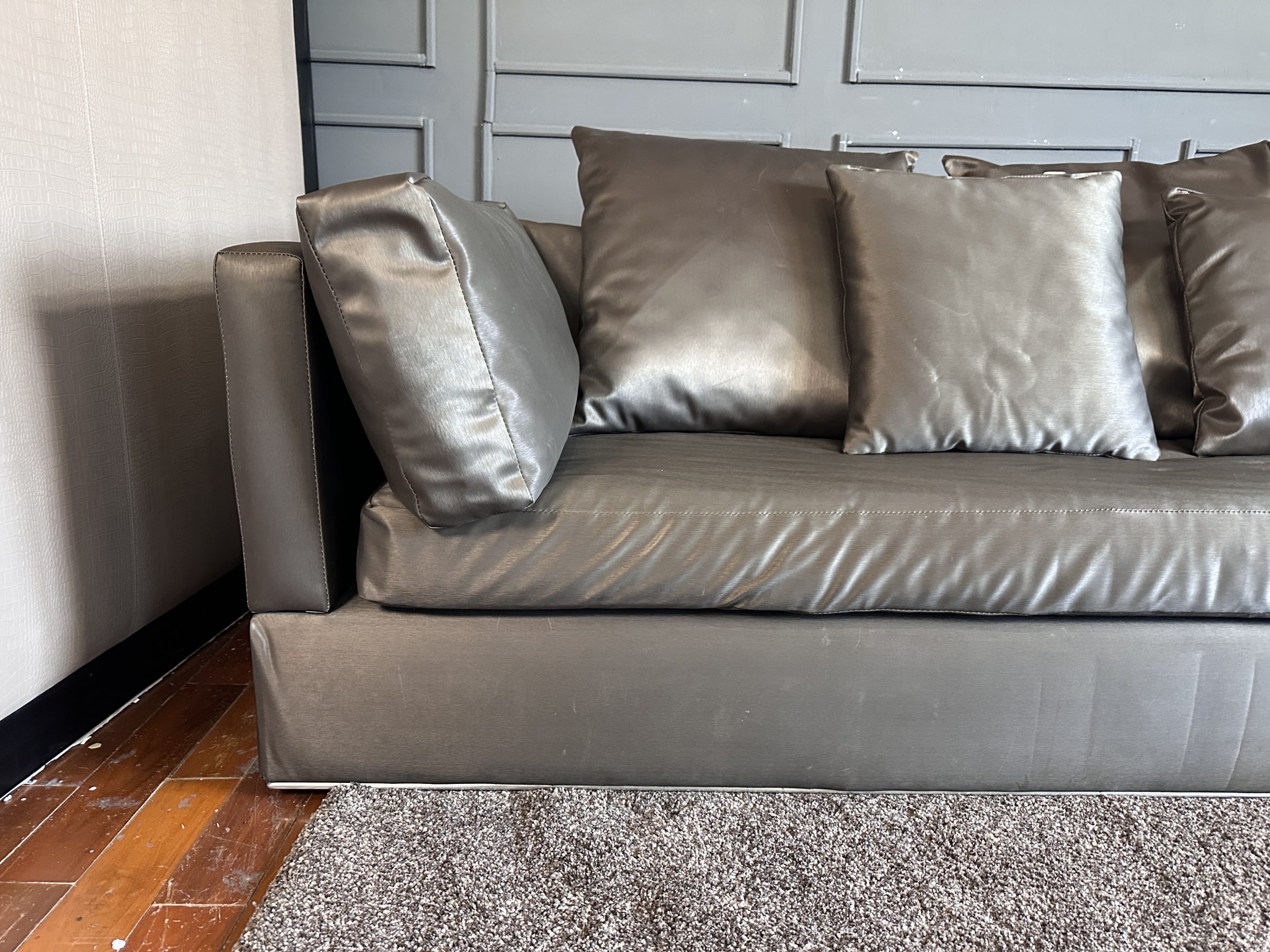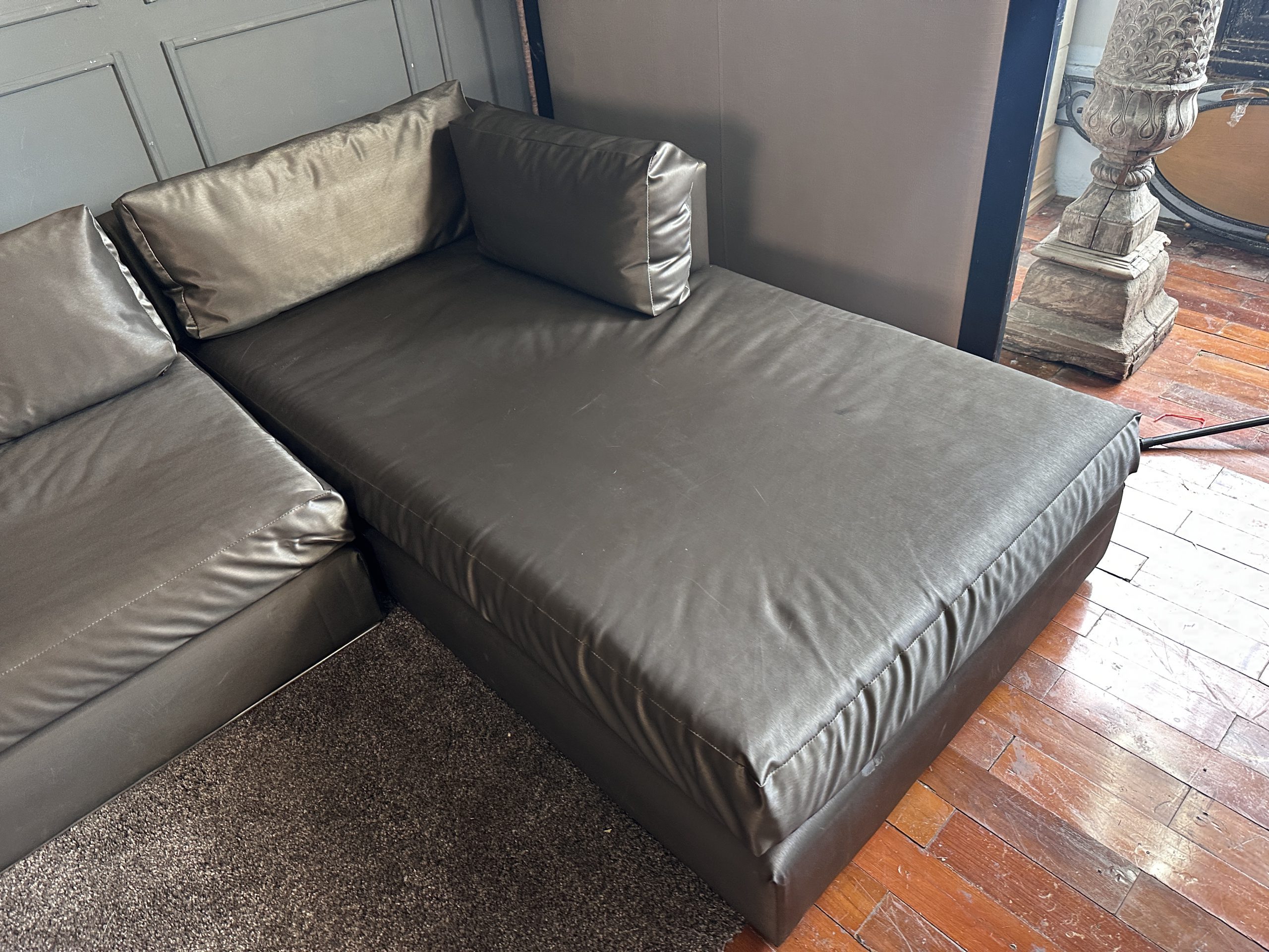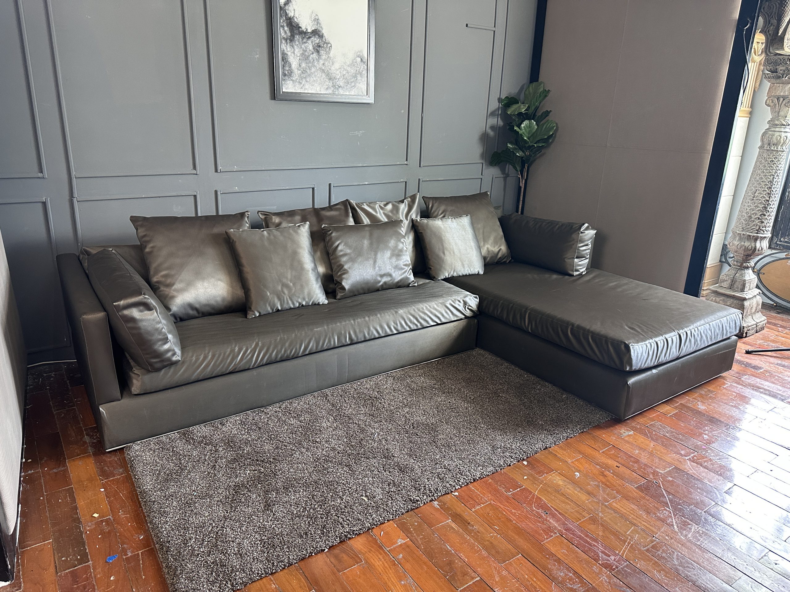 โซฟาแอล 3-4 ที่นั่ง เบาะหนังผ้าไหมสีน้ำตาล ขาสแตนเลส พร้อมหมอนอิงตามภาพ