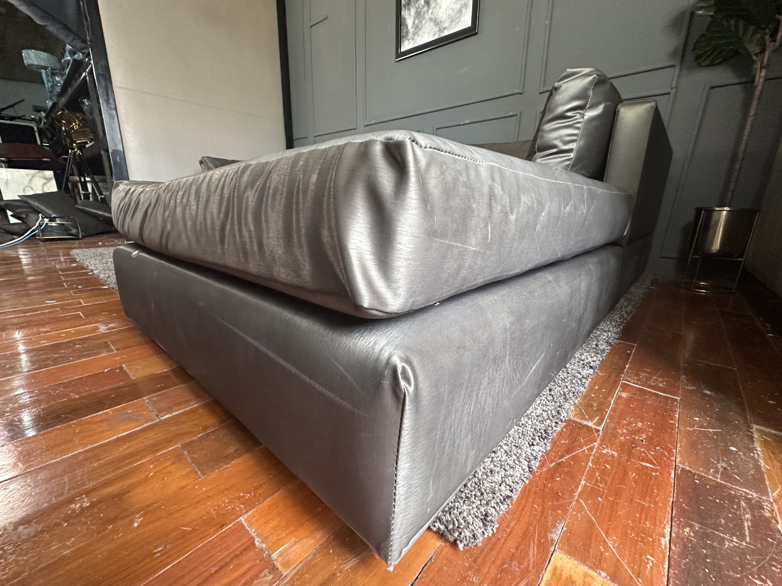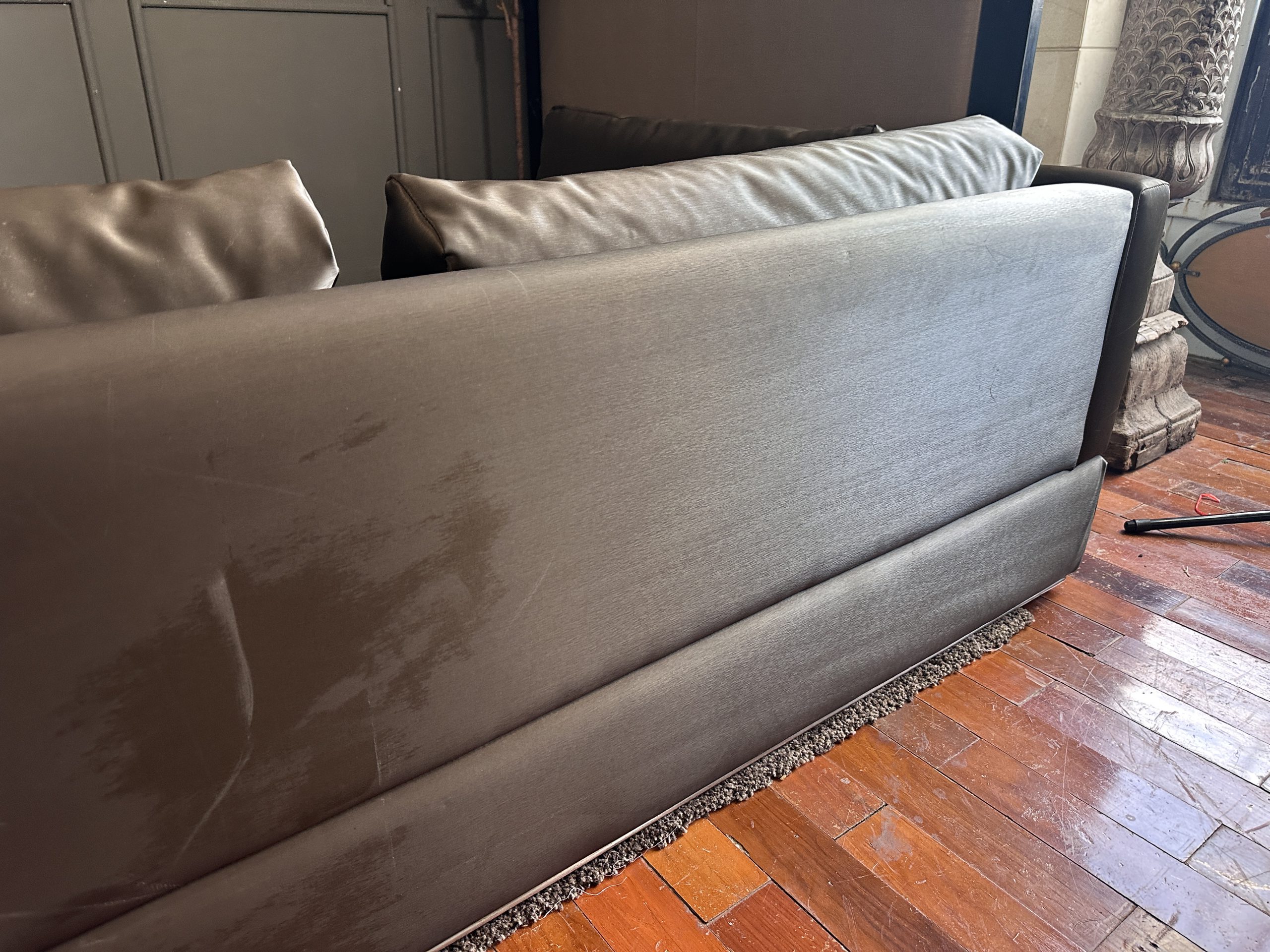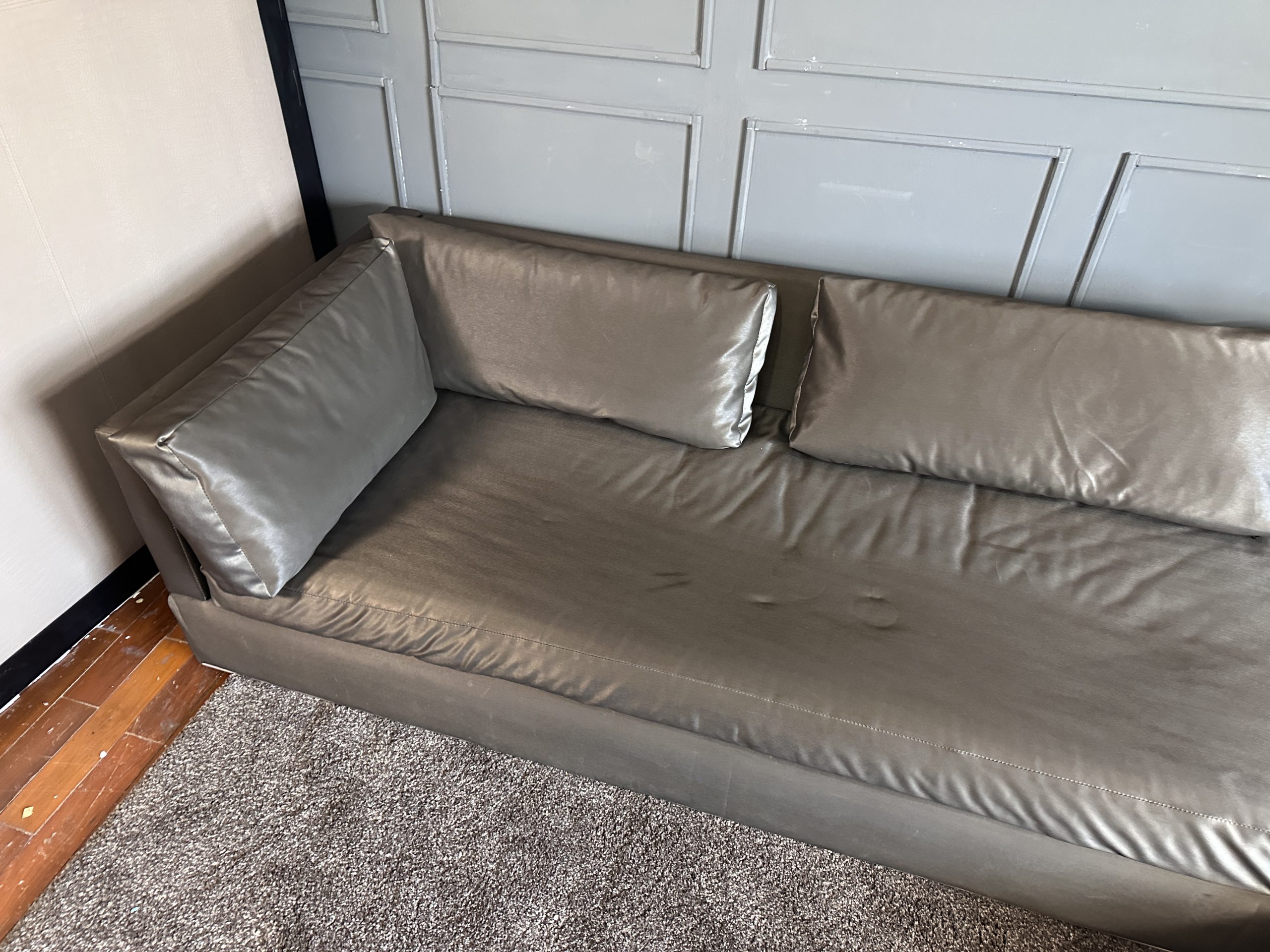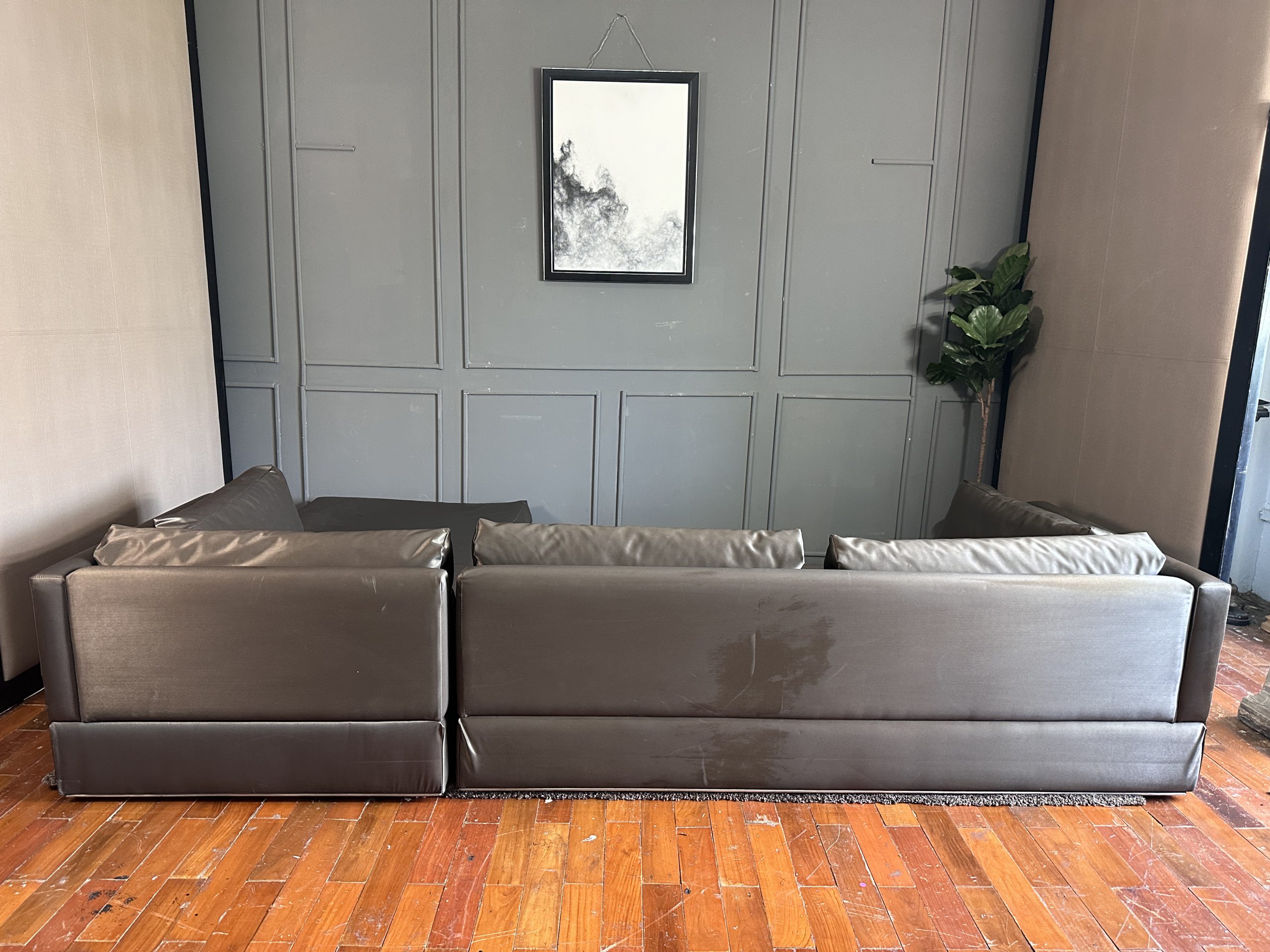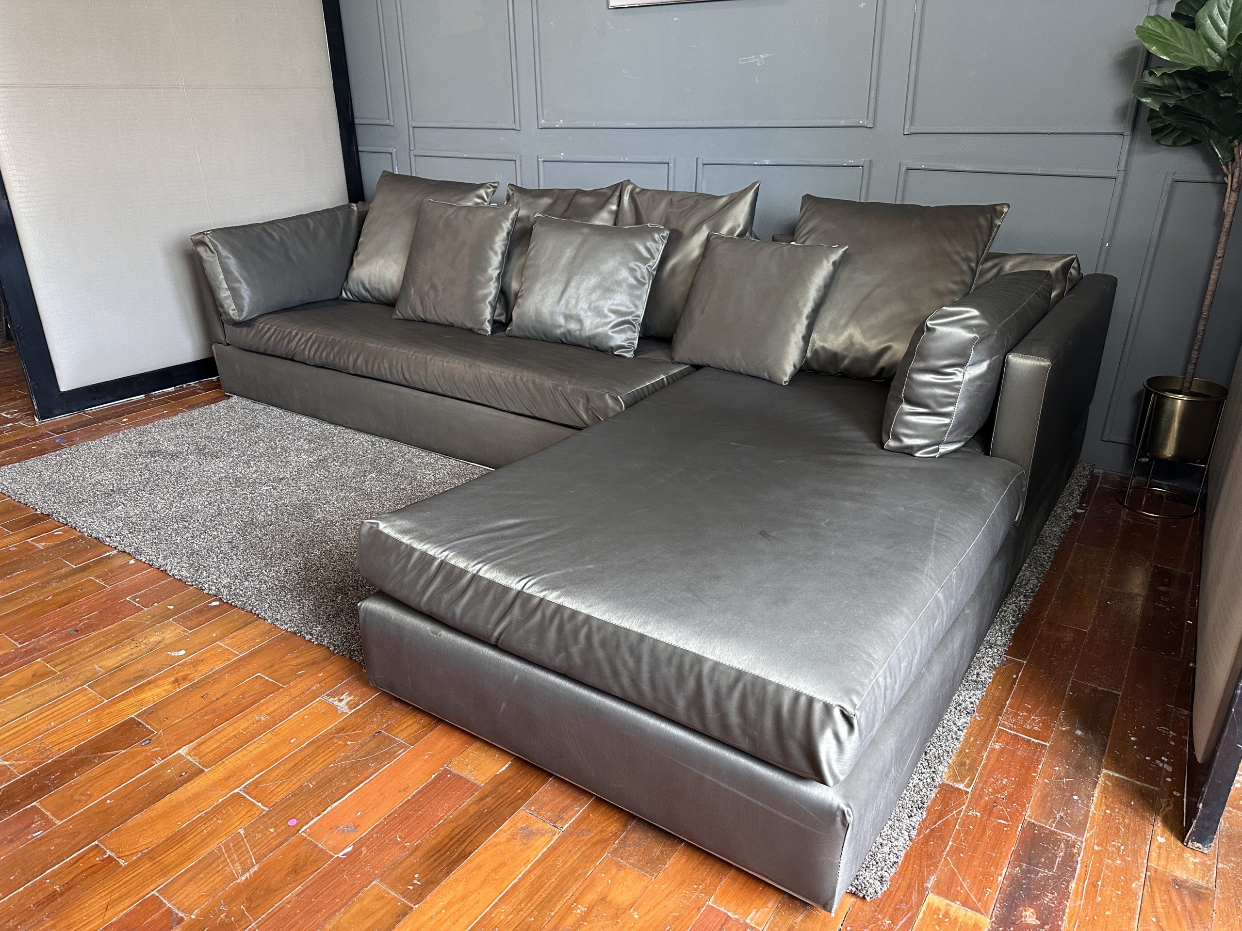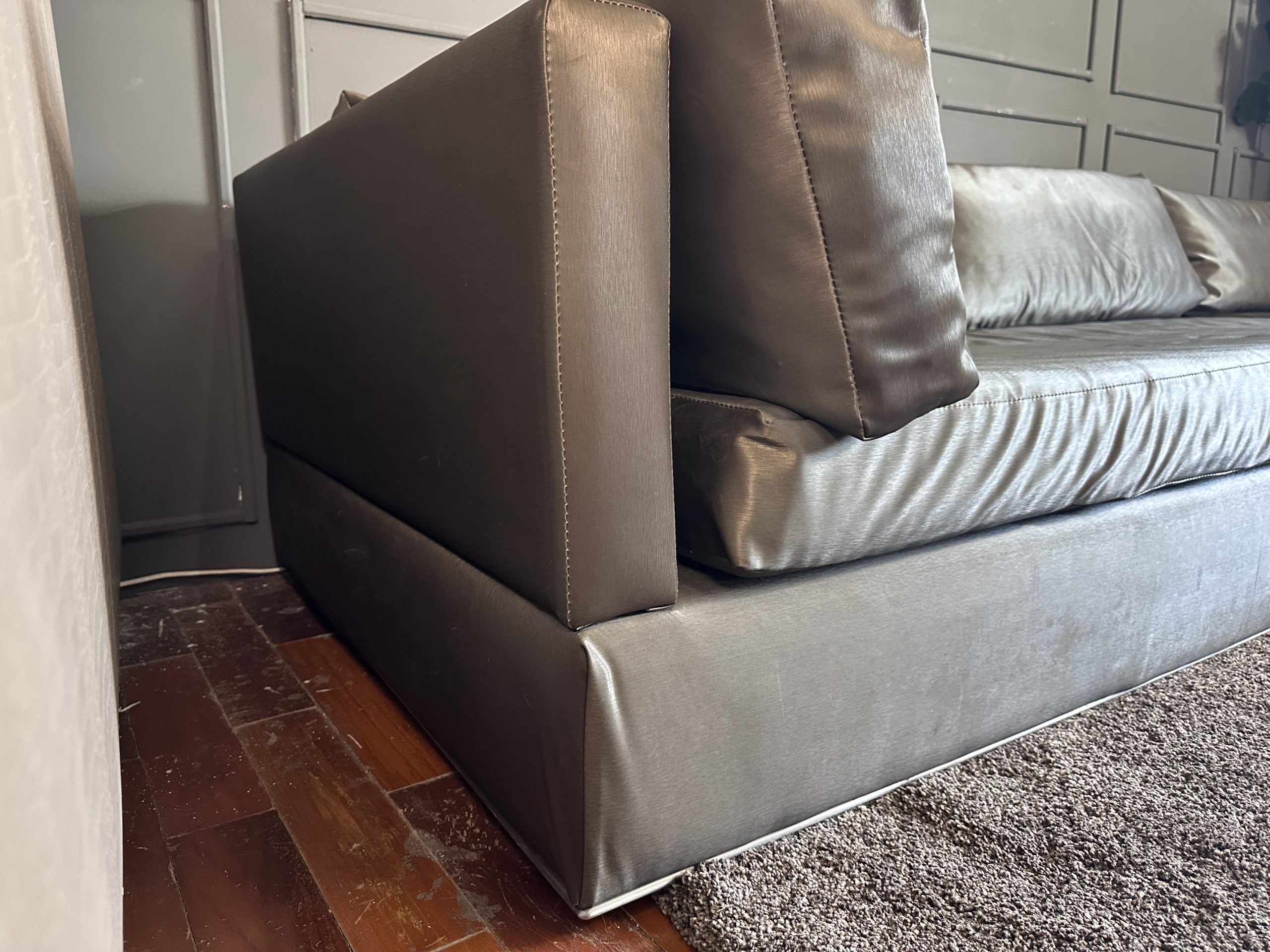 โซฟาแอล 3-4 ที่นั่ง เบาะหนังผ้าไหมสีน้ำตาล ขาสแตนเลส พร้อมหมอนอิงตามภาพ