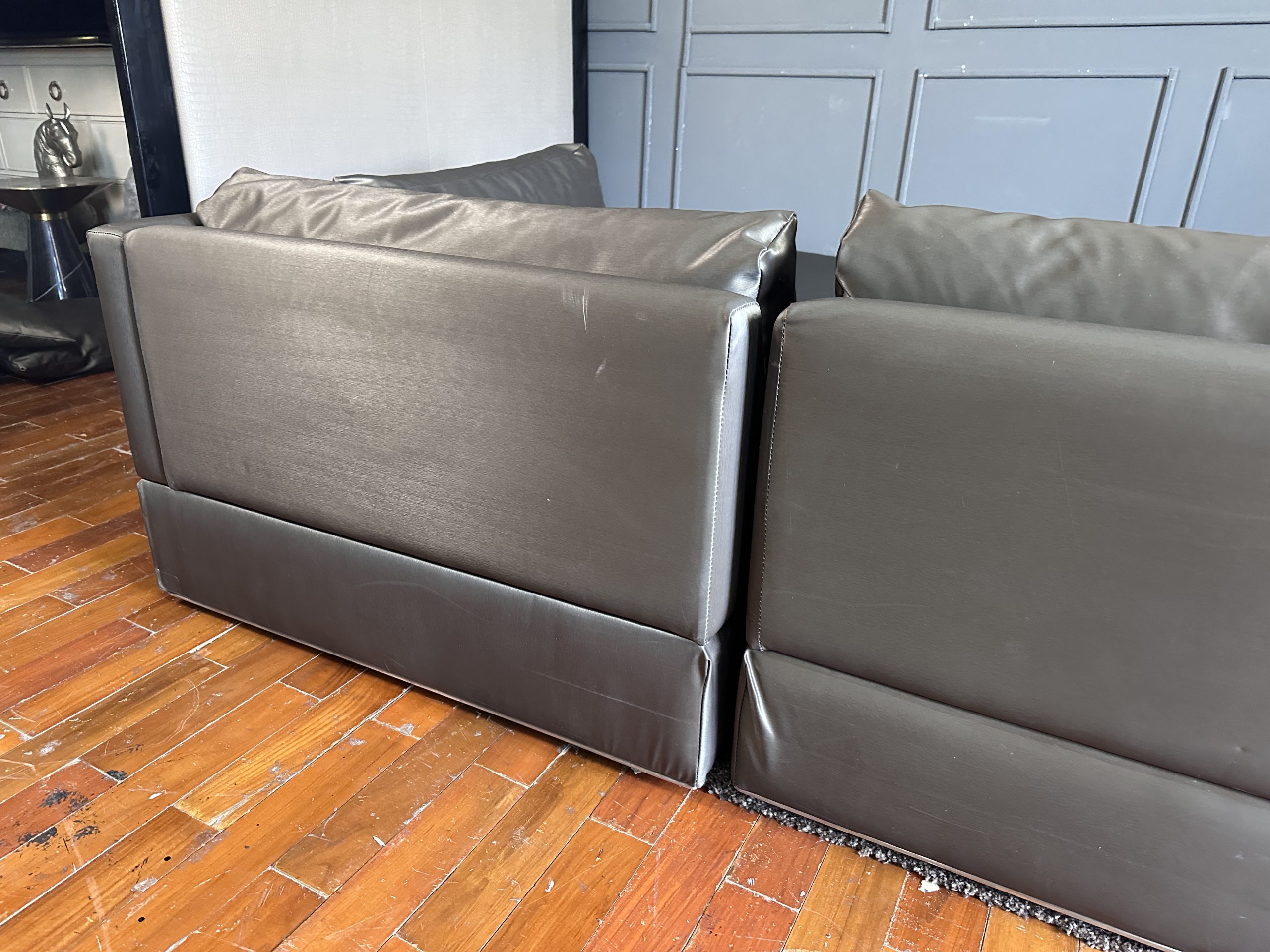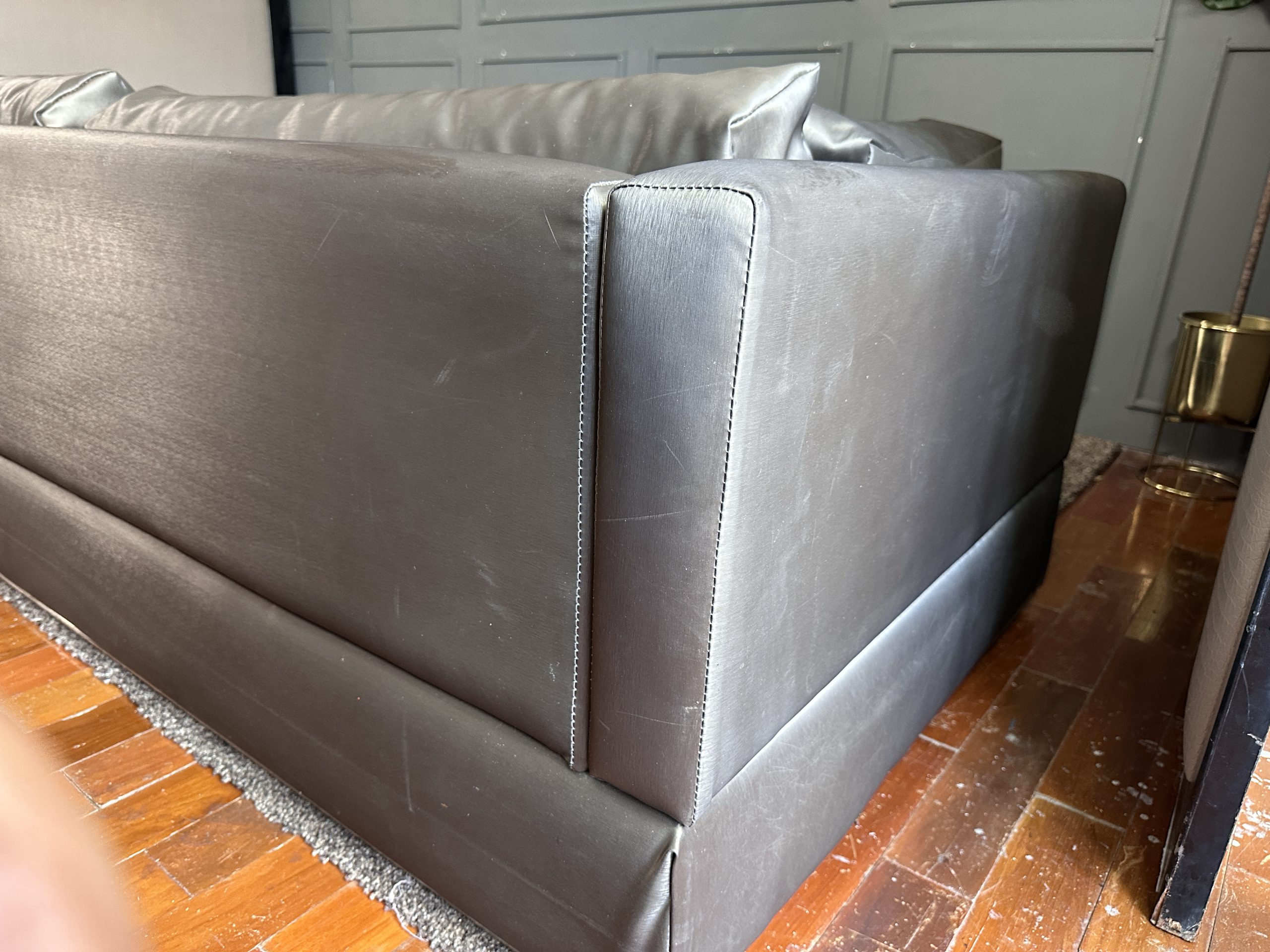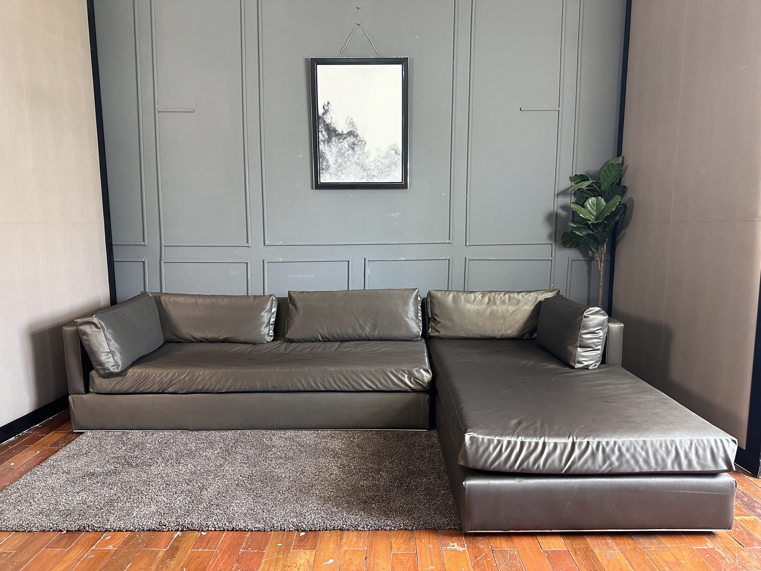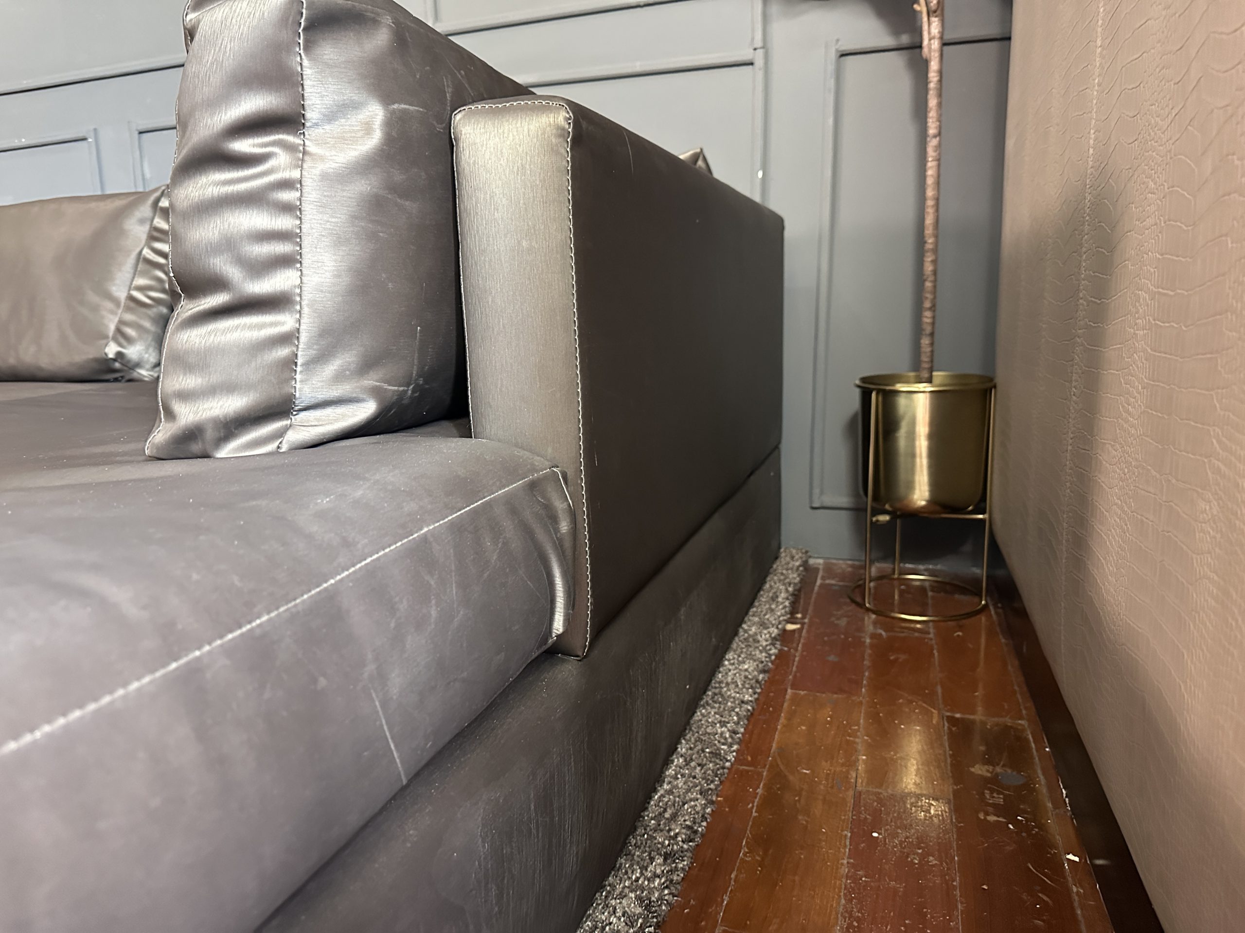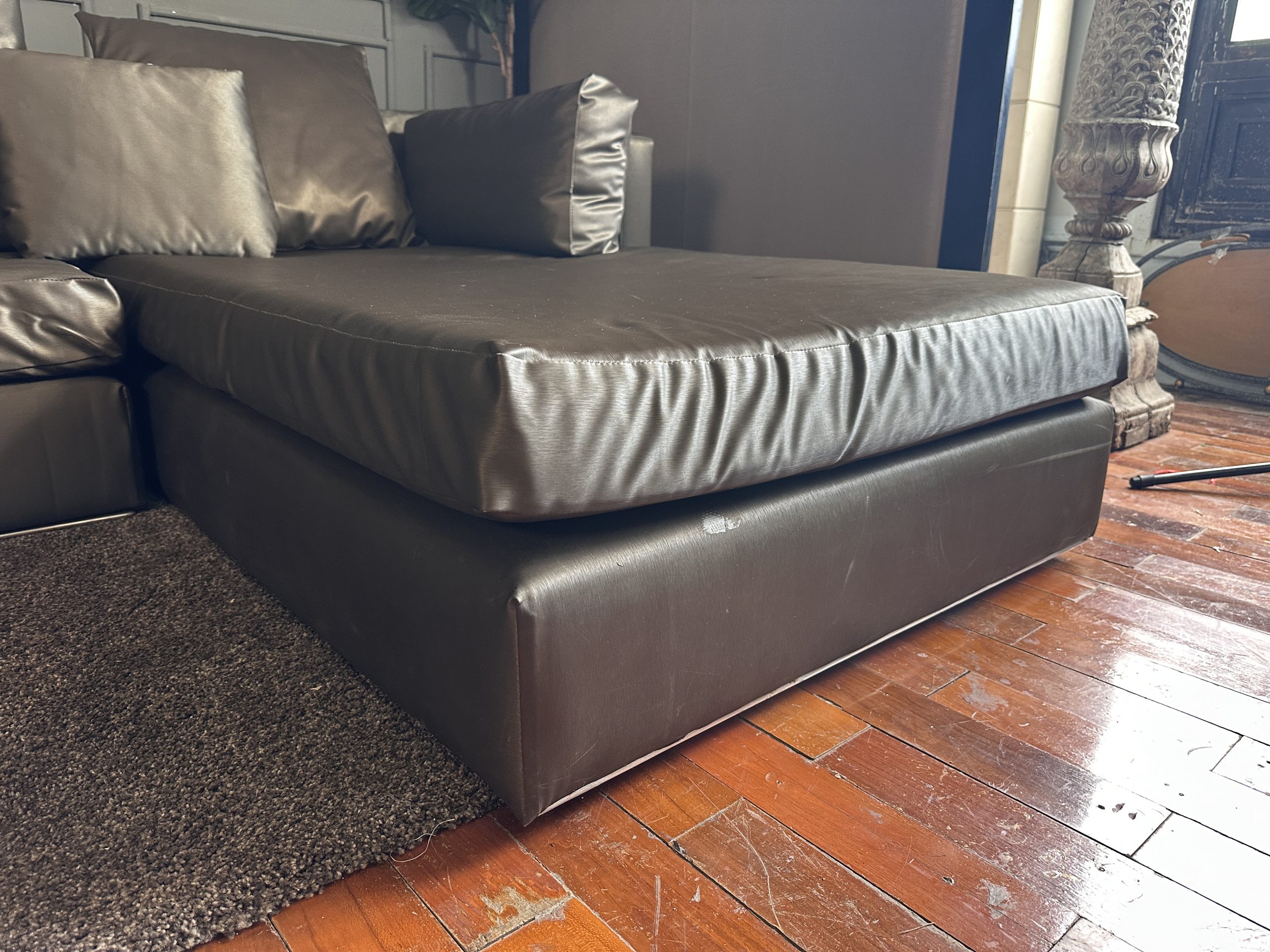 โซฟาแอล 3-4 ที่นั่ง เบาะหนังผ้าไหมสีน้ำตาล ขาสแตนเลส พร้อมหมอนอิงตามภาพ
