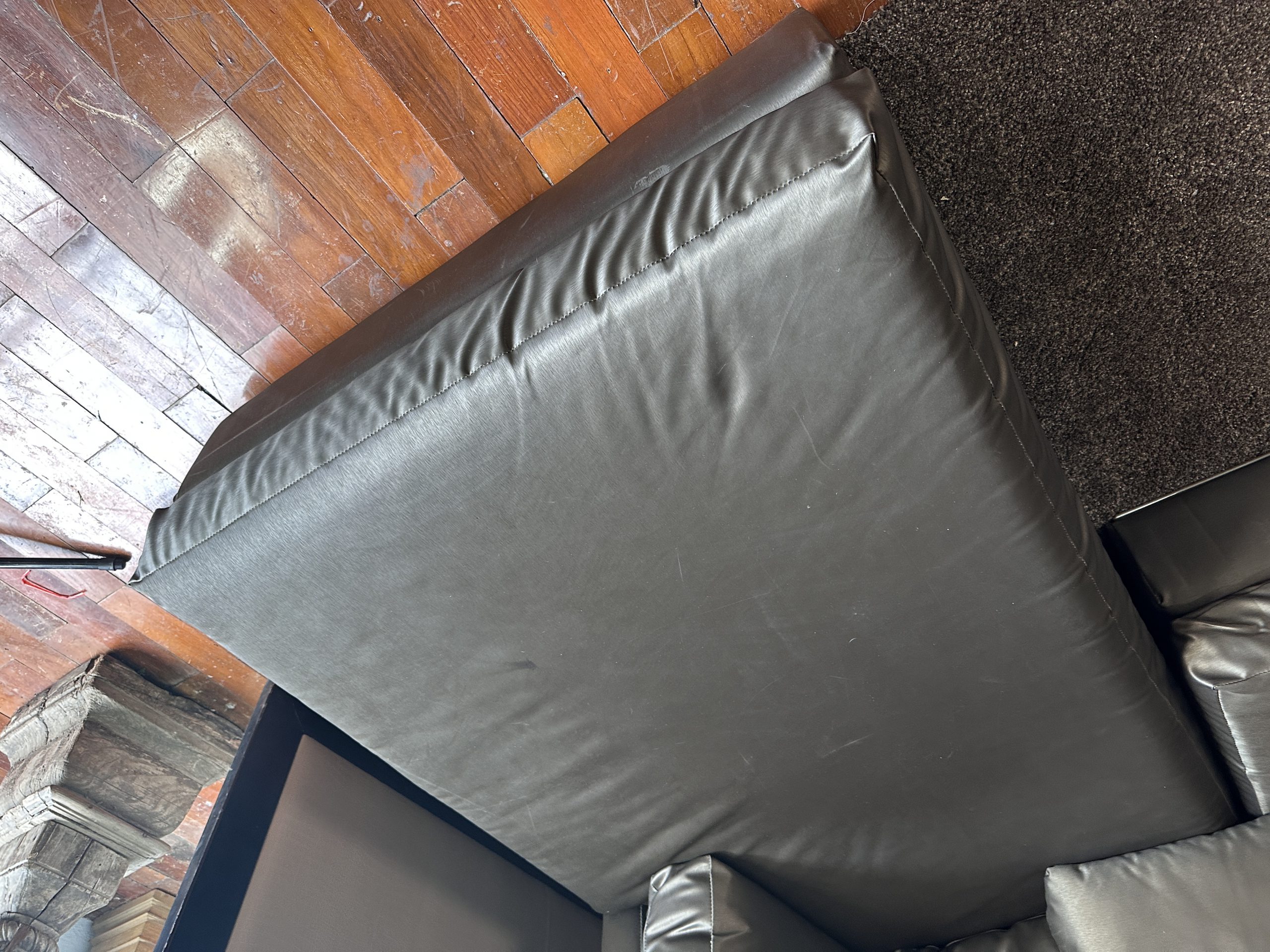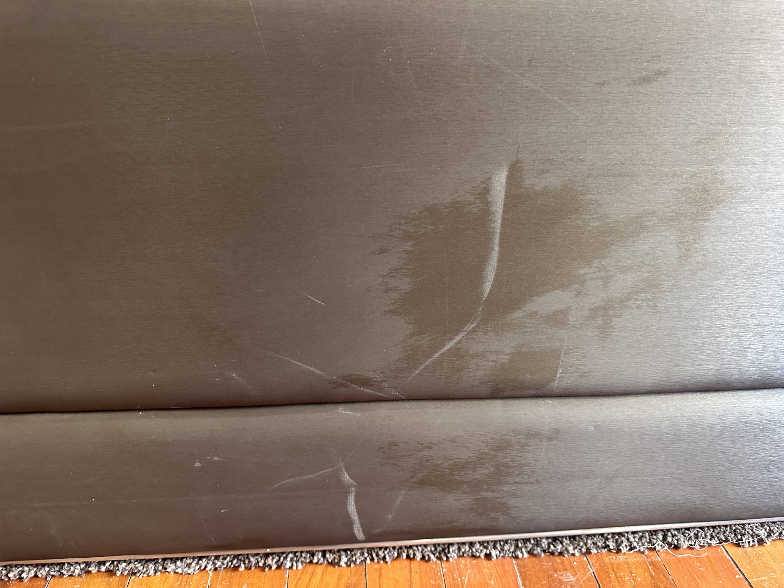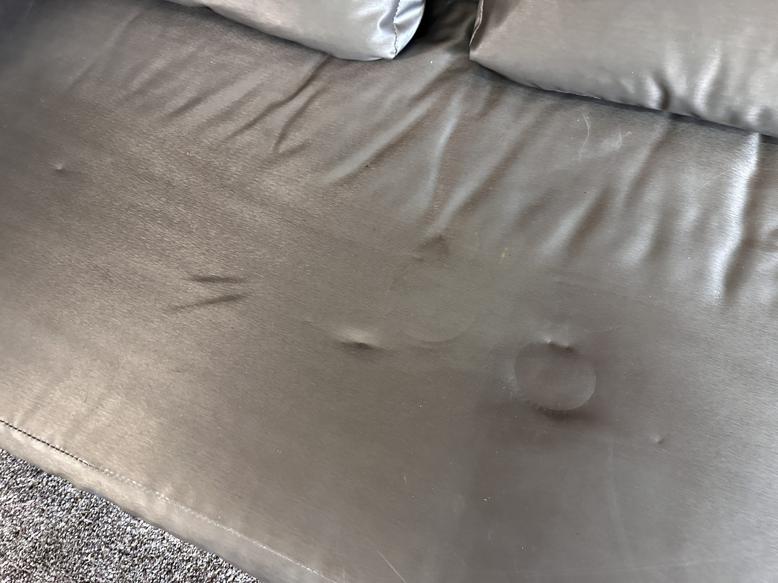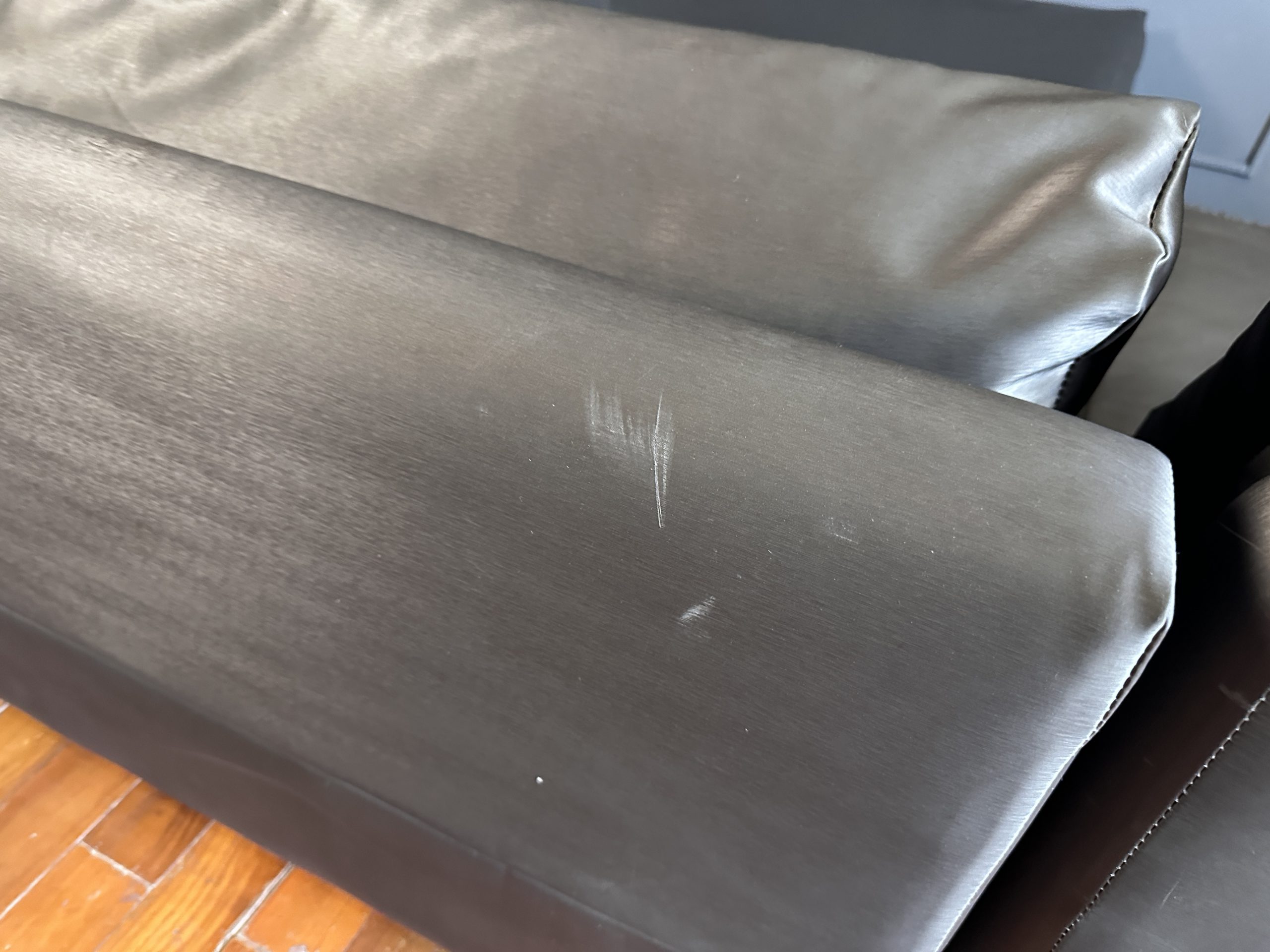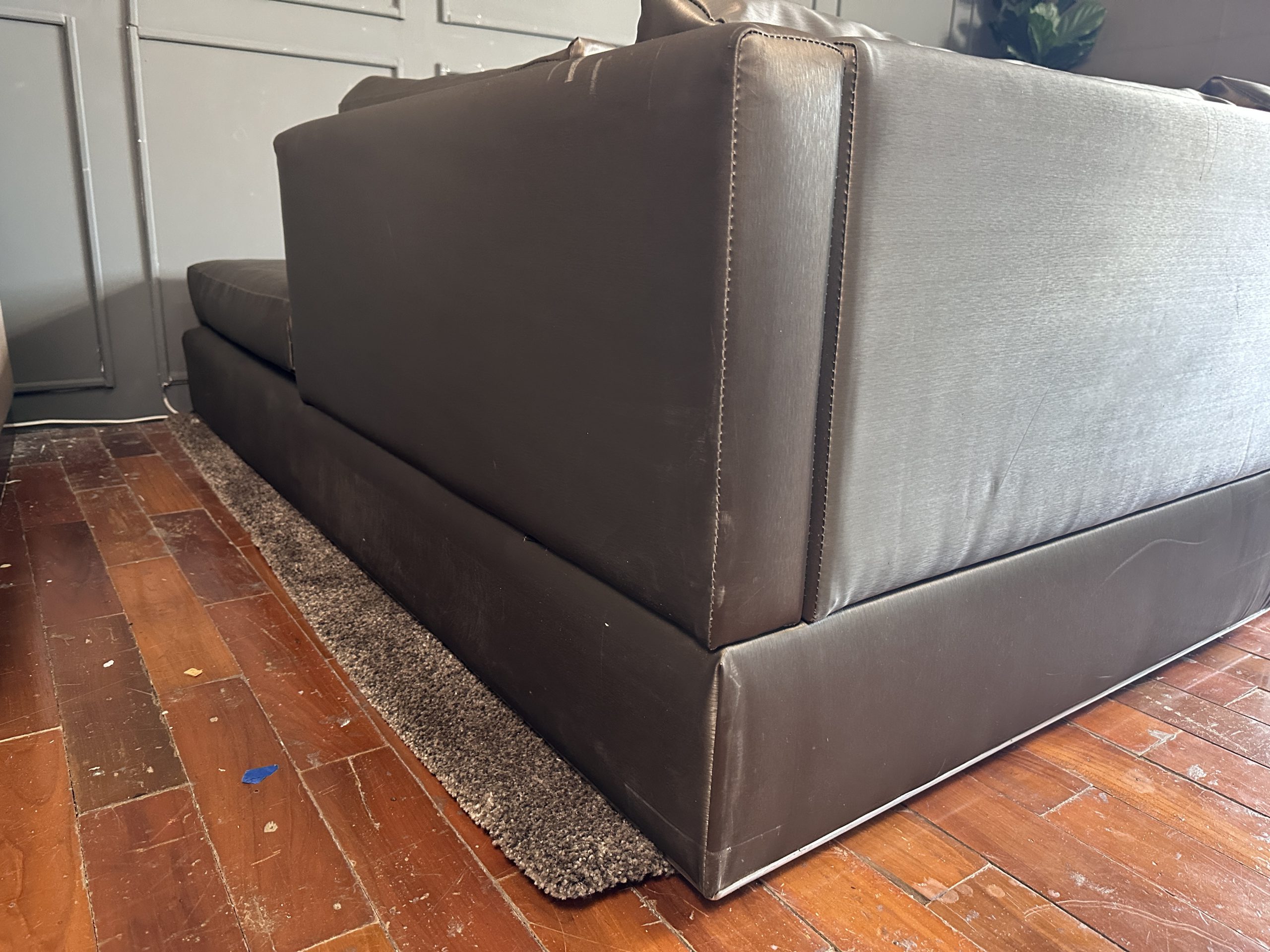 โซฟาแอล 3-4 ที่นั่ง เบาะหนังผ้าไหมสีน้ำตาล ขาสแตนเลส พร้อมหมอนอิงตามภาพ