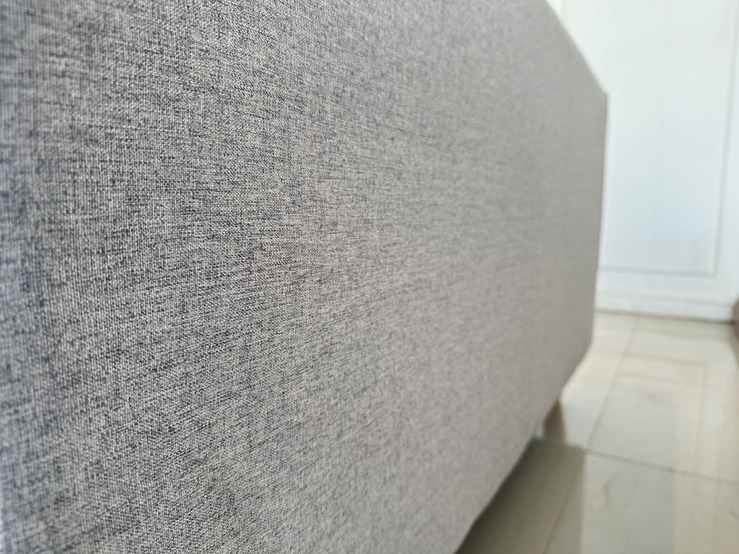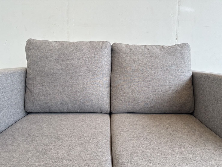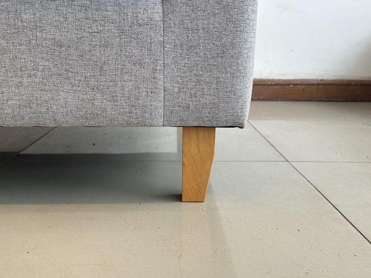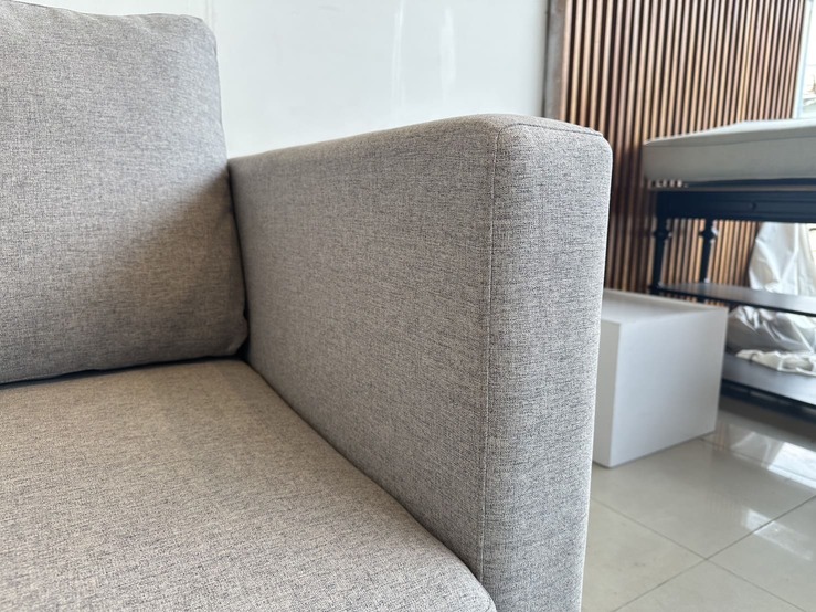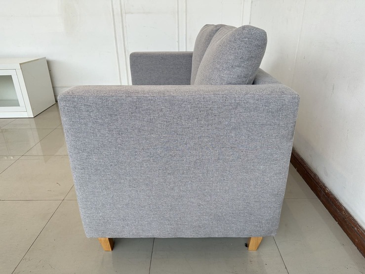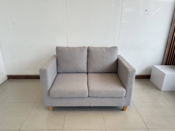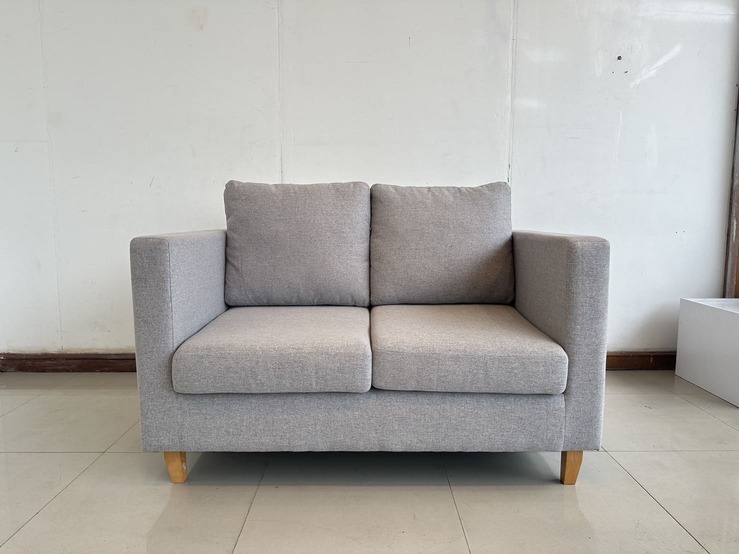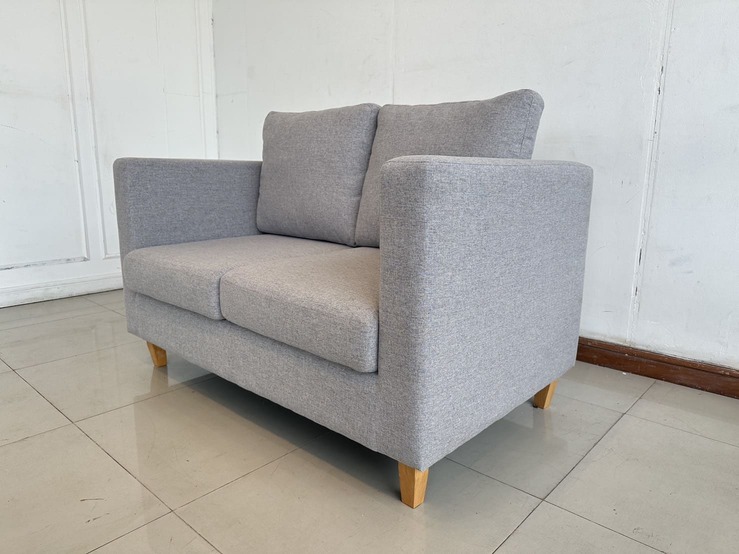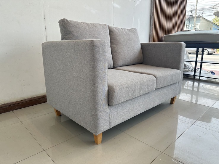 โซฟา 2 ที่นั่ง เบาผ้าสีเทา เบาะและหมอน ถอดปลอกได้ โครงขาไม้ยาง