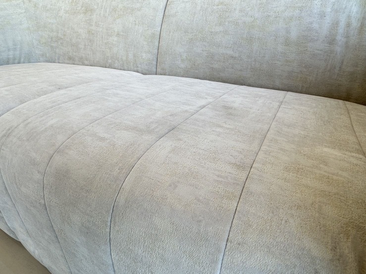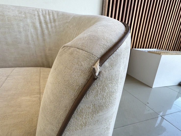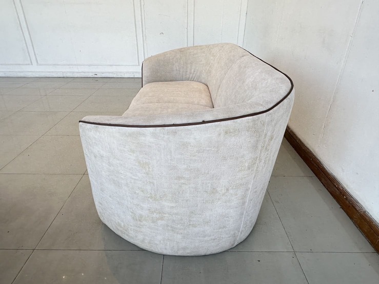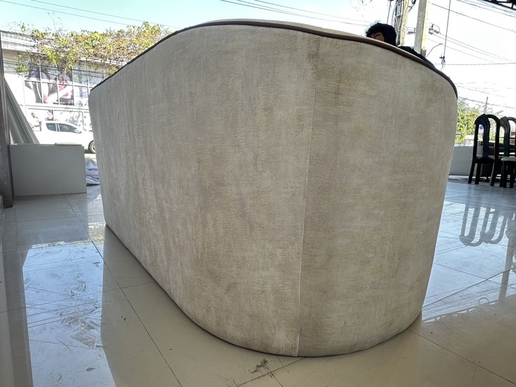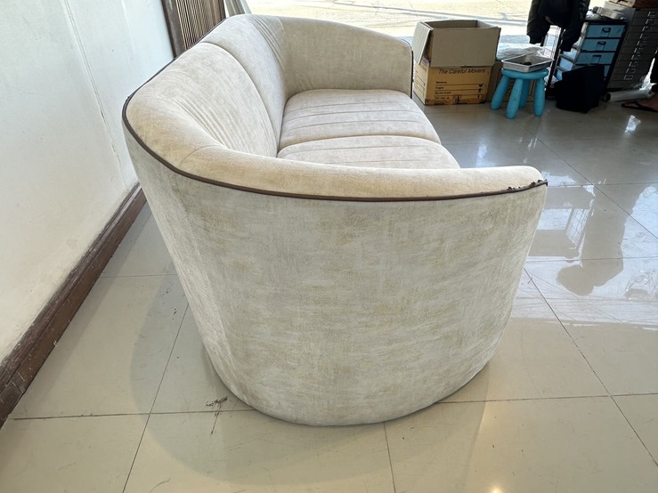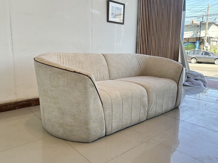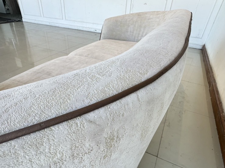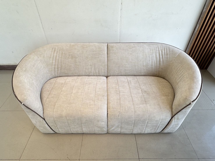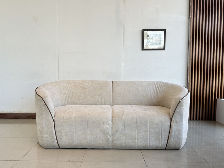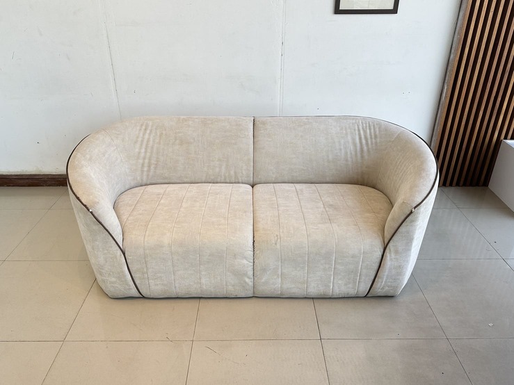 โซฟา 2 ที่นั่ง เบาะผ้ากำมะหยี่สีครีม ขอบกุ้นสีน้ำตาล โครงไม้ MDF