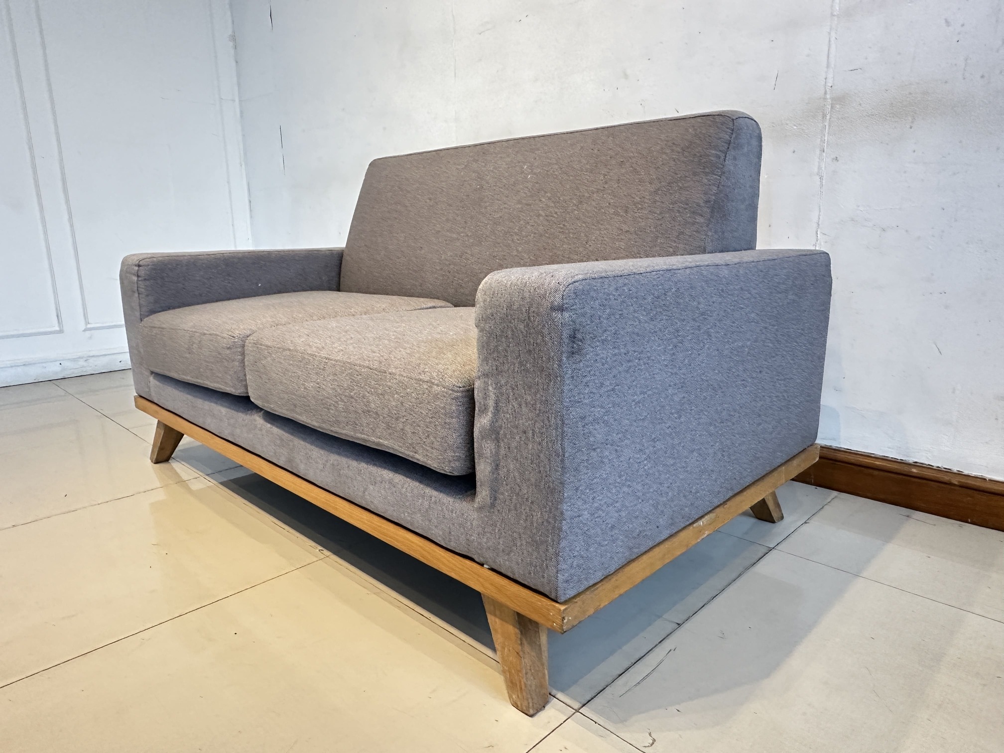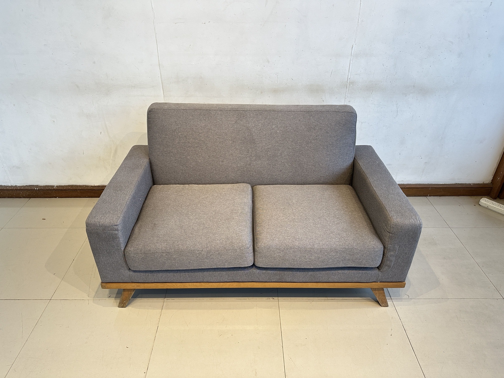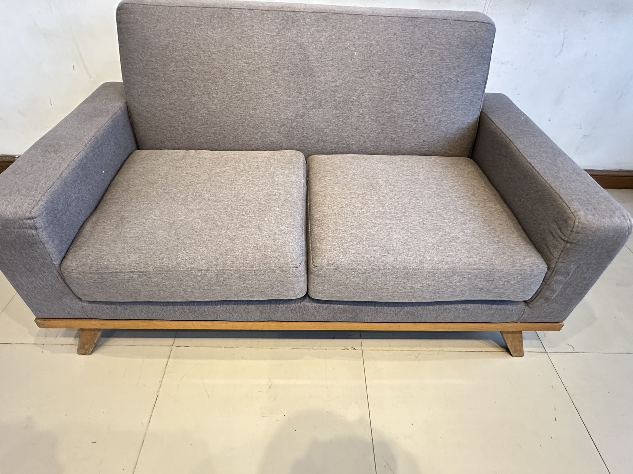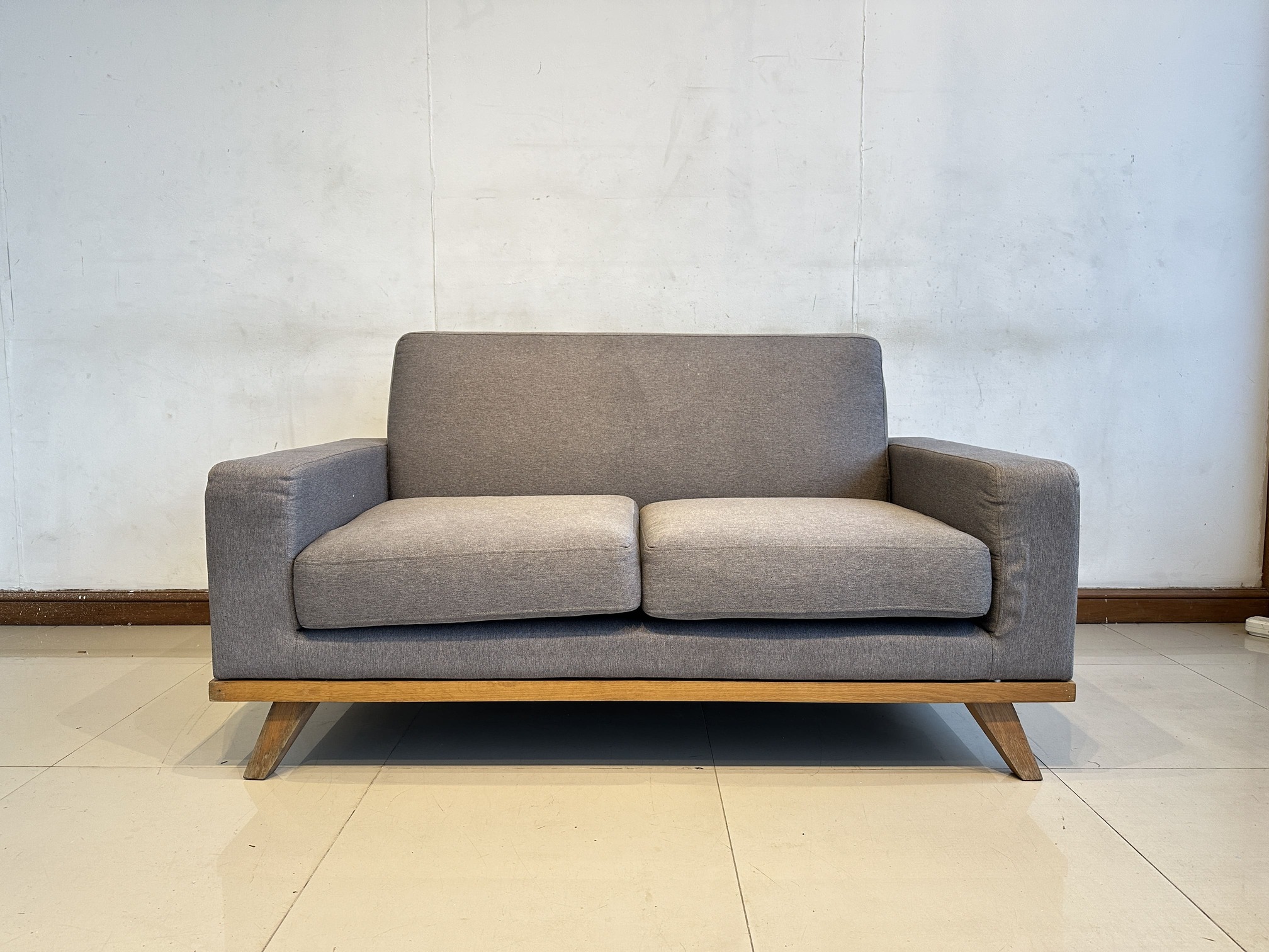 โซฟา 2 ที่นั่ง เบาะผ้าสีเทาเข้ม ถอดปลอกได้ โครงขาไม้สน