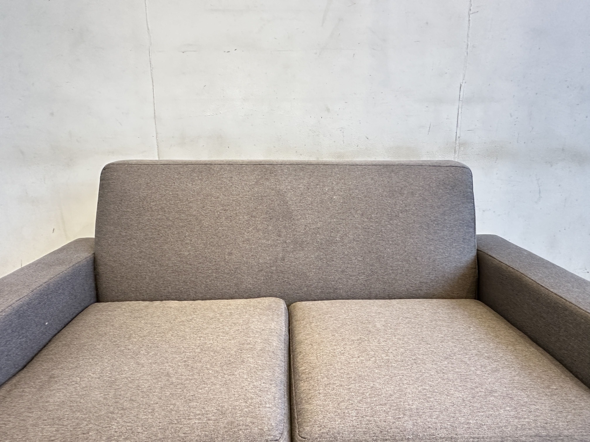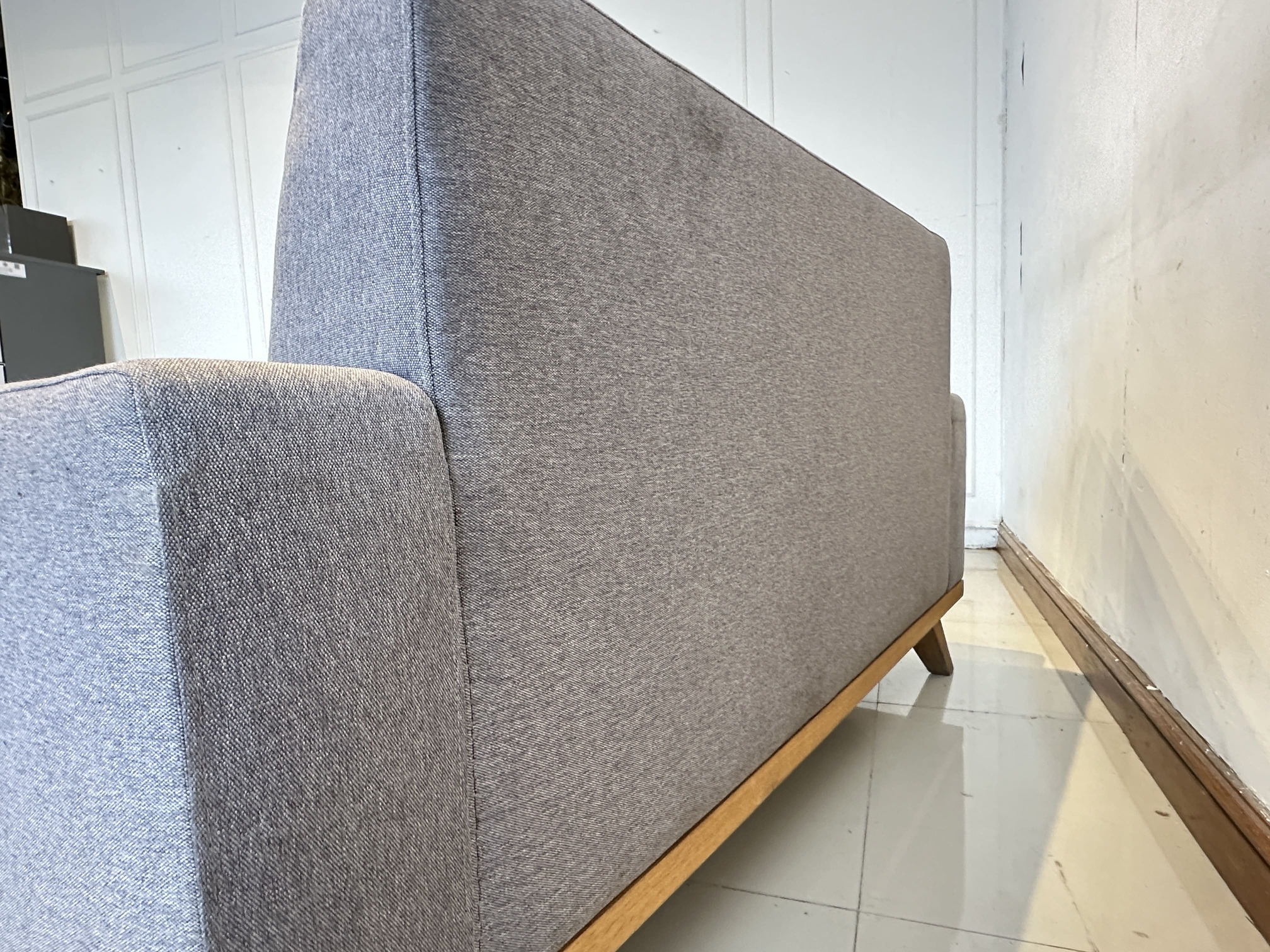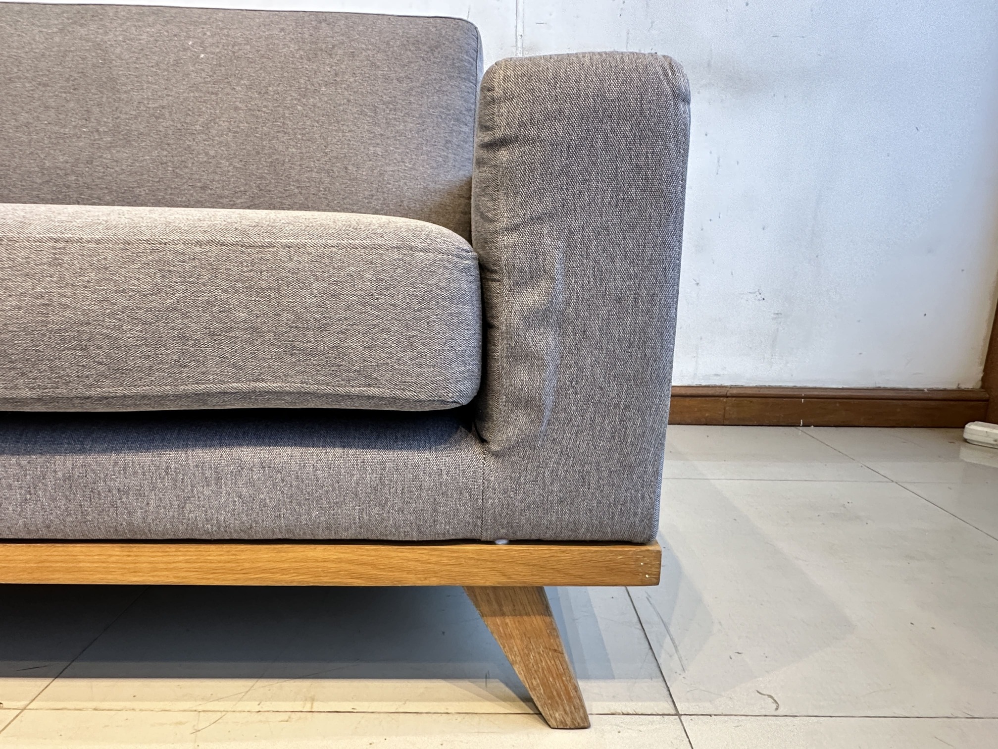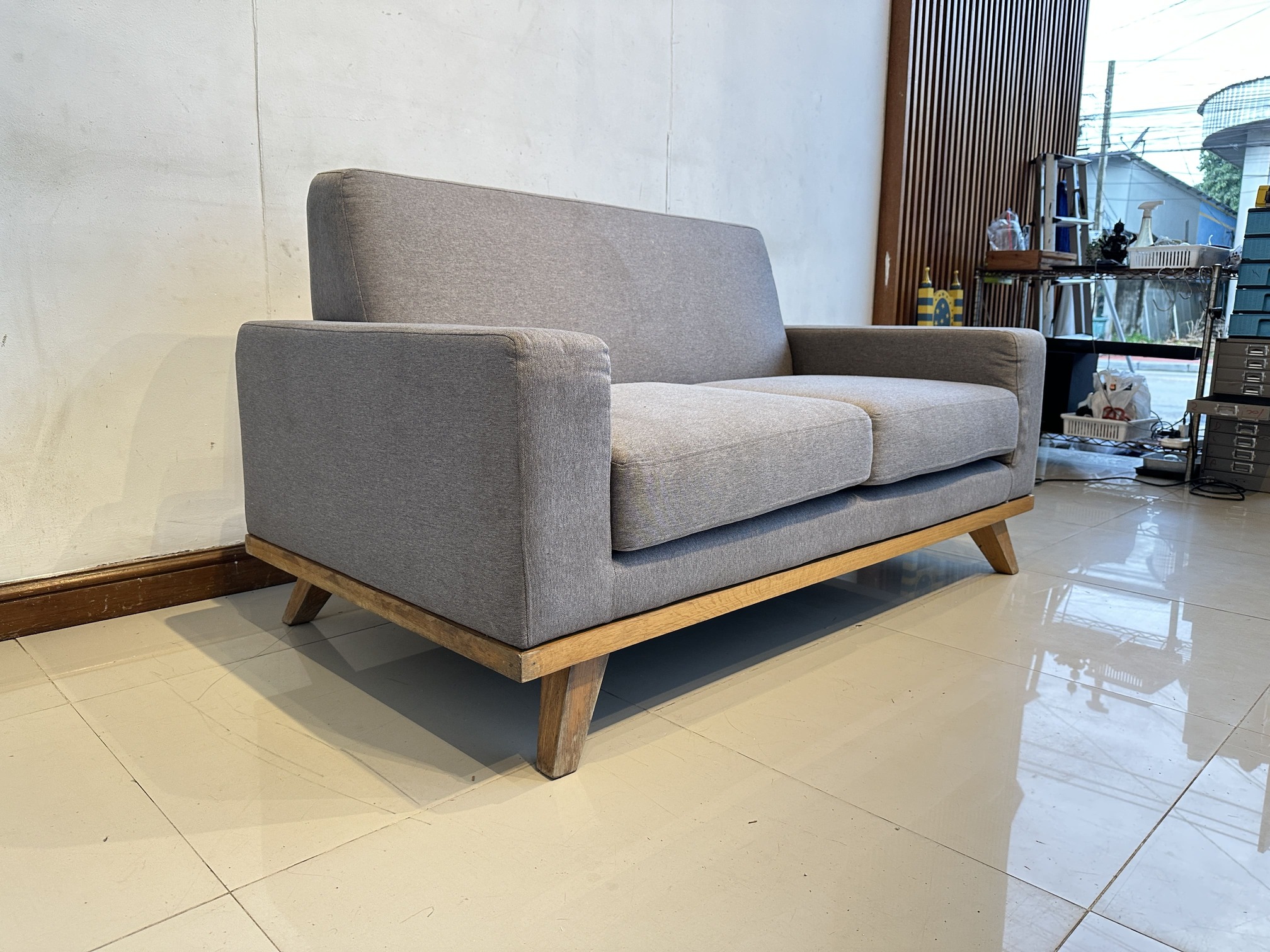 โซฟา 2 ที่นั่ง เบาะผ้าสีเทาเข้ม ถอดปลอกได้ โครงขาไม้สน